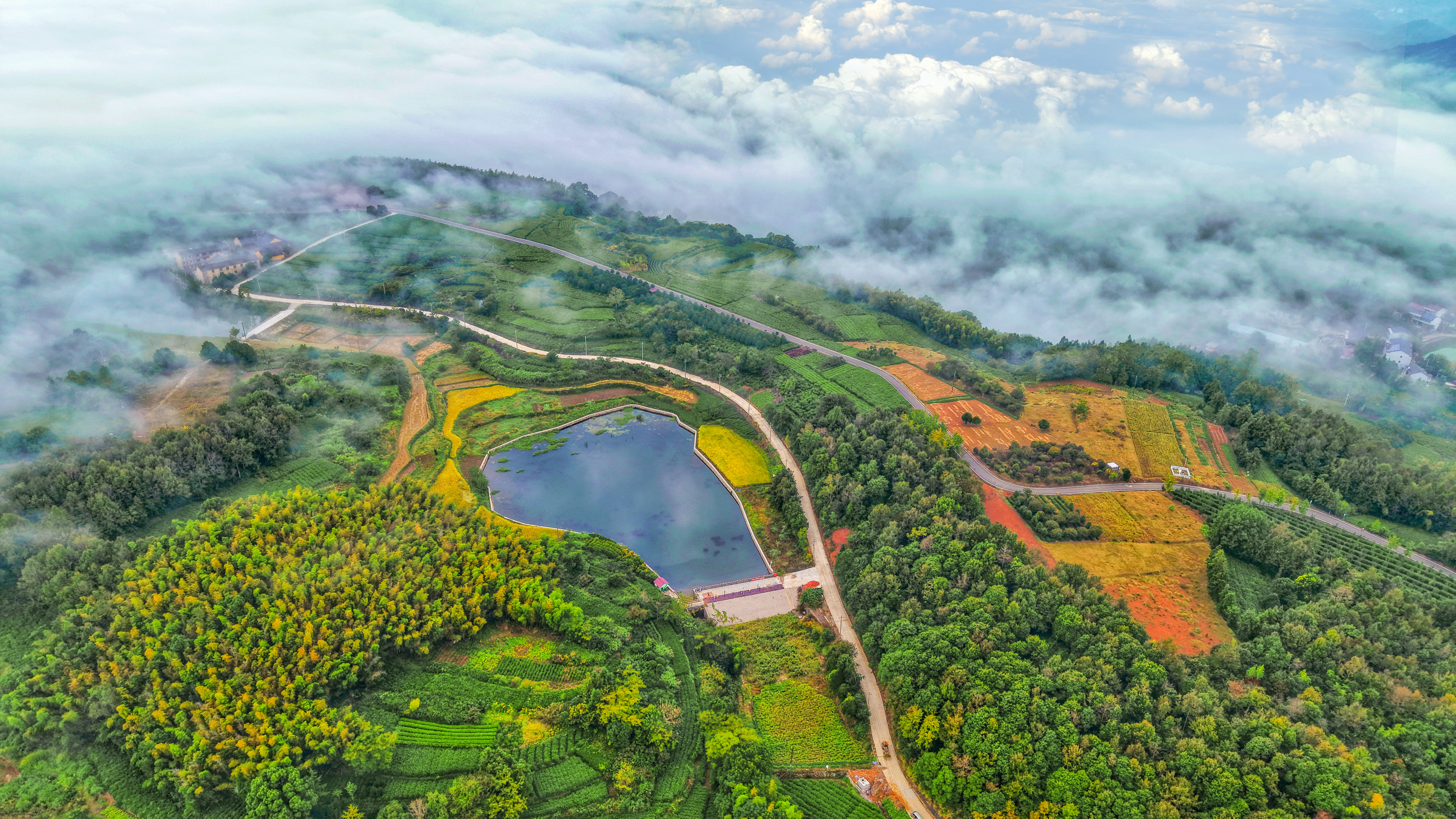 云下秋色 秋日如一位画师,正以大地为宣纸,将绿意点点染成金黄,云朵是其悠闲的留白。(桑洲镇屿南山岗 宁波小小周/摄)