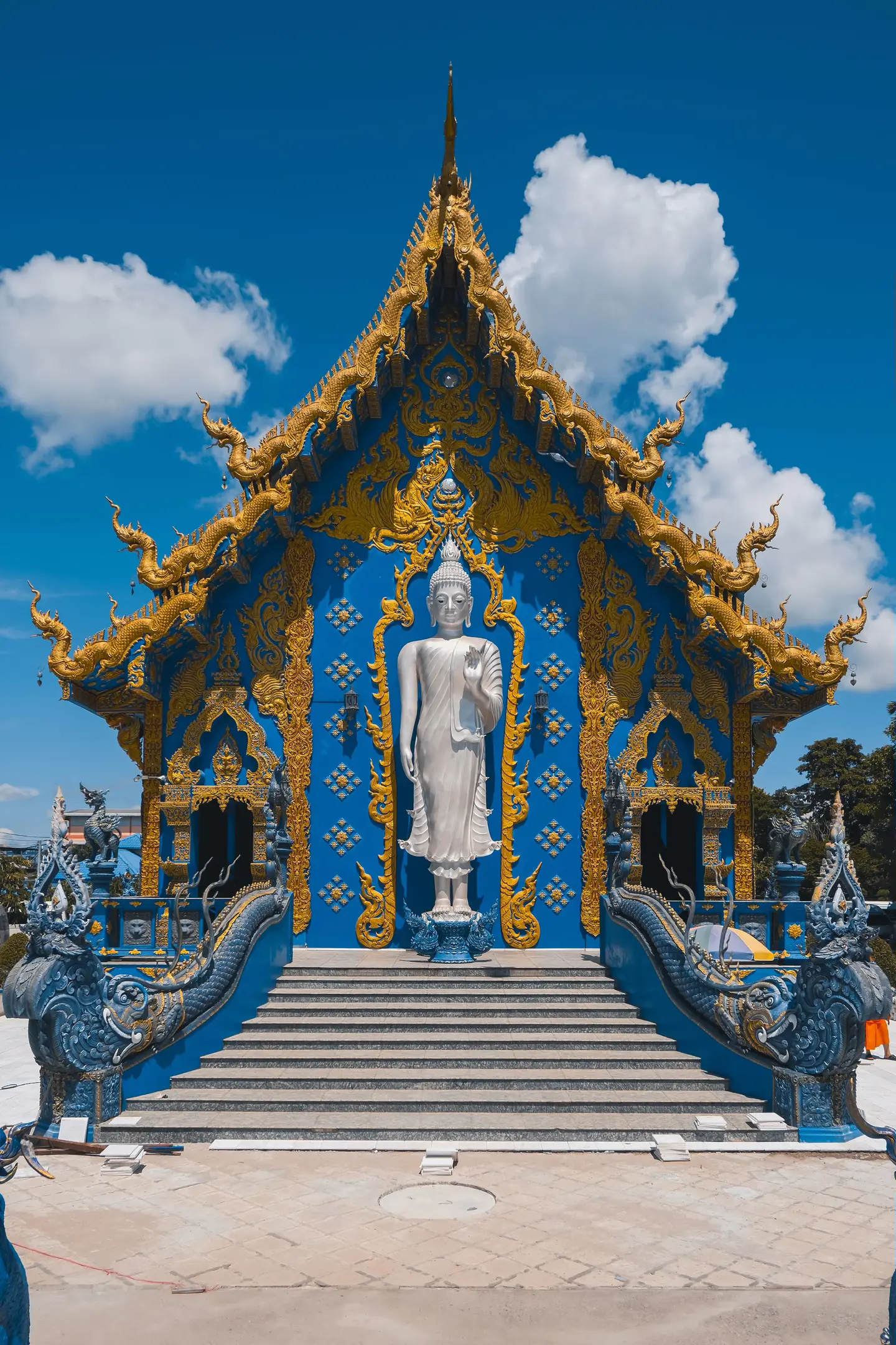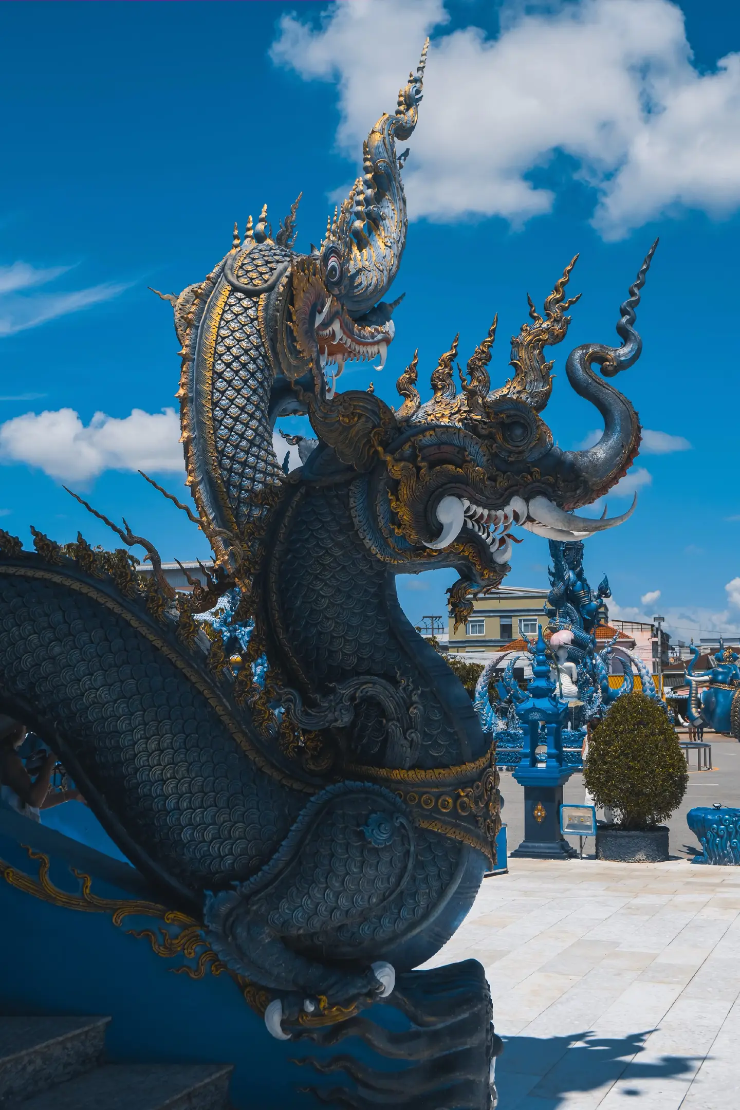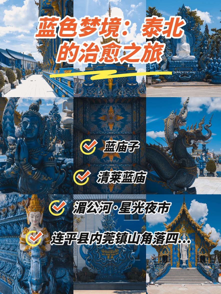 泰北蓝梦 | 清莱蓝庙,把天空星河藏进院墙里✨ 清迈旅行的额外惊喜,藏在清莱的一座蓝色寺庙里。从清莱市区驱车出发,不算太远的路程,却像穿过寻常街巷,突然撞进了一个钴蓝色的梦境——Wat Rong Suea Ten,这处被称作“蓝庙”的地方,是湄公河畔最治愈的色彩馈赠。 🔷 还没走进院墙,视线就被那抹纯粹的钴蓝牢牢锁住。整座寺庙的屋顶铺满了蓝色琉璃,阳光下亮得晃眼,却不刺眼,反而透着一种干净又神圣的质感。鎏金的龙形雕塑缠绕在廊柱上,蓝与金的碰撞,热烈又和谐,既有佛国寺庙的庄重,又多了几分让人眼前一亮的惊艳,完全不像传统寺庙的沉闷。 ✨ 推开门走进来,才发现内里的精彩更甚。彩色窗棂被阳光穿透,在蓝色的地砖上投下斑驳的光影,晃动间像是星河在地面流淌。庙内的壁画铺满墙面,鲜活又灵动,从神话里的神祇到生活中的烟火百态,每一笔都细腻入微,能看出匠人的用心。就连角落镇守的石狮,都不是威严得让人不敢靠近,反而透着几分憨态可掬的可爱,瞬间拉近距离。 🎐 在蓝庙里,最舒服的就是不用追赶行程。找个角落站定,或是坐在石阶上,看风轻轻拂过檐角的金铃,叮当作响的声音清脆又治愈。远处偶尔传来隐约的诵经声,和着风声,让人不自觉放慢呼吸。那抹静谧的蓝像是有魔力,能悄悄抚平旅途的疲惫与浮躁,让人心里变得格外安宁。 这里没有热门景点的喧嚣,只有色彩与信仰交织的美好。清莱蓝庙不是必打卡的任务,而是一场值得奔赴的蓝色之约——来过这里,才懂泰北的惊艳,不止有金色的佛塔,还有这样一片把天空与星河都定格下来的钴蓝梦境。
