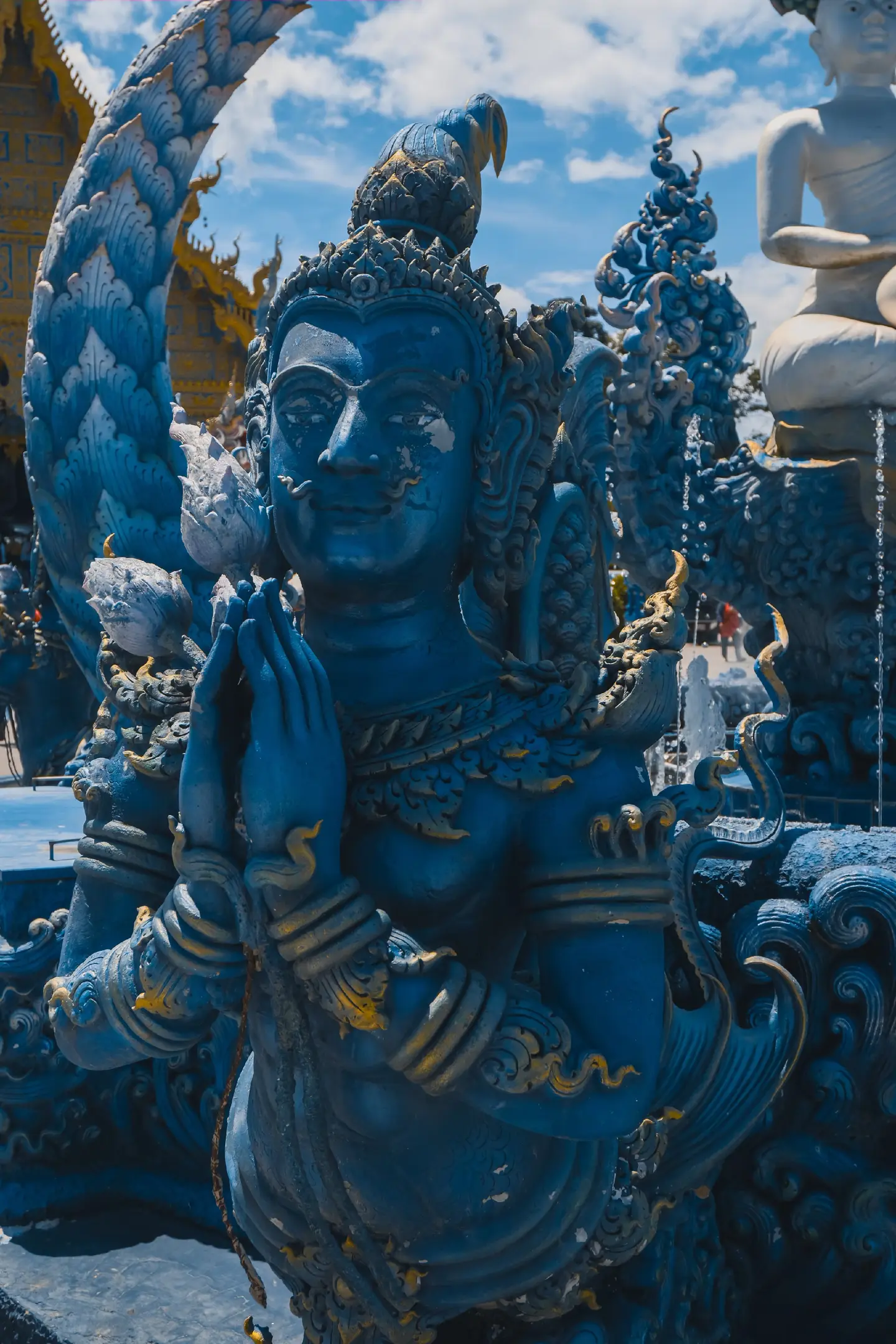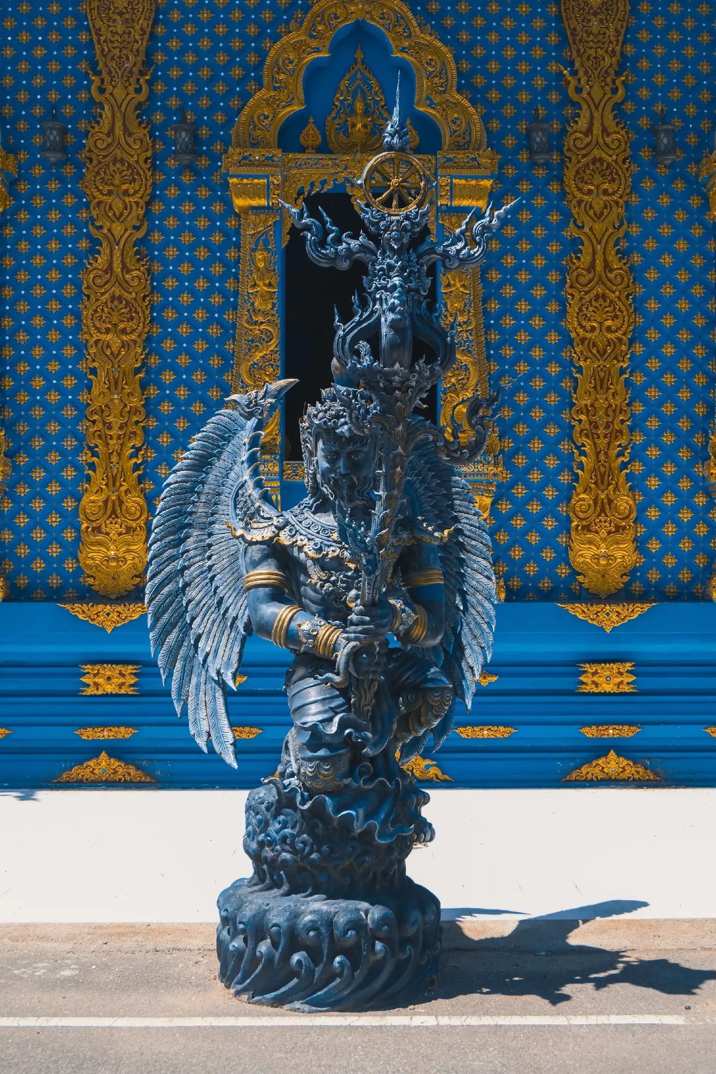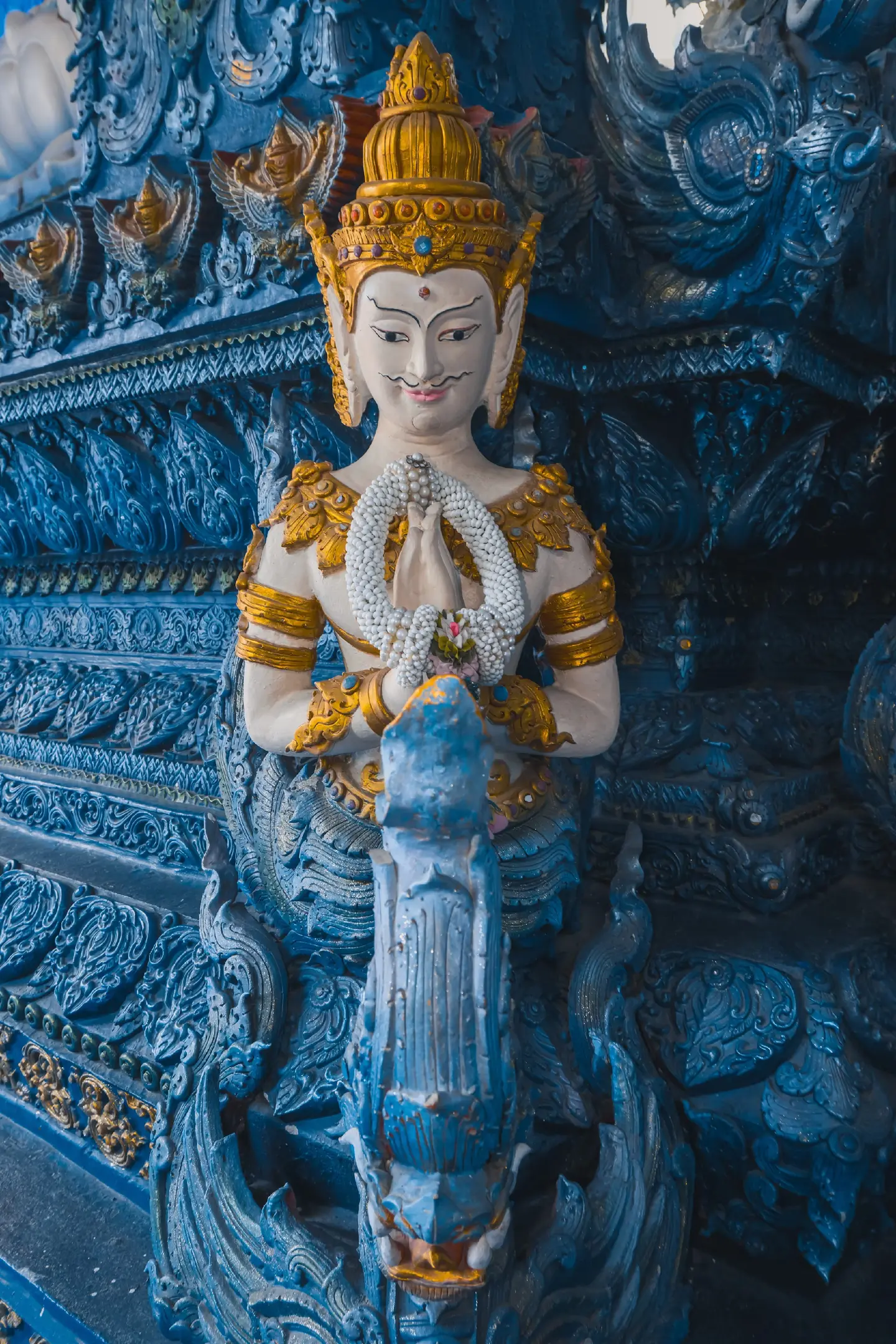 泰北蓝梦 | 清莱蓝庙,把天空星河藏进院墙里✨ 清迈旅行的额外惊喜,藏在清莱的一座蓝色寺庙里。从清莱市区驱车出发,不算太远的路程,却像穿过寻常街巷,突然撞进了一个钴蓝色的梦境——Wat Rong Suea Ten,这处被称作“蓝庙”的地方,是湄公河畔最治愈的色彩馈赠。 🔷 还没走进院墙,视线就被那抹纯粹的钴蓝牢牢锁住。整座寺庙的屋顶铺满了蓝色琉璃,阳光下亮得晃眼,却不刺眼,反而透着一种干净又神圣的质感。鎏金的龙形雕塑缠绕在廊柱上,蓝与金的碰撞,热烈又和谐,既有佛国寺庙的庄重,又多了几分让人眼前一亮的惊艳,完全不像传统寺庙的沉闷。 ✨ 推开门走进来,才发现内里的精彩更甚。彩色窗棂被阳光穿透,在蓝色的地砖上投下斑驳的光影,晃动间像是星河在地面流淌。庙内的壁画铺满墙面,鲜活又灵动,从神话里的神祇到生活中的烟火百态,每一笔都细腻入微,能看出匠人的用心。就连角落镇守的石狮,都不是威严得让人不敢靠近,反而透着几分憨态可掬的可爱,瞬间拉近距离。 🎐 在蓝庙里,最舒服的就是不用追赶行程。找个角落站定,或是坐在石阶上,看风轻轻拂过檐角的金铃,叮当作响的声音清脆又治愈。远处偶尔传来隐约的诵经声,和着风声,让人不自觉放慢呼吸。那抹静谧的蓝像是有魔力,能悄悄抚平旅途的疲惫与浮躁,让人心里变得格外安宁。 这里没有热门景点的喧嚣,只有色彩与信仰交织的美好。清莱蓝庙不是必打卡的任务,而是一场值得奔赴的蓝色之约——来过这里,才懂泰北的惊艳,不止有金色的佛塔,还有这样一片把天空与星河都定格下来的钴蓝梦境。