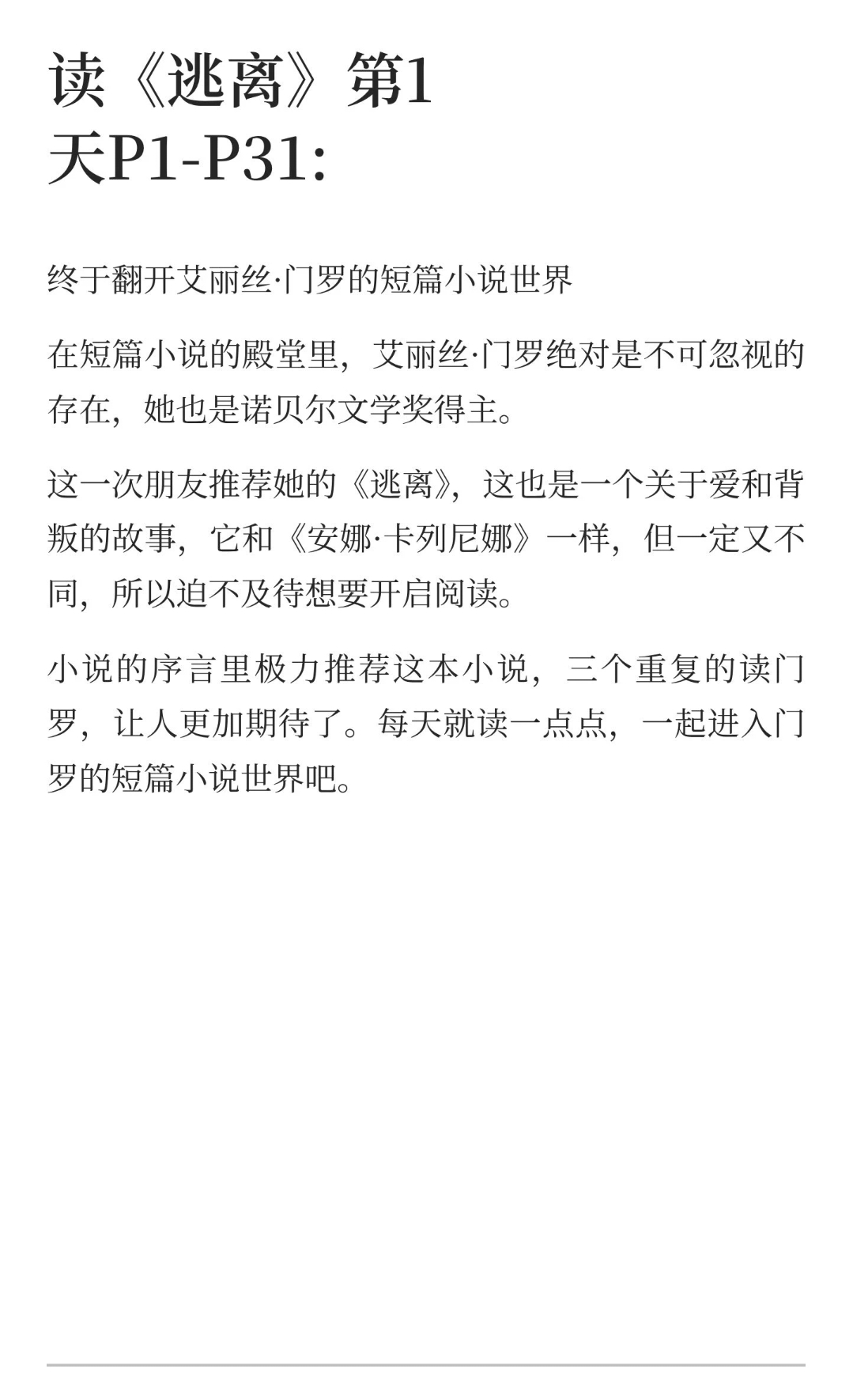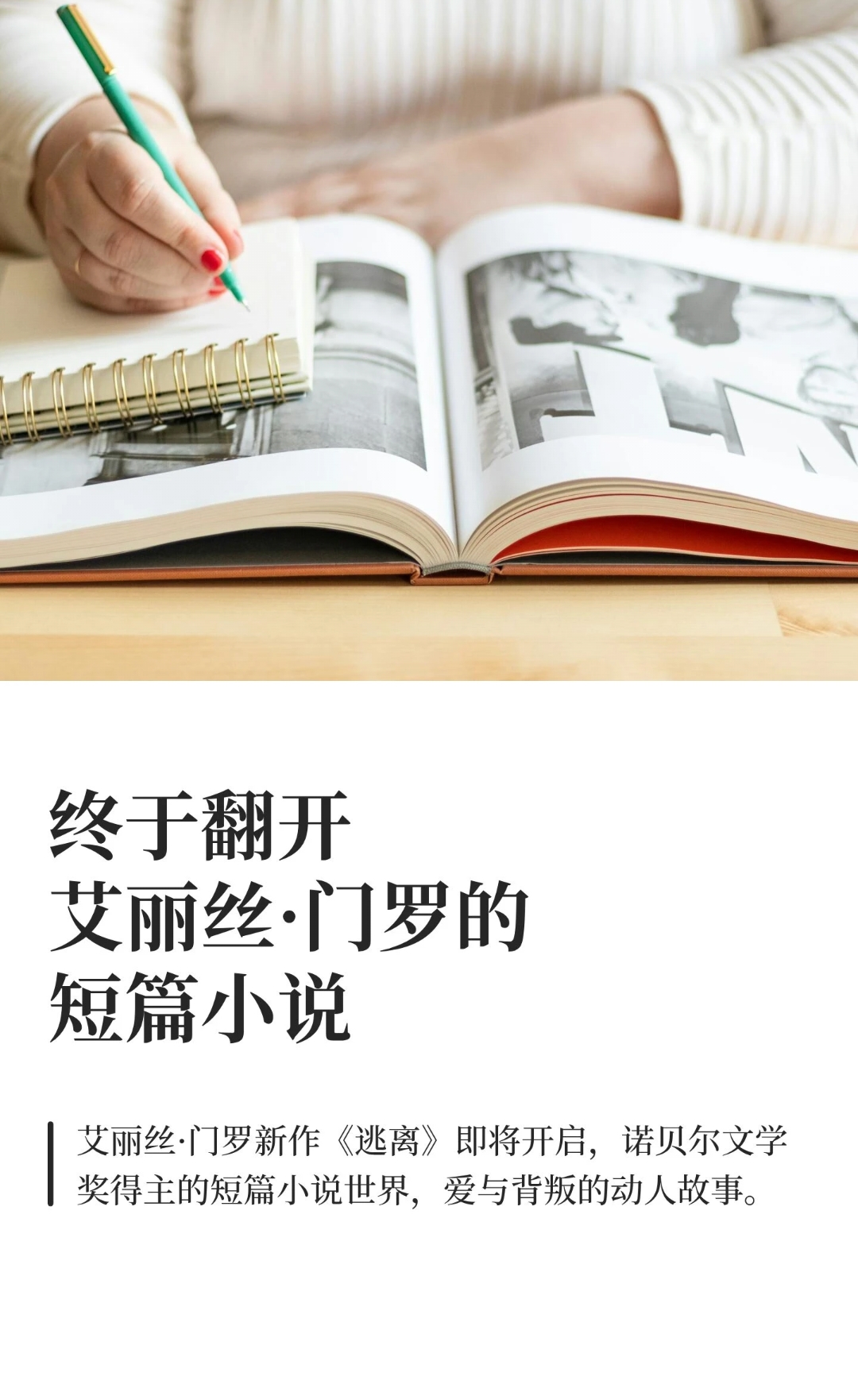 文学经典 | 《逃离》(一) 和我一起读《逃离》:第1—31页 终于翻开艾丽丝·门罗的短篇小说《逃离》,这是一部关于爱与背叛的故事,与《安娜·卡列尼娜》有异曲同工之妙。 门罗是诺贝尔文学奖得主,她的短篇小说独具魅力吸,吸引了无数读者,期待在她的文学世界中探索更多。 #女性在写作 #读书记录 #这个作家有点东西 #阅读分享
