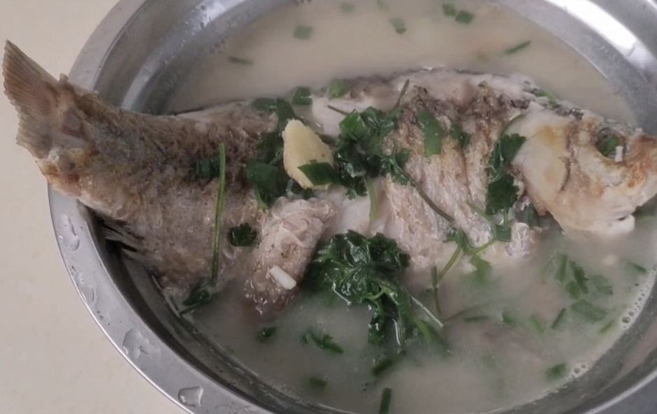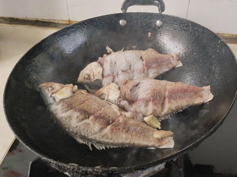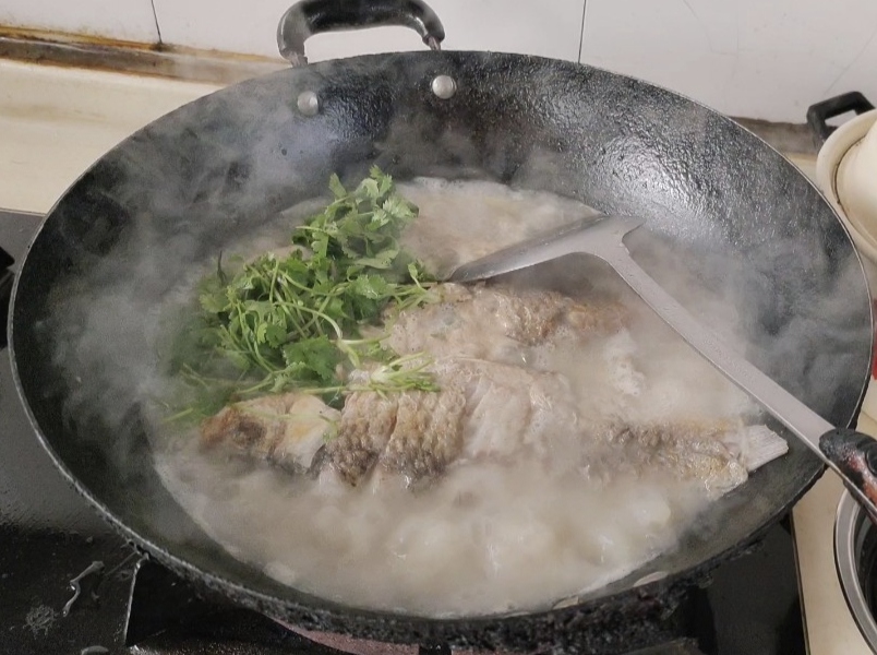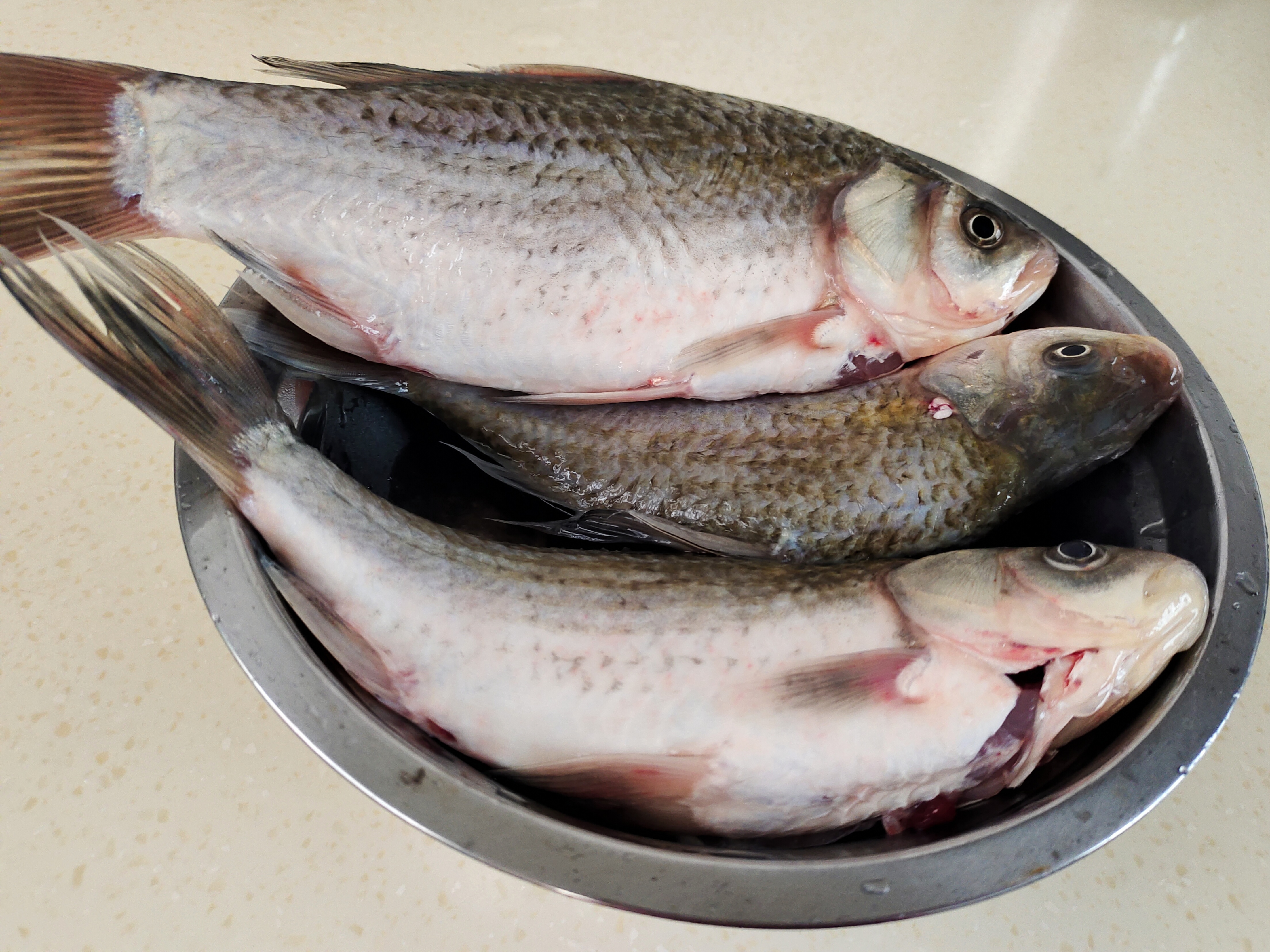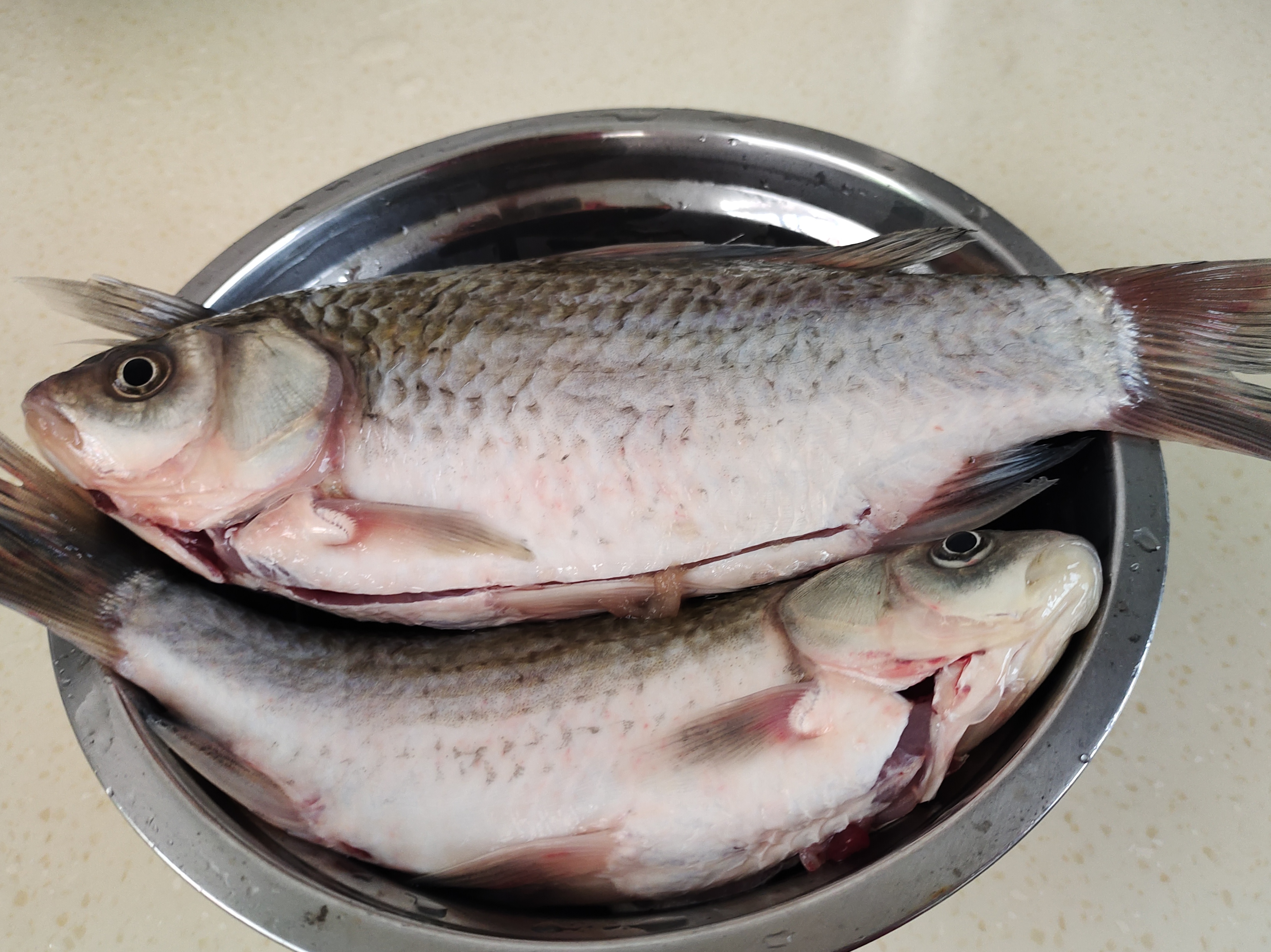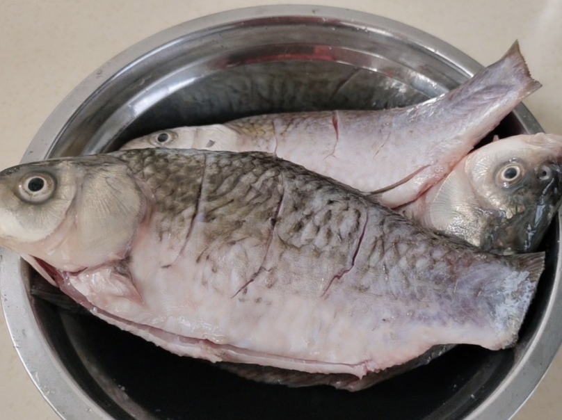 早上妹妹送来几条鲫鱼,先生炖了浓浓的鲫鱼汤,吃着鱼,喝着汤,享受着浓浓的情,特幸福。 食材:野生鲫鱼1000克,葱、姜、油、盐、料酒、白胡椒、味精、香菜适量。 制作步骤: 1、将鱼鳞、鱼鳃刮净,血水清洗干净; 2、用刀在鱼身两面各划三刀,在刀缝处和鱼肚里抹点盐,加料酒、姜片腌制20分钟; 3、铁锅烧热,倒入适量植物油,将鲫鱼放入煎至两面金黄,加入2000mL开水,大火炖10分钟至鱼汤变白,加入白胡椒、味精、香葱、香菜,香喷喷的鲫鱼汤就做好了。 汤鲜味美,营养丰富,秋冬滋补首选汤。