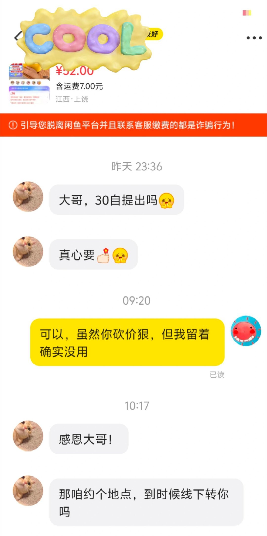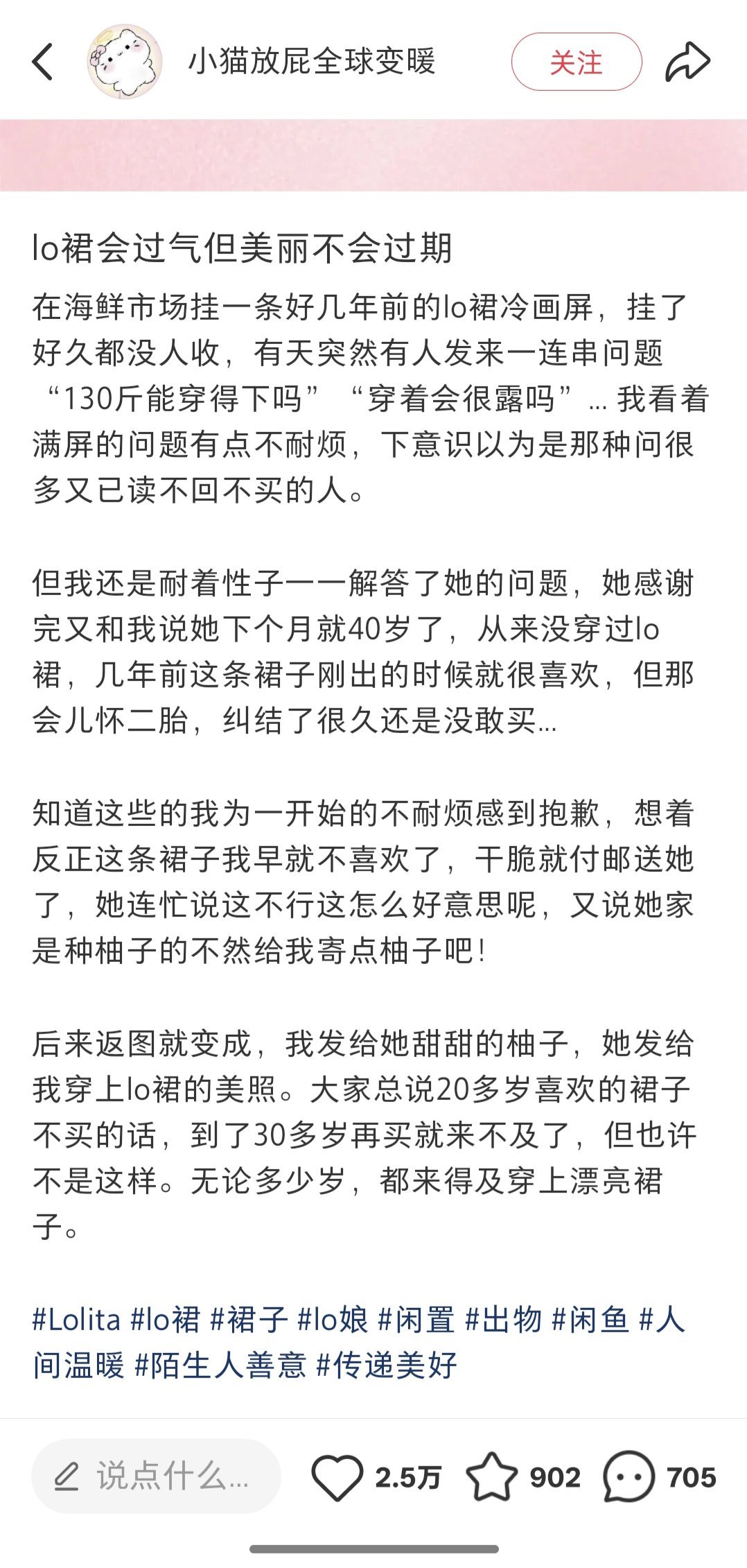 看到40岁的姐姐还在圆当年的lo裙梦,真的好感动!原po愿意付邮送裙子,姐姐也特意寄来自家种的柚子,这种双向奔赴的善意也太美好了!那些我们觉得过气的旧物,不是没用了,而是在等一个懂它的人,让美丽继续延续。想起之前有一位买家要买我的锅,虽然砍价有点多,但我留着也没用,就答应卖了。没想到付钱后对方从她的车上拿出了一杯奶茶给我,顿时觉得超级窝心 !突然觉得闲鱼真的很妙,不仅能给衣柜腾空间、让闲置物尽其用,还能在买卖之外,收获这种不期而遇的温暖和感动,这才是出闲置最棒的附加值呀!