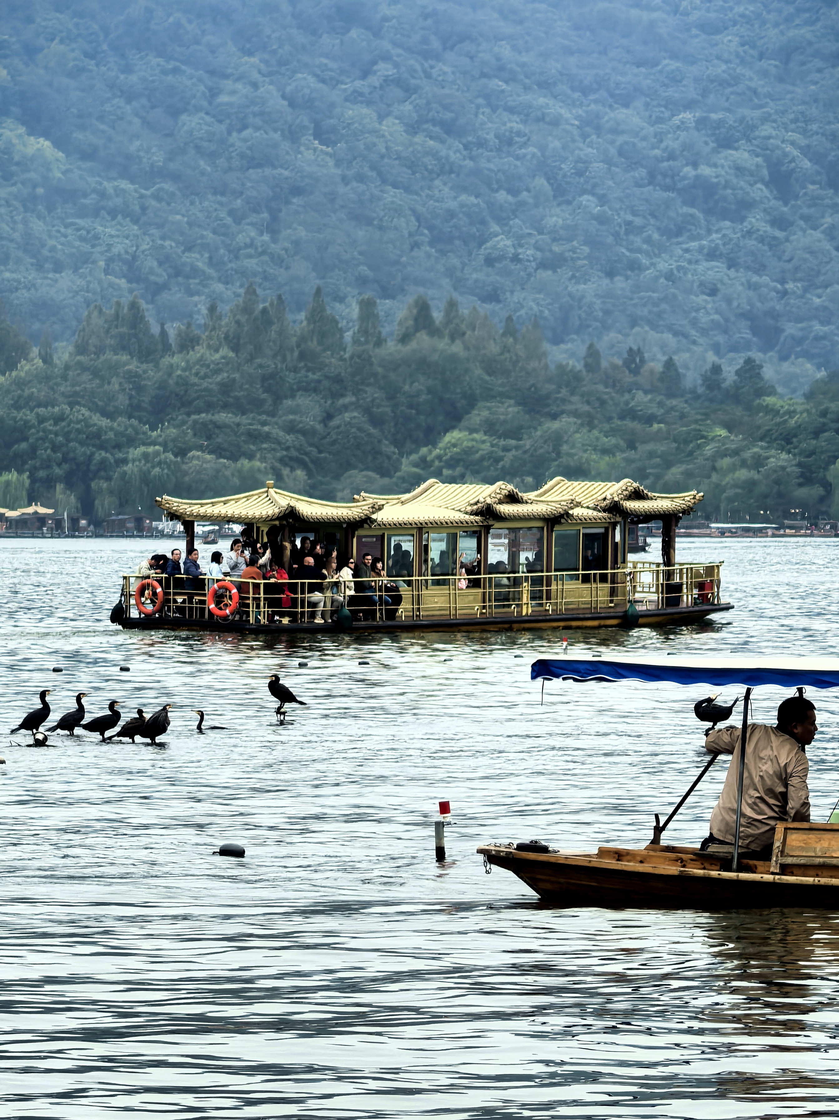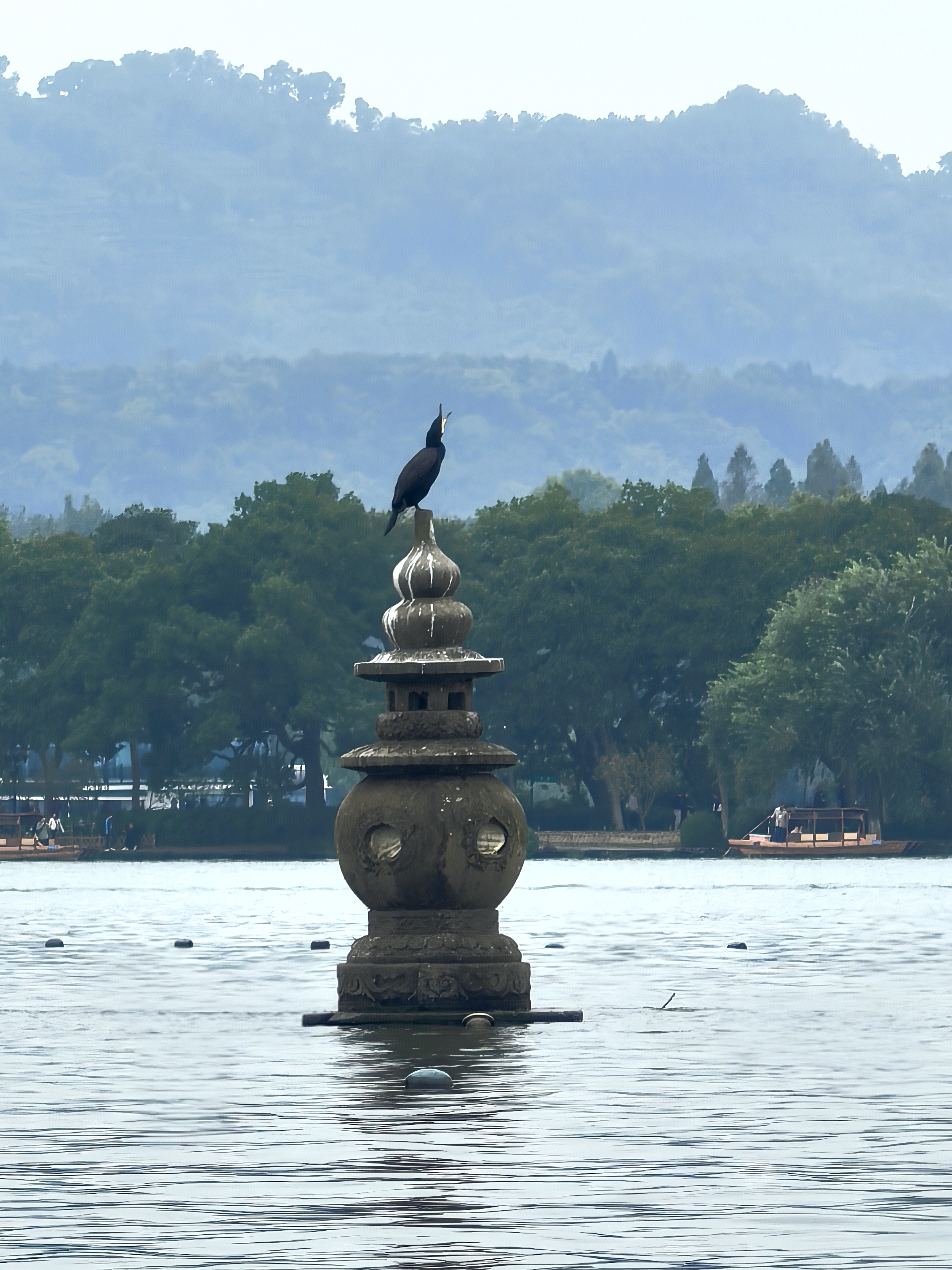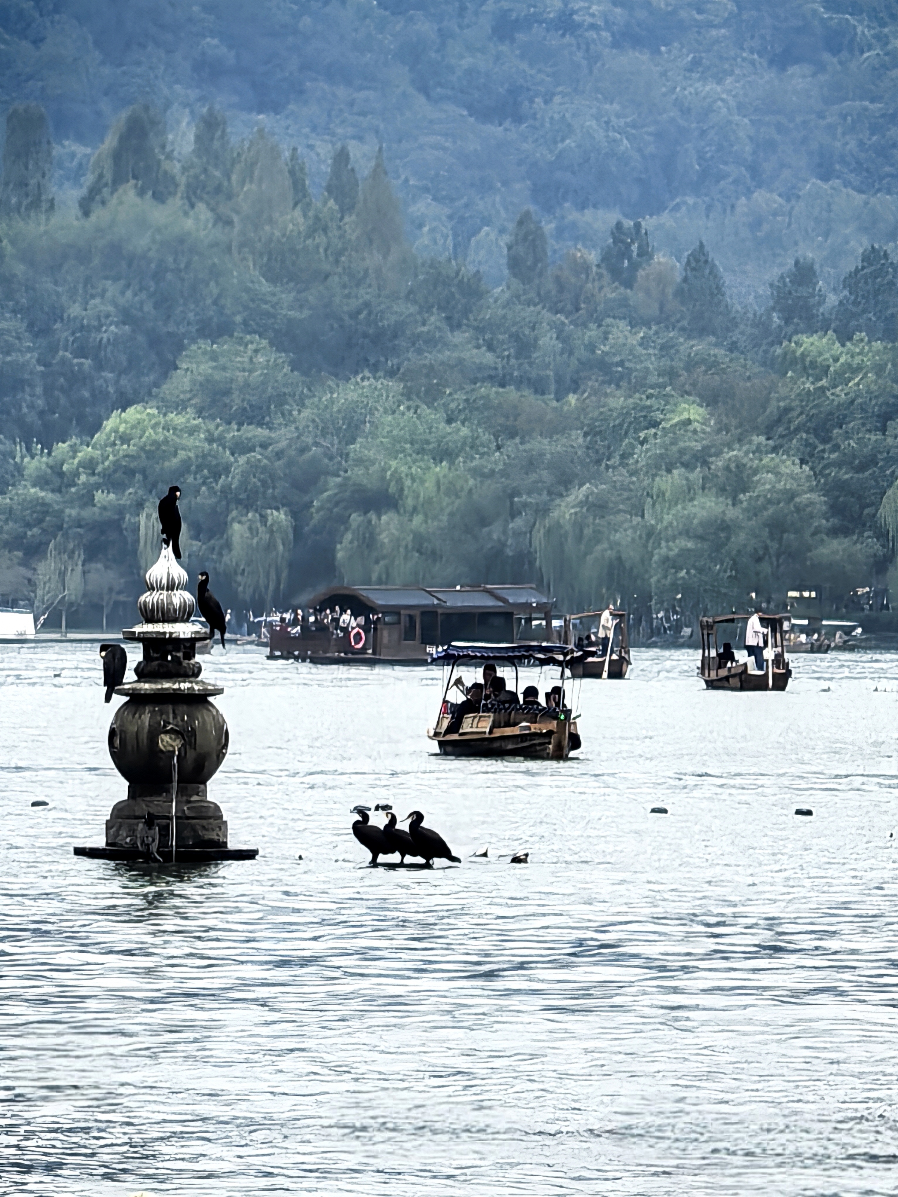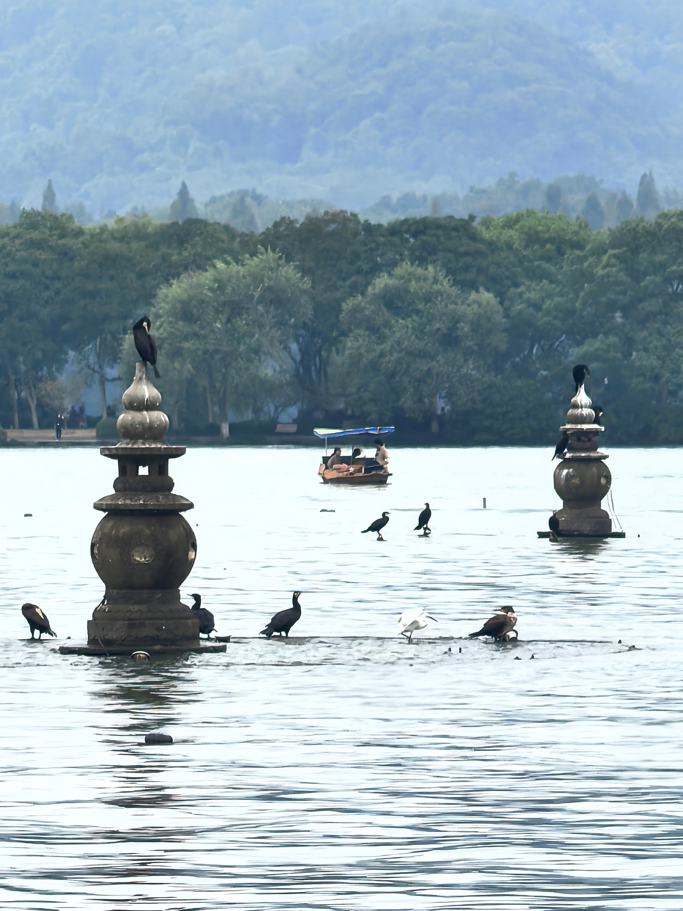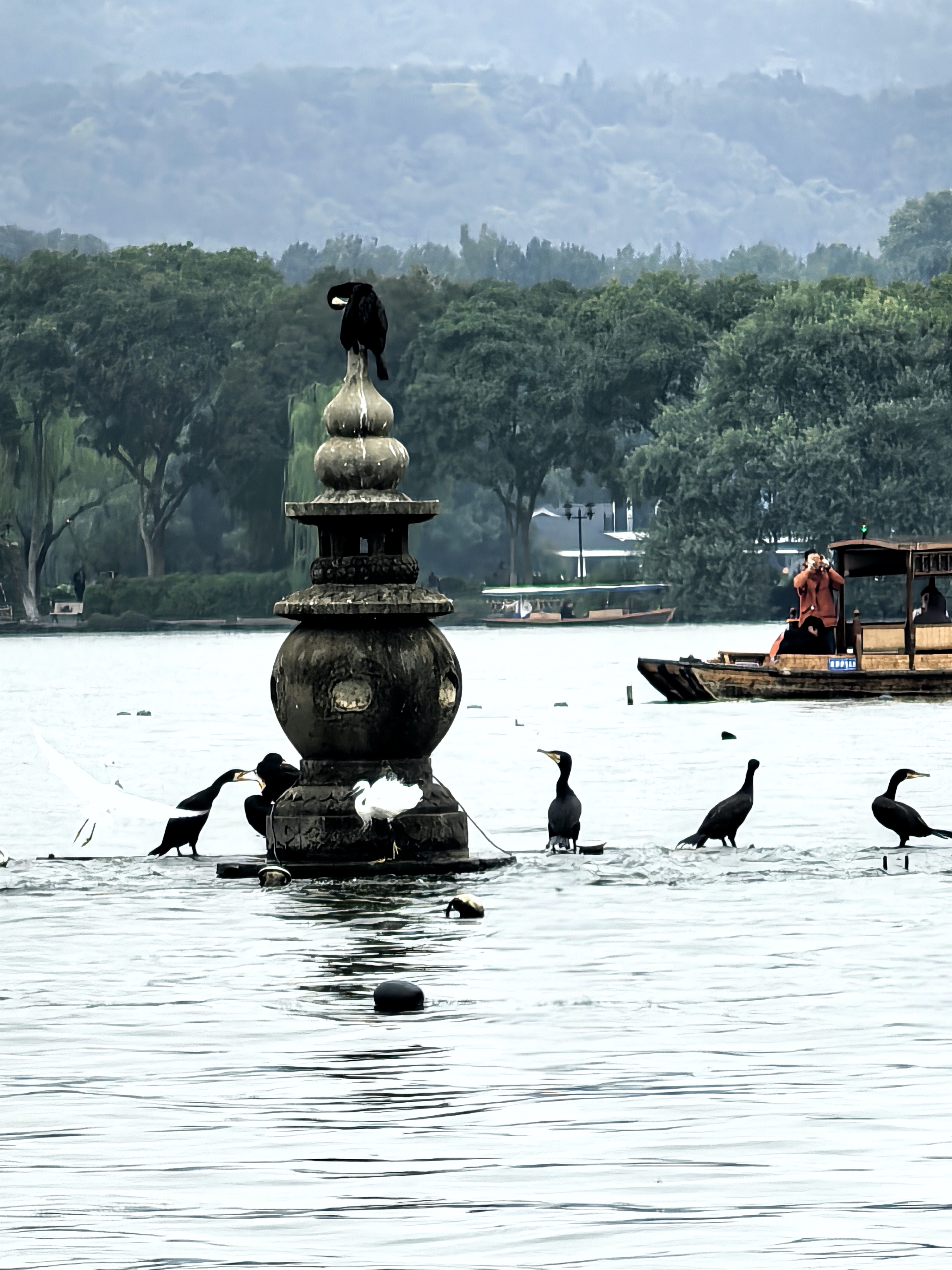 秋冬之交,又一次来到三潭印月,在我心相印亭下久久伫立。不为别的,只为赏那湖上灵动的鸟们。每次来,总得拍几张它们的时令照。 此时,普通鸬鹚已陆续抵达,它们是西湖最早的冬候鸟,每年10月初开始便翩然而至。瞧那三潭小石塔上,它们体态修长,通体黑色羽毛泛着金属光泽,头颈处紫绿色光泽流转,两肩与翅膀呈青铜色,细长的喙透着精干。 它们或栖息于石塔上,或者站桩于湖水间,成群结队,叽叽喳喳。如果瞄准了猎物,就会一个猛子扎进水里,凭借精湛的潜水本领捕到鱼。 一直以来我都以为它们是一群夜鹭。其实这个时候更多的是黑色的鸬鹚,也有少数的白鹭与它们和平相处。偶尔,还能看到白骨顶,它们头部白色额甲醒目,黑色身躯带着金属光泽,在湖面自在游弋。 岸上、船上的人来来往往,目光却总被这些鸟吸引。三潭印月的鸟儿,成了这湖上当之无愧的主角,日复一日,演绎着独属于它们的精彩。