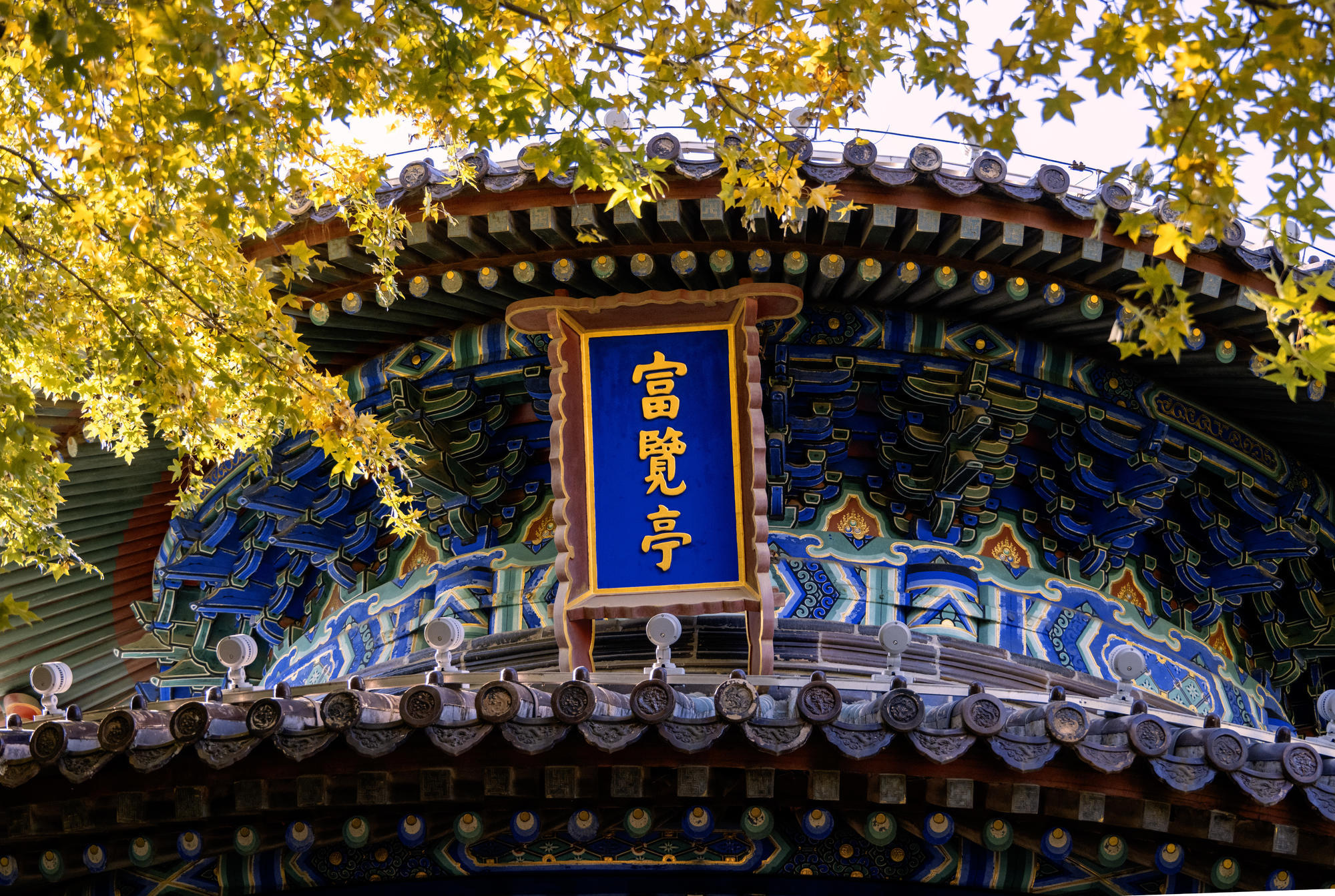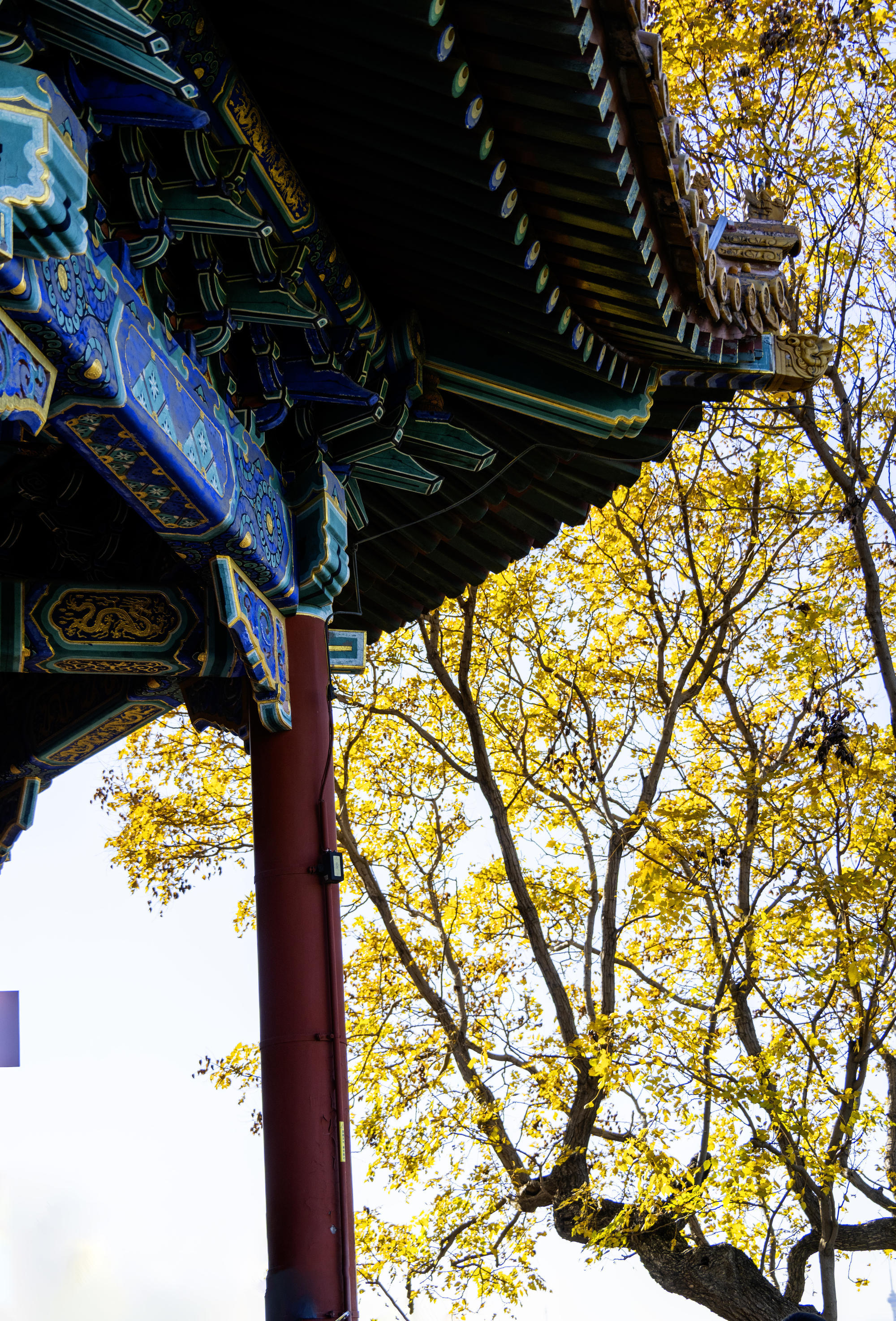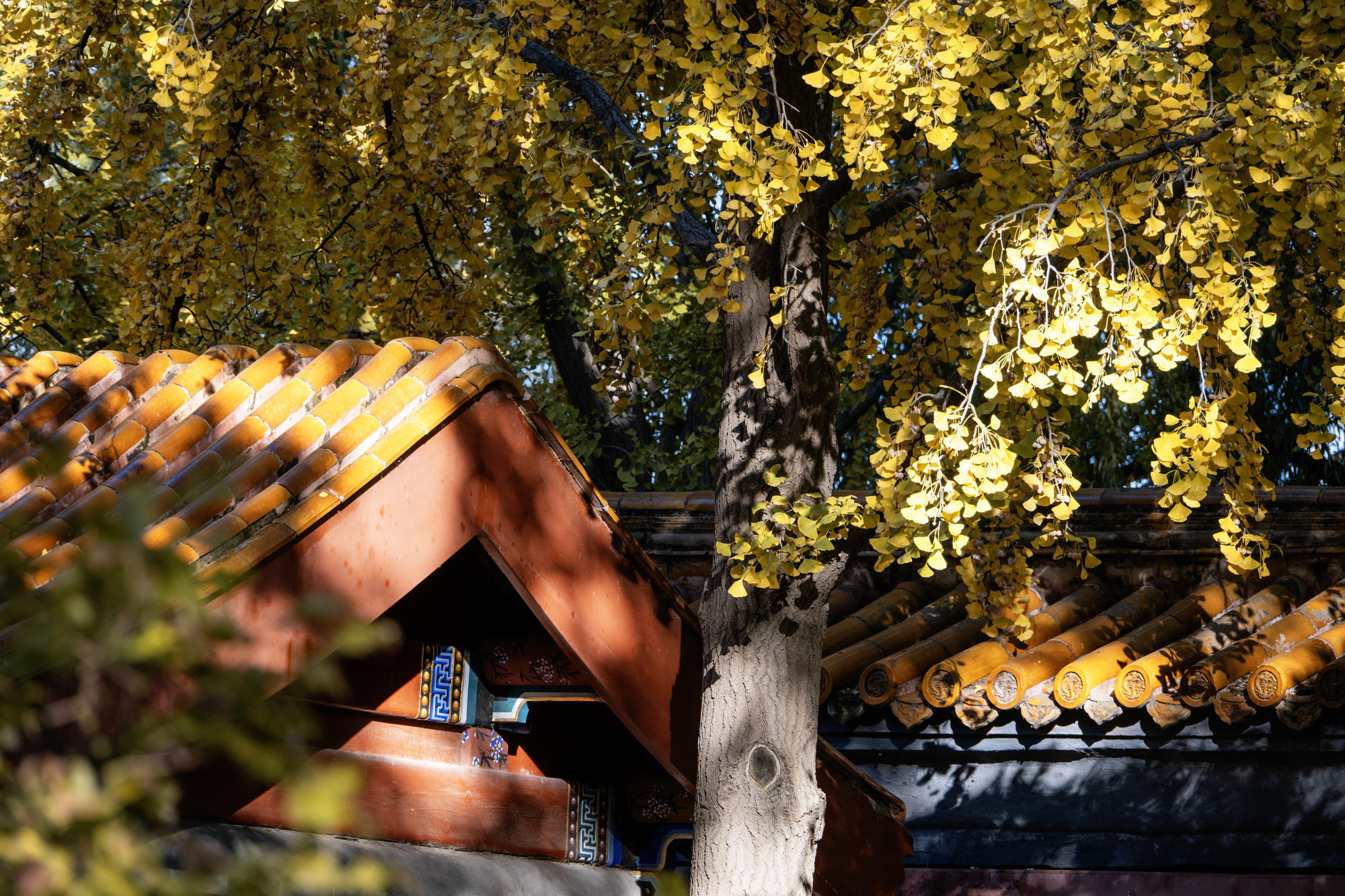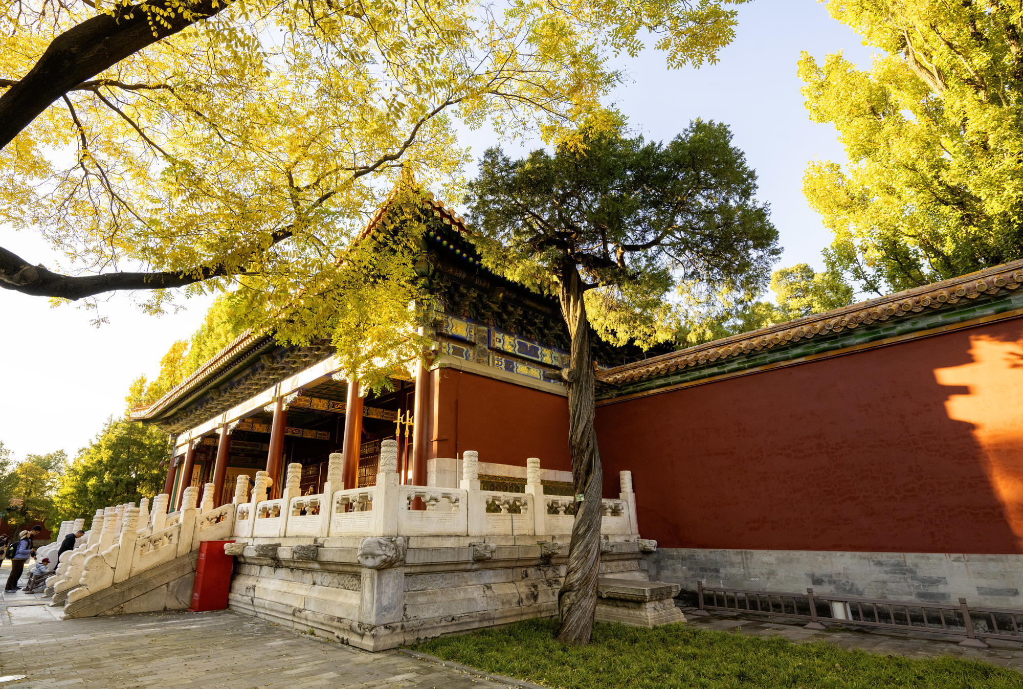 景山公园坐落于北京中轴线的中心位置,南与故宫神武门隔街相望,西接北海公园,占地二十三万平方米,山体海拔九十四点二米,曾为北京城中轴线上最高之巅。秋天的景山公园一片金黄,赏心悦目。园内殿宇错落,寿皇殿、观德殿、护国忠义庙、绮望楼等历史遗迹静立其间,诉说着岁月的厚重与沧桑。