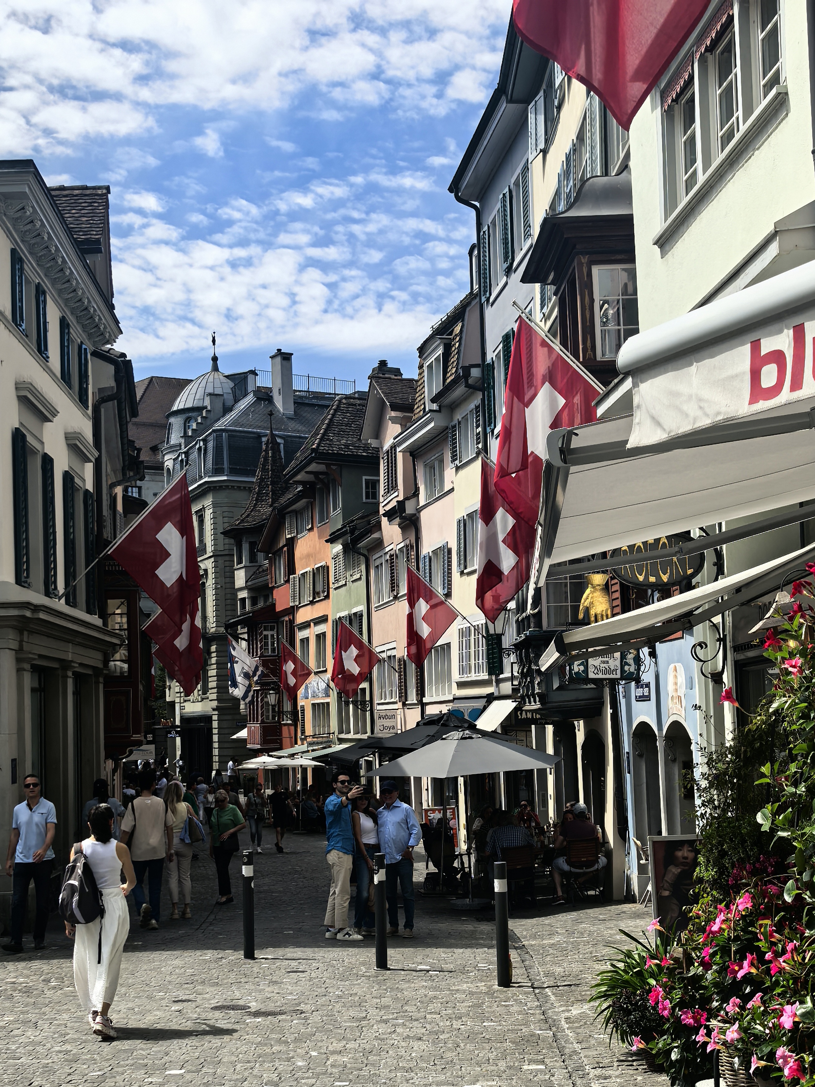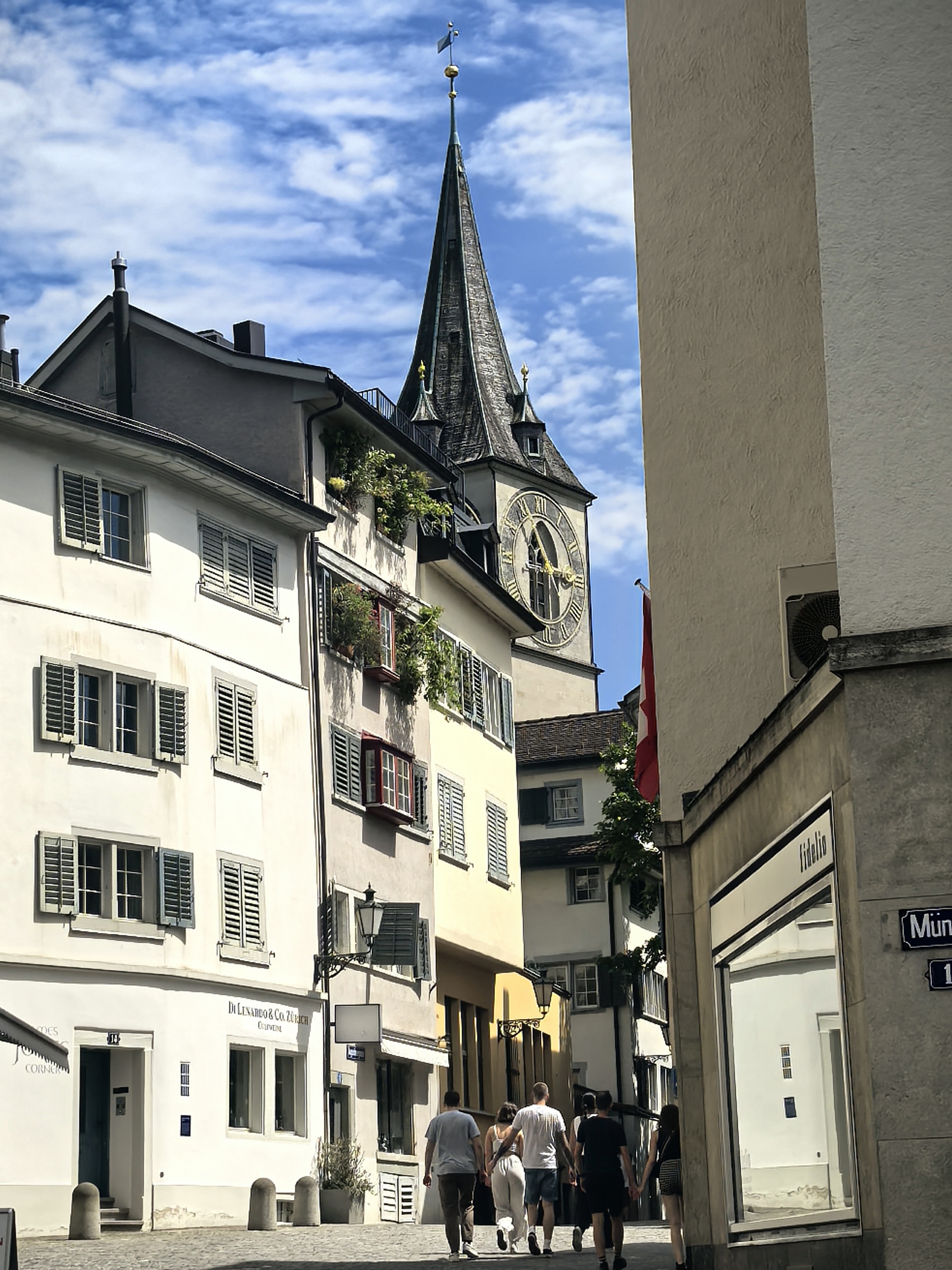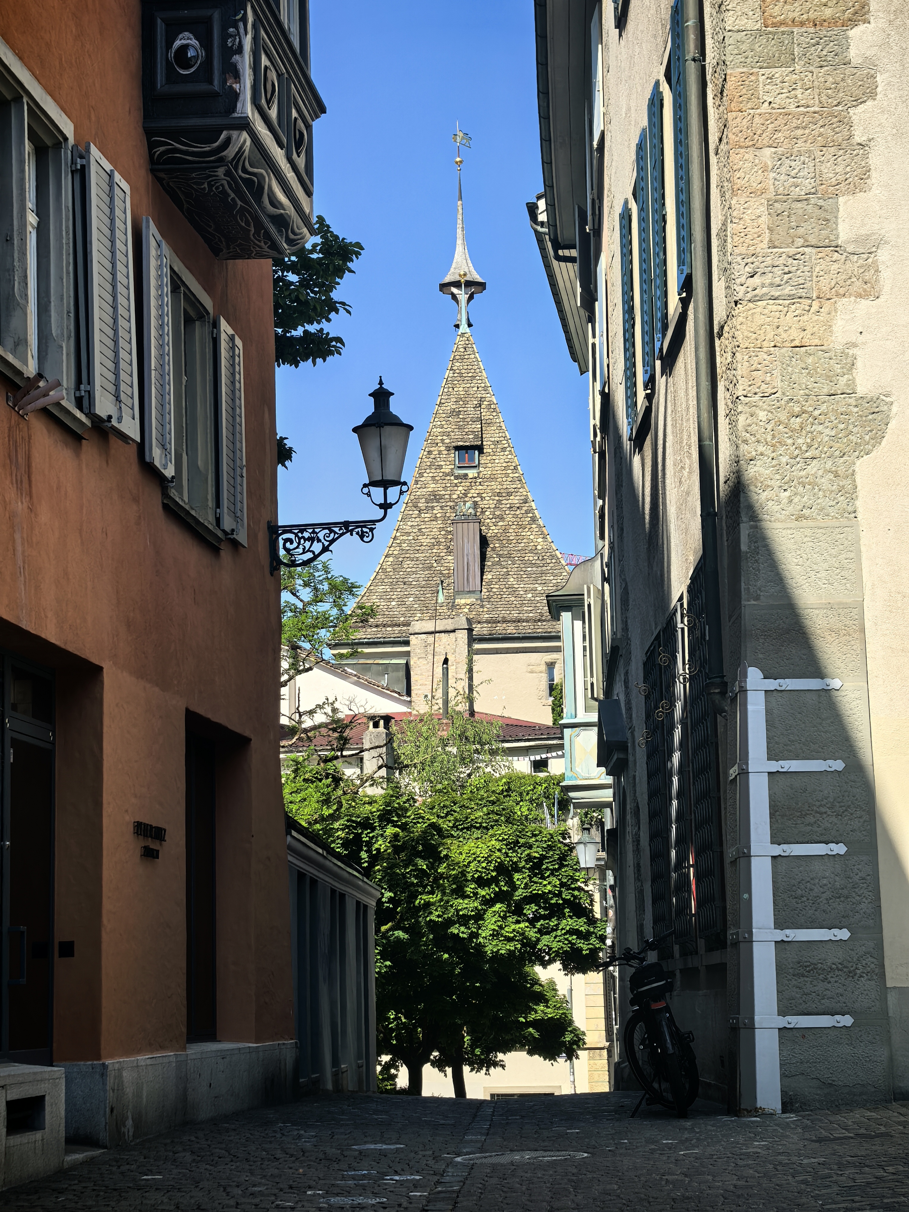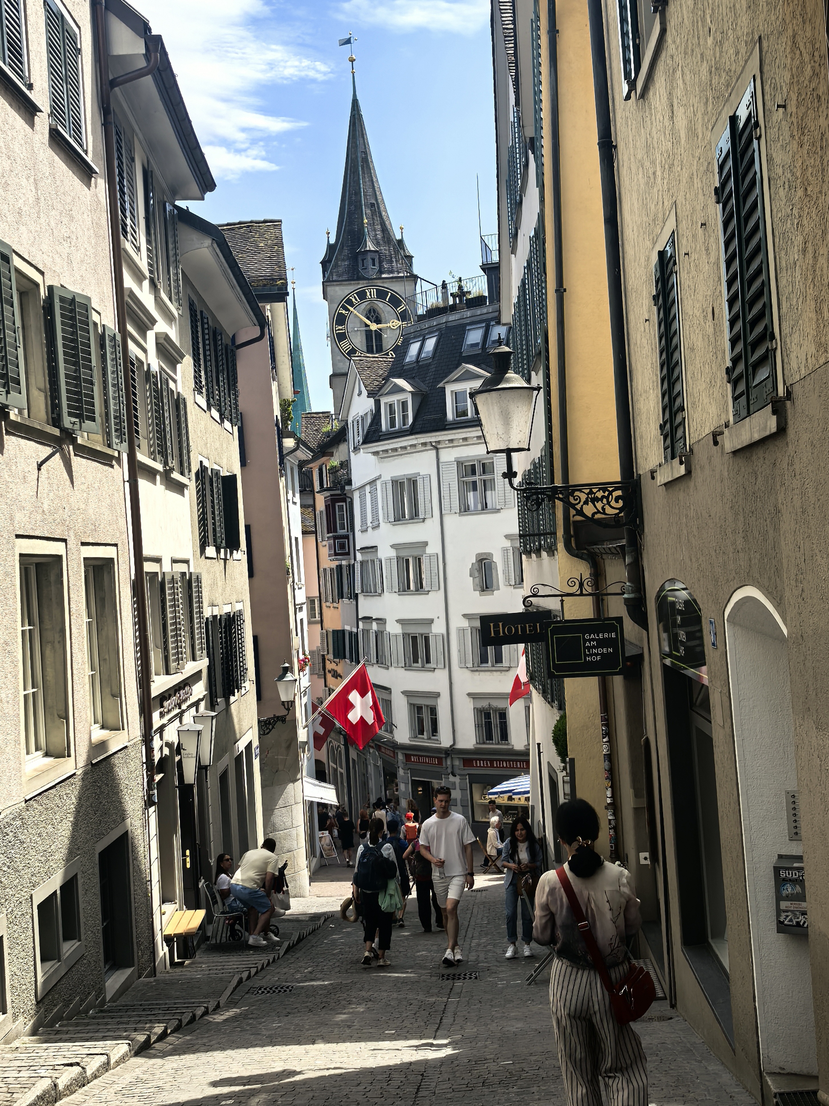 从林登霍夫山丘的石栏边望下去,苏黎世的老城像一幅摊开的、微缩的彩绘地图,利马特河如一条柔软的银带,从中轻轻划过。我顺着那陡峭而幽静的小径走下去,仿佛是从一个清寂的观景台,一步步沉入了一座活色生生的城池。 蛛网般密布的小巷,喧嚣的市声便扑面而来。脚下的石板路被岁月磨得温润,缝隙里透着潮湿的光。两旁的古老建筑并肩而立,在头顶几乎挤出一线天光。巷子窄而深,幽幽地延伸着,每一个转角都可能藏着惊喜。 循着人声与咖啡的焦香,不觉已到了圣母大教堂脚下。那儿有个热闹的小小市集,色彩斑斓的衣服、手工艺品、鲜花、蜂蜜在临时支起的木摊上。游人慢悠悠地逛着,看着,好像这也是一种休闲的过程。 而一旁的露天咖啡座早已满座,穿着围裙的侍者托着银盘,在桌椅的缝隙里蝴蝶般穿行,那空气里都浮动着一种闲适的、暖洋洋的喜悦。 每一条小巷,最终都像溪流汇入大河一般,融入那条声名在外的班霍夫大街。方才的幽静霎时被一种极致的繁华所取代。脚下的电车轨道上,有轨电车叮叮当当地,沿着轨道滑行,像这座城市优雅而节制的脉搏。街道两旁,名店林立,橱窗明亮得像一场不愿醒来的奢华梦境,珠光宝气,壕气逼人。 我随着人流漫步,看这长长的街道从火车站一路铺陈至波光粼粼的苏黎世湖畔,真叫一个眼花缭乱,仿佛走完了一段从人间烟火到尘世天堂的旅程。