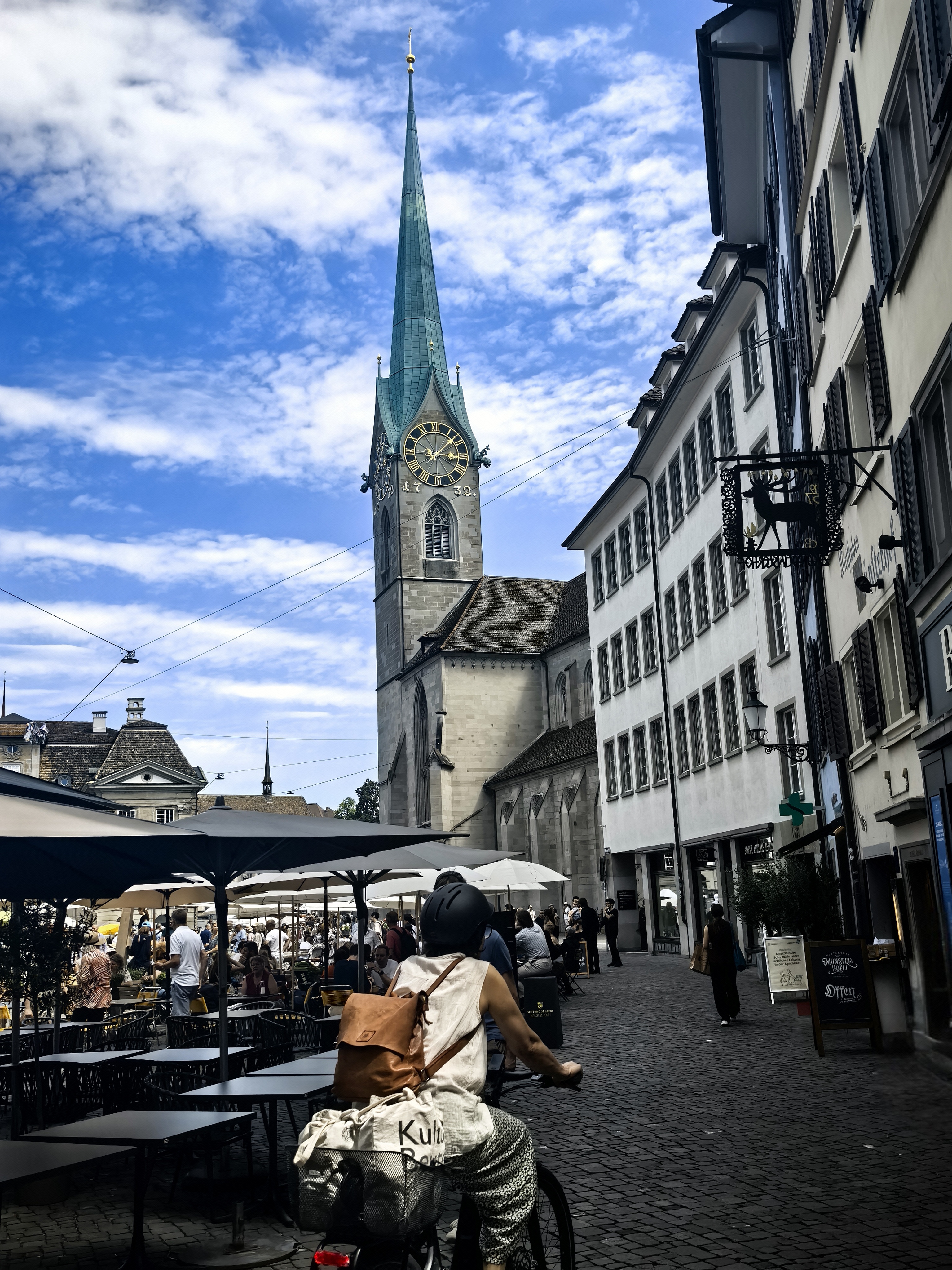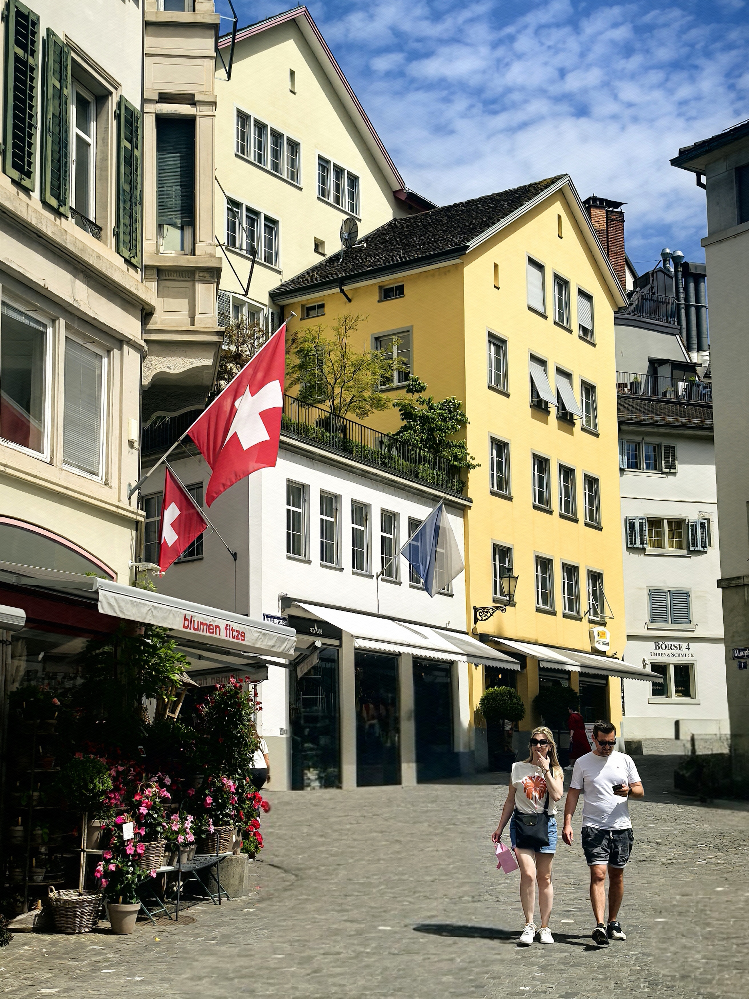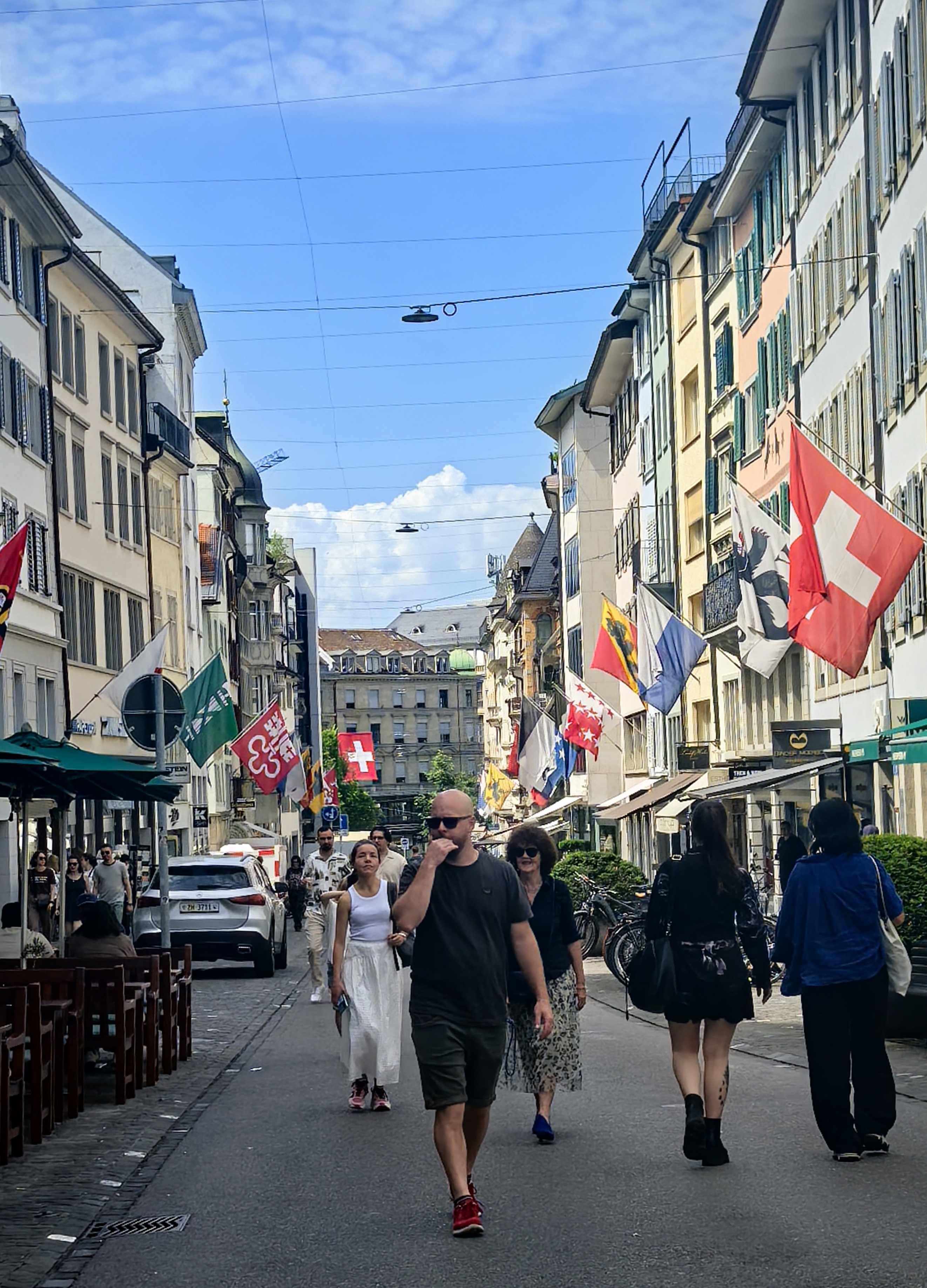 从林登霍夫山丘的石栏边望下去,苏黎世的老城像一幅摊开的、微缩的彩绘地图,利马特河如一条柔软的银带,从中轻轻划过。我顺着那陡峭而幽静的小径走下去,仿佛是从一个清寂的观景台,一步步沉入了一座活色生生的城池。 蛛网般密布的小巷,喧嚣的市声便扑面而来。脚下的石板路被岁月磨得温润,缝隙里透着潮湿的光。两旁的古老建筑并肩而立,在头顶几乎挤出一线天光。巷子窄而深,幽幽地延伸着,每一个转角都可能藏着惊喜。 循着人声与咖啡的焦香,不觉已到了圣母大教堂脚下。那儿有个热闹的小小市集,色彩斑斓的衣服、手工艺品、鲜花、蜂蜜在临时支起的木摊上。游人慢悠悠地逛着,看着,好像这也是一种休闲的过程。 而一旁的露天咖啡座早已满座,穿着围裙的侍者托着银盘,在桌椅的缝隙里蝴蝶般穿行,那空气里都浮动着一种闲适的、暖洋洋的喜悦。 每一条小巷,最终都像溪流汇入大河一般,融入那条声名在外的班霍夫大街。方才的幽静霎时被一种极致的繁华所取代。脚下的电车轨道上,有轨电车叮叮当当地,沿着轨道滑行,像这座城市优雅而节制的脉搏。街道两旁,名店林立,橱窗明亮得像一场不愿醒来的奢华梦境,珠光宝气,壕气逼人。 我随着人流漫步,看这长长的街道从火车站一路铺陈至波光粼粼的苏黎世湖畔,真叫一个眼花缭乱,仿佛走完了一段从人间烟火到尘世天堂的旅程。