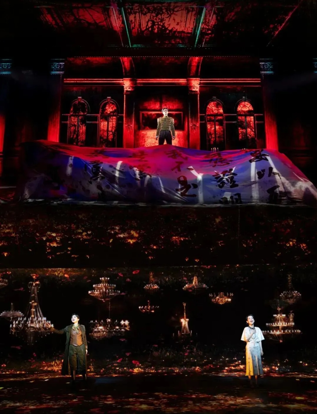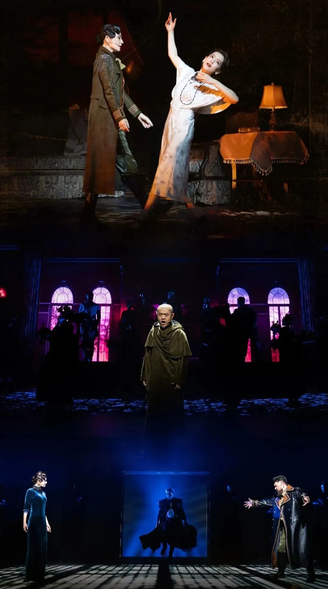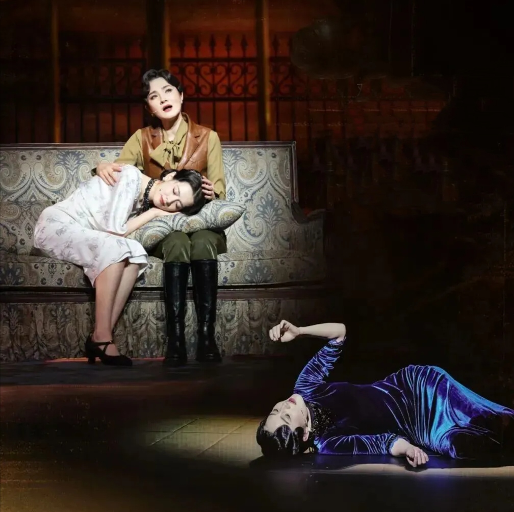 阿云嘎的音乐剧《风声》,改编自麦家的同名小说。揪内鬼行动,是一个明知是坑也得跳的阳谋,一场牺牲生命换情报稳妥传递的接力,一场拿性命豪赌的血色浪漫。 讲述了书中小说家设计的故事,和电影版潘父(玉姐哥哥,晓梦前夫)视角的故事有很大区别,不如原著的反转有冲击力,但胜在舞美和演唱,也足够精彩绝伦,荡气回肠。 一开始就交代了玉姐是老鬼的设定,悬疑色彩集中在她要如何在周旋中维持人设,摆脱身份嫌疑,还不动声色地传递情报,打破困局。 电影中顾晓梦和大队长通过一段唐山皮影戏《空城计》确定彼此身份,心照不宣地靠互相攻击,保一人脱困避免团灭。 音乐剧中玉姐上来就攀咬队长。队长以死告发明志,导致她唯有以身入局,方能以尸身传递最后的情报。 此番莫名的针锋相对,导致队长下线得属实冤大头,没有彼此的守护顶罪更能打动人,也让情报传递有太多不确定。 电影中顾晓梦和吴志国通力配合唱双簧,靠一出造谣翻脸强化冲突,后交出香烟的戏码洗脱嫌疑。而晓梦为掩护上级,求玉姐举报陷害自己,将情报缝入内衣的针脚,作为传递情报的最后希望,也提高了情报传递成功的概率。 音乐剧隐去了顾的重庆卧底身份,淡化了她的担当,以及二人互相救赎的戏码。晓梦发现药丸上玉姐模仿自己的笔迹,二人配合演出决裂的戏码,晓梦凭举报画中的摩斯电码消除怀疑,最终走出裘庄。 音乐剧的顾晓梦,像一个玩世不恭的富家小姐。和玉姐相拥着跳舞谈心,在玩味的神情中试探,唯一的高光是二人情比金坚,非同寻常的情义。 晓梦并没有投身革命的信仰,没有权衡利弊的需要。她难过的是发现感情遭背叛的证据,破防的是惊觉玉姐笼络她只是为了利用她获取情报,最后依然用眼泪托付自己的志愿。 玉姐明知这一切是揪出老鬼设下的圈套,一举一动皆会被监控,还以身入死局。晓梦被玉姐为大义赴死的胆魄和意志震撼到了,甘愿赌上性命,成全其遗愿。 电影的李林玉则强装镇定,眼神中满溢着惶恐无措。入裘庄后不停写信缓解不安,被甄别后伪装出破碎脆弱的模样,企图让敌人放松警惕。 音乐剧的玉姐更为冷静克制,画画也只是为情报传递埋伏笔。对她来说,情报比生命更重要,即使身心遭受重创,也要坚守信仰,与恐惧对抗。 而玉姐利用信任迫使晓梦揭发自己,坐实自己的老鬼身份,也能帮爱人自证清白,脱离险境。最后也要保护对方的知己情也太好磕了! 其实,老鬼不是一个人,是一种奋不顾身的精神,一种将生死置身事外的信仰。即使没有上级任务,也会责无旁贷牺牲自己传递情报,奔赴这场有去无回的无声接力。 只要有信仰在,即使身处炼狱,人人都可以化为刺向敌人的利刃,至暗时刻中不灭的明灯。