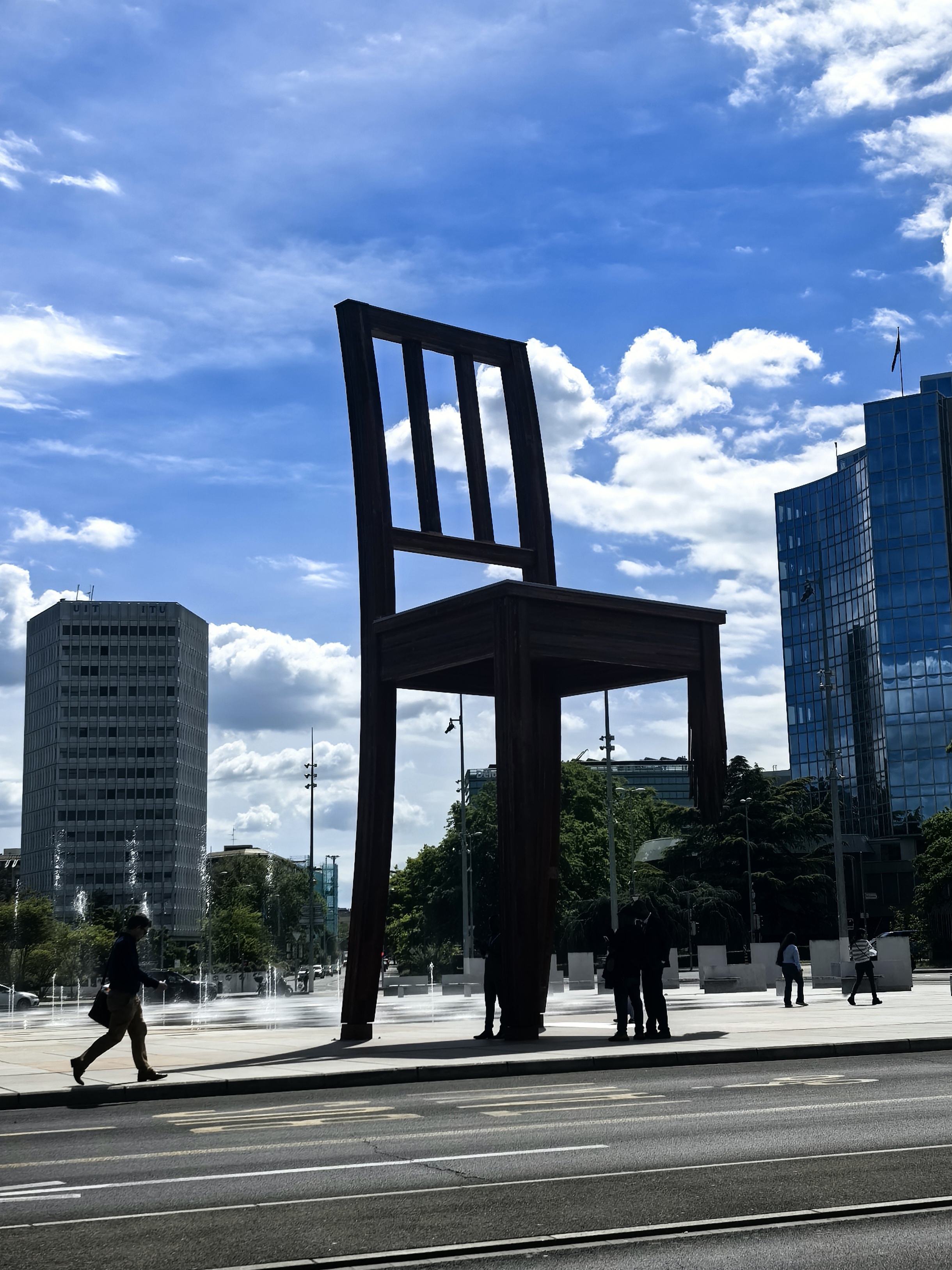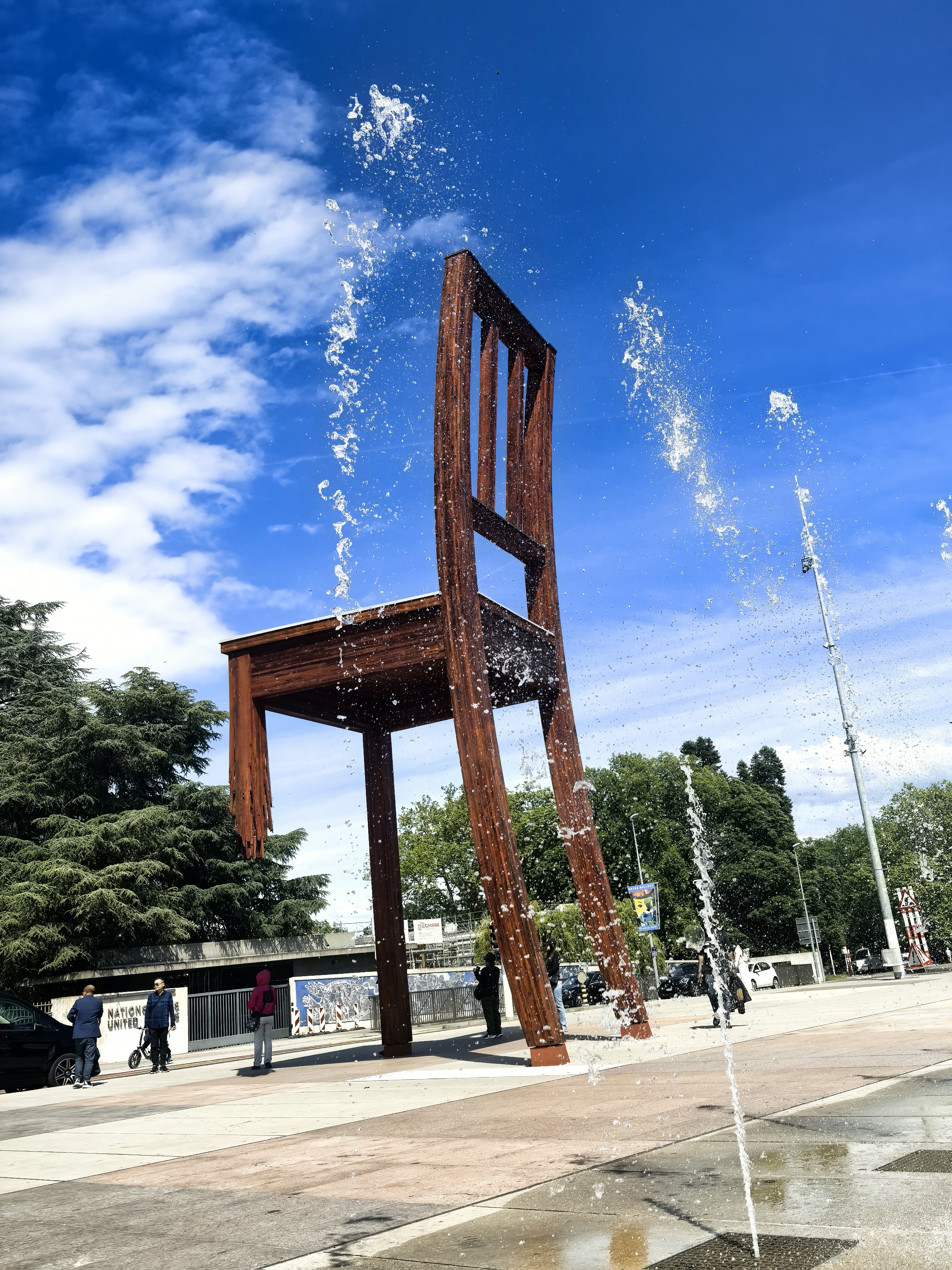 踏入日内瓦万国广场,联合国万国宫庄严肃穆地映入眼帘。这座白色建筑群,巨大玻璃幕墙倒映着湖水与天空,将自然与人文之美完美交融。虽然因休馆无法入内,但从外表看,它的威严神圣依旧扑面而来,作为国际联盟诞生地、联合国欧洲总部,无数关乎人类命运的决议在此诞生,无数跨越国界的对话在此上演。 广场上,瑞士雕塑家丹尼尔·伯塞特创作的12米高、重5吨的断腿大椅格外醒目。它以残缺姿态,强烈冲击着人们的视觉,象征着被地雷摧残的平民,无声地呼吁世界关注战争创伤,守护和平。这,正是日内瓦这座城市最深刻的底色。