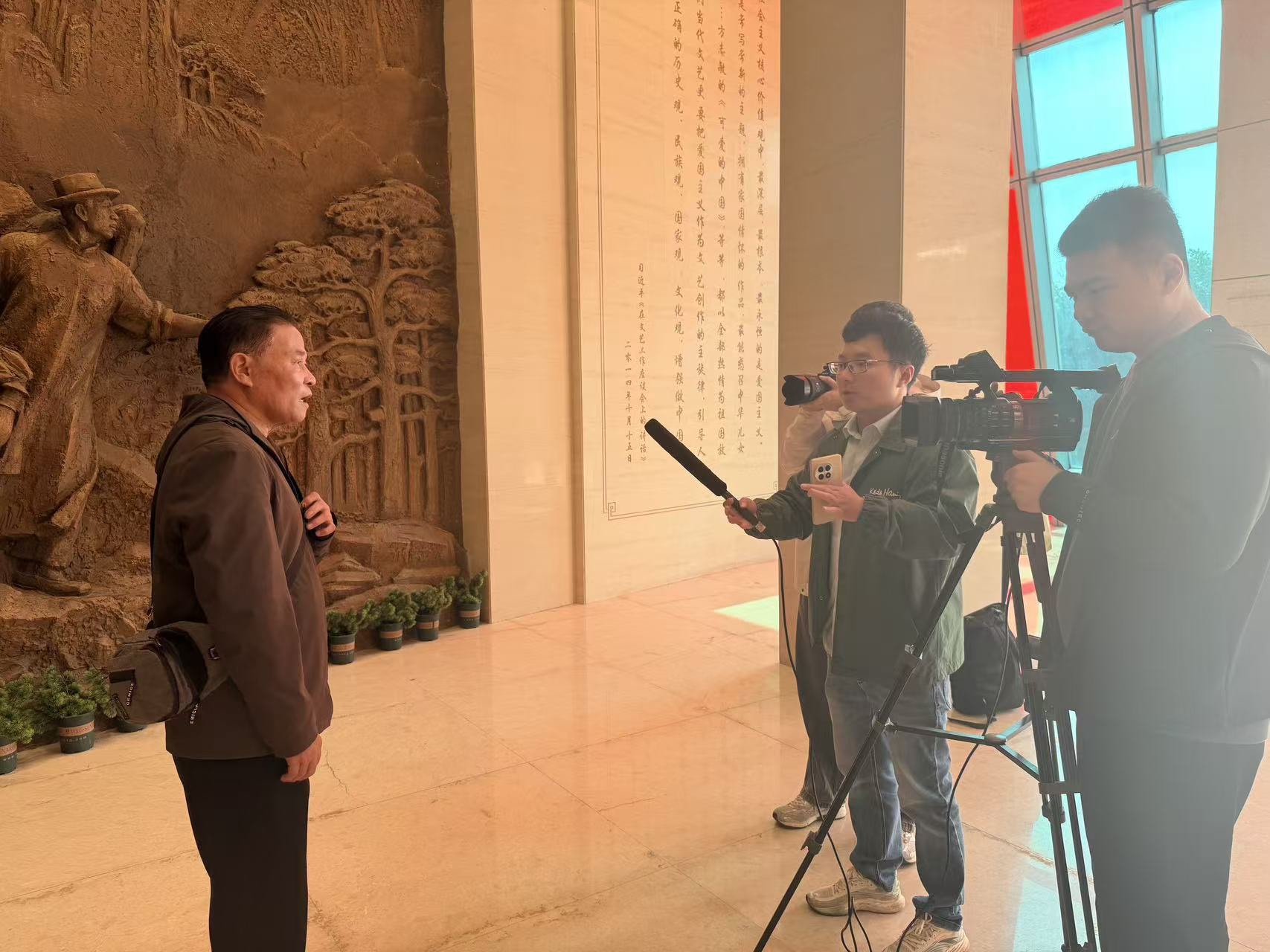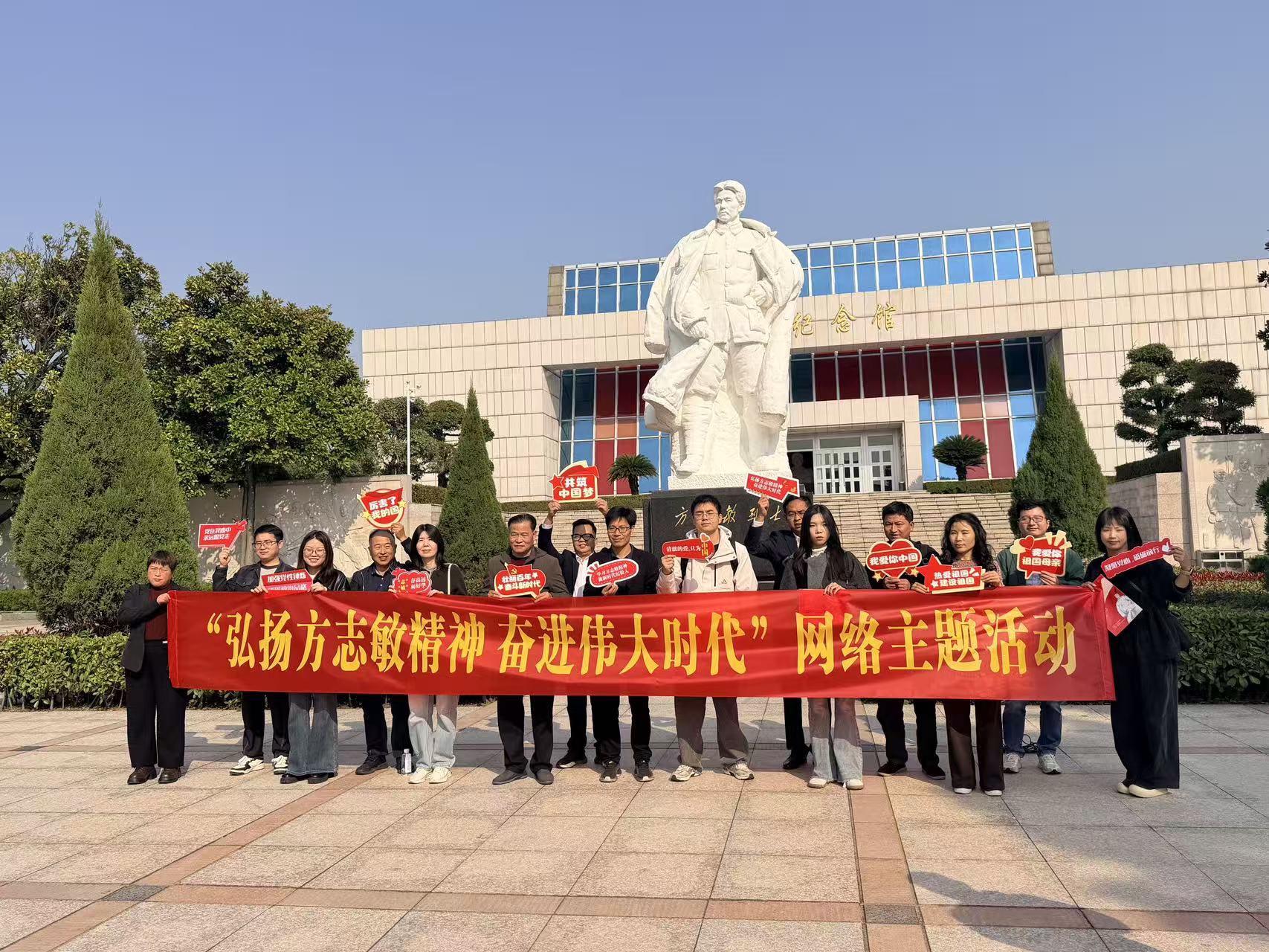 在方志敏纪念馆前,一群人开展“弘扬方志敏精神 奋进伟大时代”网络主题活动。大家手持主题标语牌,簇拥着写有活动主题的红色横幅,背景是方志敏烈士雕像与纪念馆建筑,蓝天绿树映衬下,尽显对革命精神的传承与弘扬之态。#弘扬方志敏精神奋进伟大时代#