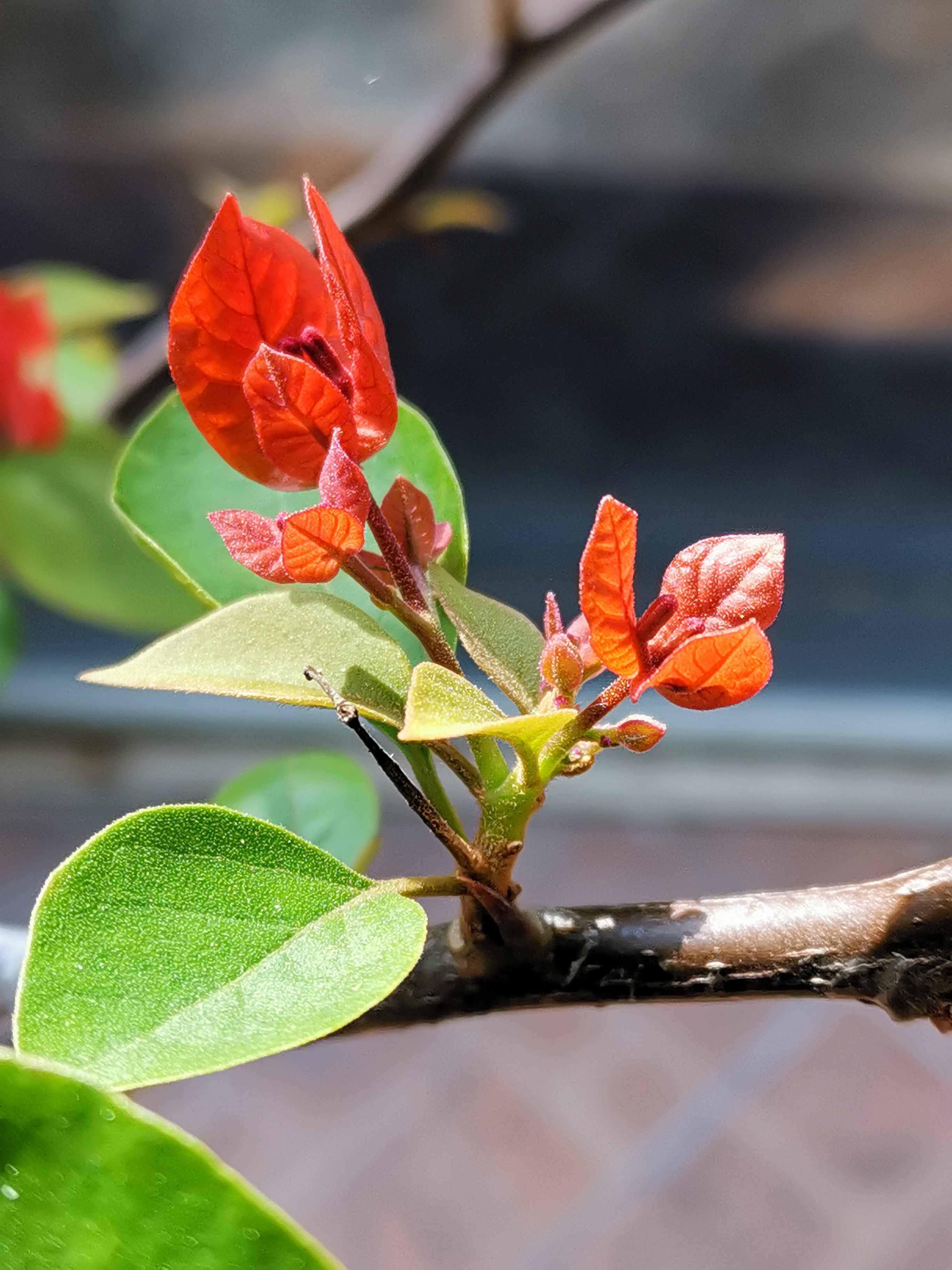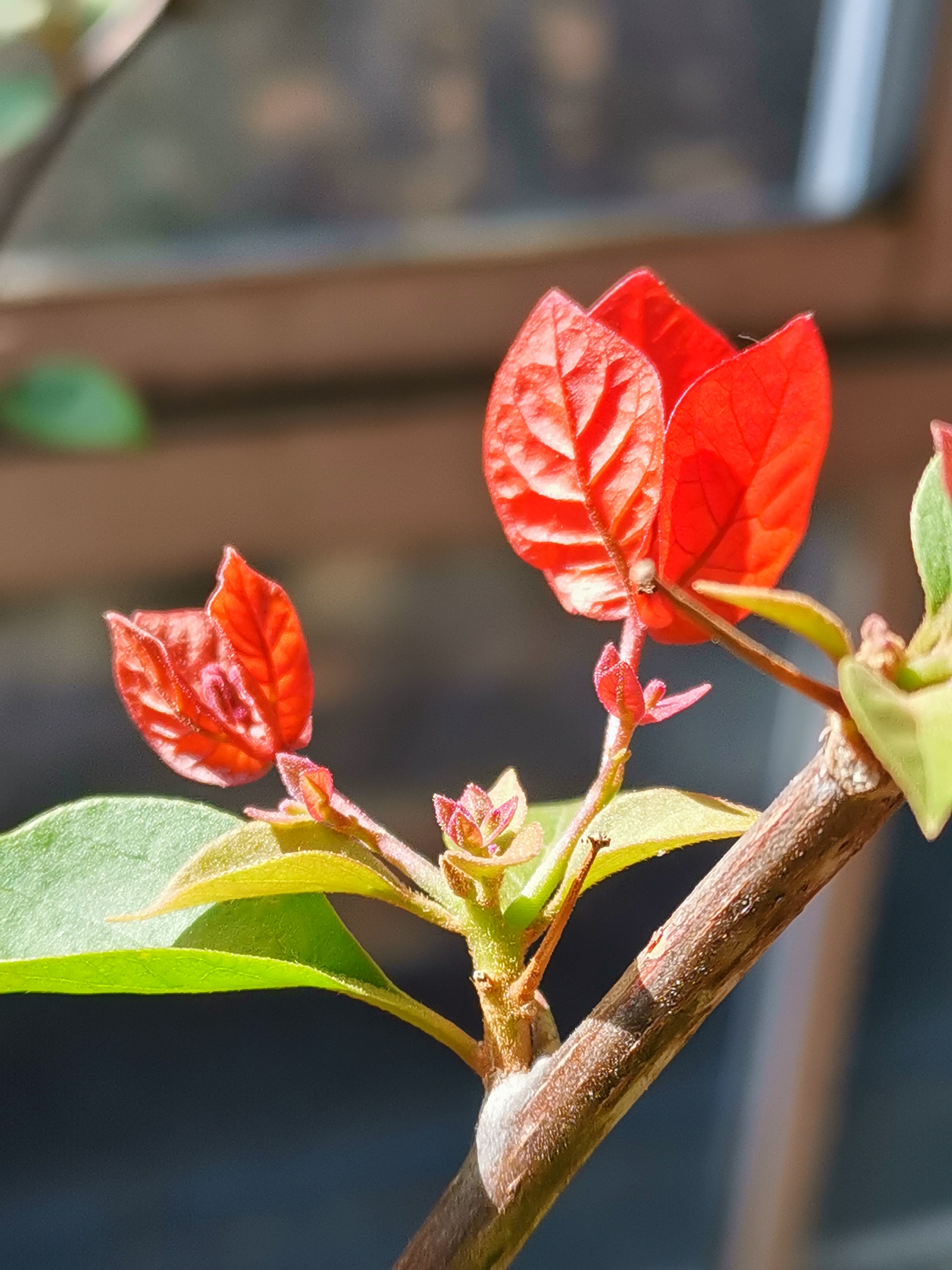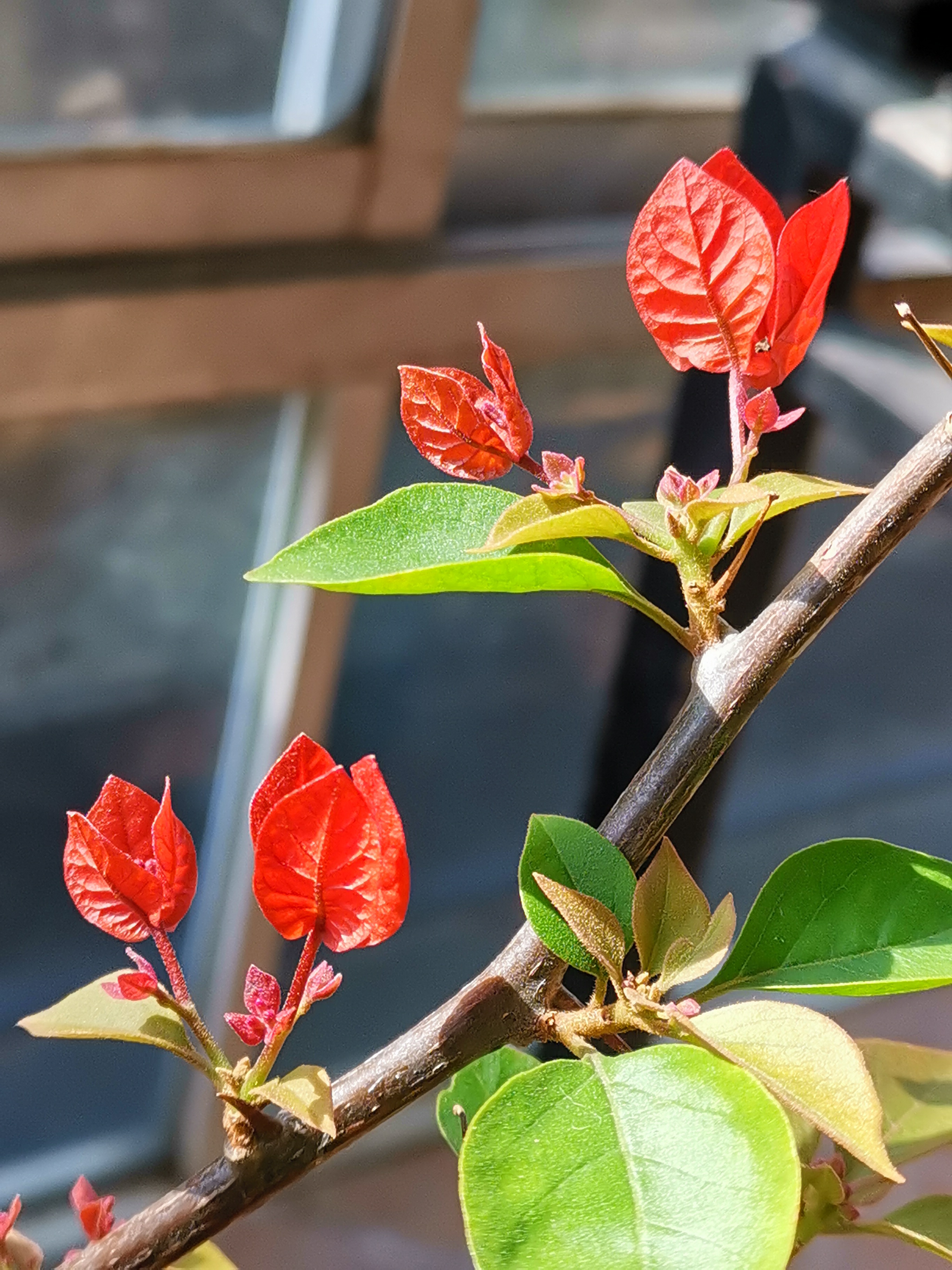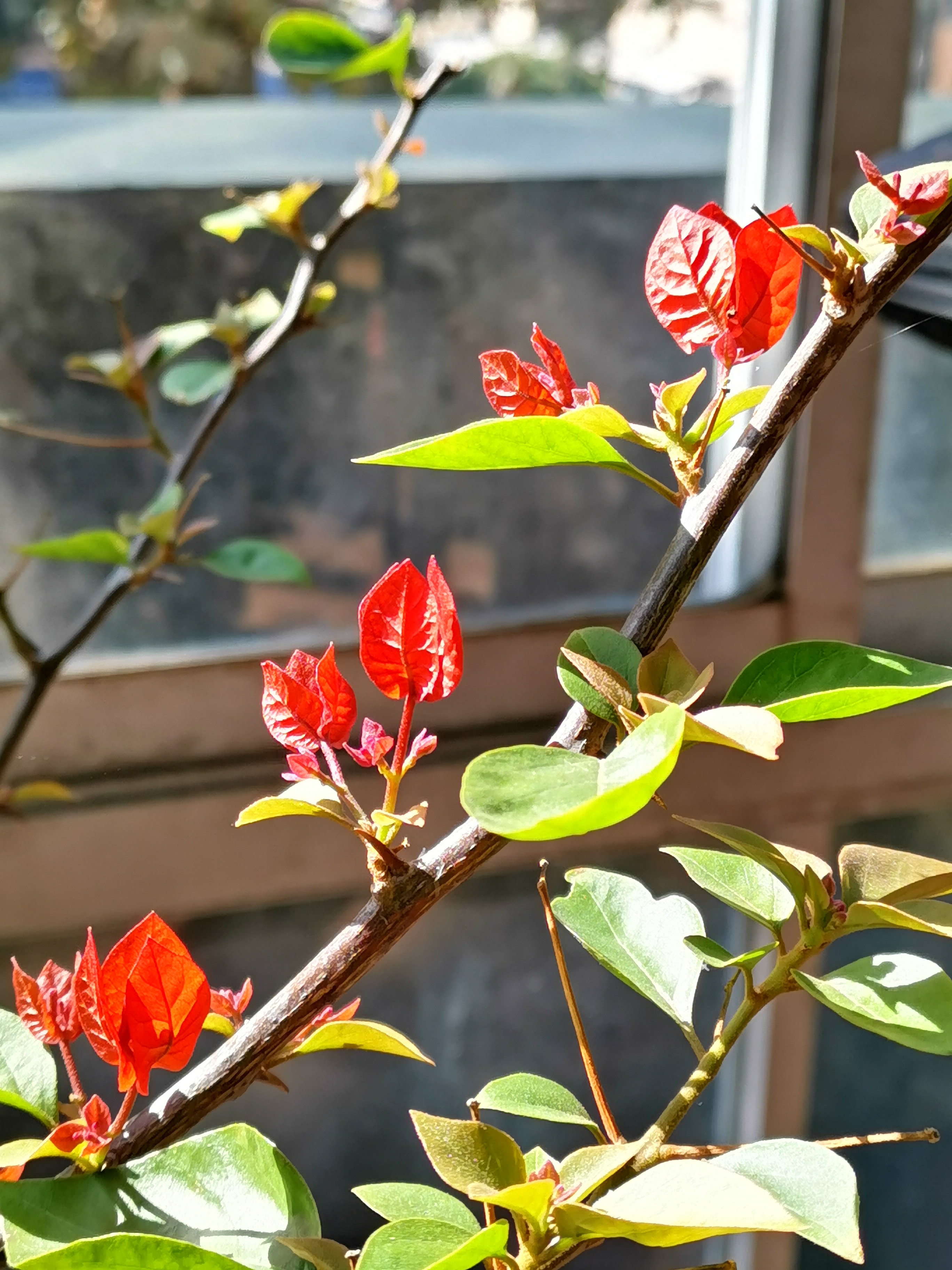 阳光玻璃房成了三角梅过冬安乐窝,阳光透过玻璃窗照在叶片上,红艳艳一片,如跳跃的火焰,多欢快!也许它在默默地感谢主人呢!