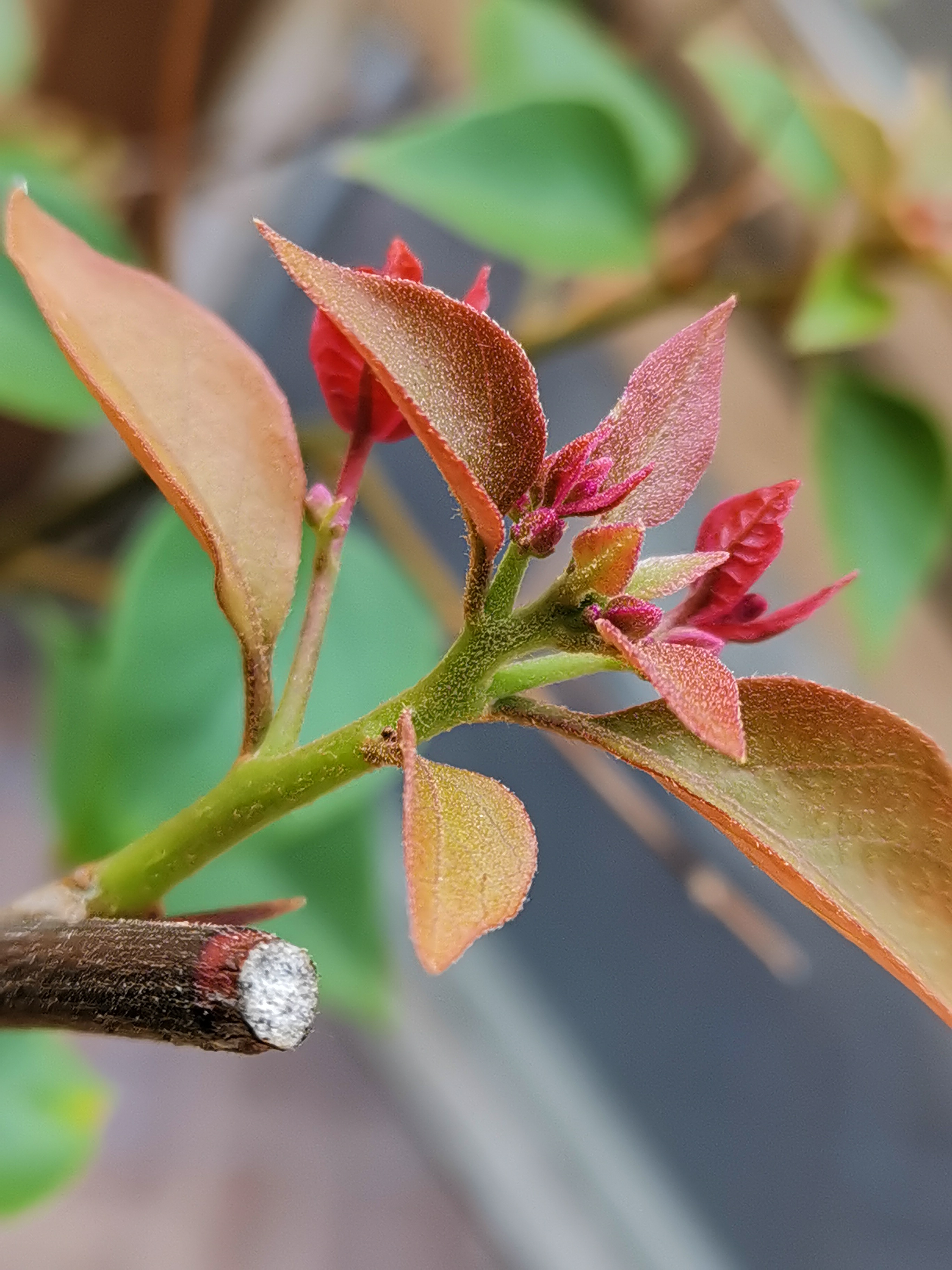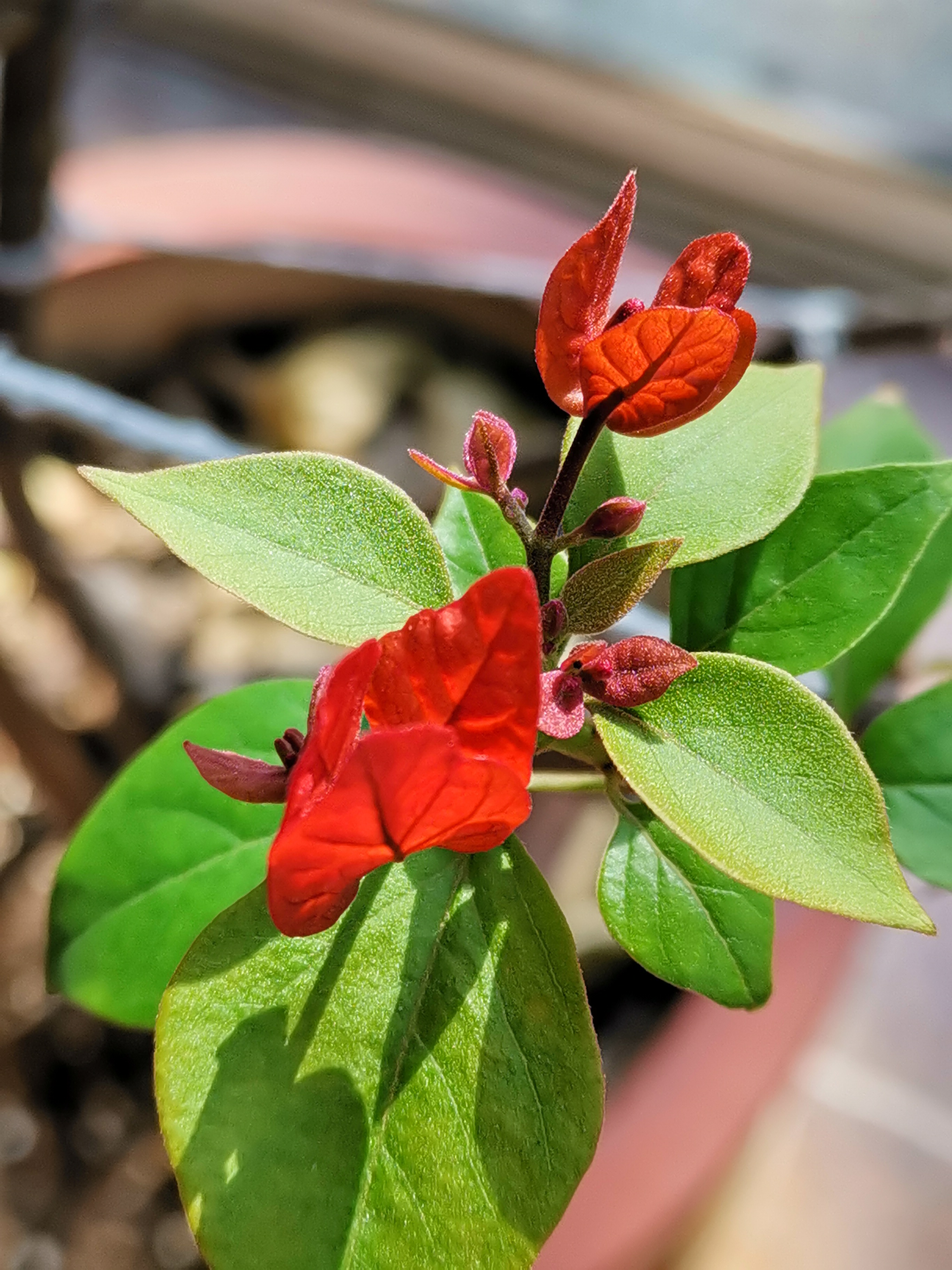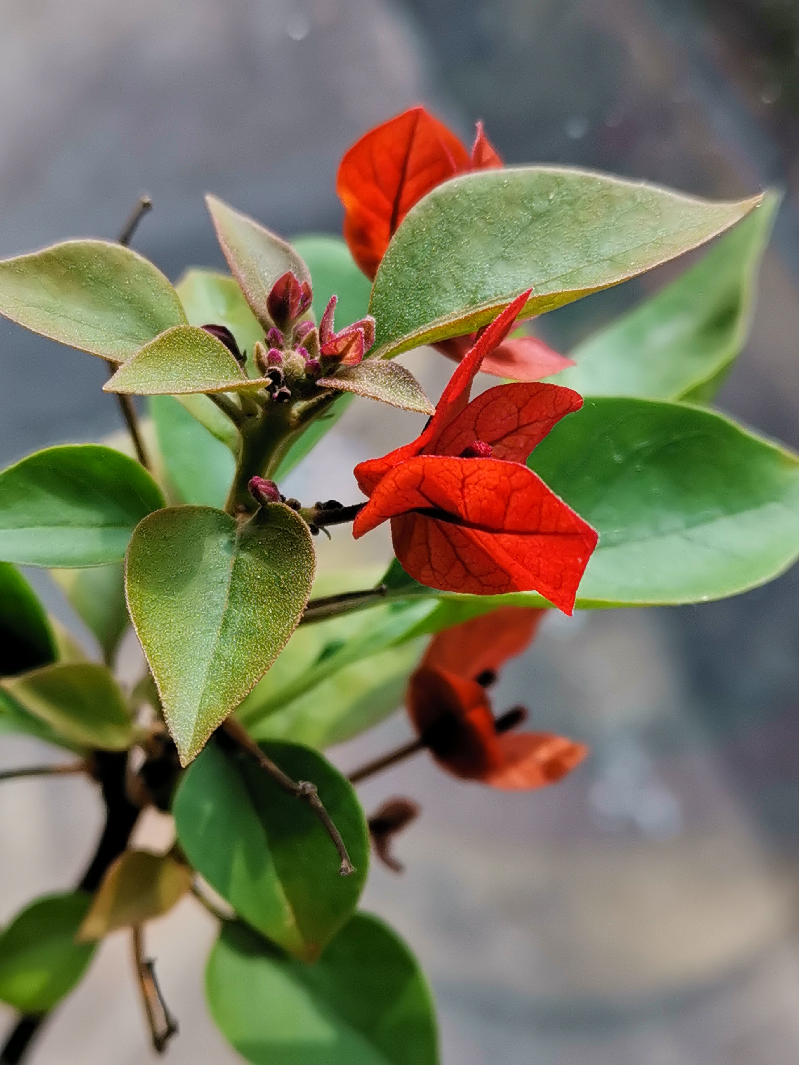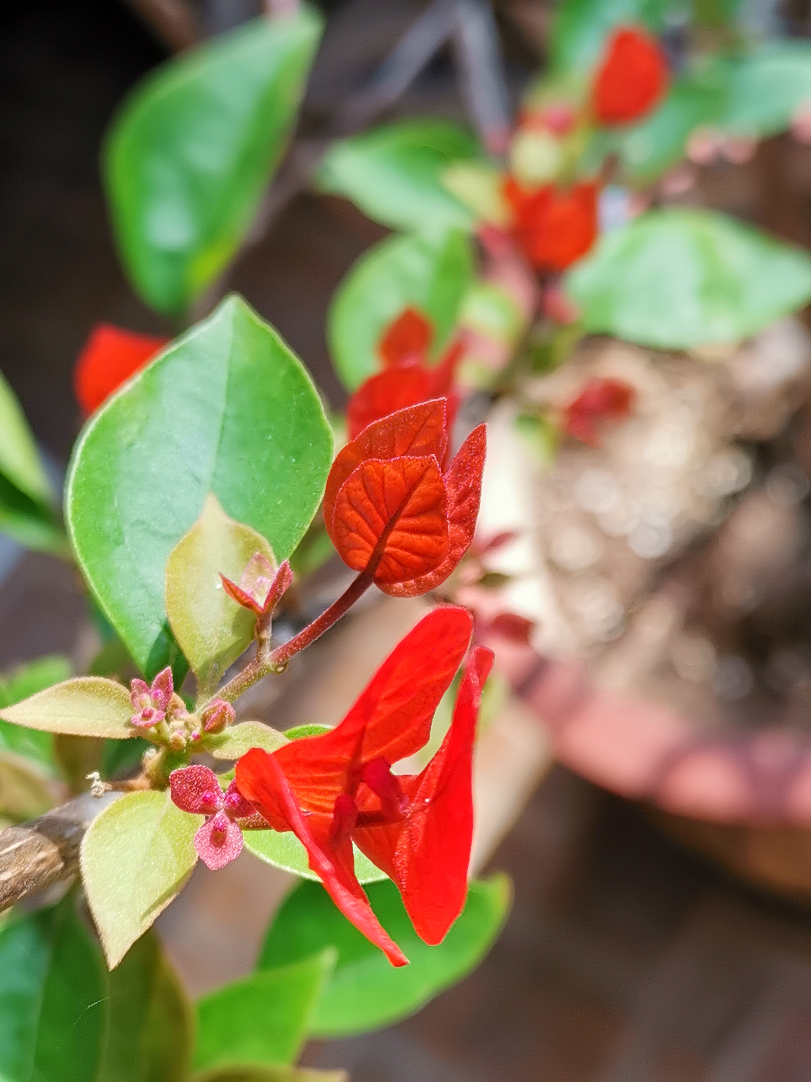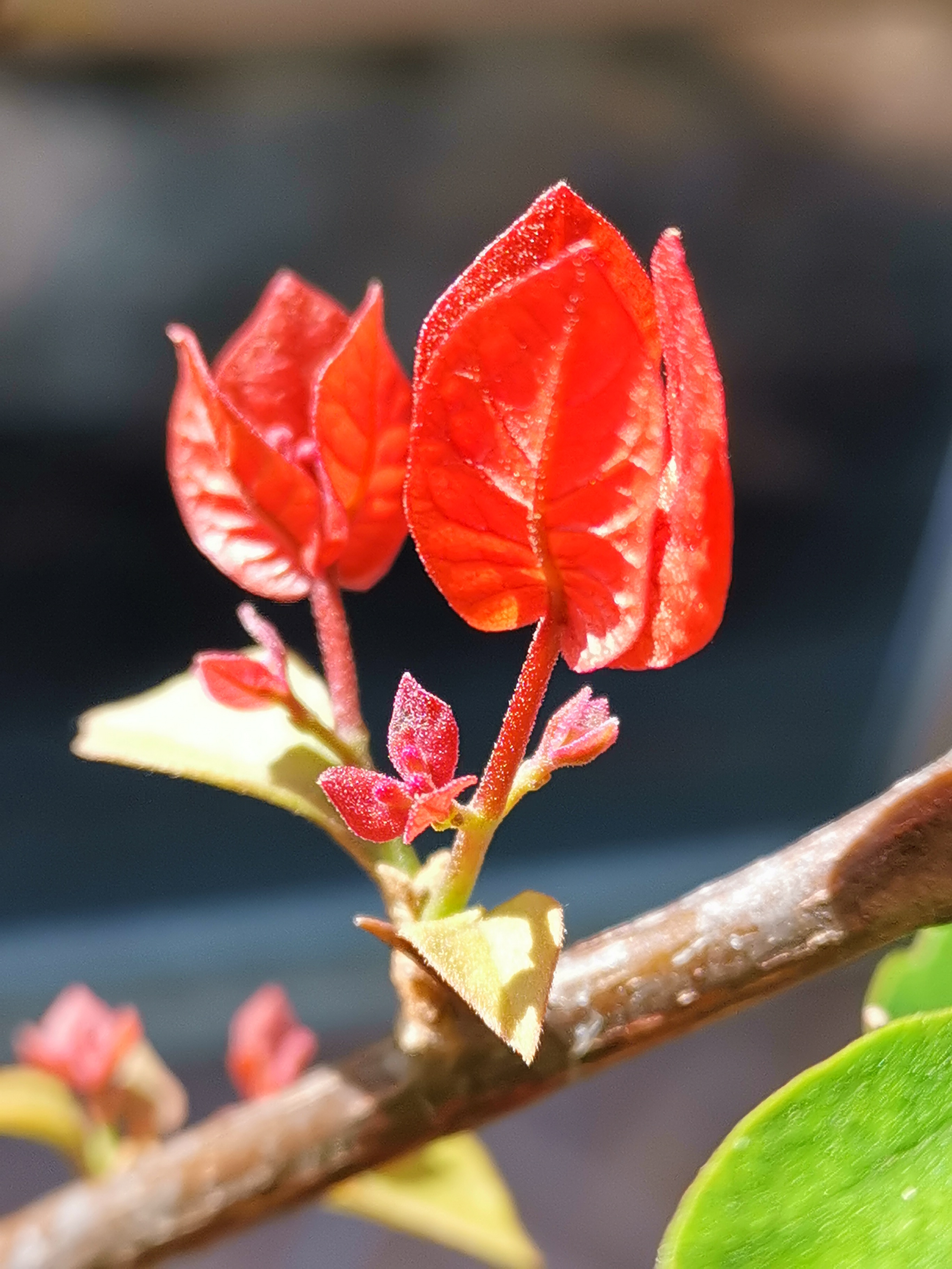 阳光玻璃房成了三角梅过冬安乐窝,阳光透过玻璃窗照在叶片上,红艳艳一片,如跳跃的火焰,多欢快!也许它在默默地感谢主人呢!