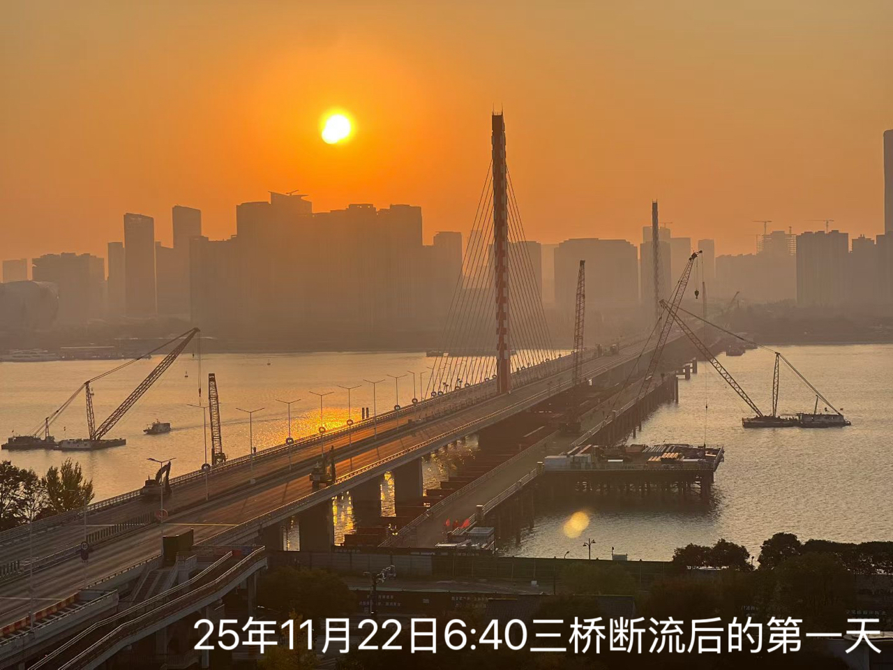 早安!杭州三桥的第一缕光!断流后的第一天,三桥一改往日川流不息的繁忙,转而进入平静等待拆桥施工的状态。记录三桥变迁的美好时刻,期待27年底新的双层八车道的三桥呈现。