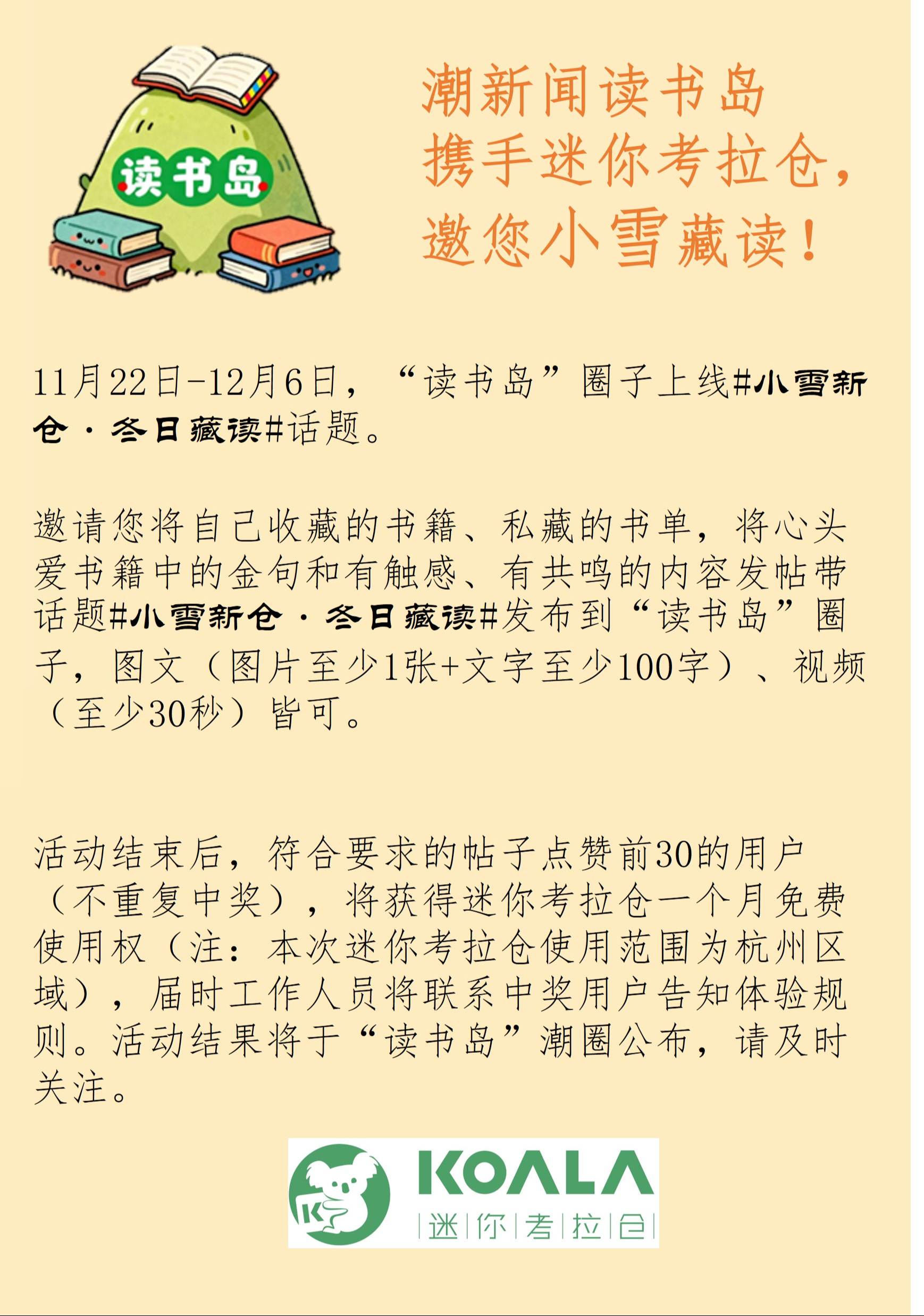 读书岛携手迷你考拉仓,邀您体验体验身边的仓储服务啦! 11月22日-12月6日,邀请您赴一场初冬的温柔之约,将自己收藏的书籍、私藏的书单,将心头爱书籍中的金句和有触感、有共鸣的内容发帖带话题#小雪新仓·冬日藏读#发布到“读书岛”圈子,图文、视频皆可,就有机会获得迷你考拉仓提供的仓储免费使用权。