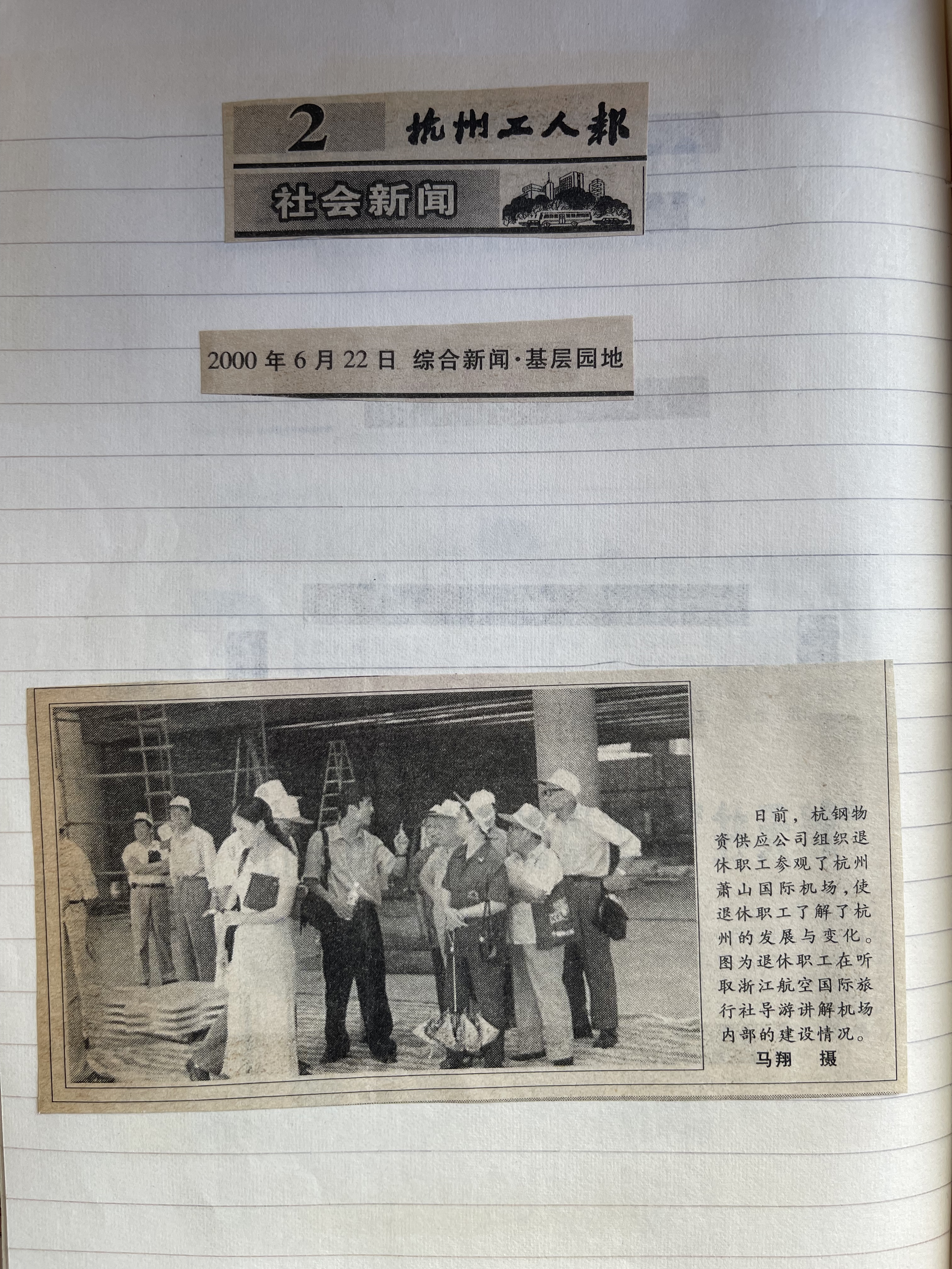 这组照片是我2000年6月2日前拍摄的,到今年已经是25年了,也是杭州萧山机场25年生日的缩影,我是杭州一位广播电视媒体技术工程师,工作之余志愿服务28年,夜喜欢摄影,也是媒体通讯员,当时得知杭州萧山机场即将开通运营,开通前浙江航空国际旅行社推出参观萧山机场一日游活动,于是我去了,也用相机记录了珍贵的瞬间记忆照片。其中一张还刊登在了2000年6月2日出版的《杭州工人报》2版“社会新闻”版面,那天刚好杭钢物资公司组织退休职工参观即将建设完成落成启用的杭州萧山国际机场。