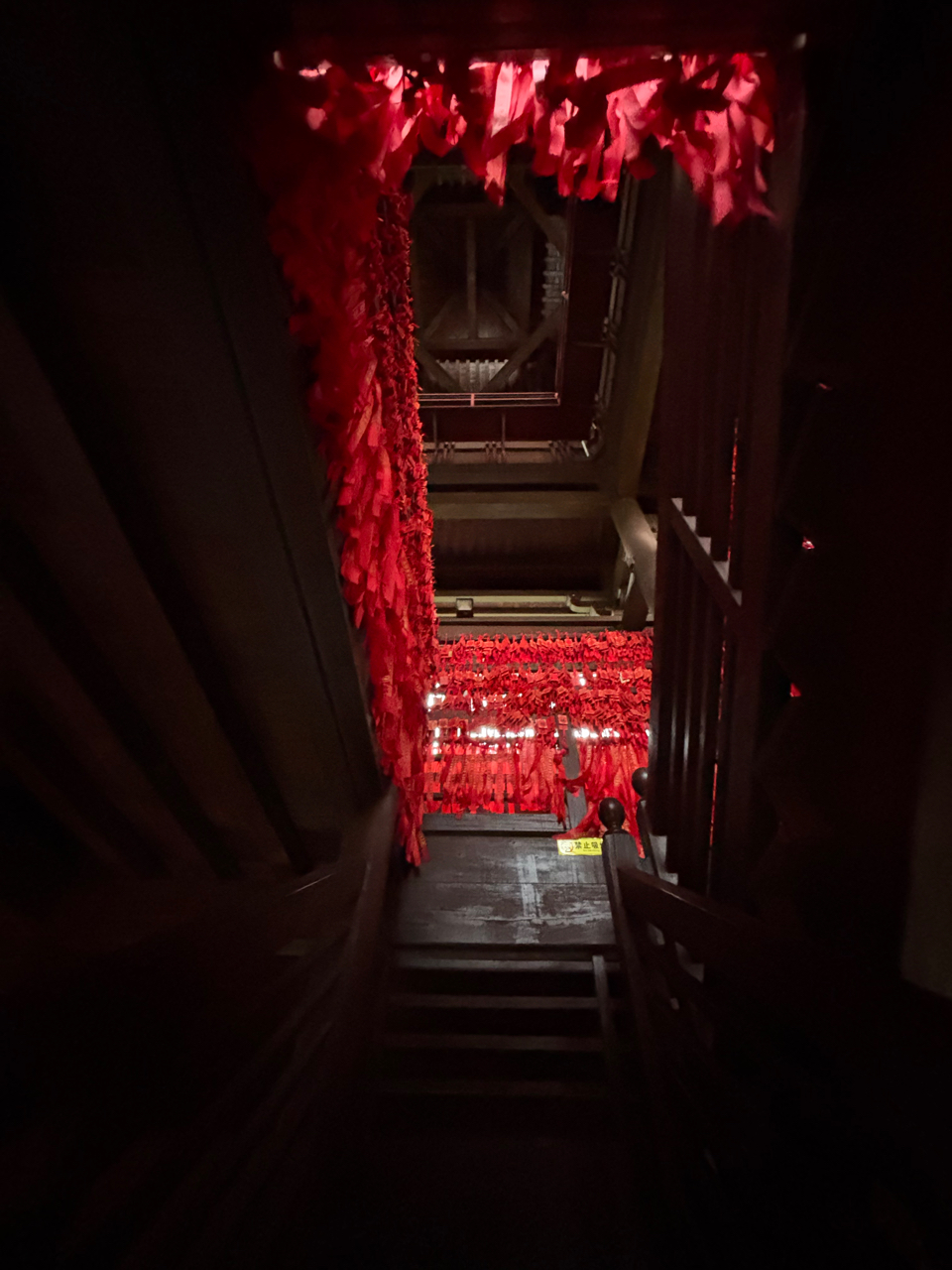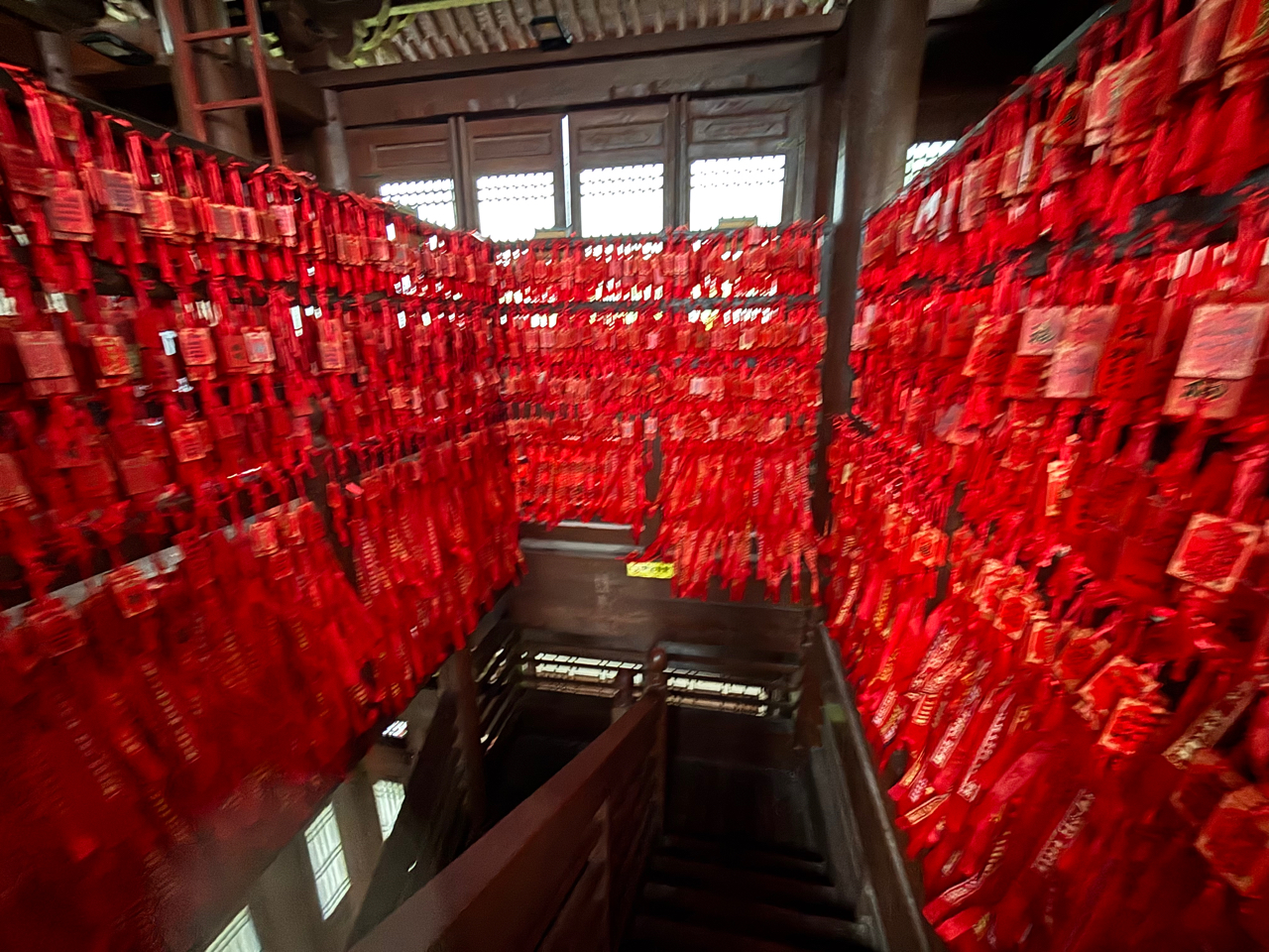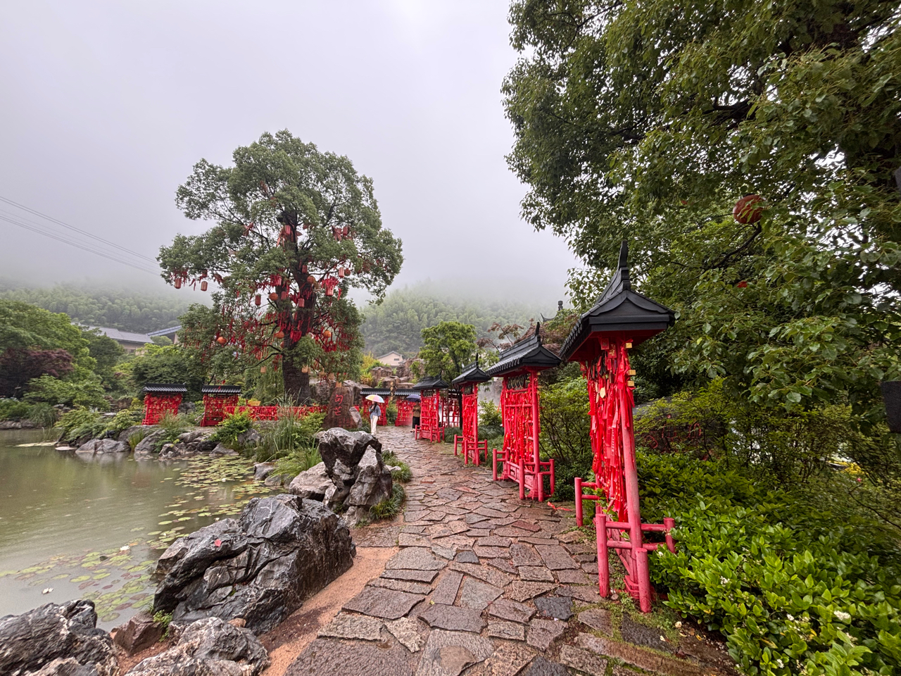 石阶蜿蜒,雨雾氤氲。红绸轻系古亭,一池春水映着飞檐灯笼,岁月静好如初。