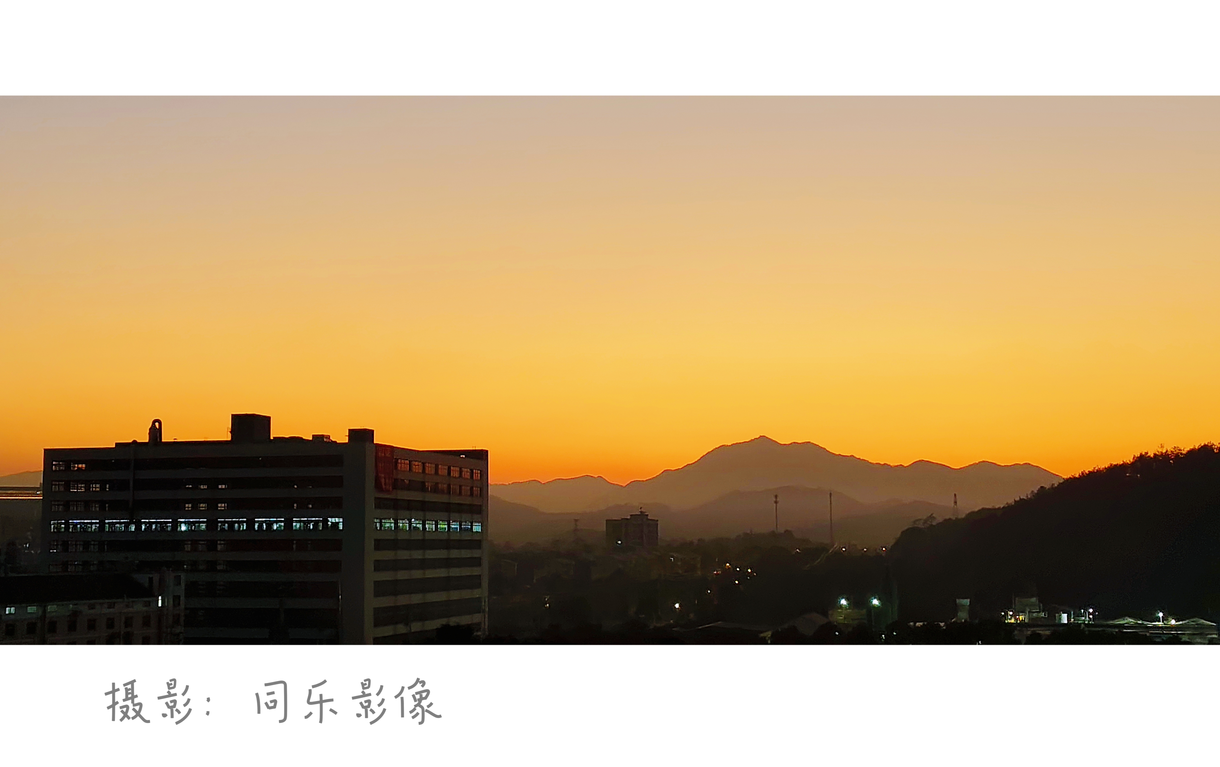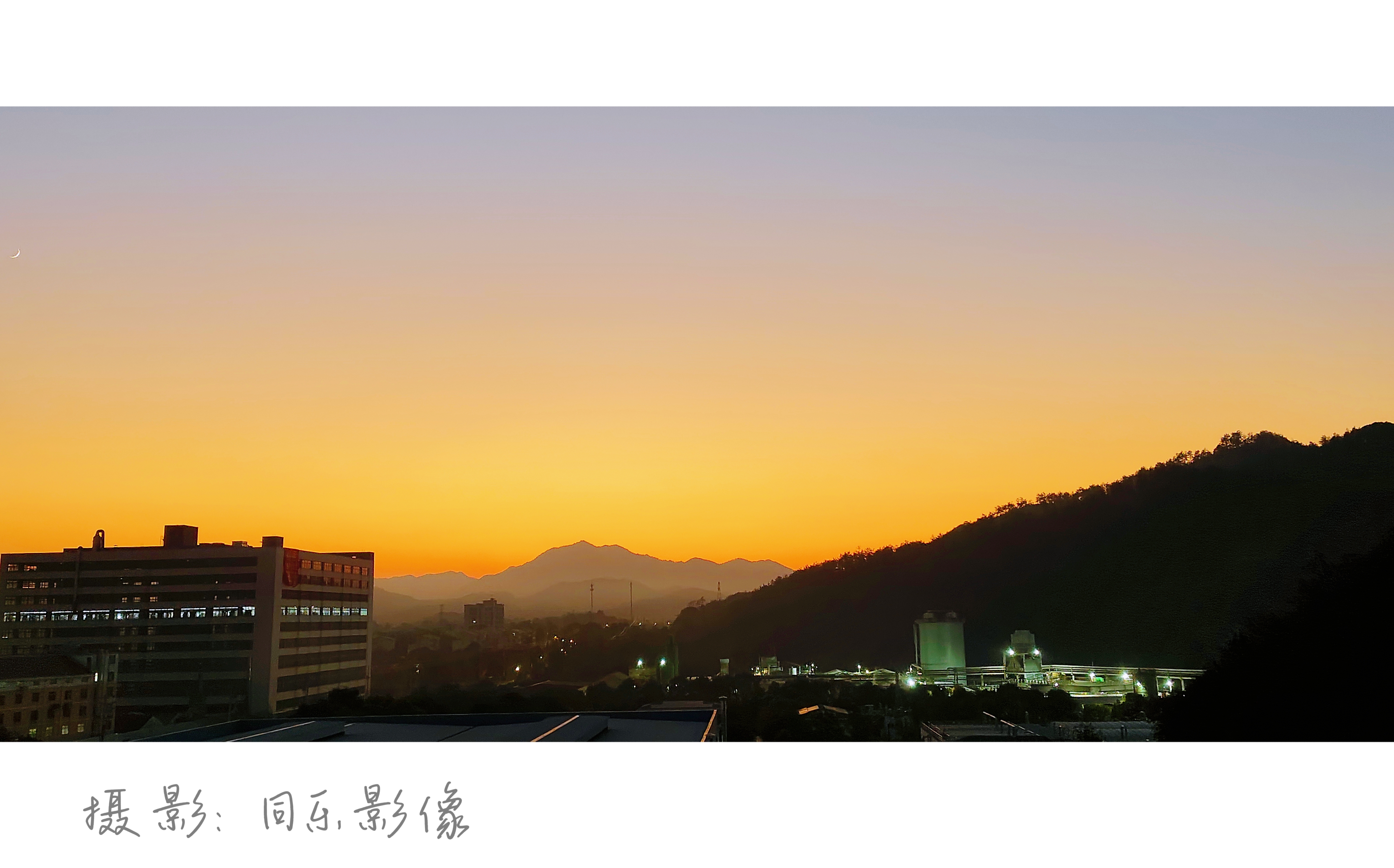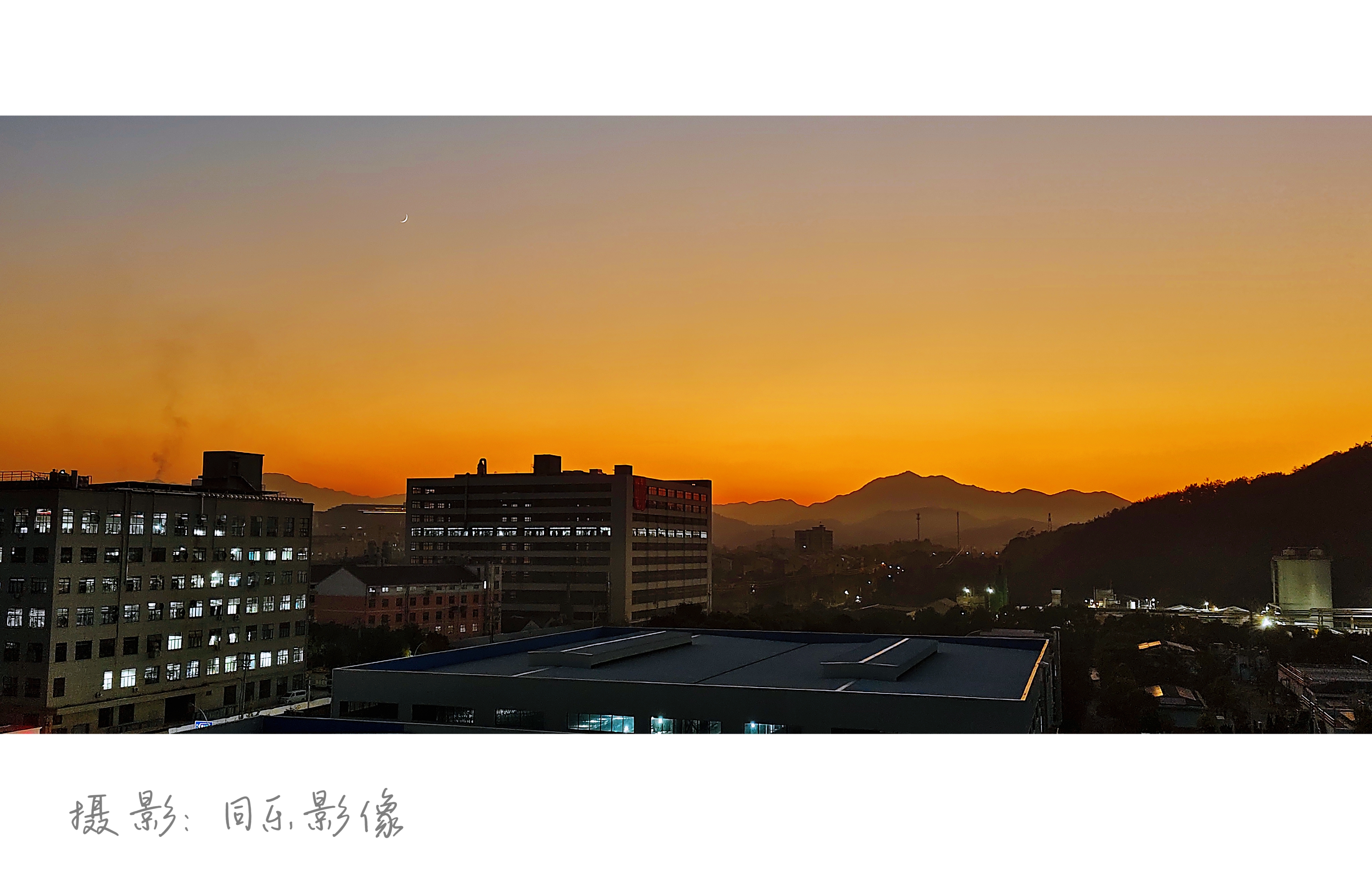 夕阳下的乡村晚霞给城市开了橙色滤镜,山影是天然的画框,新月一勾,灯也凑热闹亮了。同乐影像,今日份打卡~