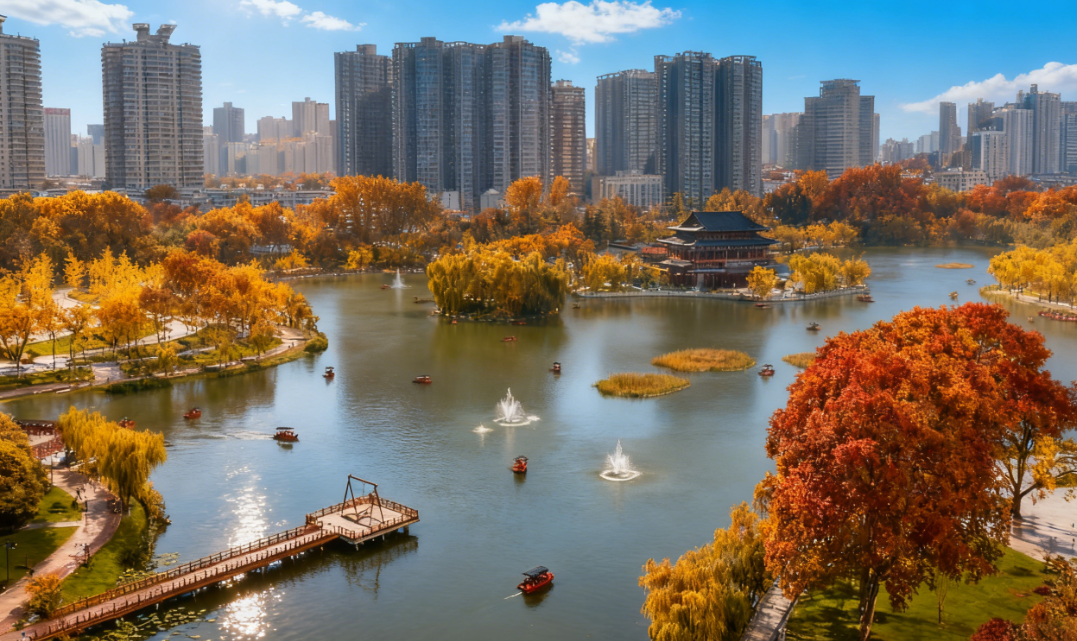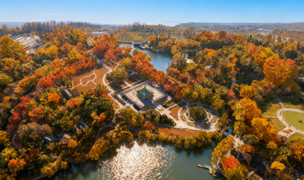 秋日的西安兴庆公园,像被打翻的调色盘。枫叶红得冒泡,银杏黄得灿烂,倒映在静谧的湖面,连现代高楼都温柔了。沿着环湖绿道晃荡,木栈道吱呀,水波轻漾,都市的喧嚣一键静音。