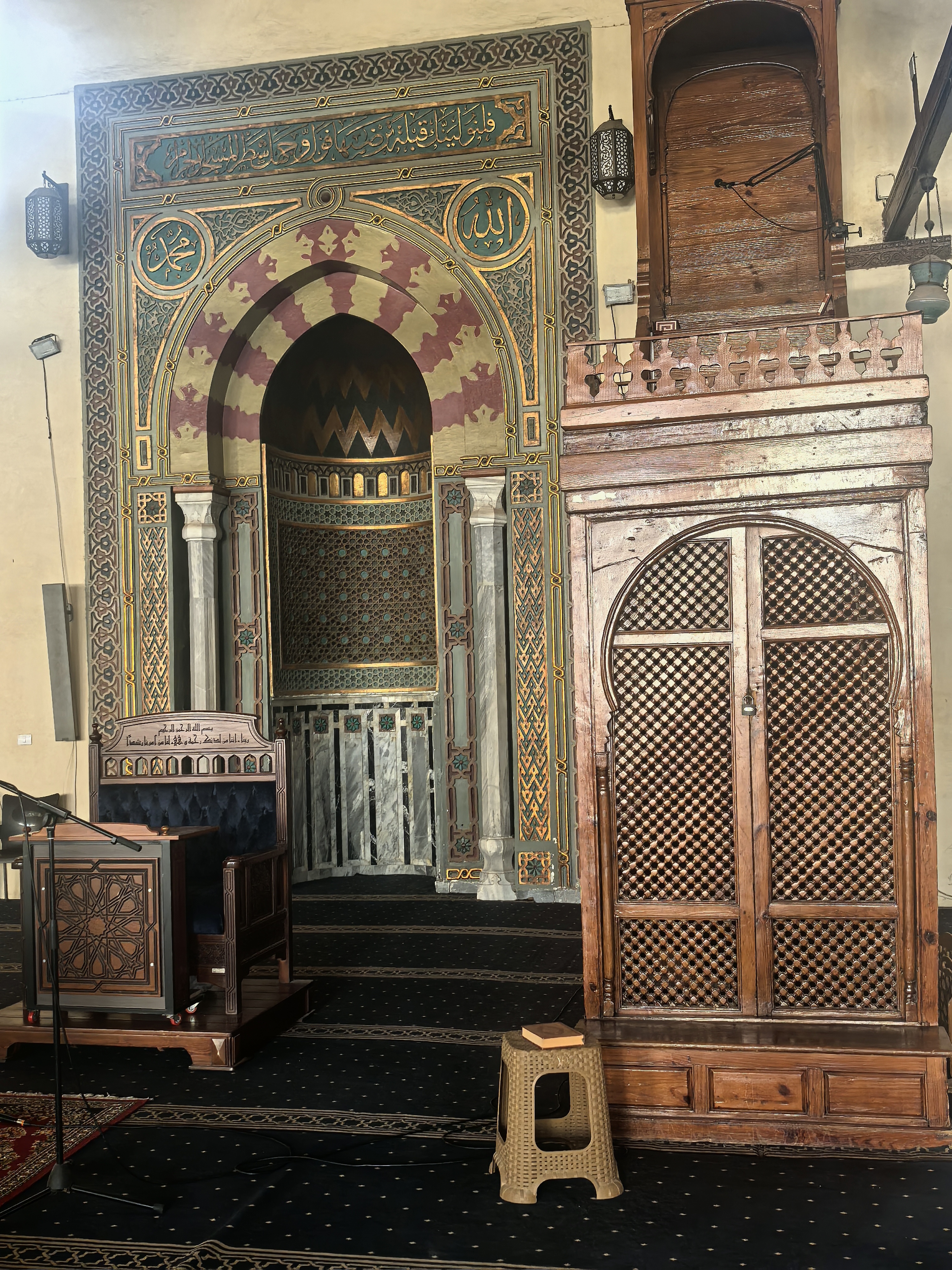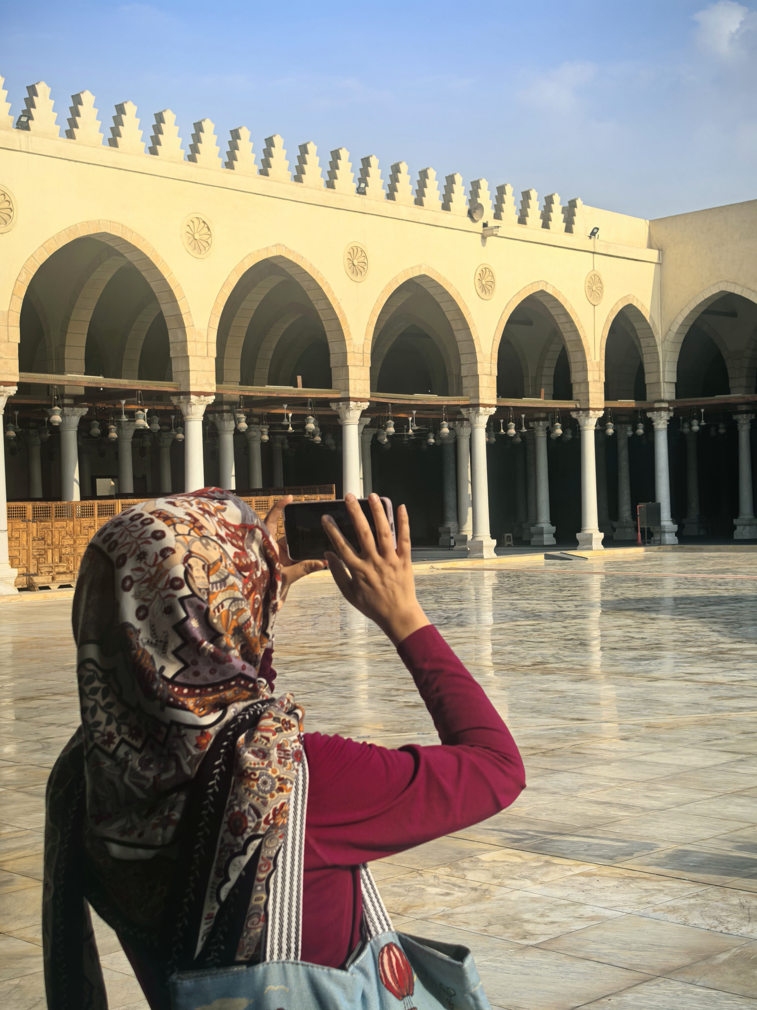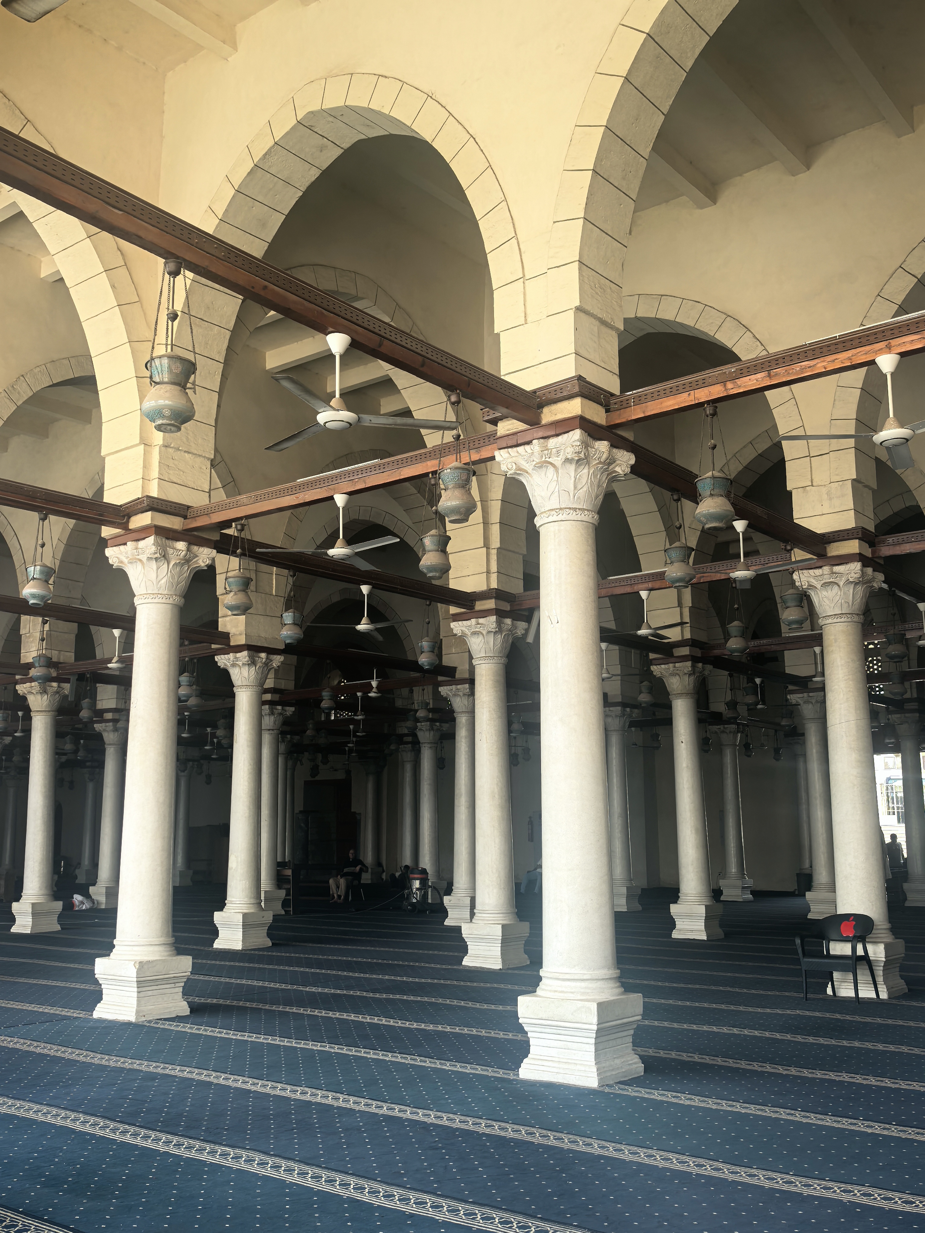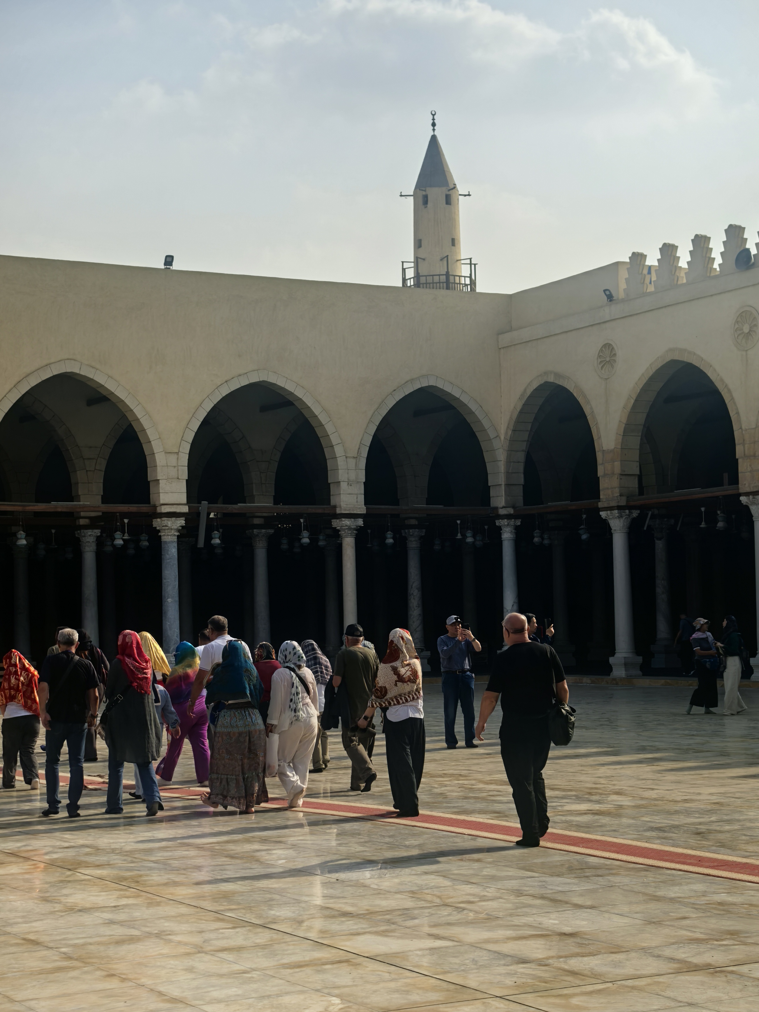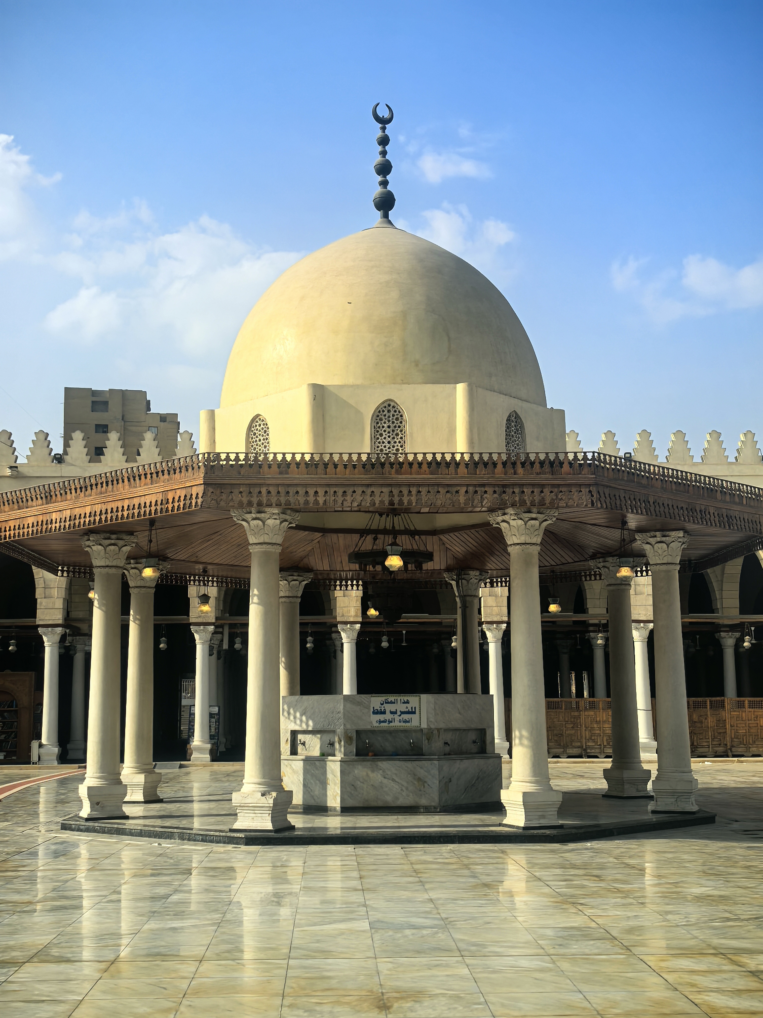 阿鲁姆伊本清真寺就在开罗古城闹市区,厚重的木门在身后轻合,隔绝了市井的喧嚣。 偌大的庭院中,斑驳的光影在廊柱间跳跃,近200根石柱如沉默的史官,罗马式的粗犷与伊斯兰的纤细在此交织,诉说着千年的融合。 法蒂玛王朝的大理石柱上,《古兰经》经文如金色溪流蜿蜒,触摸时仿佛能感受到阿拉伯将领阿慕尔·伊本·阿绥初建时的虔诚。 公元642年,棕榈叶与椰枣树干撑起信仰的穹顶,奥斯曼风格的宣礼塔刺破苍穹,将祷告声送上云端。这里曾是爱资哈尔大学的摇篮,司法与教育的灯塔。 而今,游人驻足,看白鸽掠过穹顶,恍若历史低语:文明从不是孤岛,而是时光长河中不断回响的和声。