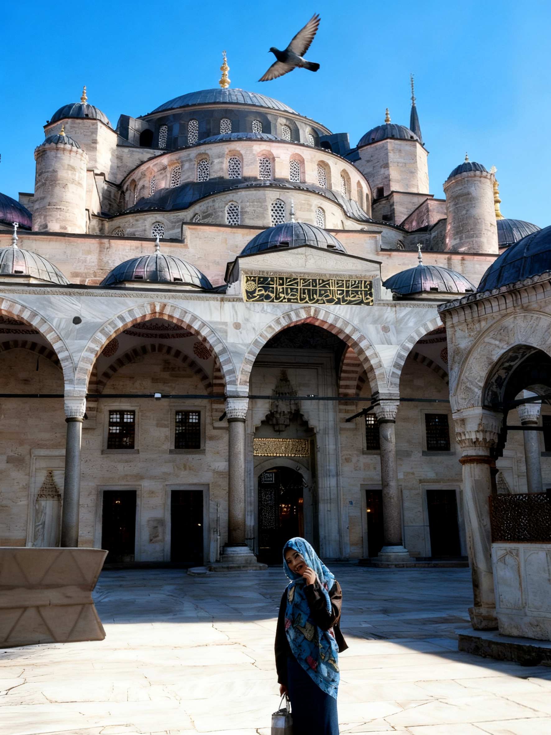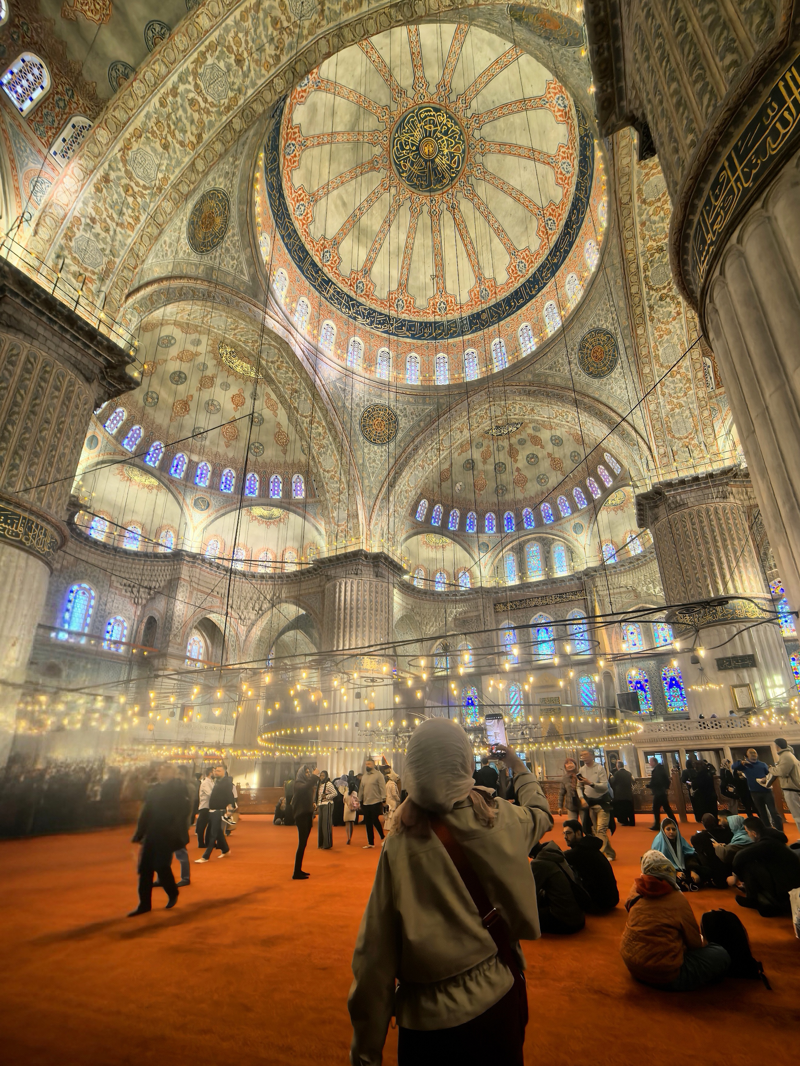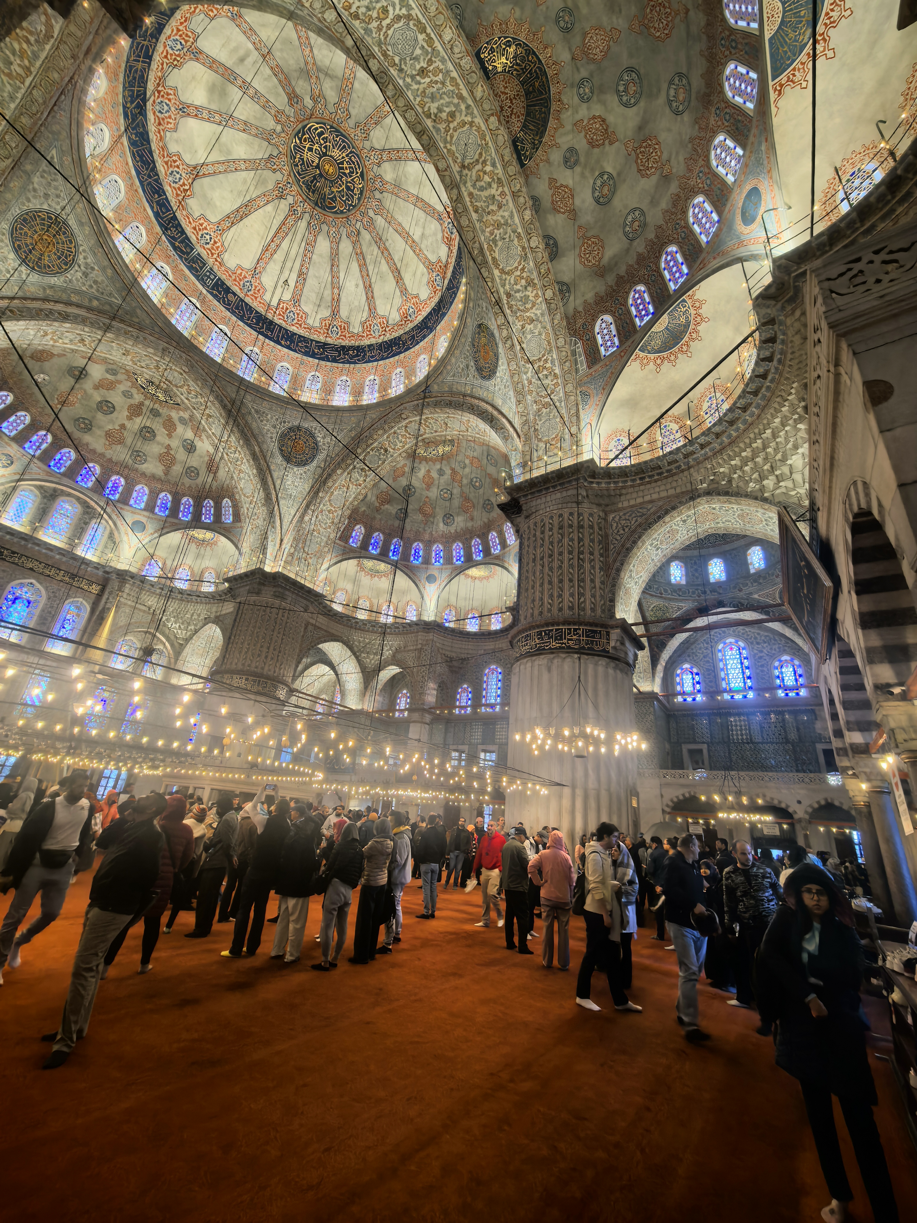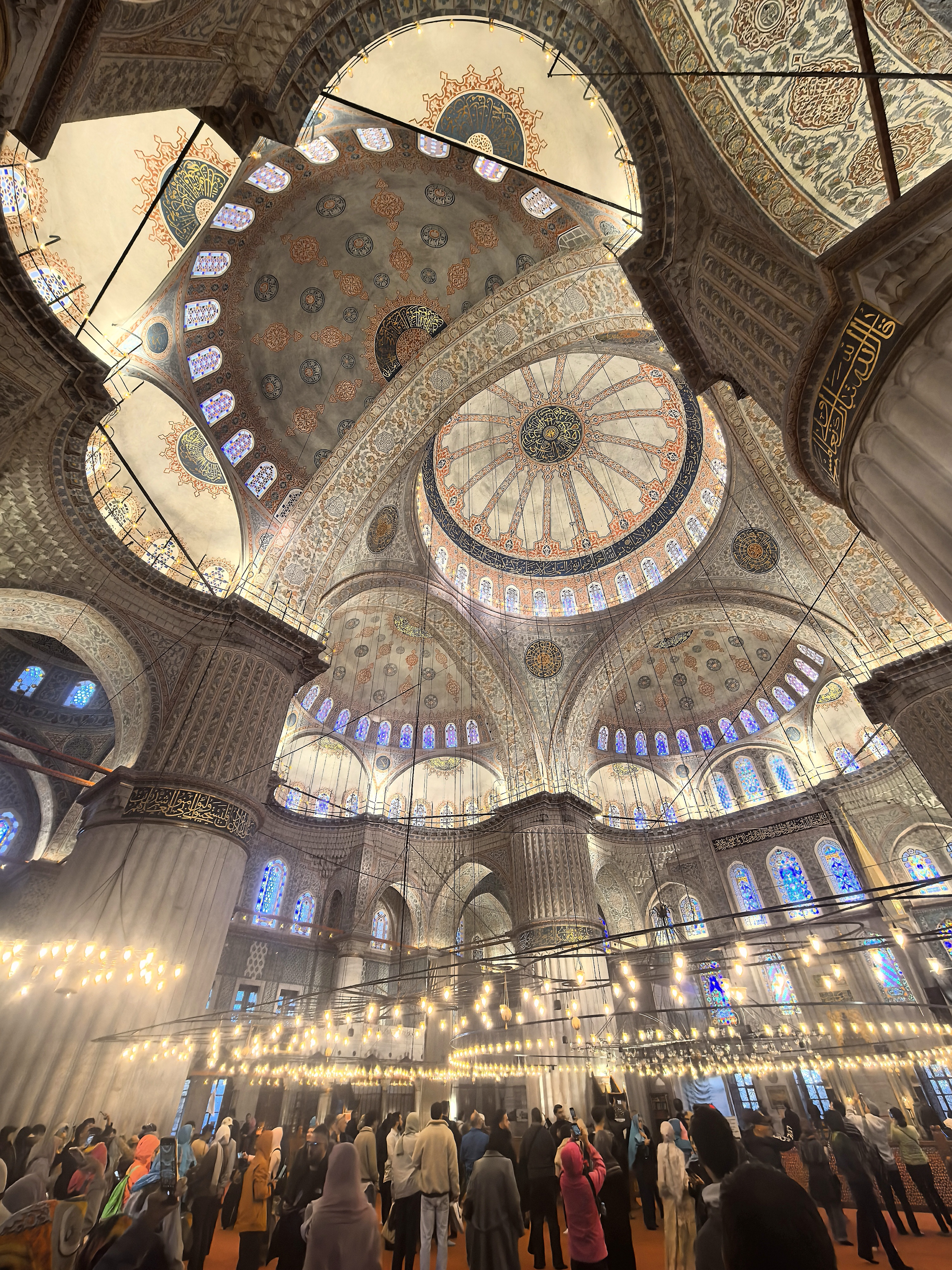 苏丹艾哈迈德清真寺,出称为蓝色清真寺,是伊斯坦布尔的独特地标。它是一场视觉与信仰的盛宴。踏入其中,260个小窗透进柔和天光,照亮铺满伊兹尼克蓝瓷砖的穹顶与墙面,几何纹样与花卉图案在光影中流动,宛如深海幻境。中央穹顶高43米,由四根巨柱支撑,无数小穹顶如涟漪般层层延展,营造出升腾的空间韵律。大殿内,阿拉伯书法与彩色玻璃交织,祈祷毯上的信徒与驻足的游客,在静谧中共享这份神圣与壮丽。六座宣礼塔高耸入云,与圣索菲亚大教堂隔街相望,共同谱写着伊斯坦布尔的千年传奇。