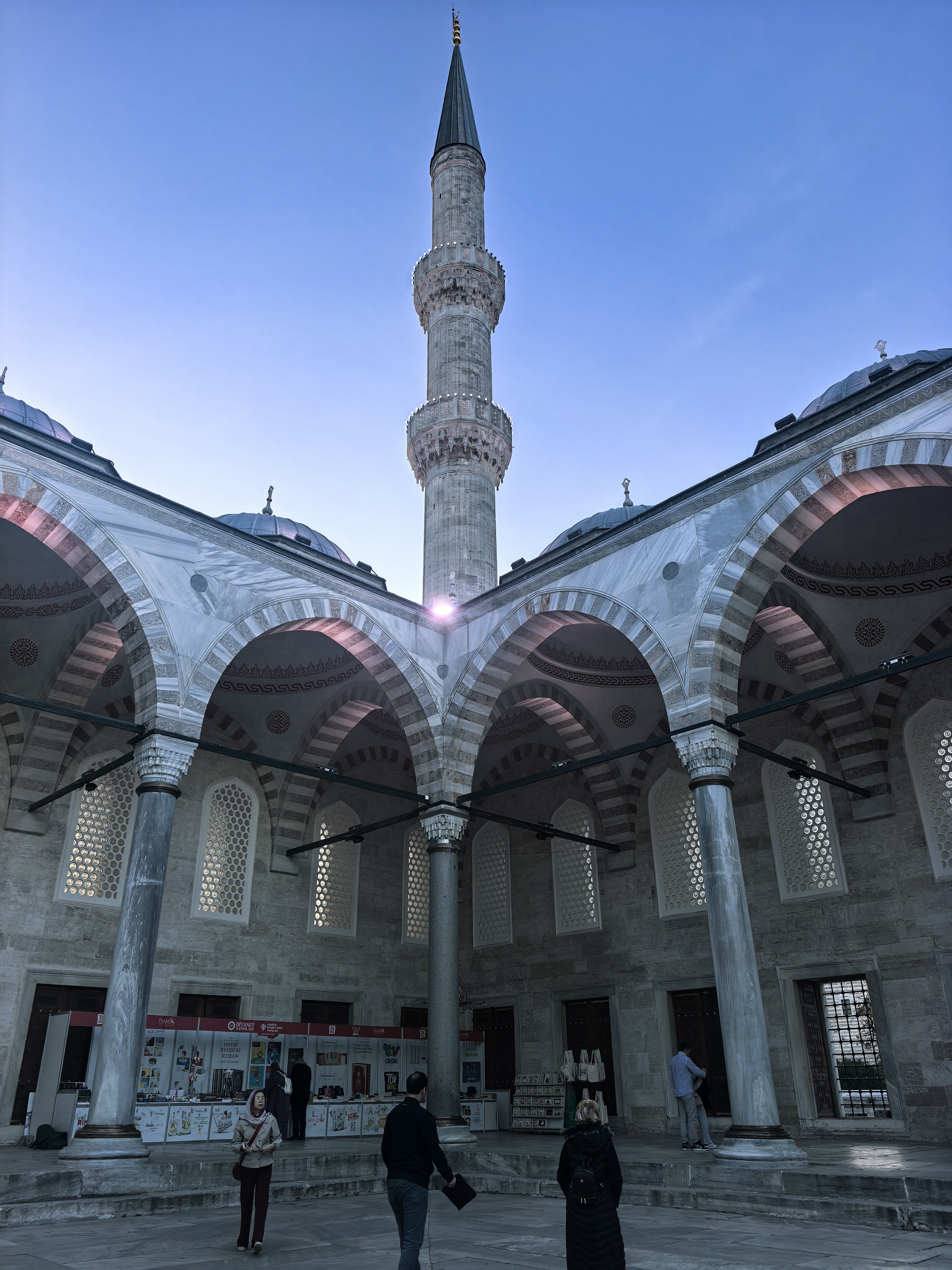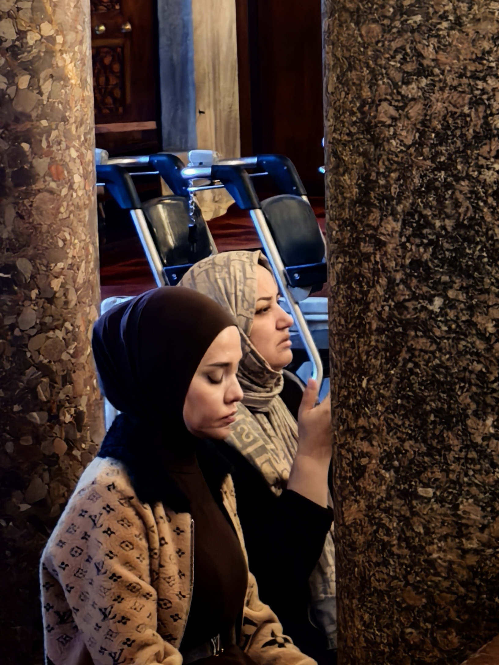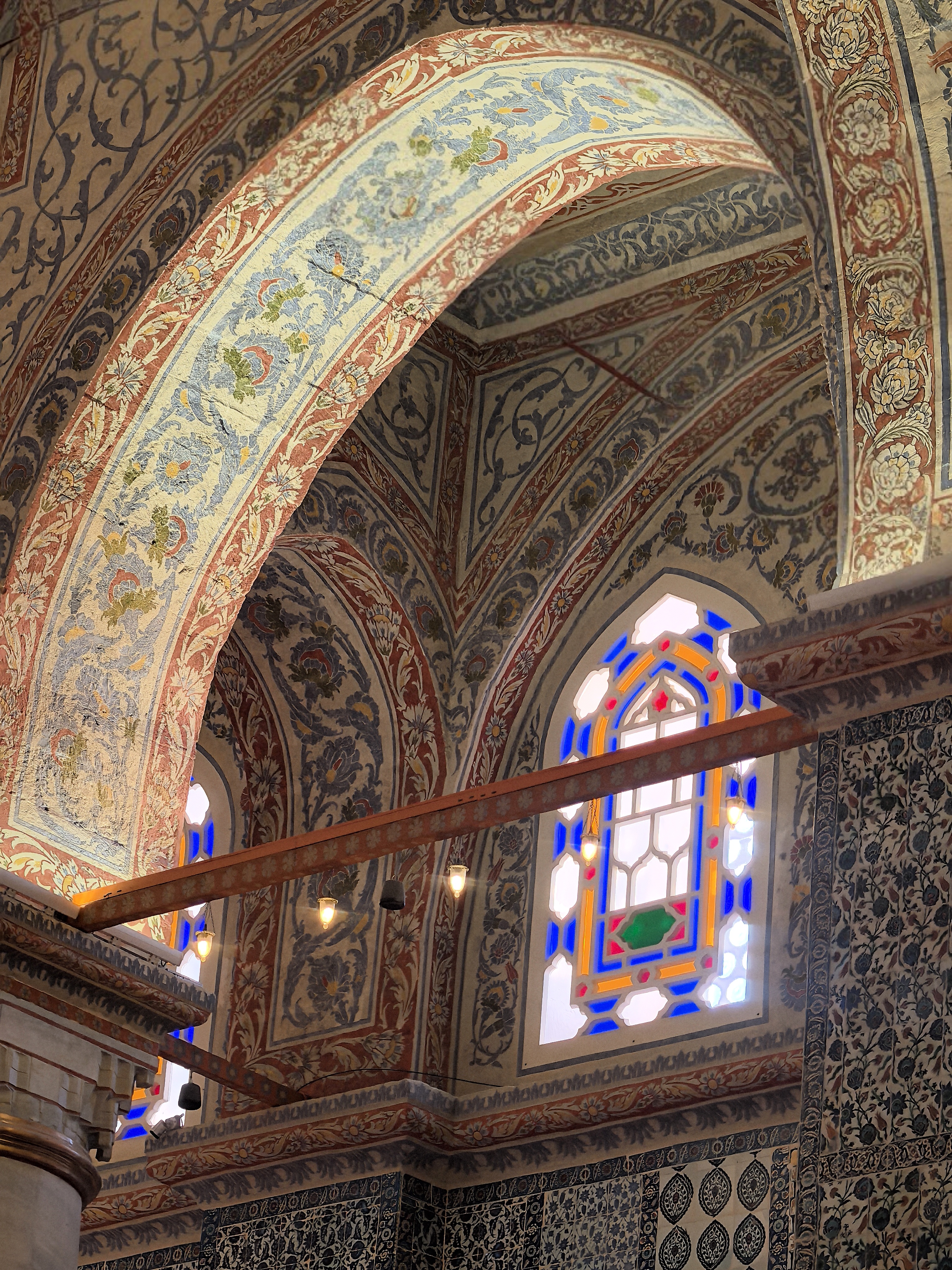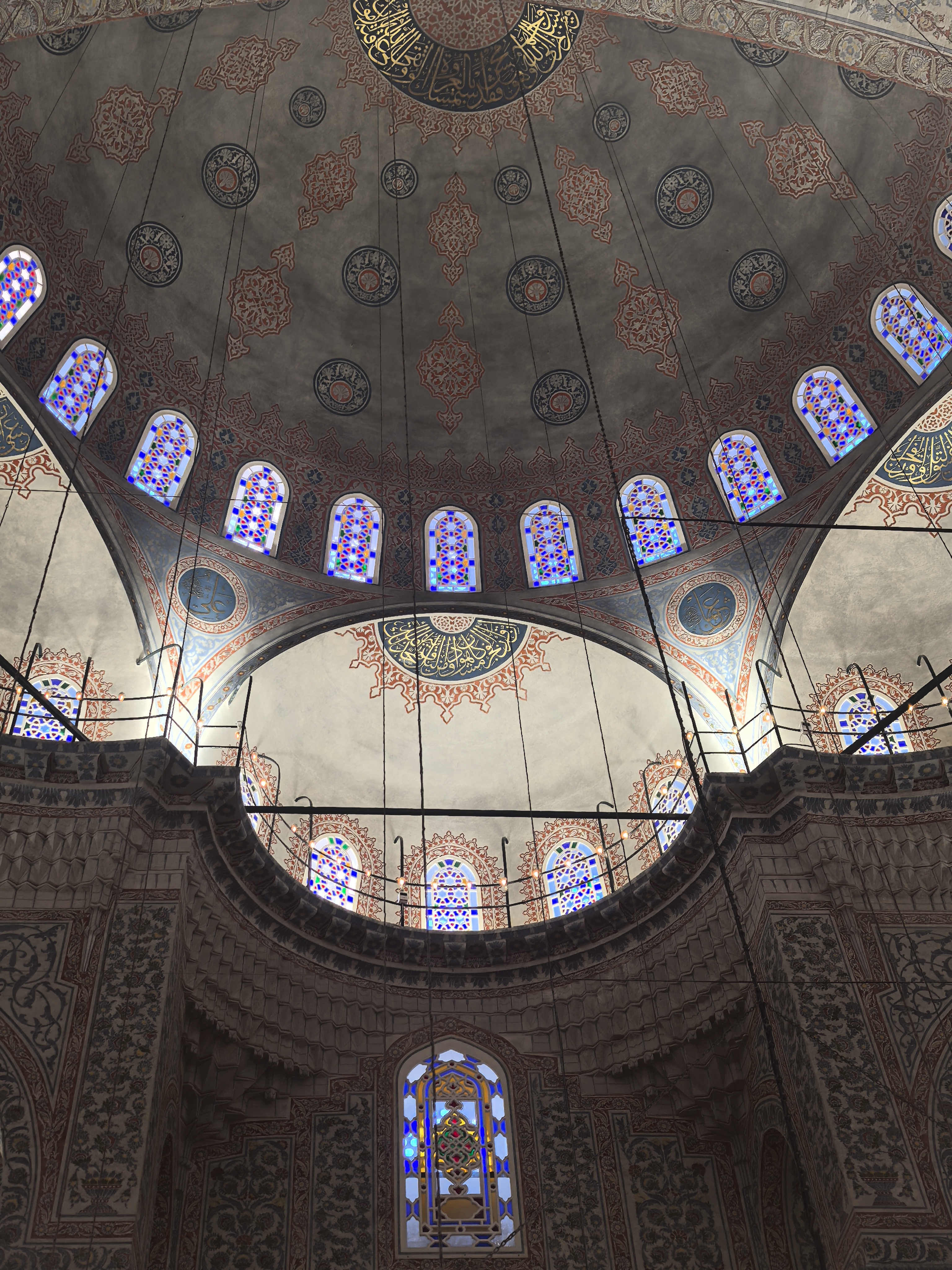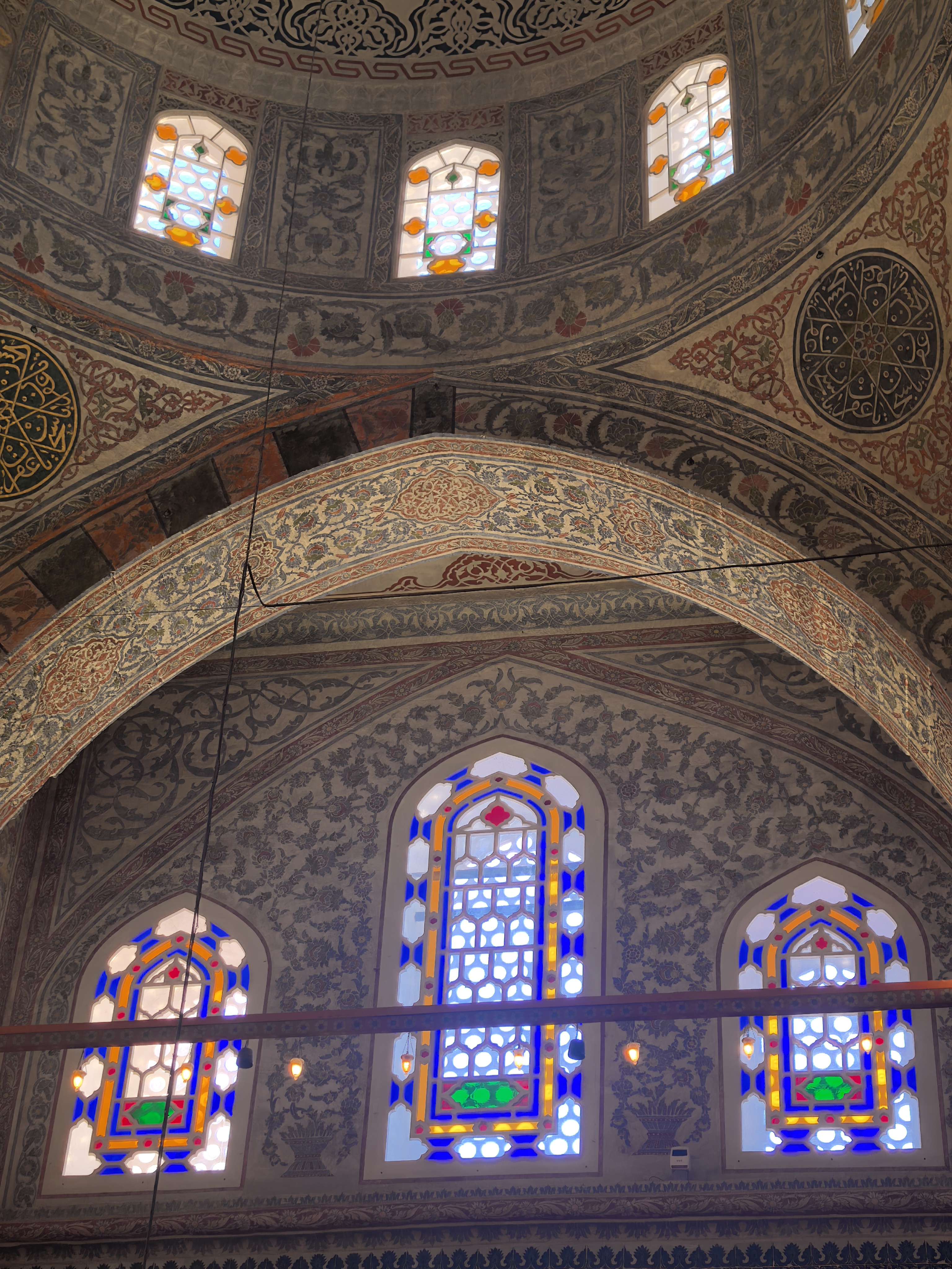 苏丹艾哈迈德清真寺,出称为蓝色清真寺,是伊斯坦布尔的独特地标。它是一场视觉与信仰的盛宴。踏入其中,260个小窗透进柔和天光,照亮铺满伊兹尼克蓝瓷砖的穹顶与墙面,几何纹样与花卉图案在光影中流动,宛如深海幻境。中央穹顶高43米,由四根巨柱支撑,无数小穹顶如涟漪般层层延展,营造出升腾的空间韵律。大殿内,阿拉伯书法与彩色玻璃交织,祈祷毯上的信徒与驻足的游客,在静谧中共享这份神圣与壮丽。六座宣礼塔高耸入云,与圣索菲亚大教堂隔街相望,共同谱写着伊斯坦布尔的千年传奇。