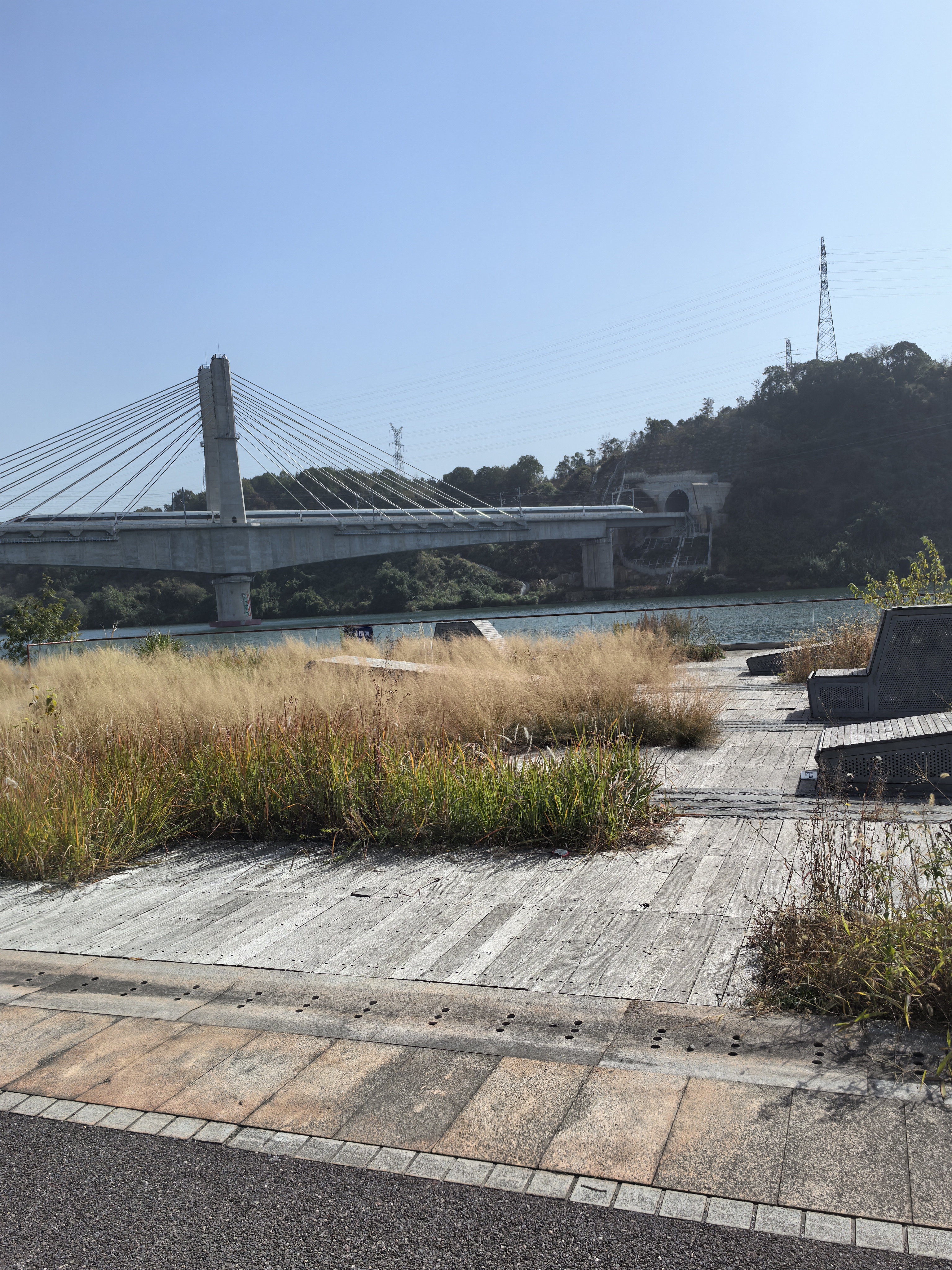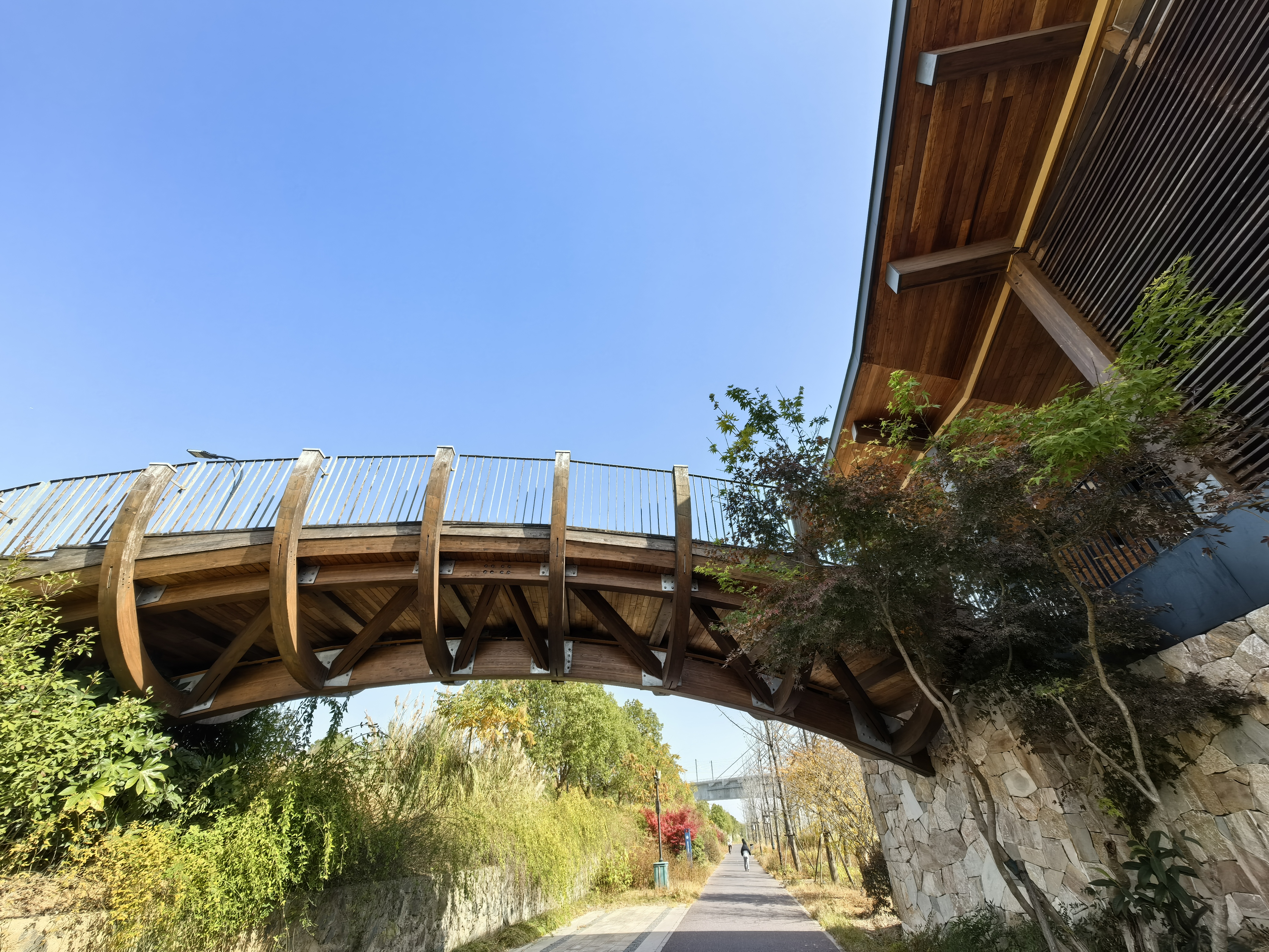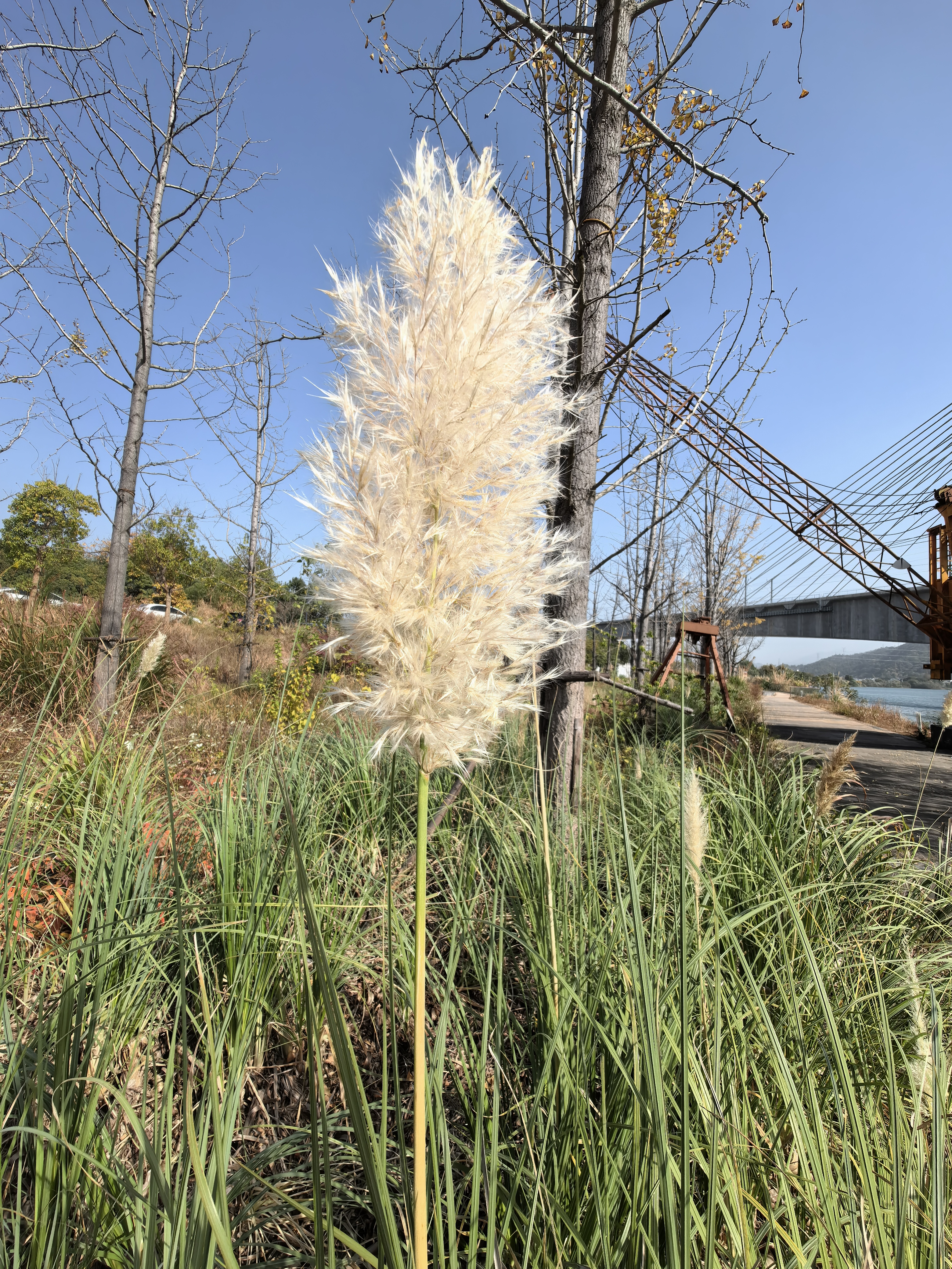 秋日晴光里,桥影斜织,粉黛与红叶共舞。木栈道蜿蜒,芦苇轻摇,都市边缘的自然诗行,在水岸间静静铺展。