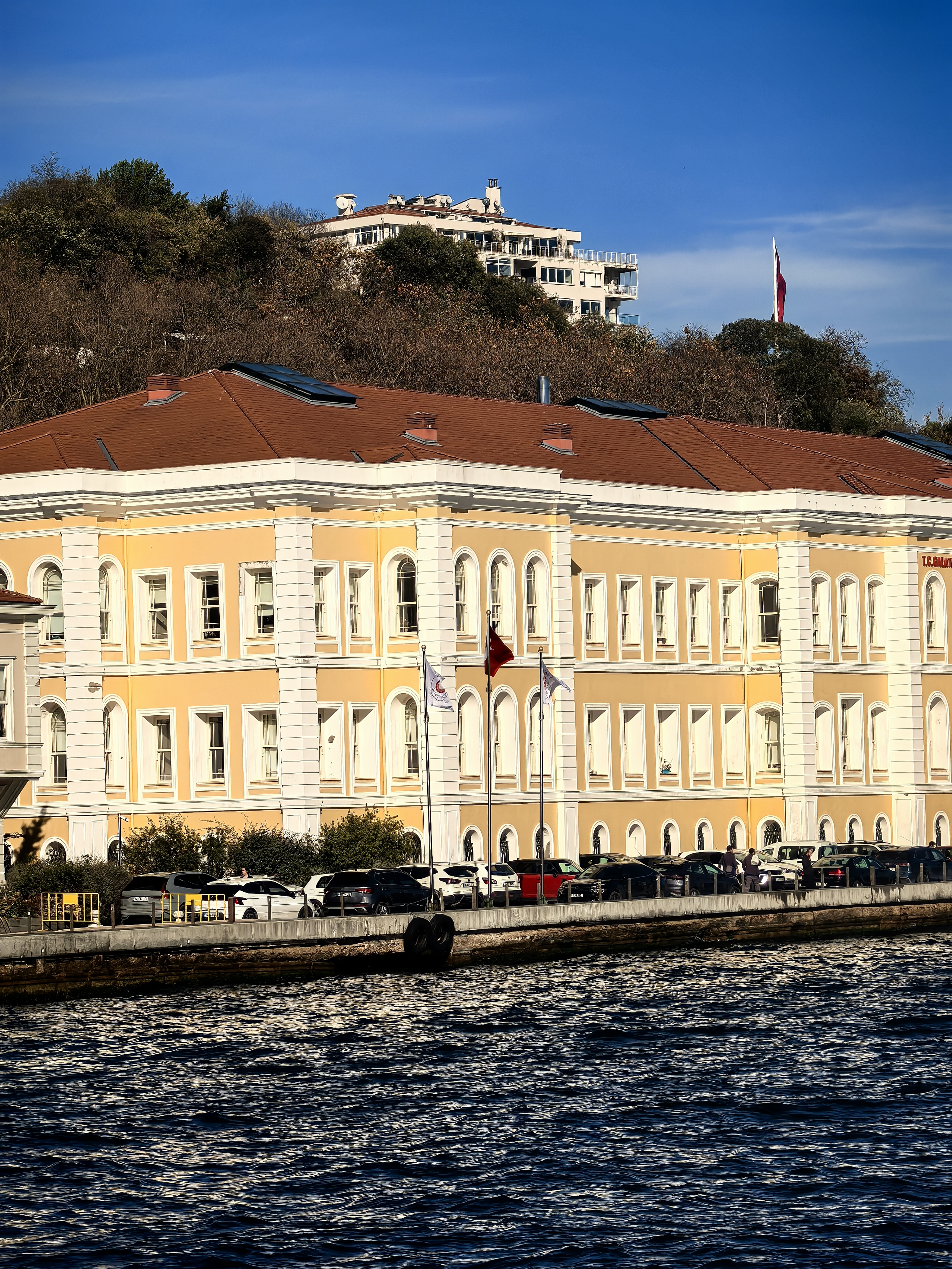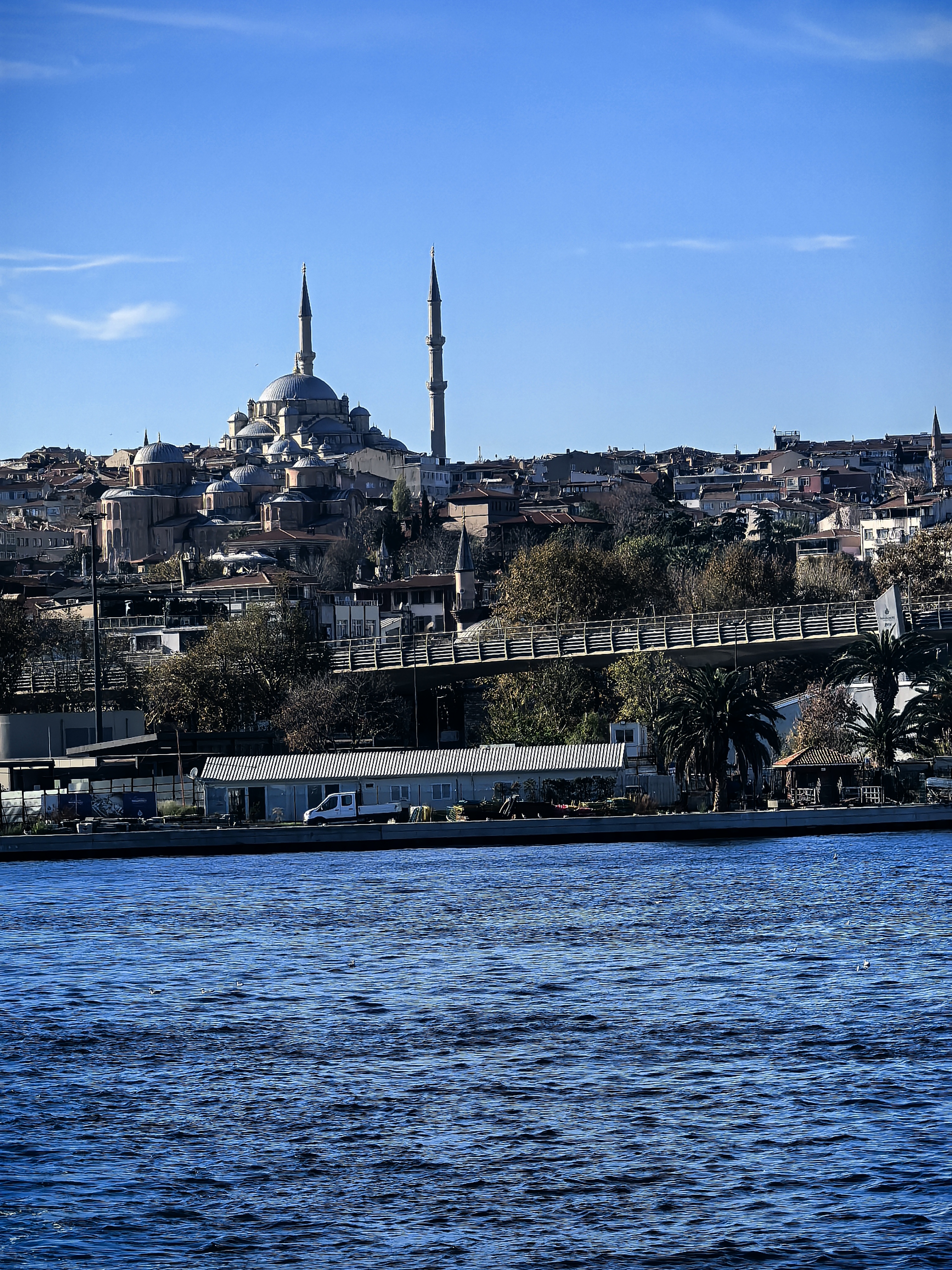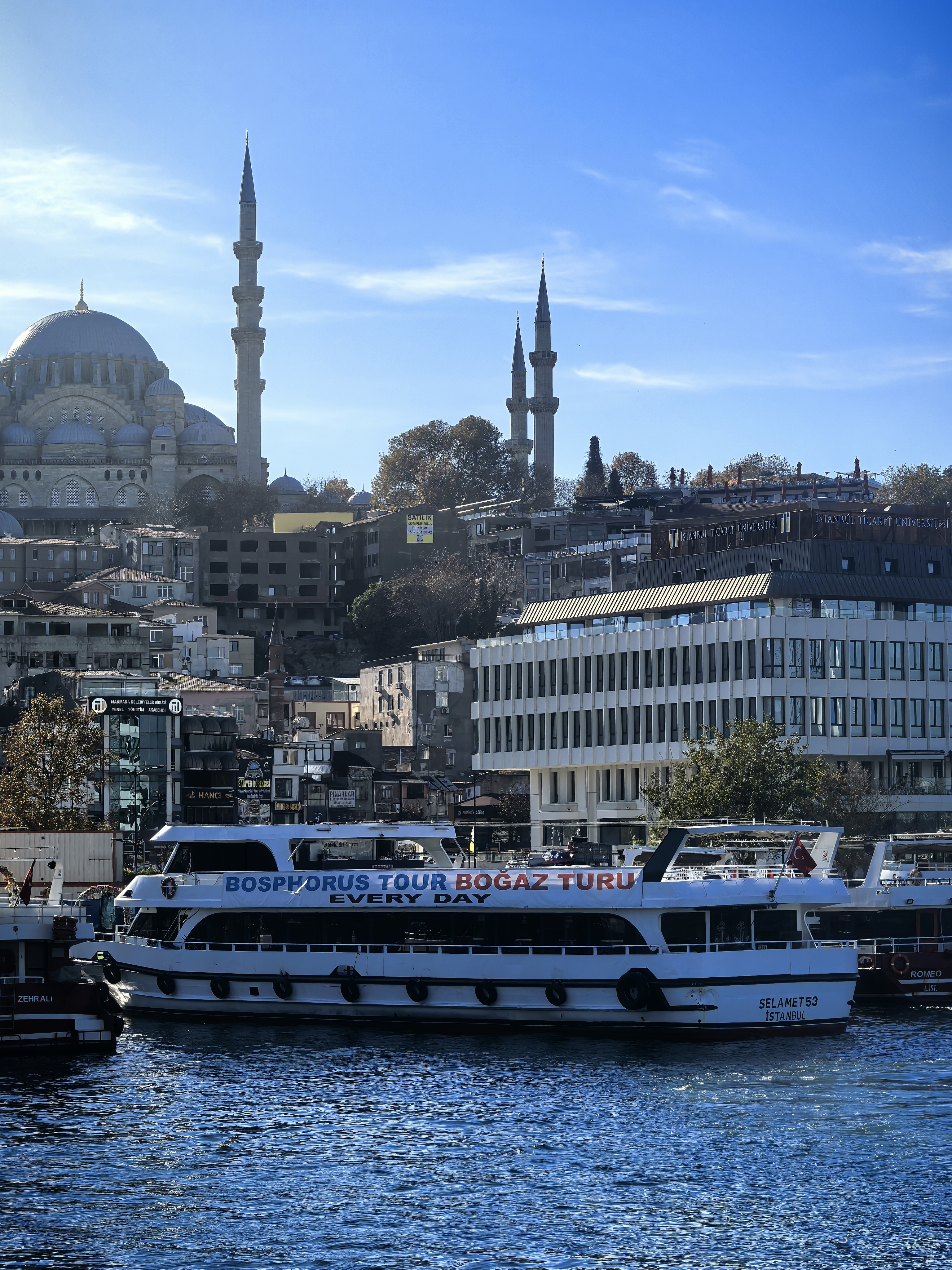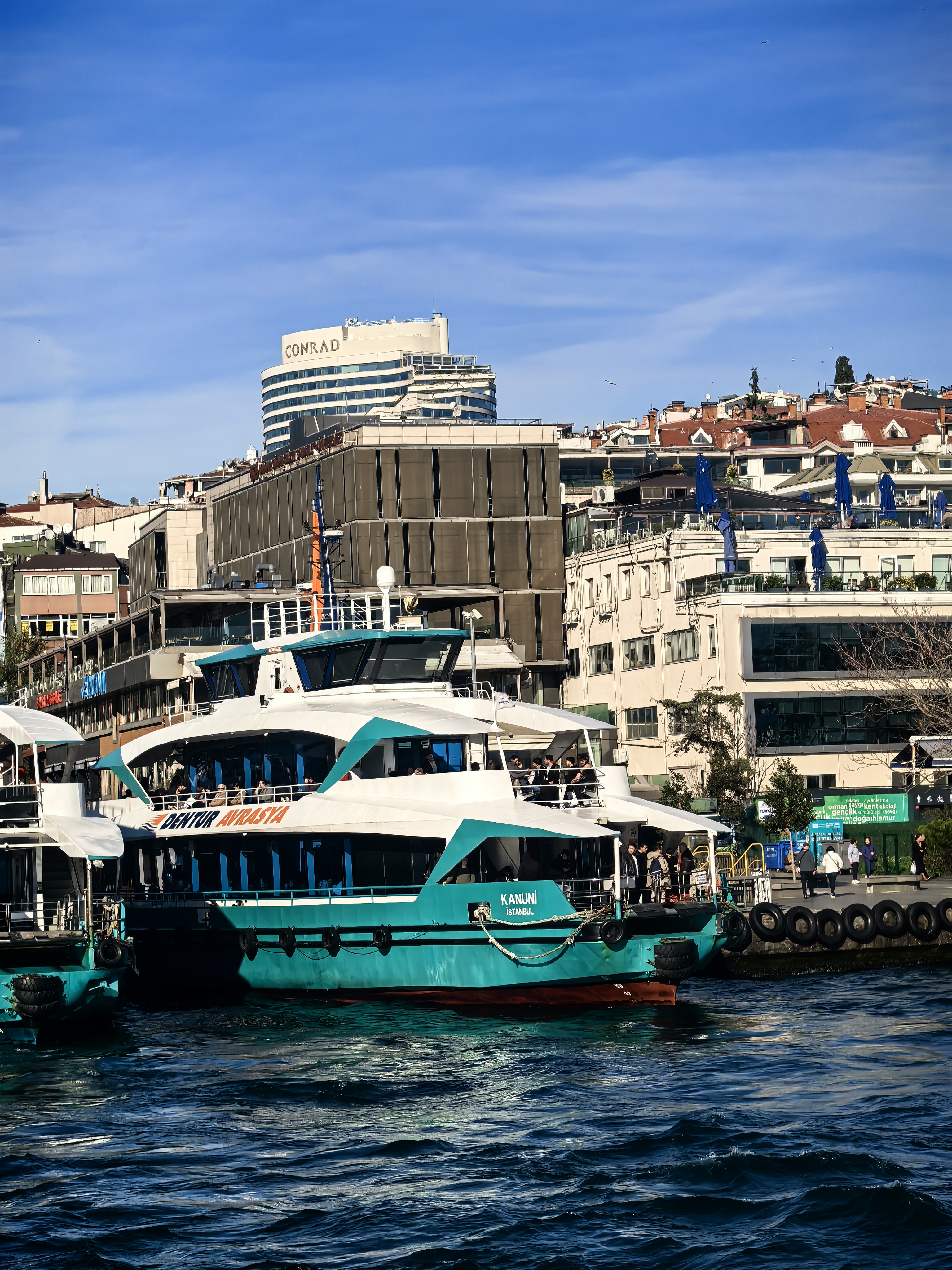 游览博斯普鲁斯海峡是来之前非常期待的事。很庆幸,我们这个小团经过当地导游一番疏通后,得以包游船尽情游览。 两层的游船缓缓划破碧蓝的海水,阳光洒在浪花上,闪烁着金色的光芒。横跨欧亚的大桥如钢铁巨龙飞越东西,历史的低语便如海风拂面而来。 海峡是古代文明的十字路口,曾连接拜占庭与罗马的贸易命脉。君士坦丁大帝在此筑起帝国的壁垒,奥斯曼的苏丹们扬帆征服,将伊斯坦布尔化作东西方交融的熔炉。残存的岸边堡垒曾经驻扎着守护拜占庭的哨兵,见证了1453年奥斯曼的铁蹄踏破君士坦丁堡的悲壮。 前方那片悬崖,昔日苏莱曼大帝的舰队曾在这里集结,向着欧洲扩张。海鸥在蔚蓝天穹盘旋,似乎也追忆着历史的回音。 我们虽在游弋中,却仿佛穿梭于时空隧道,从希波的竞技场到帝国的沉浮,每一片浪花都浸润着千年的铁血
