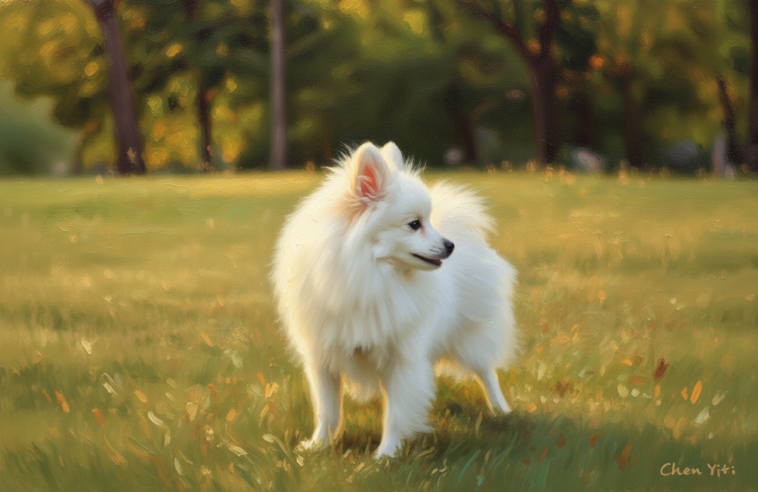 油画《狗子》 以印象派技法呈现,笔触松动灵动,通过色彩的自然过渡塑造出蓬松的犬毛质感。构图上,白色博美居于画面中心,与背景树林形成疏密对比,纵深空间层次分明。暖黄调的草地与犬只的白色毛发相映成趣,光影交错间营造出清新自然的氛围,展现了画家对色彩与形态的精准把控。