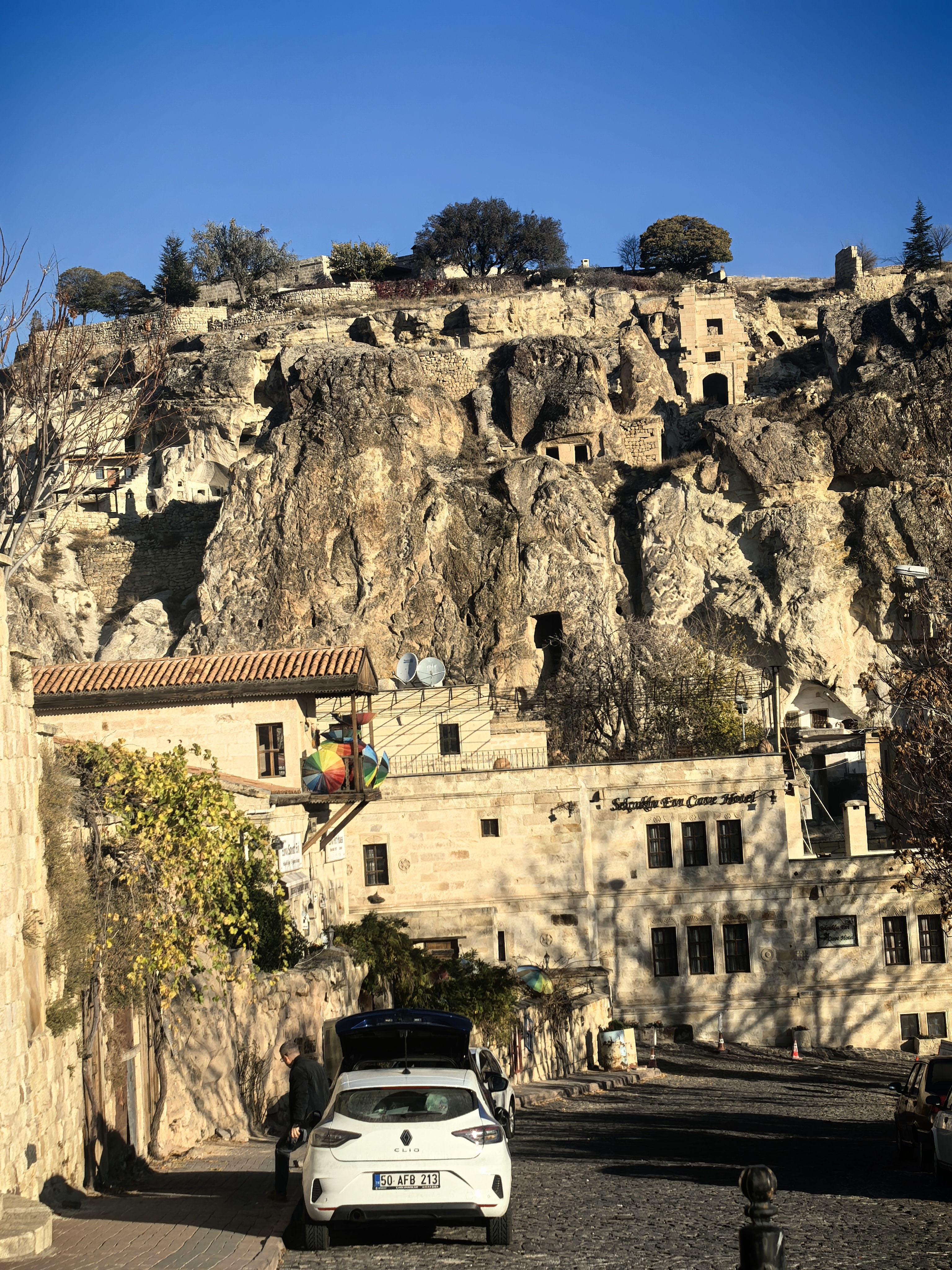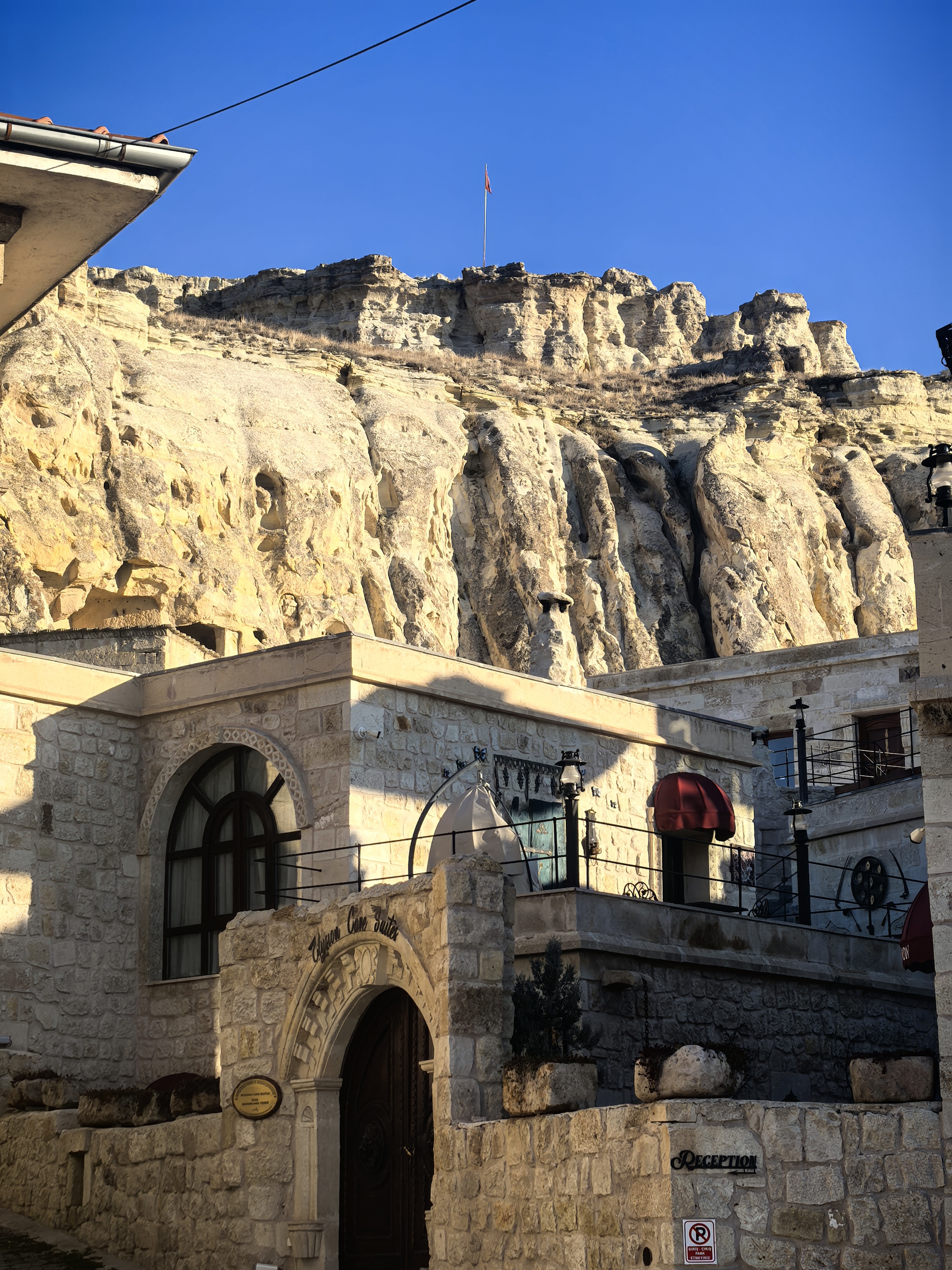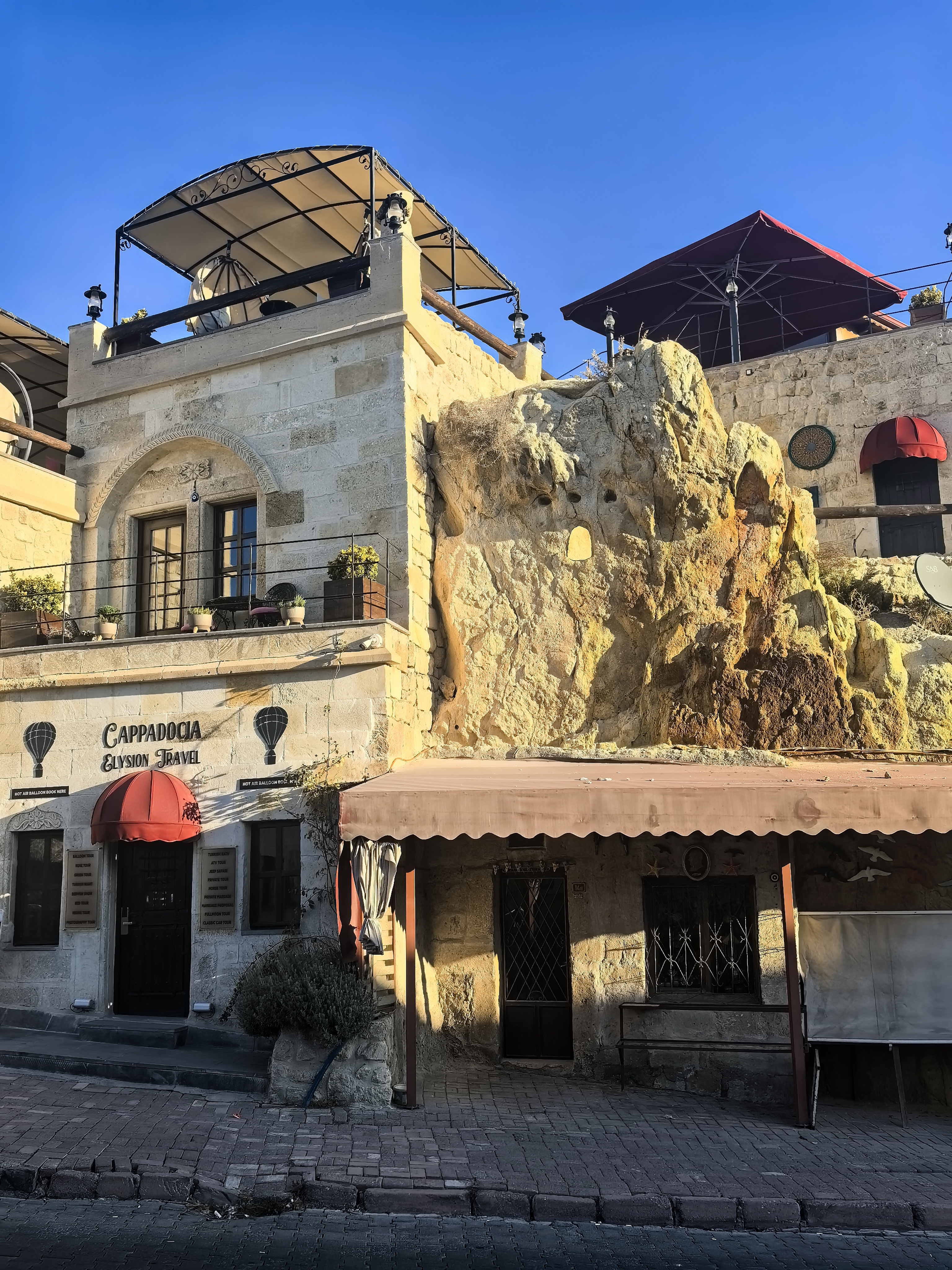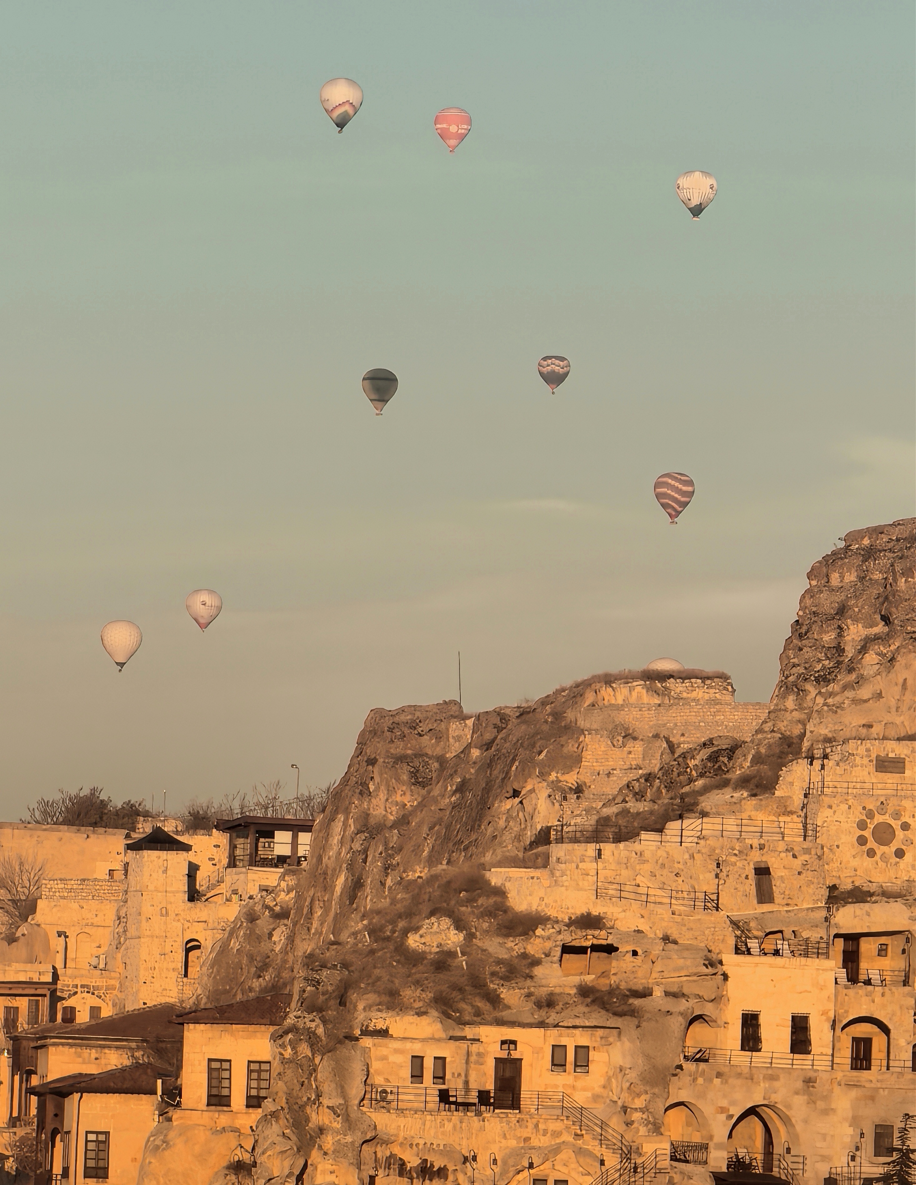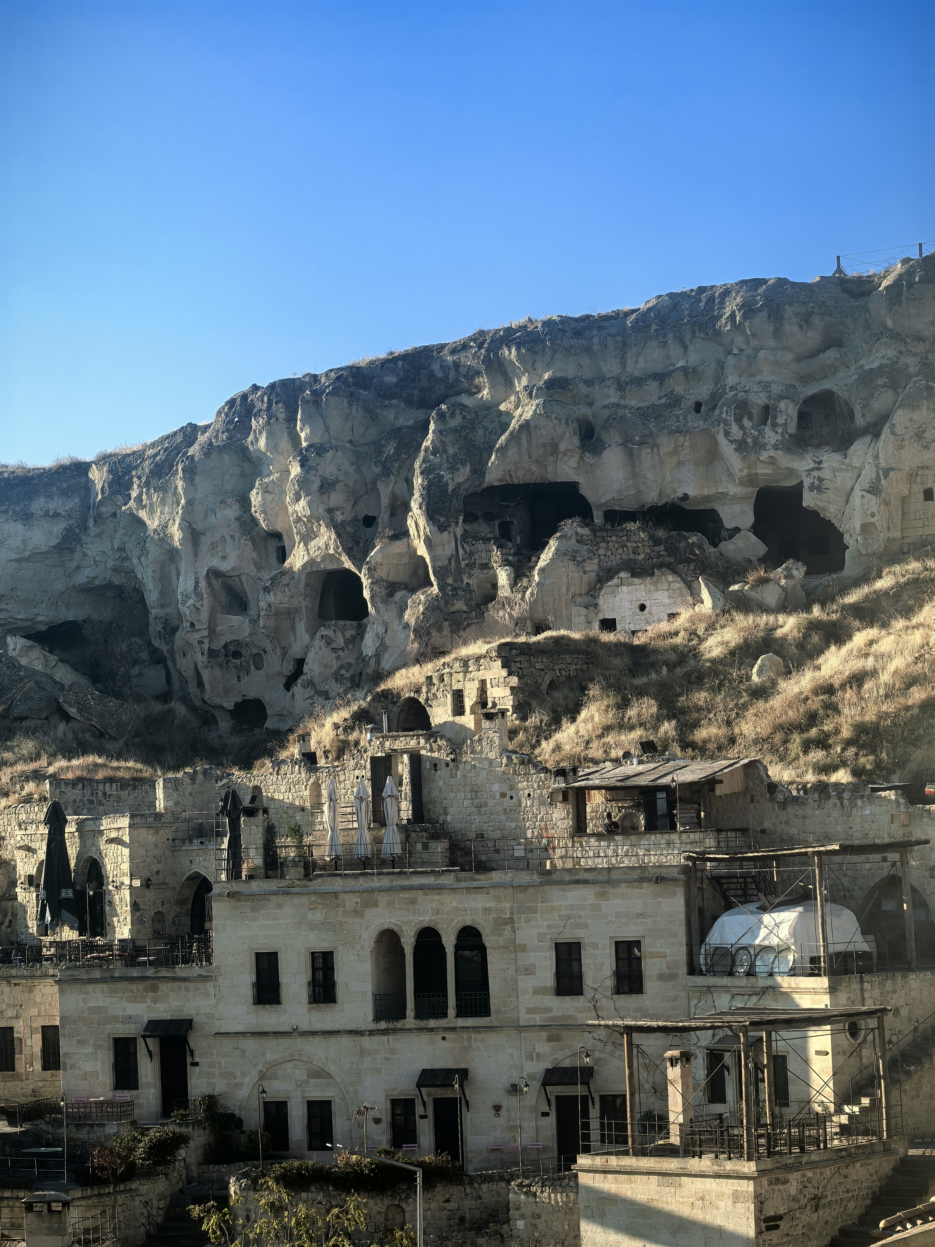 早上8点,我沿着于普居尔小镇的山坡,朝着更高的山丘进发,那里是洞穴酒店的集中地。一路上,形态各异的洞穴建筑错落有致,有的似巨大的蘑菇拔地而起,有的如神秘的城堡隐匿山间,一直盘旋到山顶都能看见。 不少知名影视都曾在此取景,像《星球大战》系列,那奇幻的外星场景与这里独特的喀斯特地貌完美融合,让电影更具视觉冲击力。 站在高处俯瞰,阳光洒在洞穴酒店的外墙上,光影交错间,仿佛时光都放慢了脚步。 远处,热气球缓缓升起,与这古老而神秘的小镇构成一幅绝美画卷,让人不禁沉醉在这如梦如幻的景致之中。