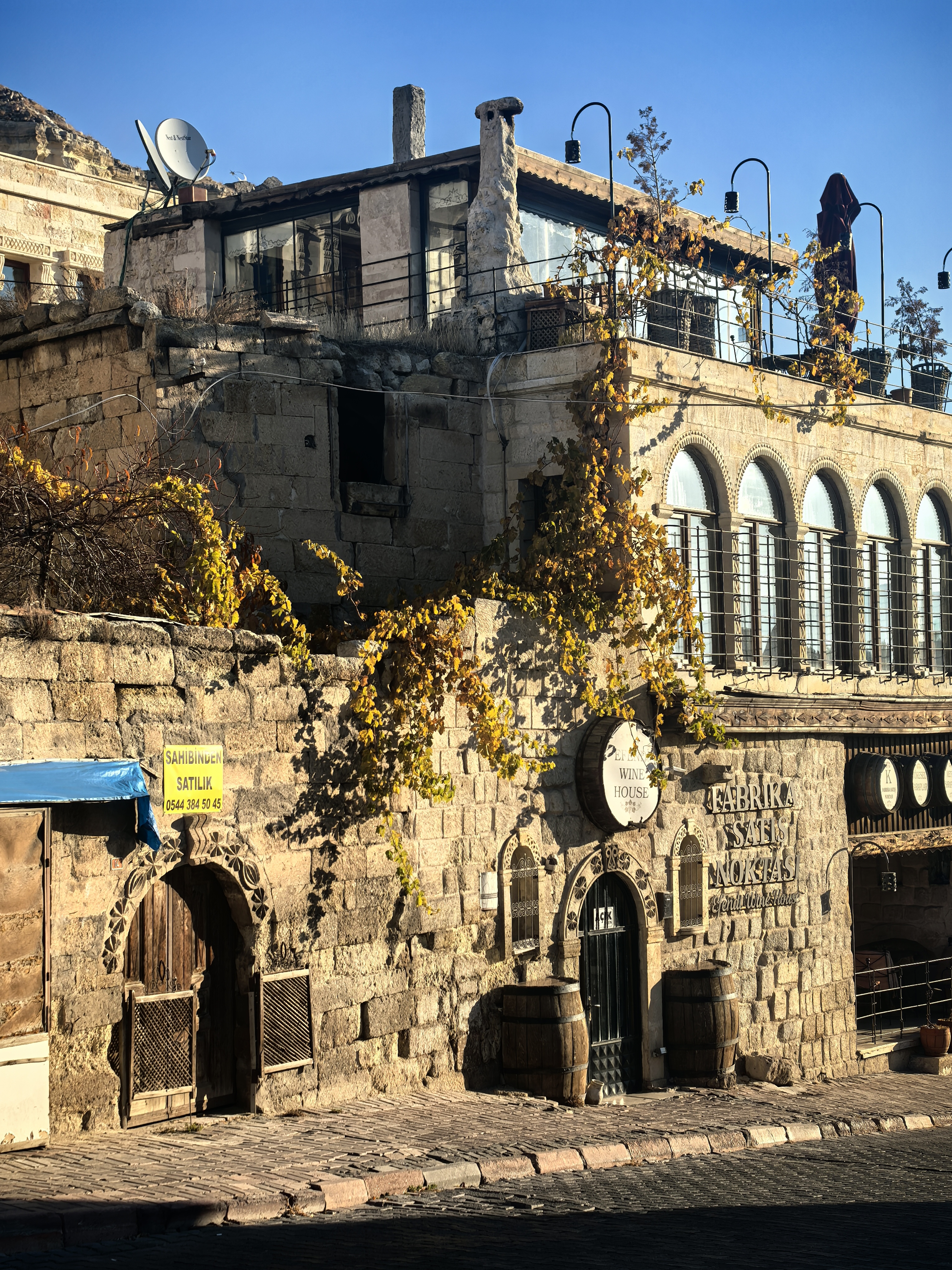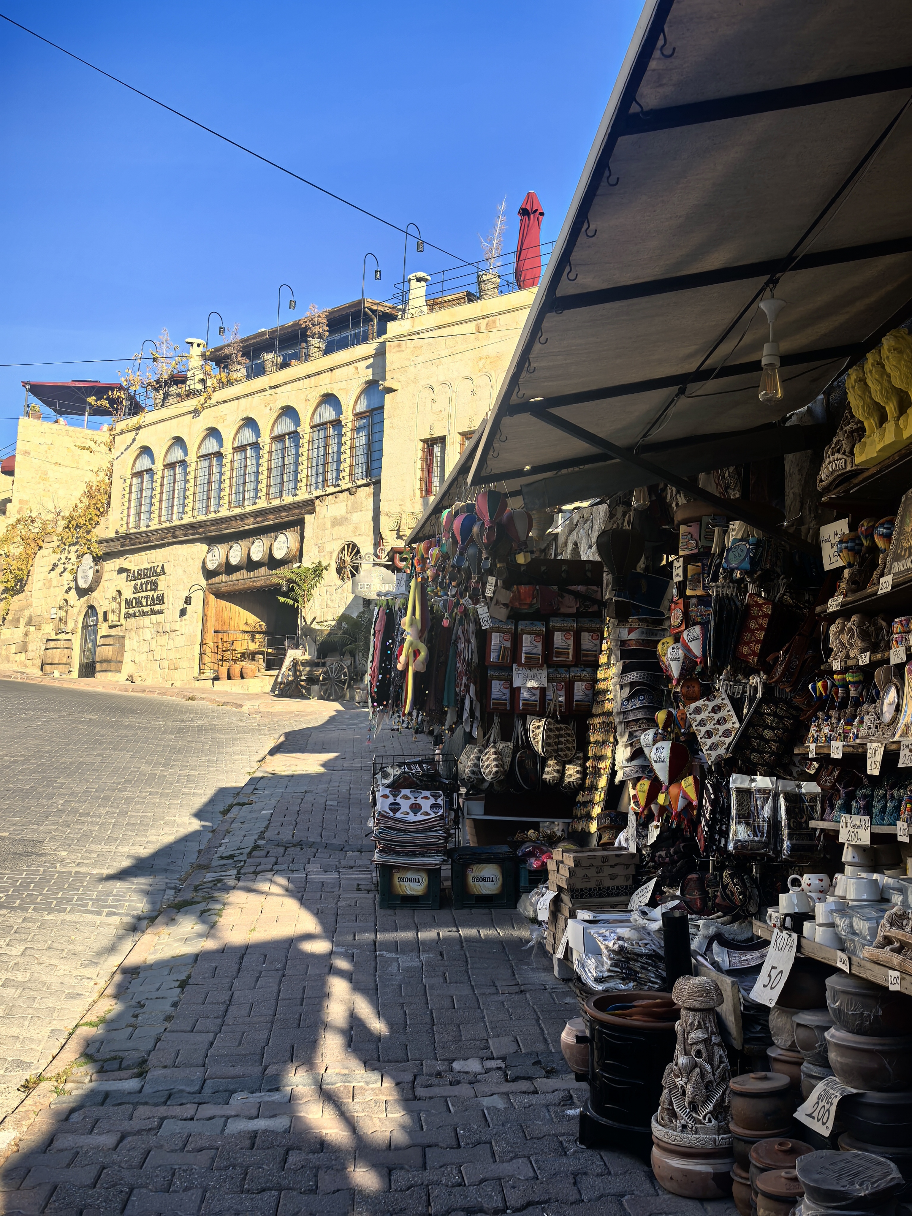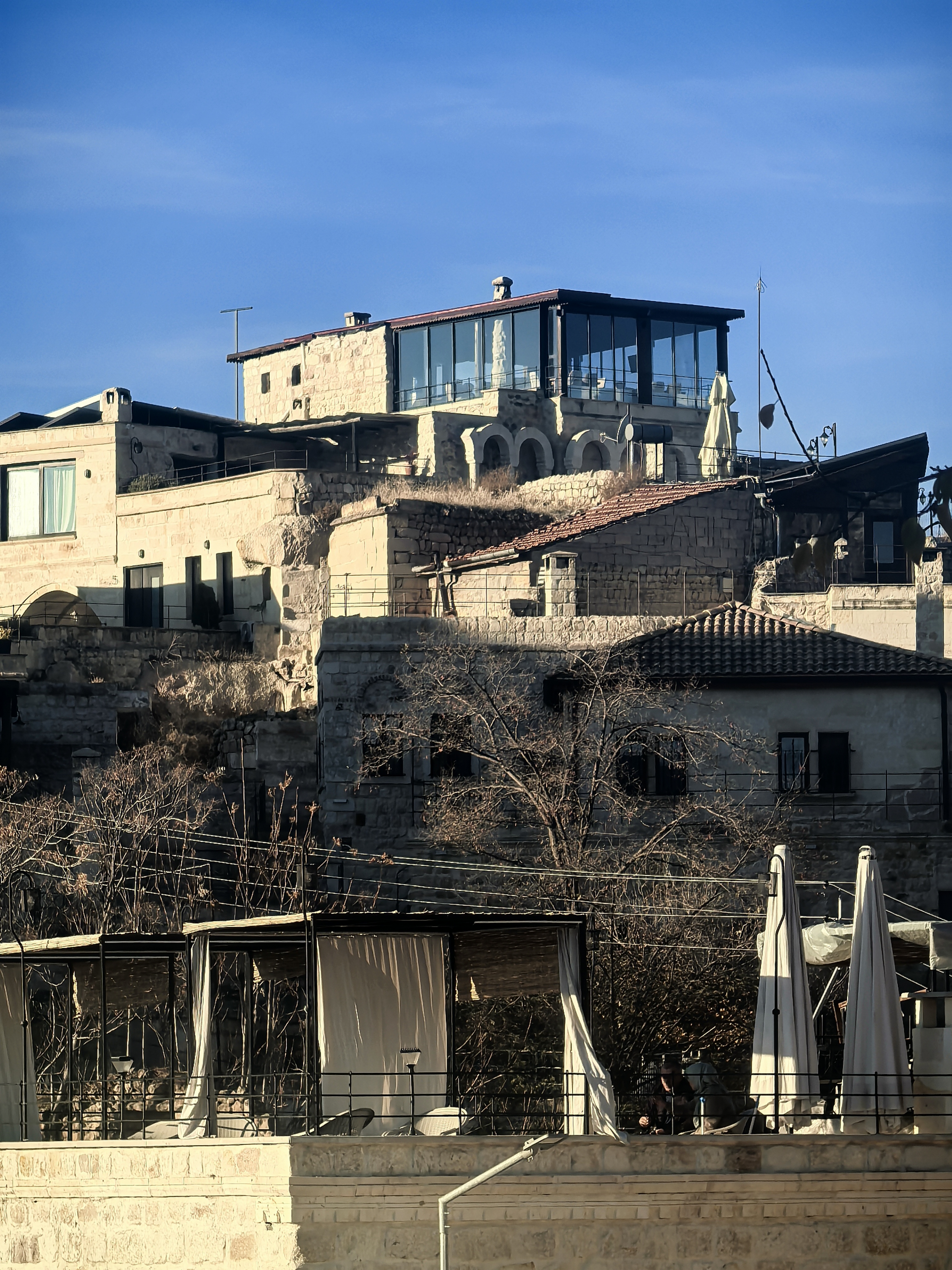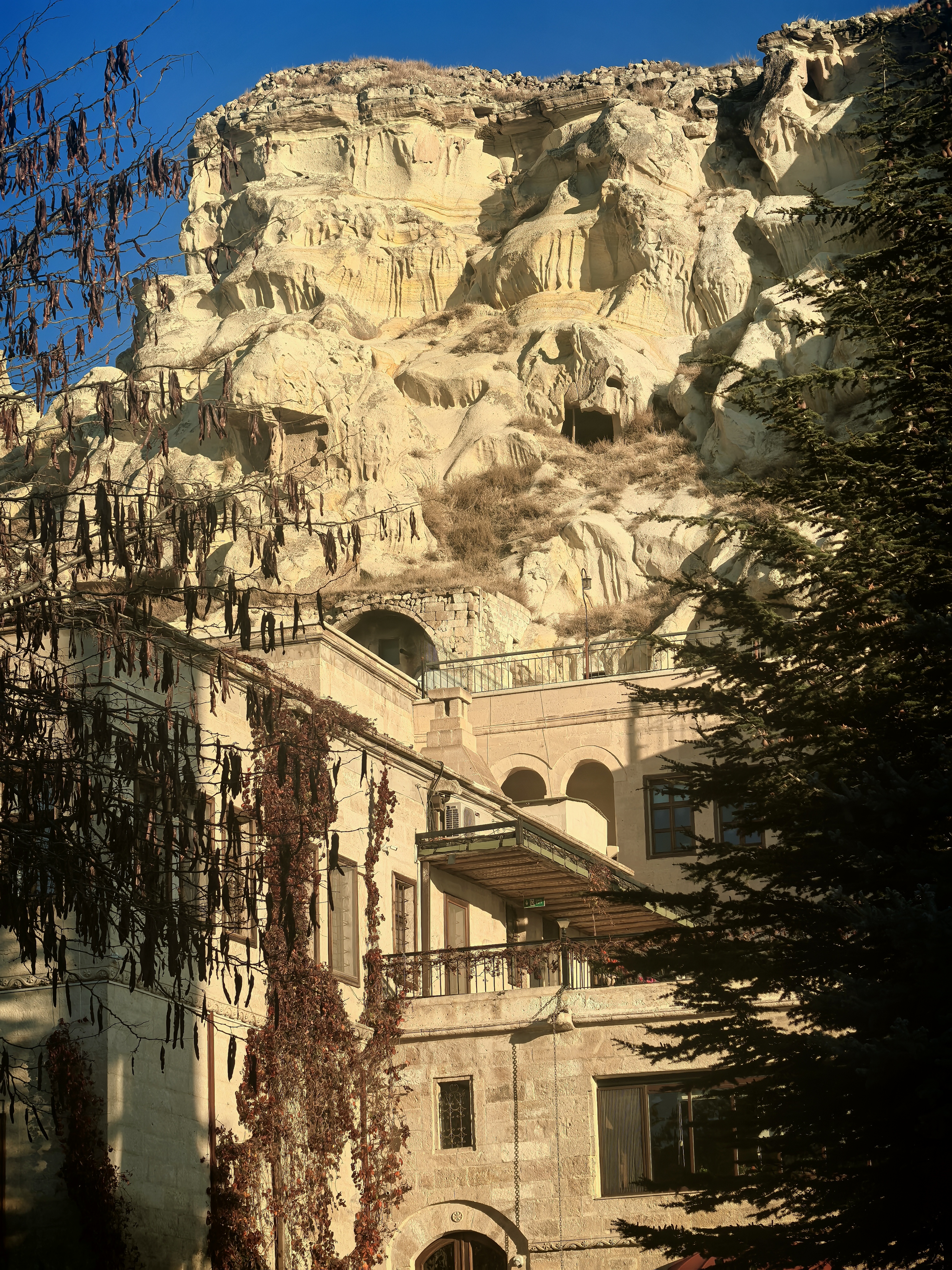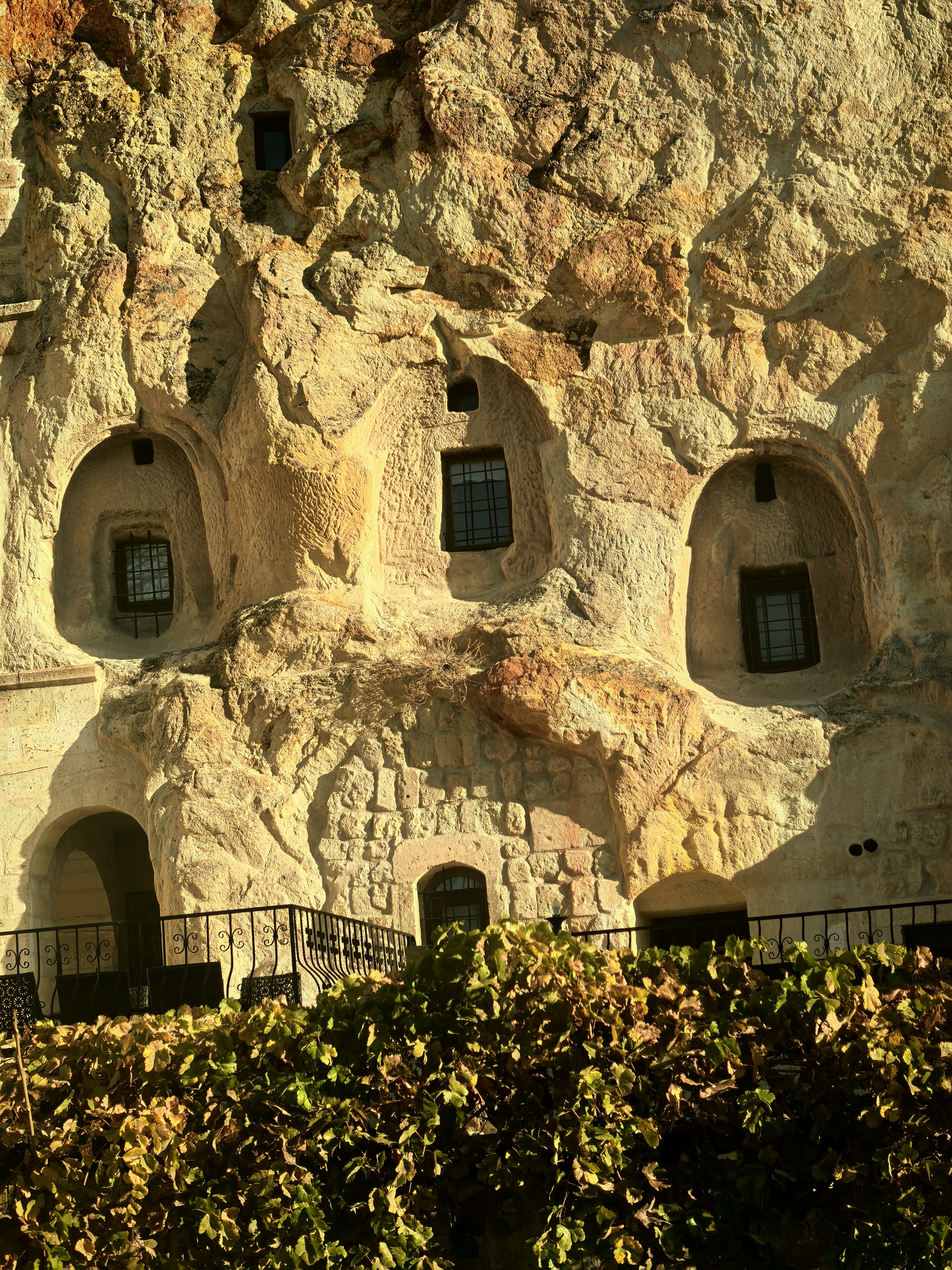 早上8点,我沿着于普居尔小镇的山坡,朝着更高的山丘进发,那里是洞穴酒店的集中地。一路上,形态各异的洞穴建筑错落有致,有的似巨大的蘑菇拔地而起,有的如神秘的城堡隐匿山间,一直盘旋到山顶都能看见。 不少知名影视都曾在此取景,像《星球大战》系列,那奇幻的外星场景与这里独特的喀斯特地貌完美融合,让电影更具视觉冲击力。 站在高处俯瞰,阳光洒在洞穴酒店的外墙上,光影交错间,仿佛时光都放慢了脚步。 远处,热气球缓缓升起,与这古老而神秘的小镇构成一幅绝美画卷,让人不禁沉醉在这如梦如幻的景致之中。