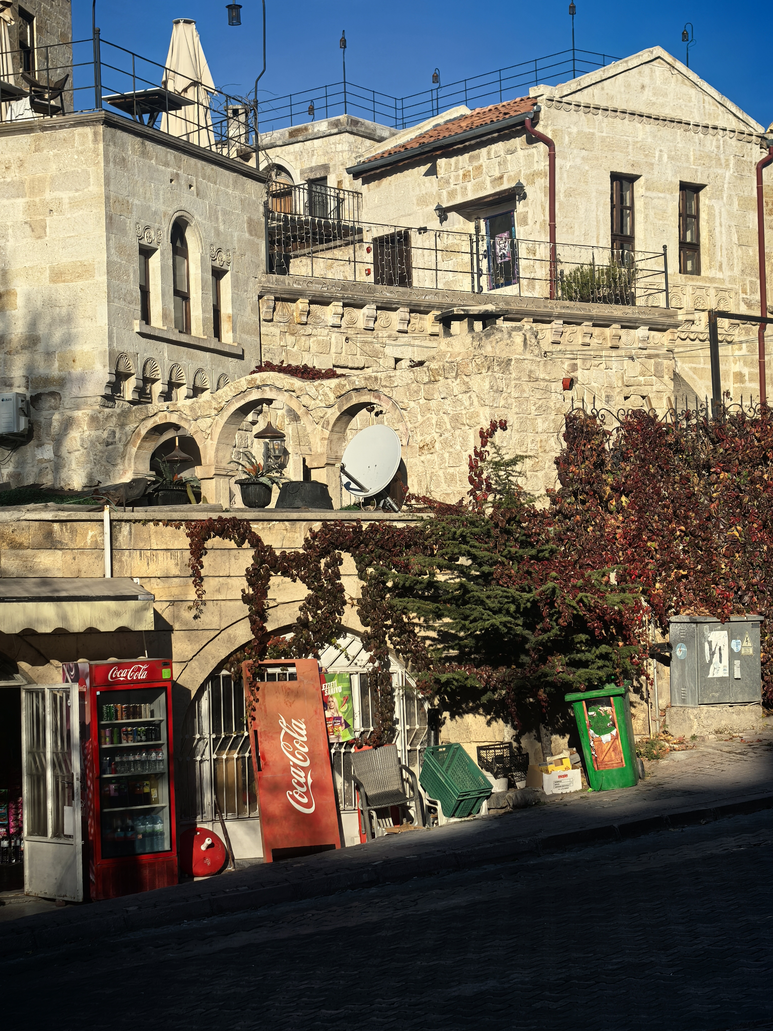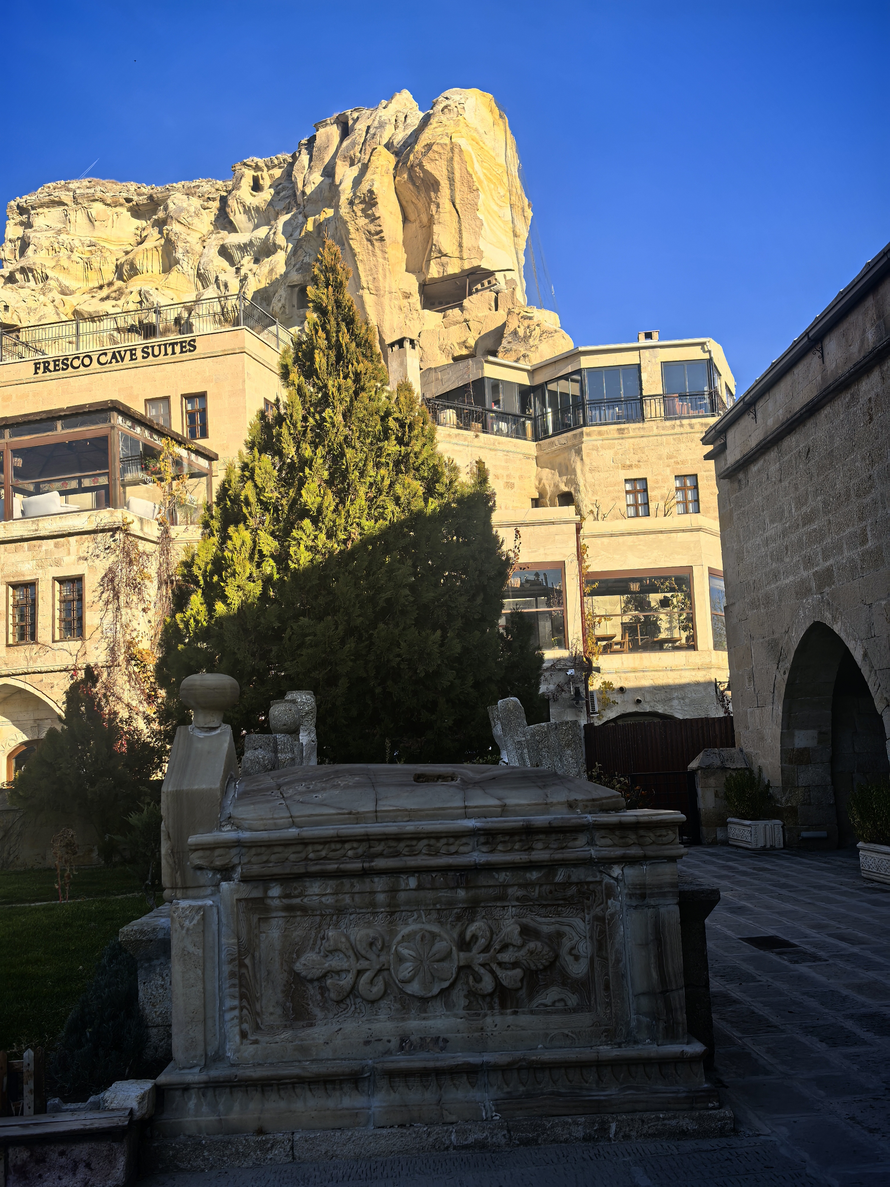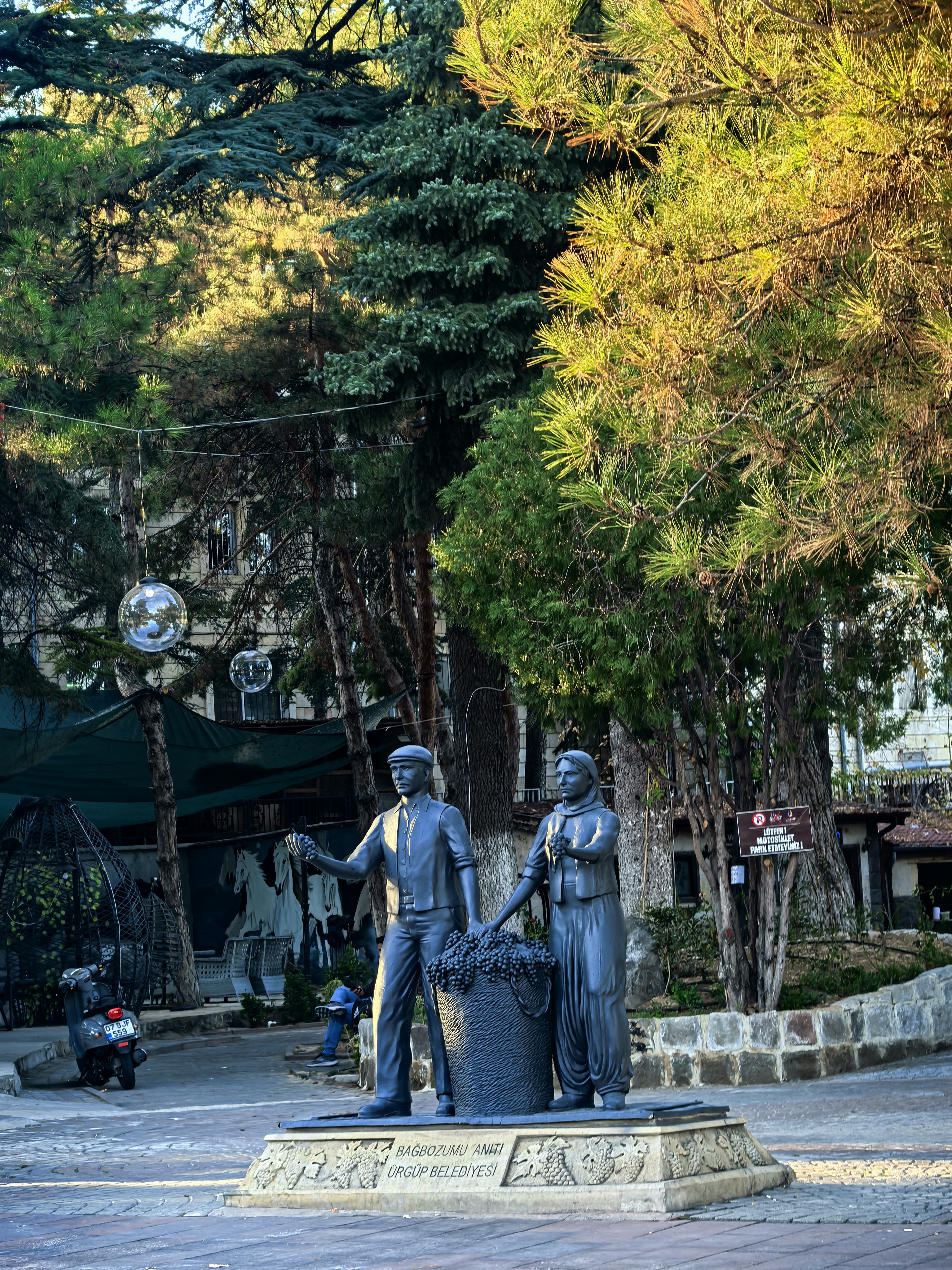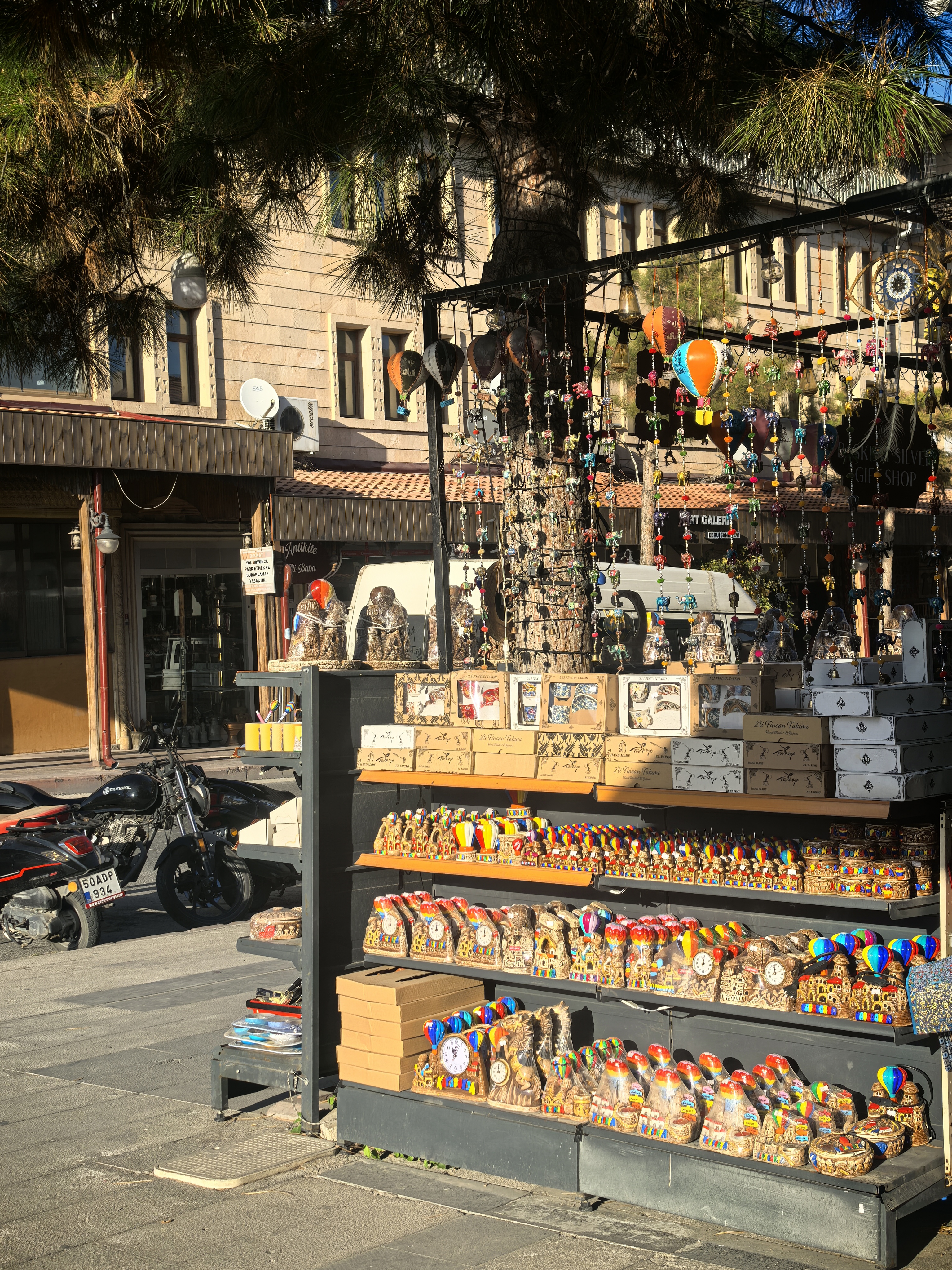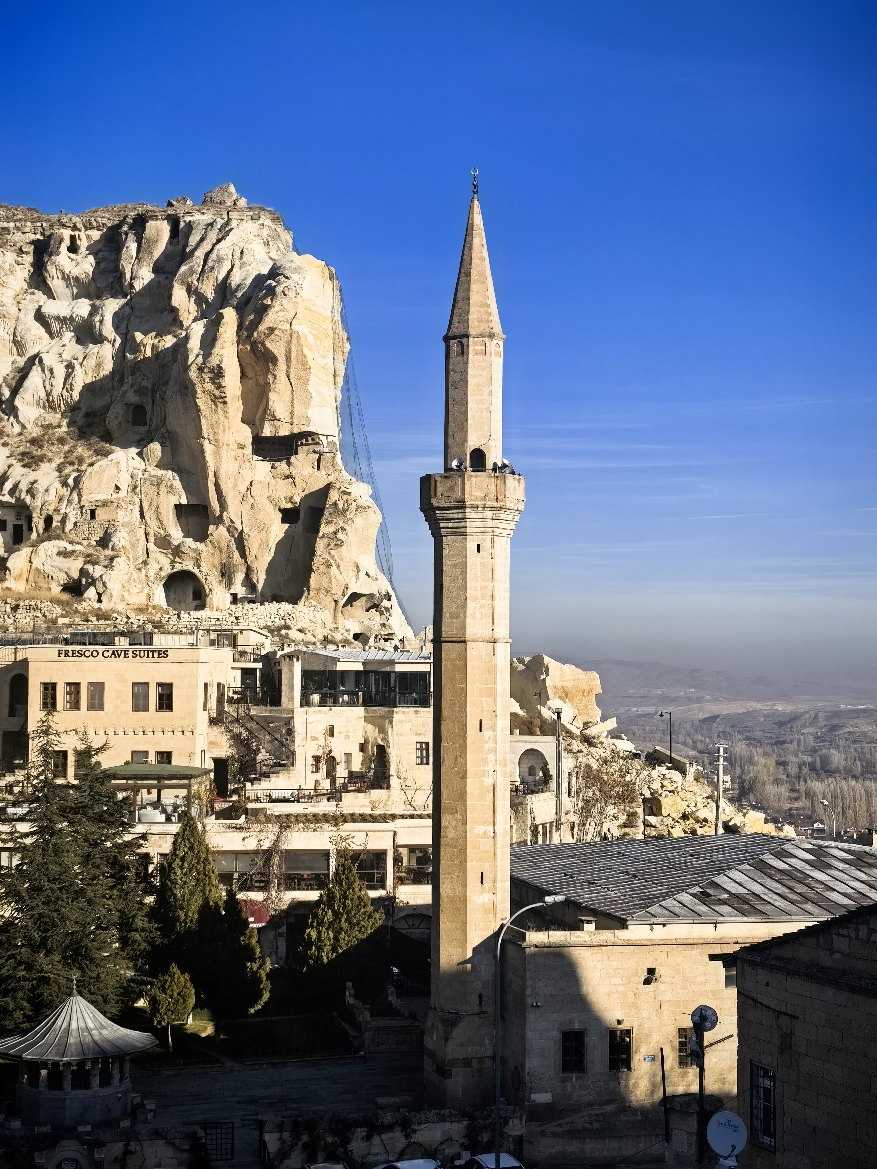 于普居尔是卡帕多奇亚的瑰宝,其主城区依山而建,完美融合了自然与人文。街道由蜿蜒的石板路构成,两旁是凿刻于凝灰岩中的古老民居,许多已改造出租为温馨的洞穴酒店和餐厅,所以这些房子主人许多迁到小镇来居住。 这些建筑保留了传统的拱形门廊和烟囱,与奇特的火山岩地貌浑然一体。漫步街头,会经过琳琅满目的手工艺品店,当地匠人在门口编织土耳其特色地毯,蓝眼睛挂饰和陶器点缀着街角。 居民在树下悠闲地喝着茶咖啡,空气里弥漫着泥土的芬芳和烤肉的香气。街道上最引人注目的是岩石教堂,如著名的乌齐姆教堂,内部保存着色彩斑驳的拜占庭湿壁画,诉说着中世纪的虔诚。 这里没有匆忙的步调,只有沉淀了千年的宁静与质朴,让每一条街道都成为一场穿越时空的漫步。