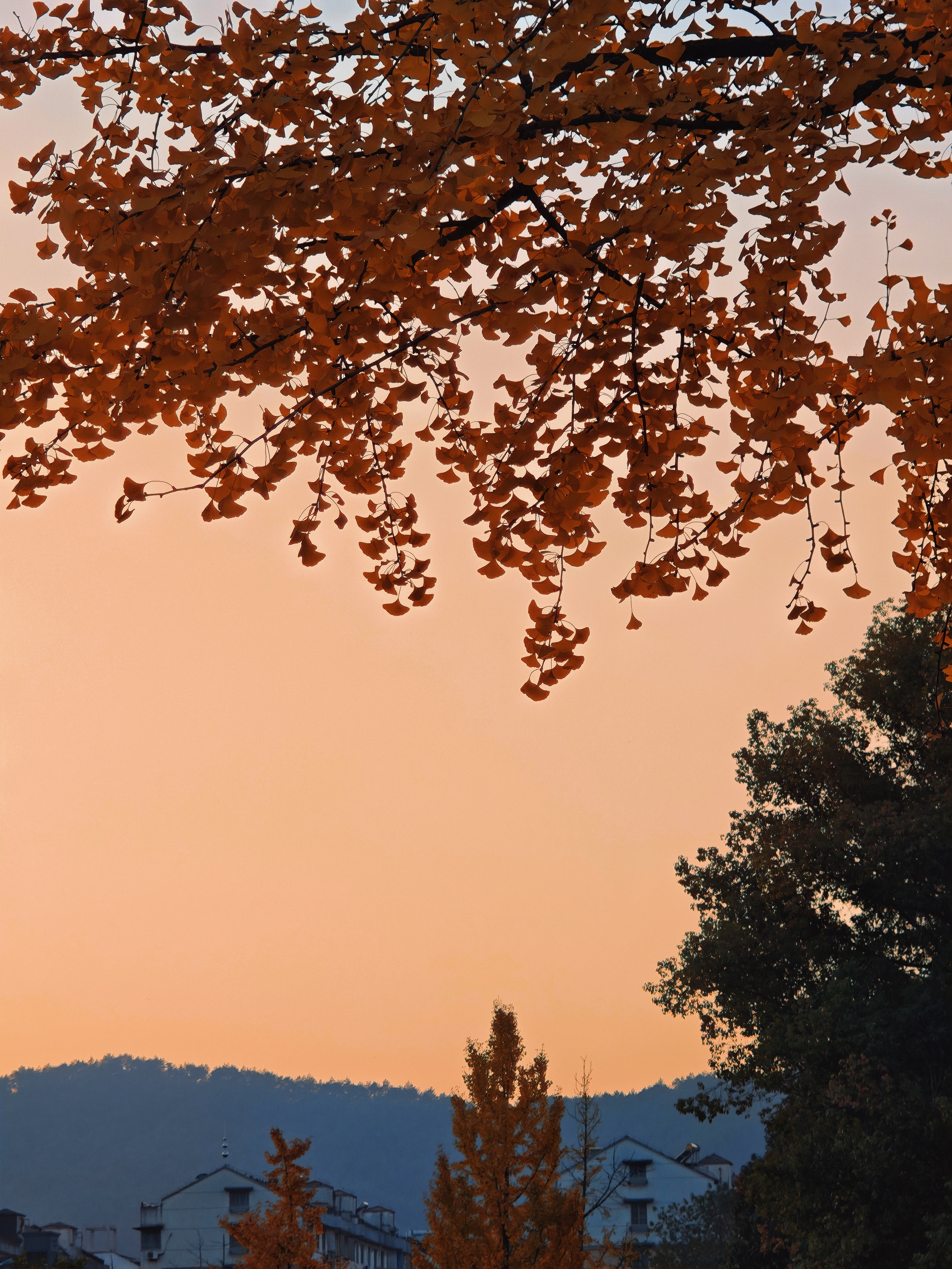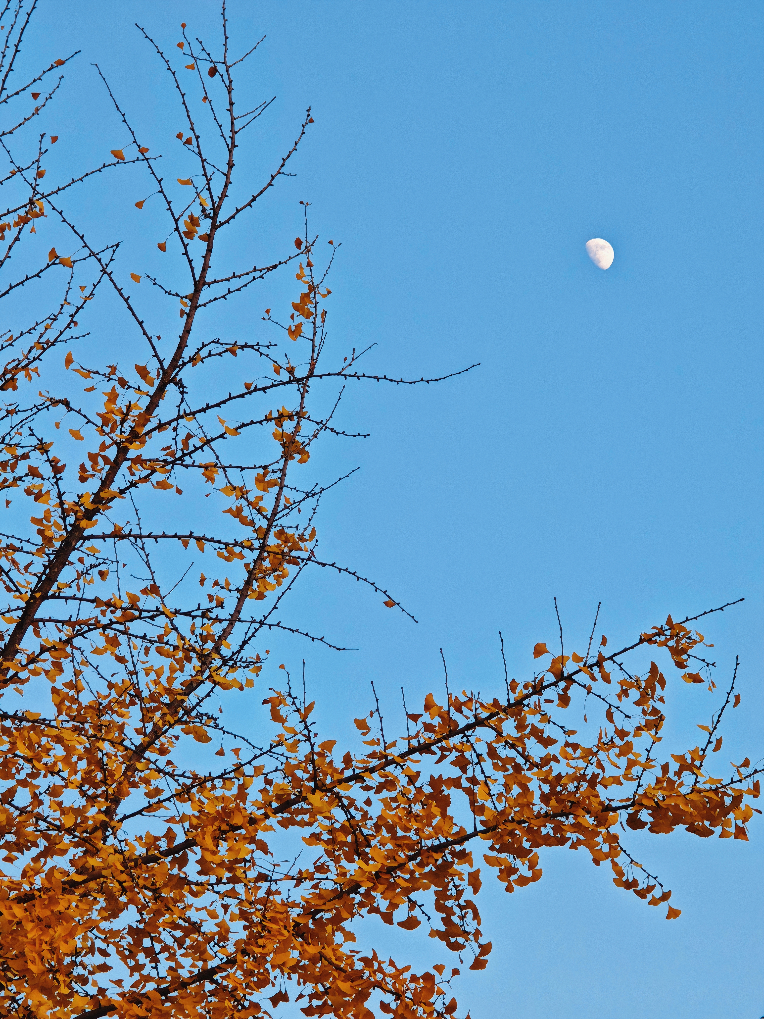 天空低垂如灰蓝绸缎 落日余温 正为云朵晕染橘色纹章 银杏将橘色纺成竖琴 弦上栖着半阕 浅薄荷色的月亮 树与月定格在 这恰到好处的距离里