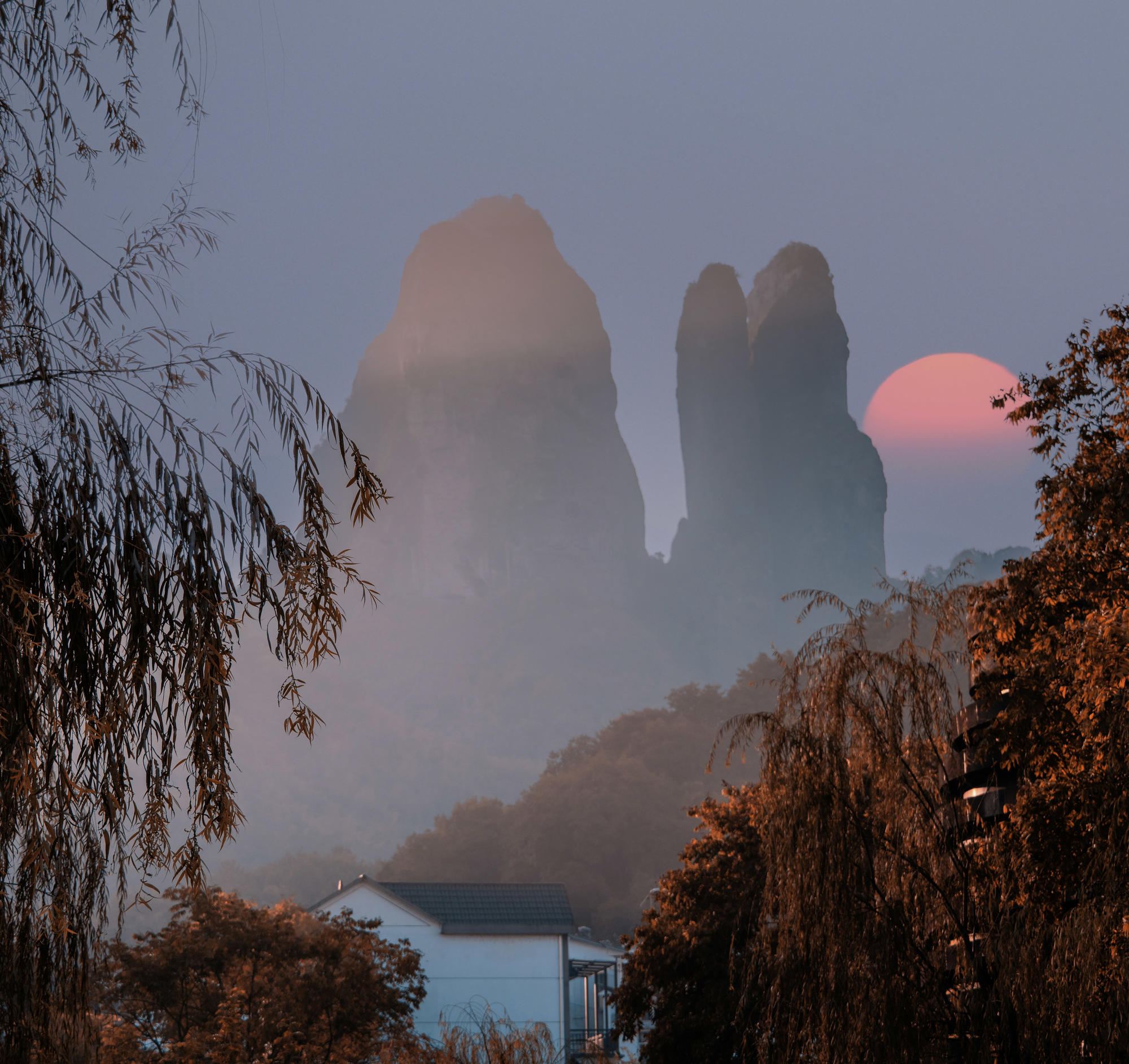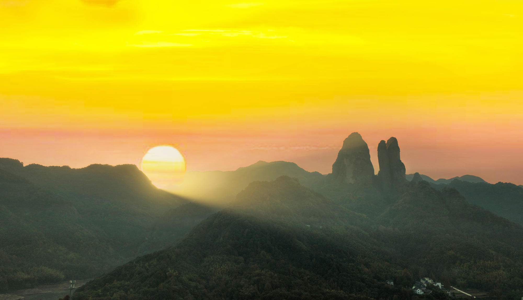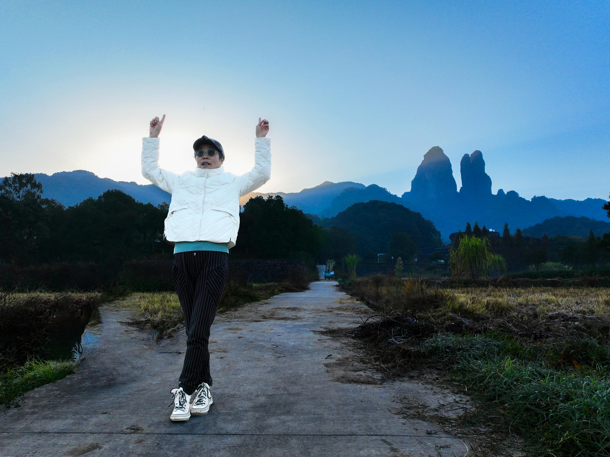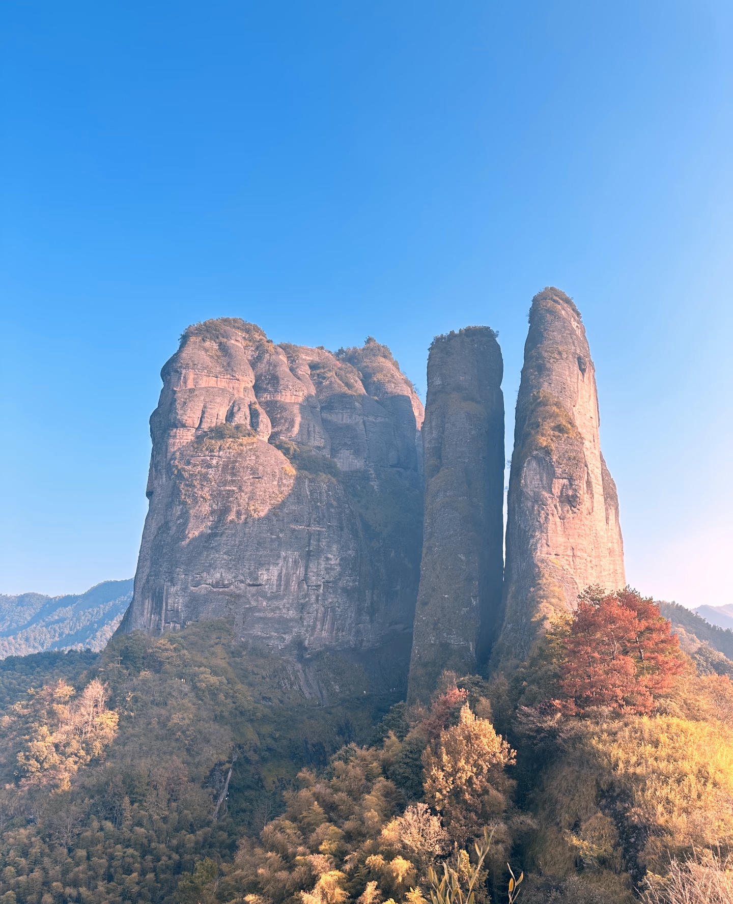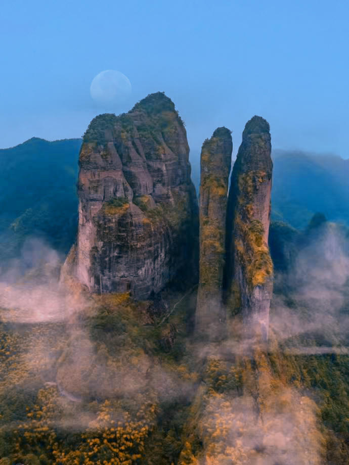 为捕捉江郎山最美的晨光,清晨五点便从住处启程,奔赴这片千年丹霞秘境。沿途薄雾如纱,山影朦胧,宛如仙境初启。然而通往山顶的景交车尚未发车,只得暂驻山脚。索性放飞无人机,让镜头穿越晨雾,静候日出。从雾霭沉沉到金光破晓,一幕幕壮美画卷徐徐展开,虽未能登顶,却另辟蹊径,收获了光影与自然交织
