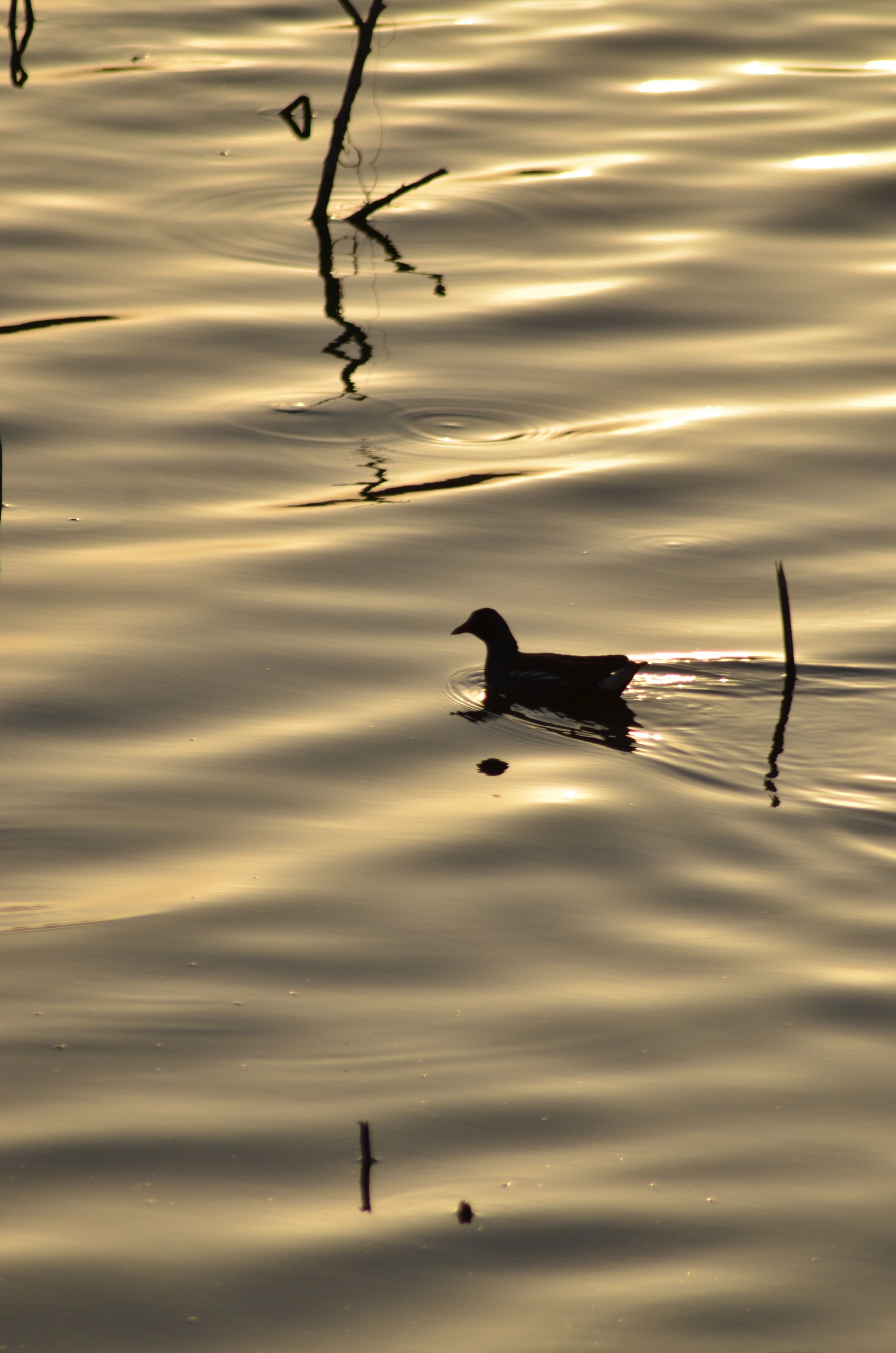 暮色把湖水浸成了蜜色,碎金似的波光裹着细柔的涟漪,绕着几根枯苇的剪影轻轻晃。一只水鸟正剪开这层暖光,绒绒的影子贴在水面上,连漾开的波纹都染着黄昏的软。