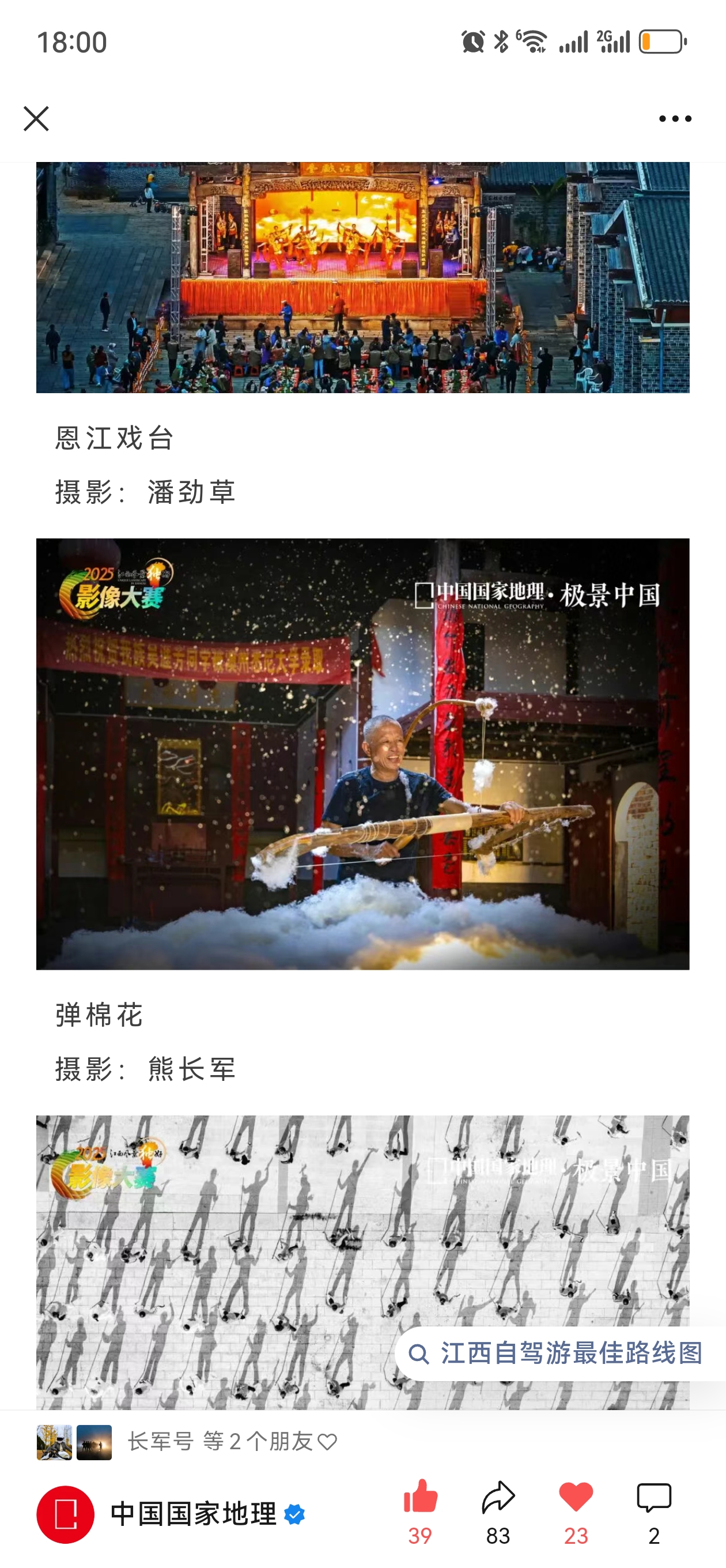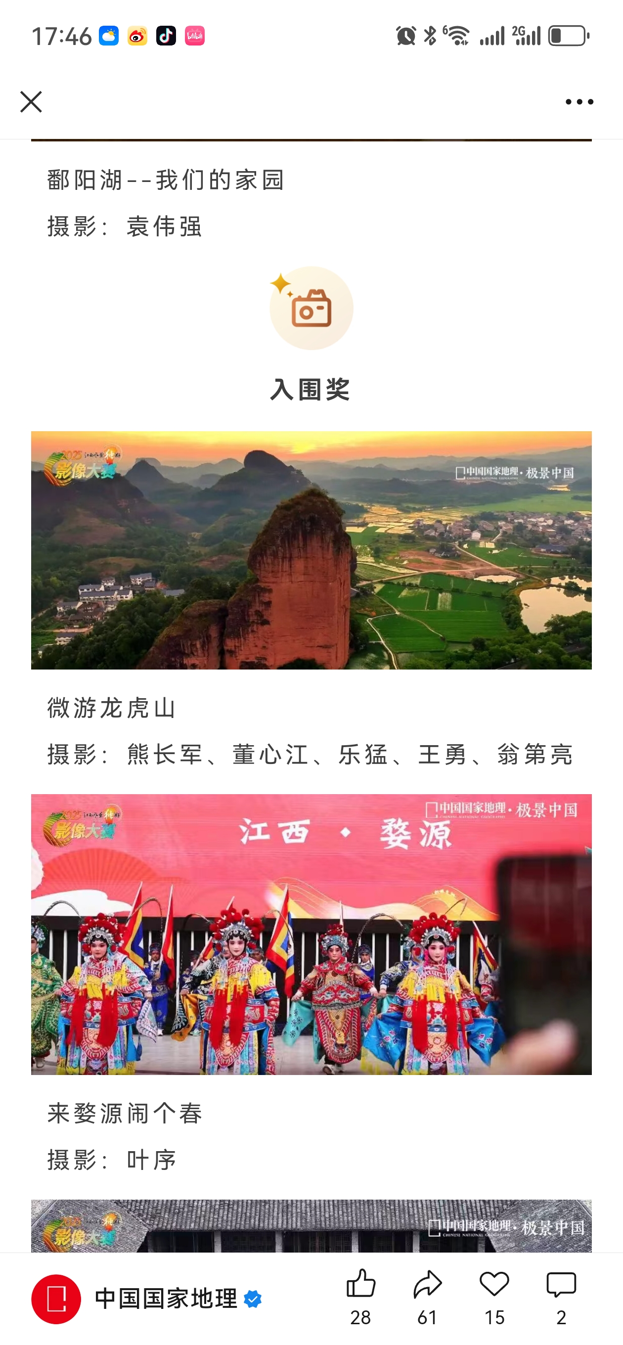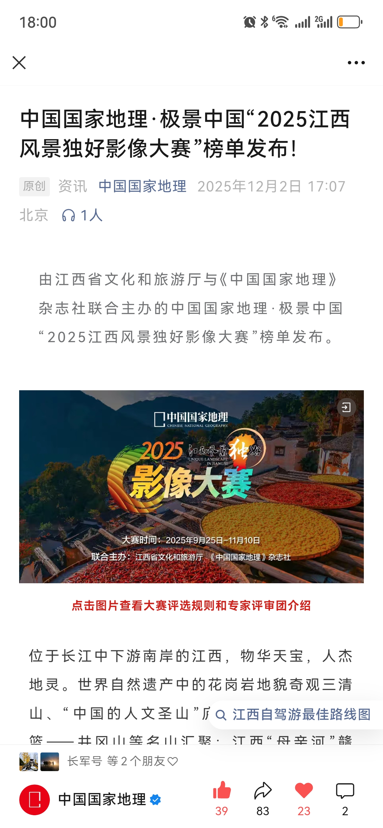 中国国家地理·极景中国“2025江西风景独好影像大赛”榜单正式发布。本人有幸摘得图片类三等奖及视频类入围奖,要感谢很多人,恕不一一列举。我还是那句话,输不输在起跑线上不要紧,最关键的是你要有面对胜利最后冲刺的能力。