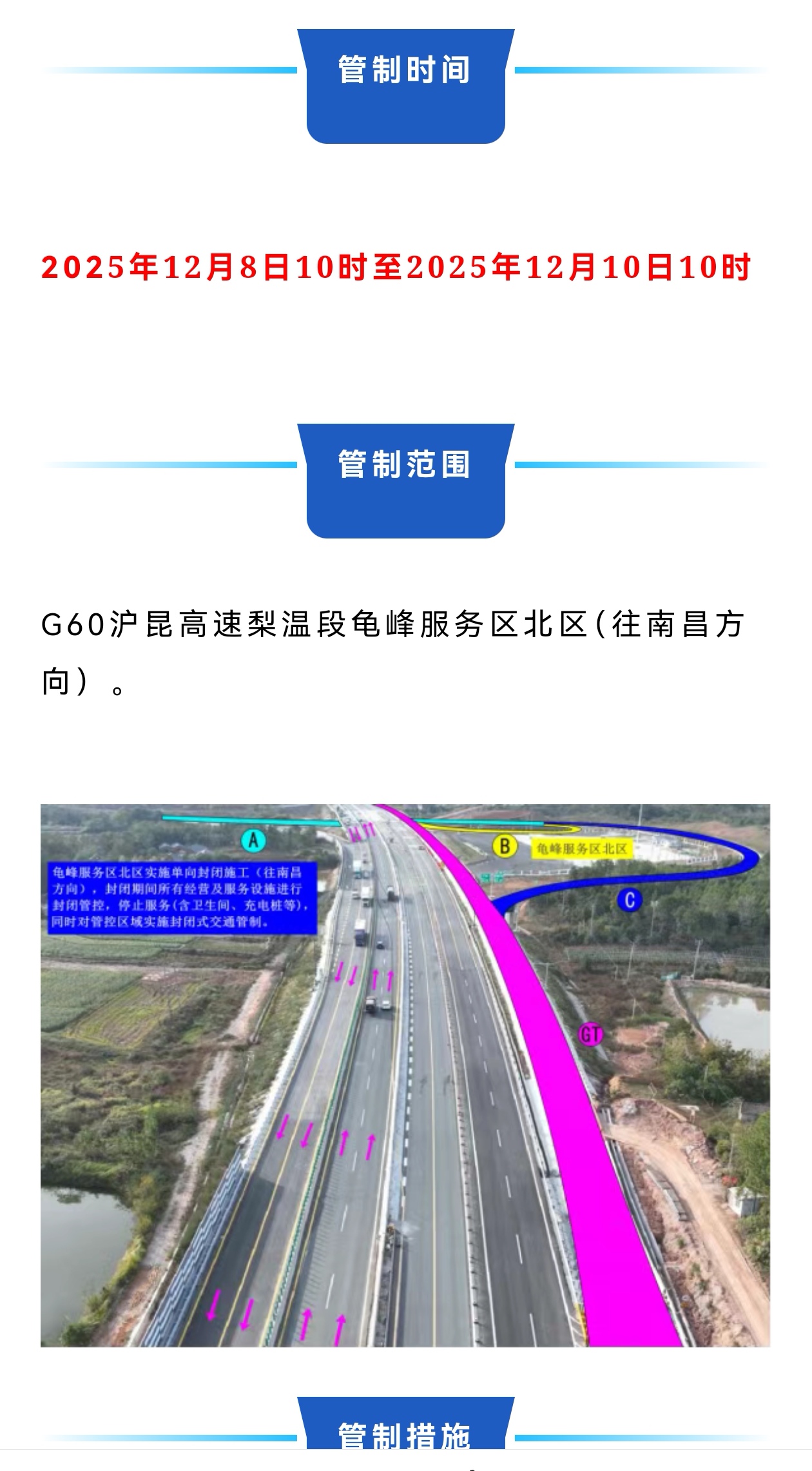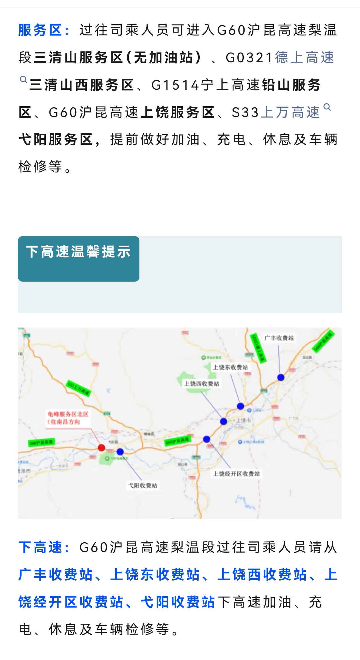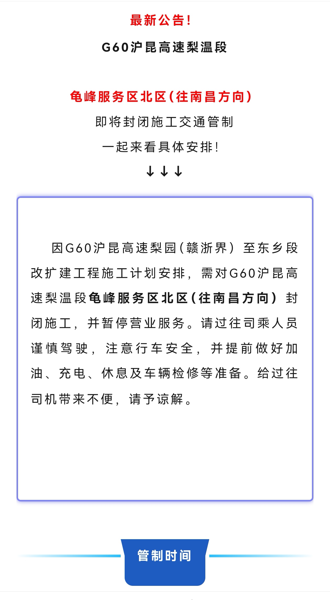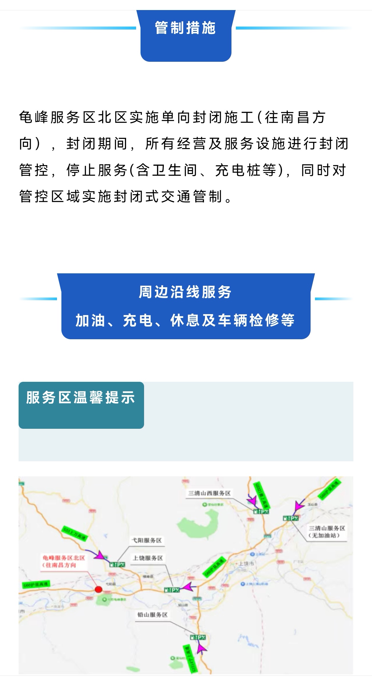 因G60沪昆高速梨园(赣浙界)至东乡段改扩建工程施工计划安排,需对G60沪昆高速梨温段龟峰服务区北区(往南昌方向)封闭施工,并暂停营业服务。请过往司乘人员谨慎驾驶,注意行车安全,并提前做好加油、充电、休息及车辆检修等准备。给过往司机带来不便,请予谅解。