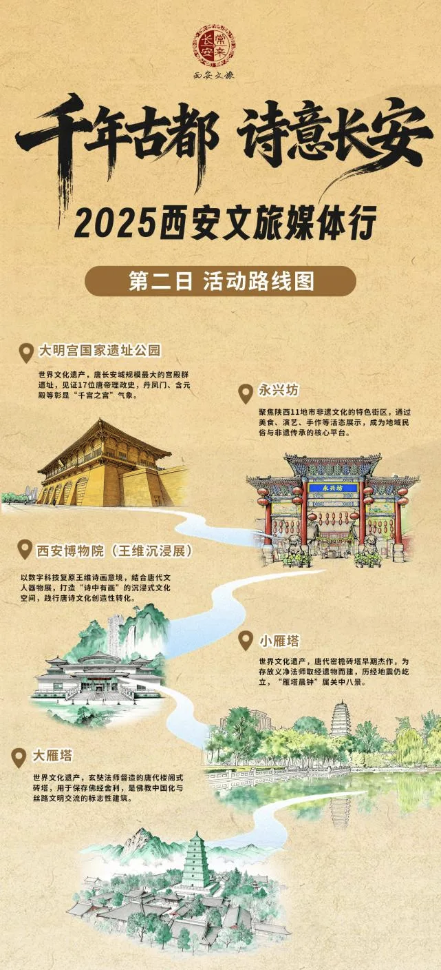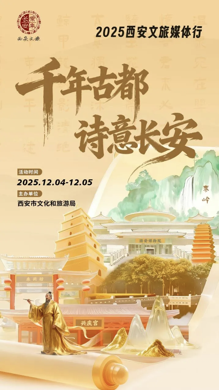 为延续文化热潮、推动文旅融合,让唐诗文化真正融入大众生活,2025年12月4日至5日,西安市文化和旅游局将举行“千年古都 诗意长安”——2025西安文旅媒体行活动。届时,众多中省市主流媒体、网络媒体、文旅专家及达人将齐聚长安,循着唐诗的足迹,走访历史遗迹、沉浸数字展馆、品味非遗美食,生动展现西安文化基因与城市发展的共生共鸣,全景呈现这座十三朝古都古今交融的世界人文之都魅力。