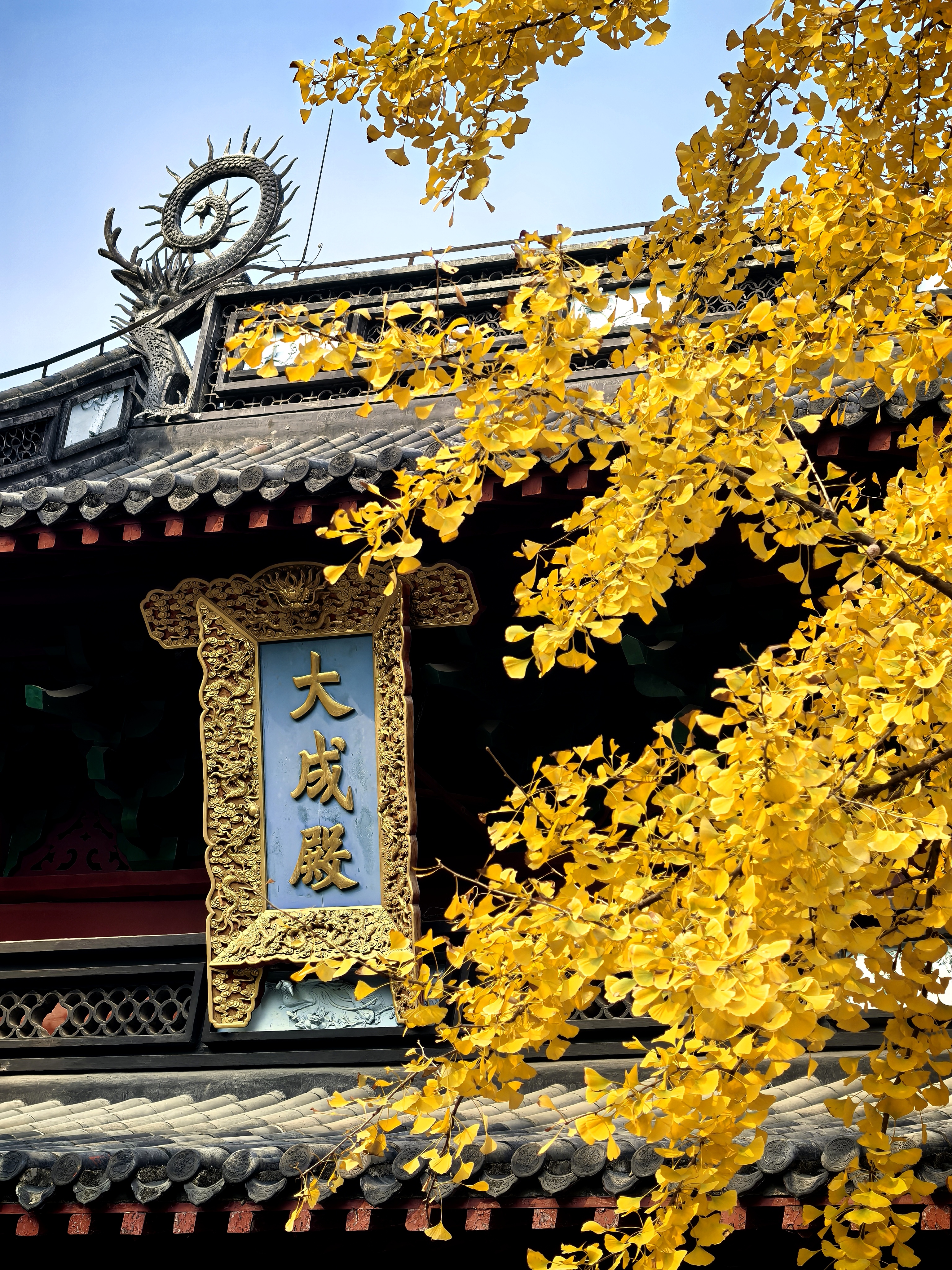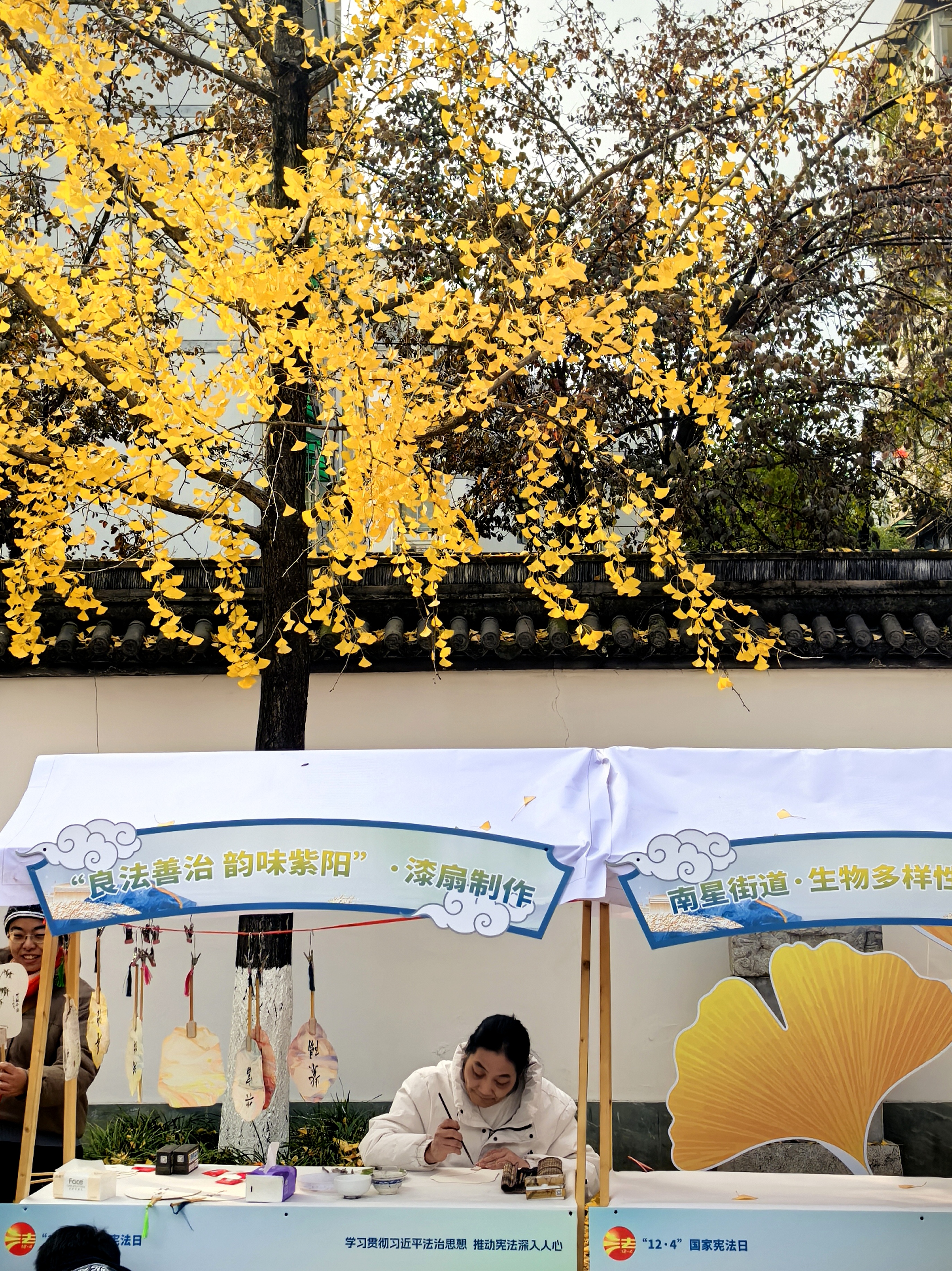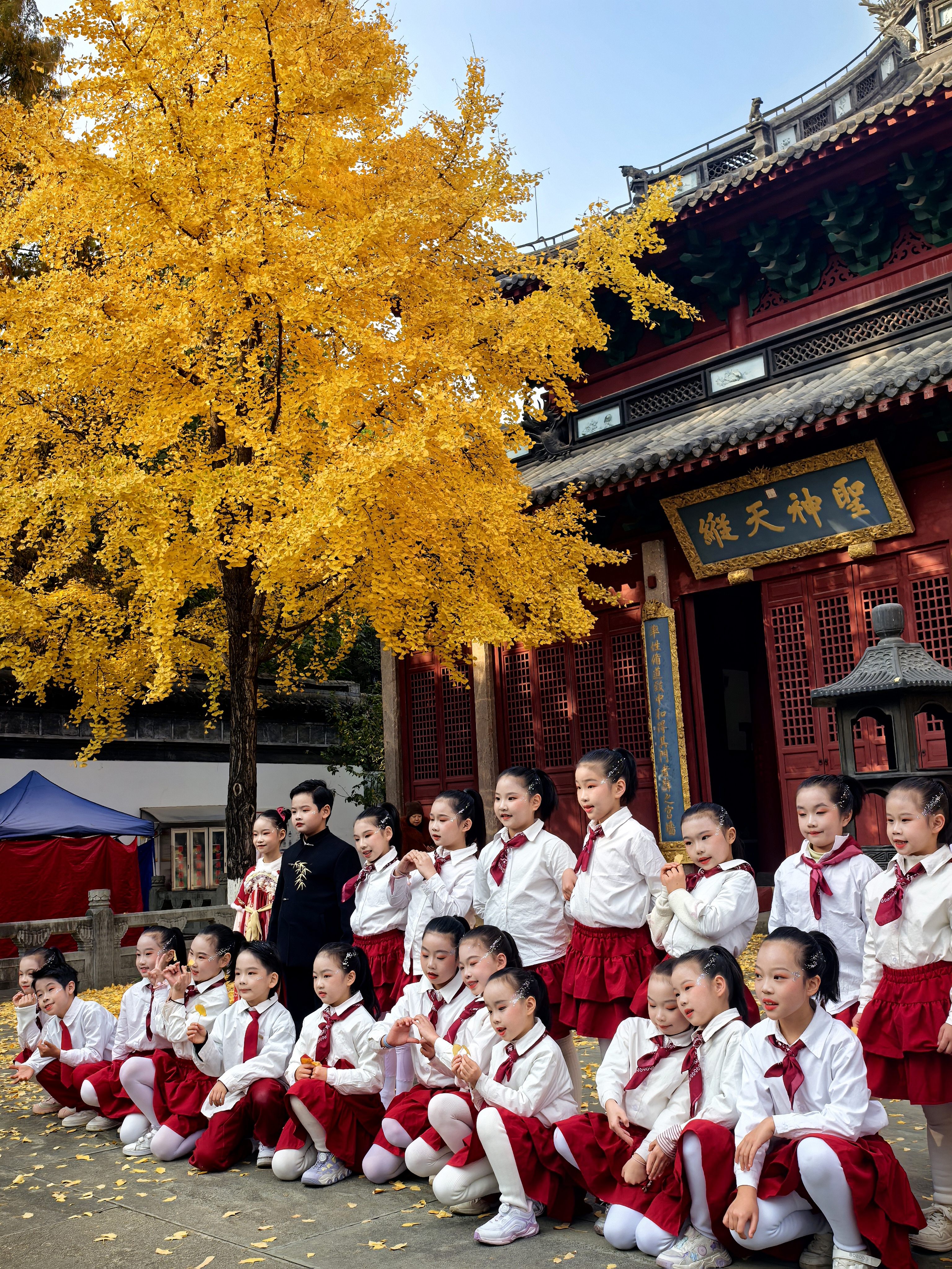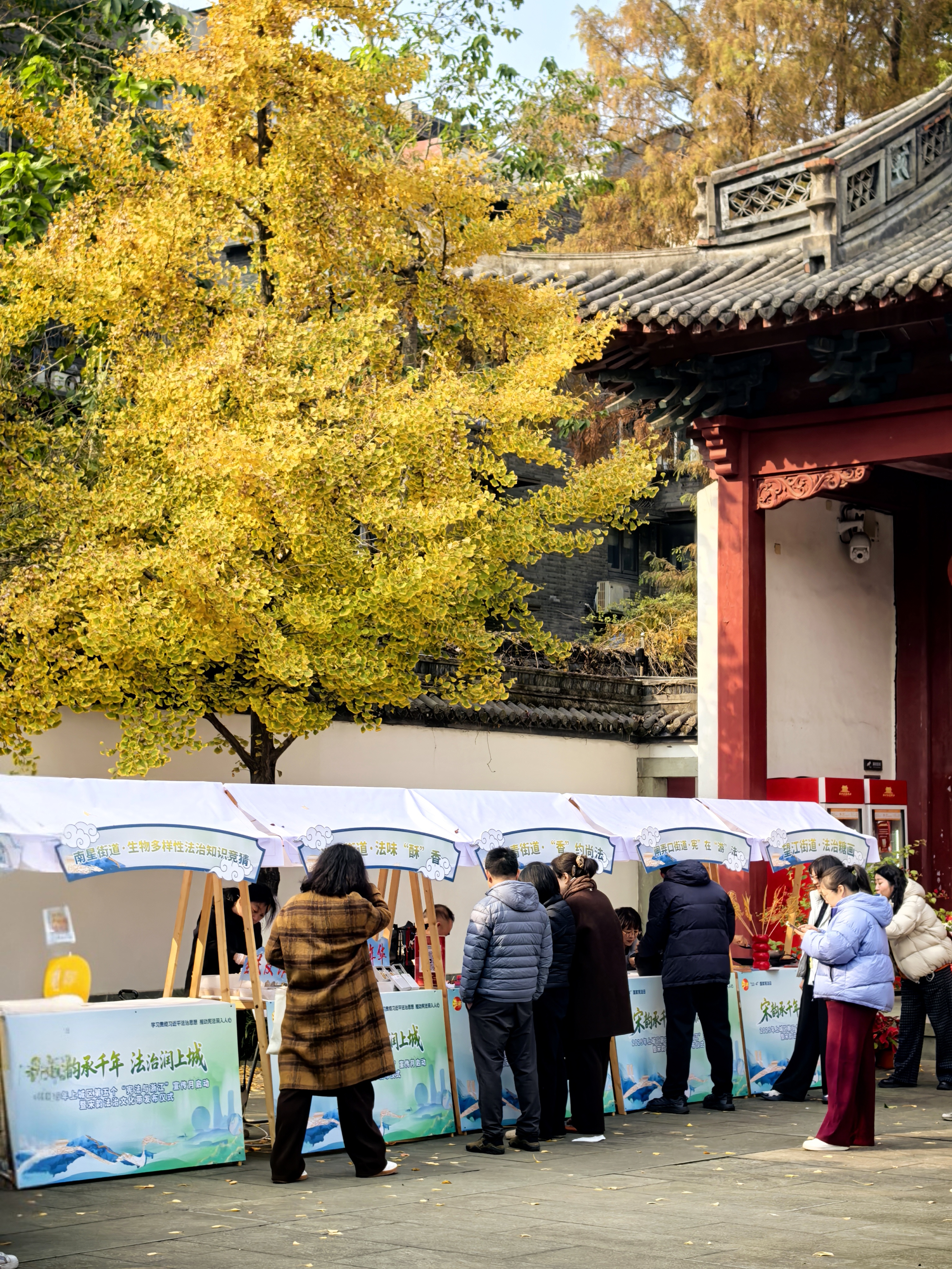 深秋的杭州孔庙,银杏叶如金蝶翩跹,为古学宫披上斑斓华裳。大型司法咨询宣传活动正酣,法律条文与千年文脉在此交融,金叶轻舞间,为庄严的古建添了抹灵动诗意。 石板路上,市民们或驻足咨询,或举镜捕捉叶影婆娑。学子们在叶雨中嬉笑,老者倚廊在碑亭沉思,快门声与低语交织成曲。朱墙黛瓦间,银杏的明黄是时光的笔触,勾勒出杭城独有的风雅。 这里,每片叶子都是历史的书签,每道目光都沉醉于古意盎然。人们寻得的不仅是法律解答,更是心灵栖息的桃源。在最高学宫的怀抱里,秋色与人文共织成永恒的画卷。
