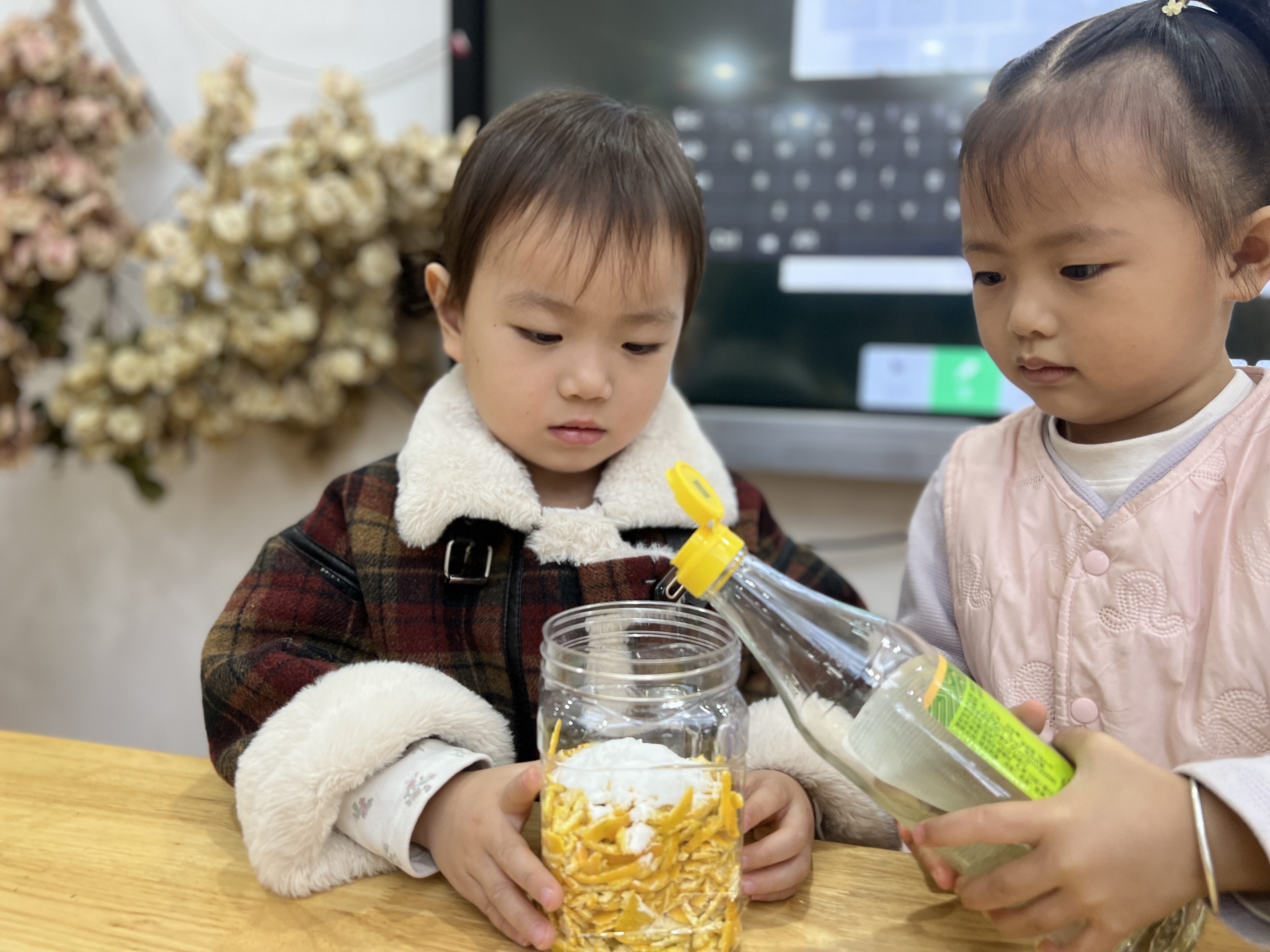 橘子皮大变身,幼儿园里的科学小魔法 近日,兰亭街道阮江幼儿园小班的小朋友们在老师的带领下,开启了一场别开生面的科学探索活动——用橘子皮制作“洗洁精”。 活动现场,孩子们围坐在一起,老师先给大家讲解了橘子皮的特性以及制作“洗洁精”的原理,随后便将准备好的橘子、白醋等材料分发给孩子们。小朋友们迫不及待地动手,小心翼翼地剥下橘子皮,把它们一点点放入玻璃瓶中,接着倒入白醋,拧紧瓶盖,期待着神奇的变化。 通过此次活动,培养孩子们对科学的兴趣,锻炼他们的动手能力,让孩子们在实践中感受科学的魅力,了解生活中常见材料的奇妙用途。此次用橘子皮制作“洗洁精”的活动,不仅为孩子们的幼儿园生活增添了乐趣,更在他们小小的心中种下了科学探索的种子,相信在未来,这些种子将生根发芽,引领他们探索更多未知的精彩。