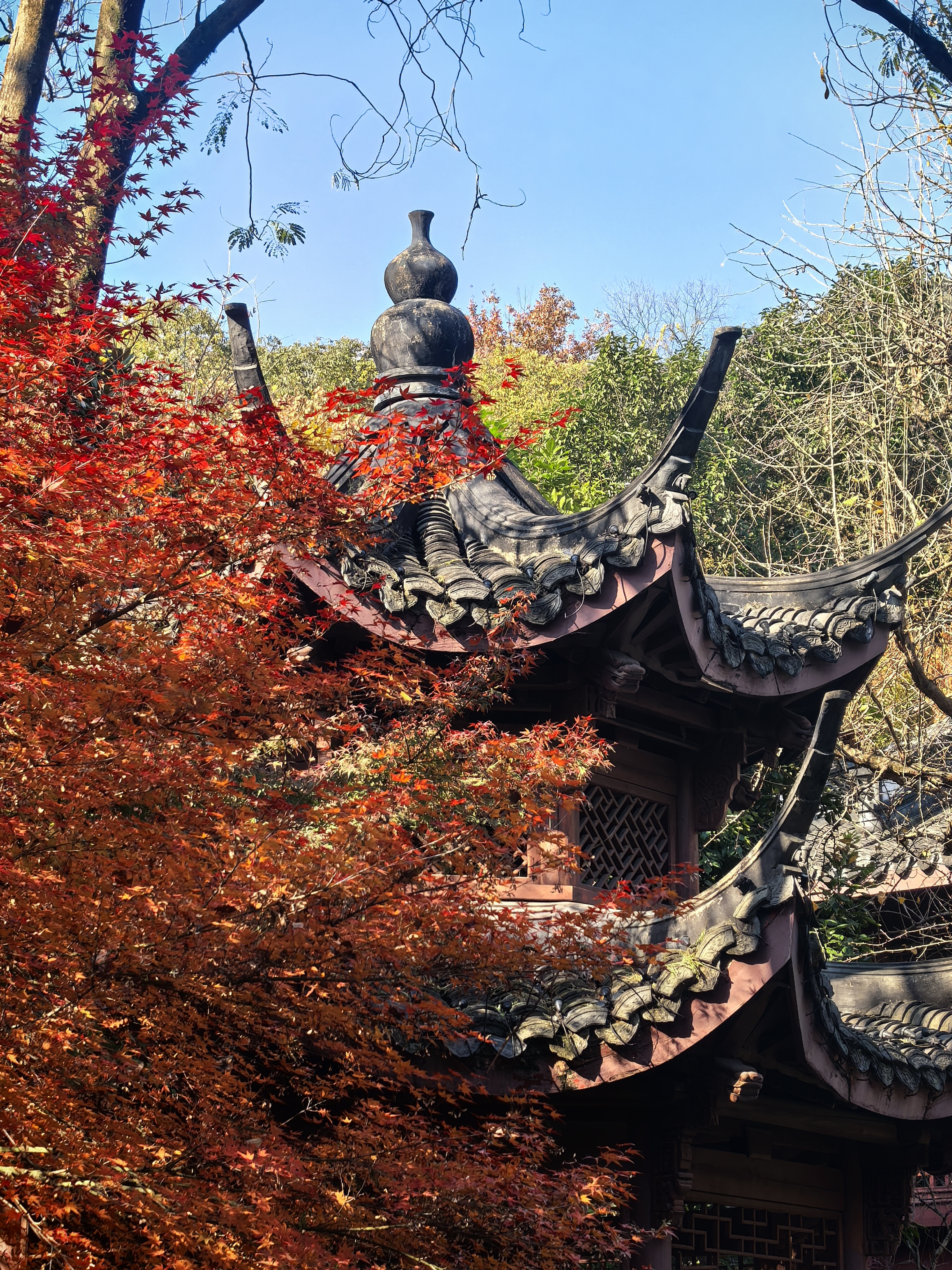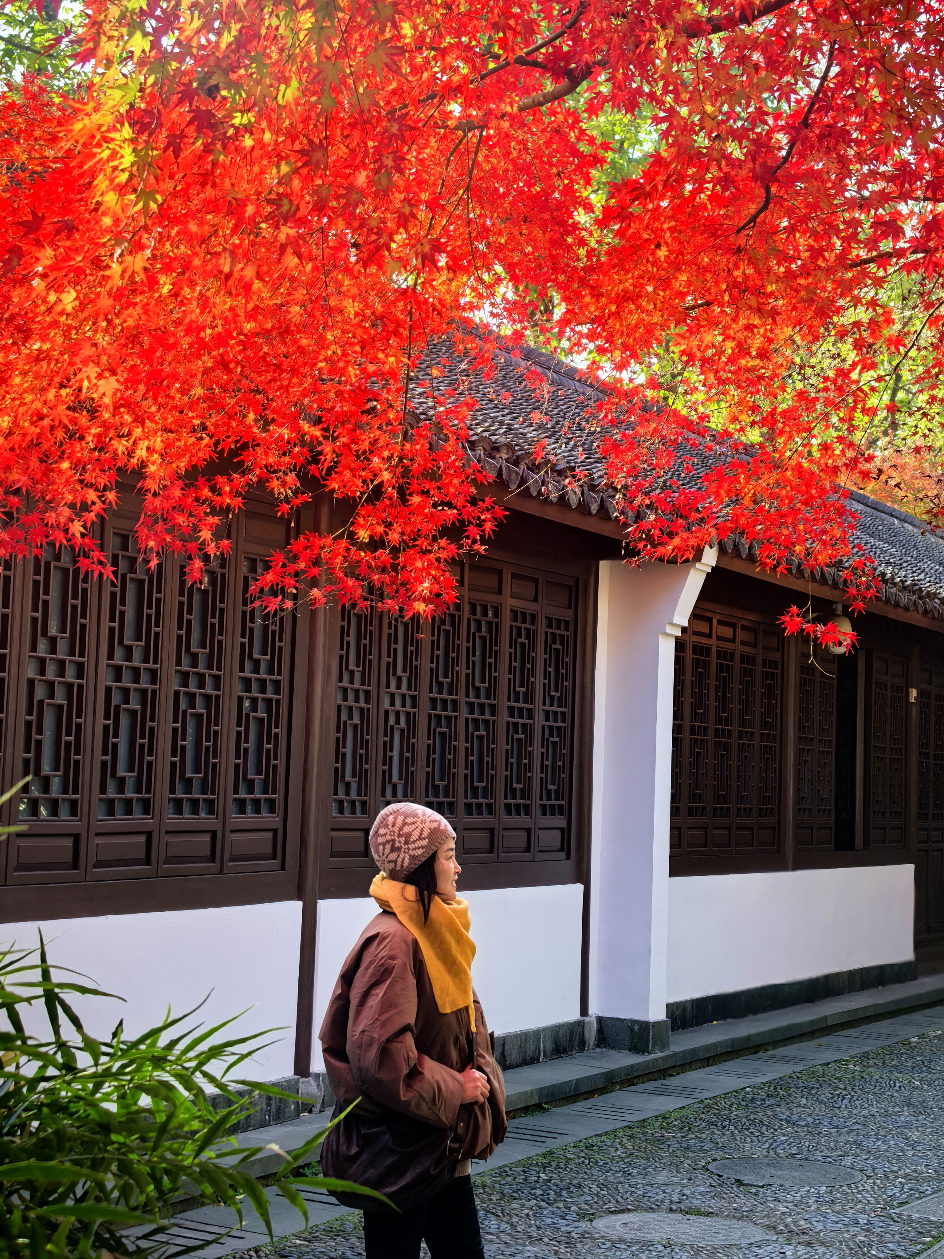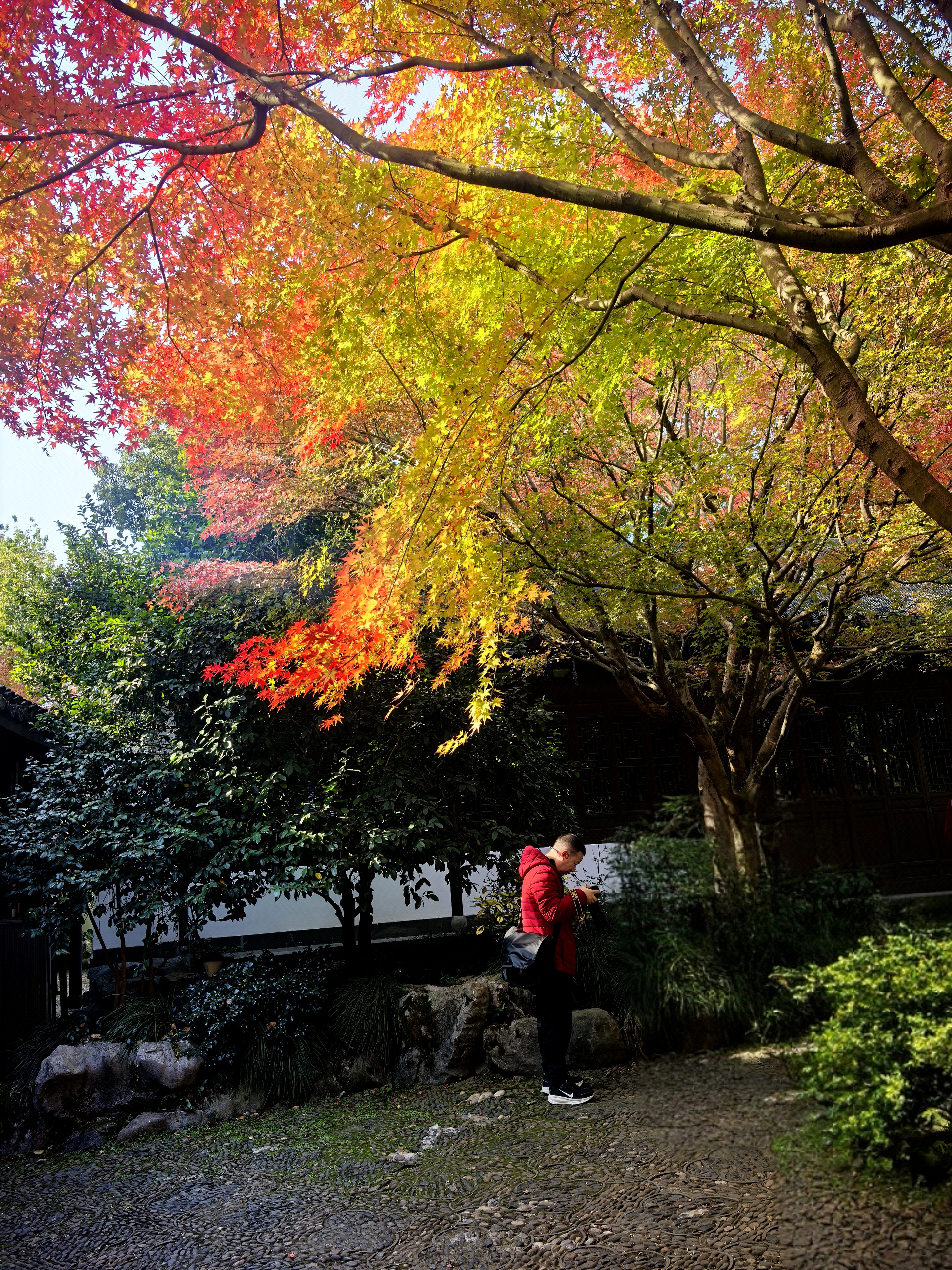 杭城北山街的玛瑙寺,宛如一位低调的隐者,深藏不露在车水马龙的北山街畔,却总在特定时节惊艳众人。春日樱花烂漫,它以柔美之姿撩动人心;而今枫叶季,又以热烈姿态燃遍每个角落。 清晨,阳光初照,市民们便陆续赴约而来。只为那三五株鸡爪槭,它们大隐没在小院里,却红得肆意张扬,红透了黛瓦,映红了小池亭台,似是大自然精心绘就的画卷。 站在这热烈的枫树下,微风拂过,枫叶沙沙作响,仿佛在轻声诉说着岁月的故事。人们纷纷举起相机,定格自己在这绚烂秋色中一脸灿烂的模样,让这份美好,在时光里永恒留存。