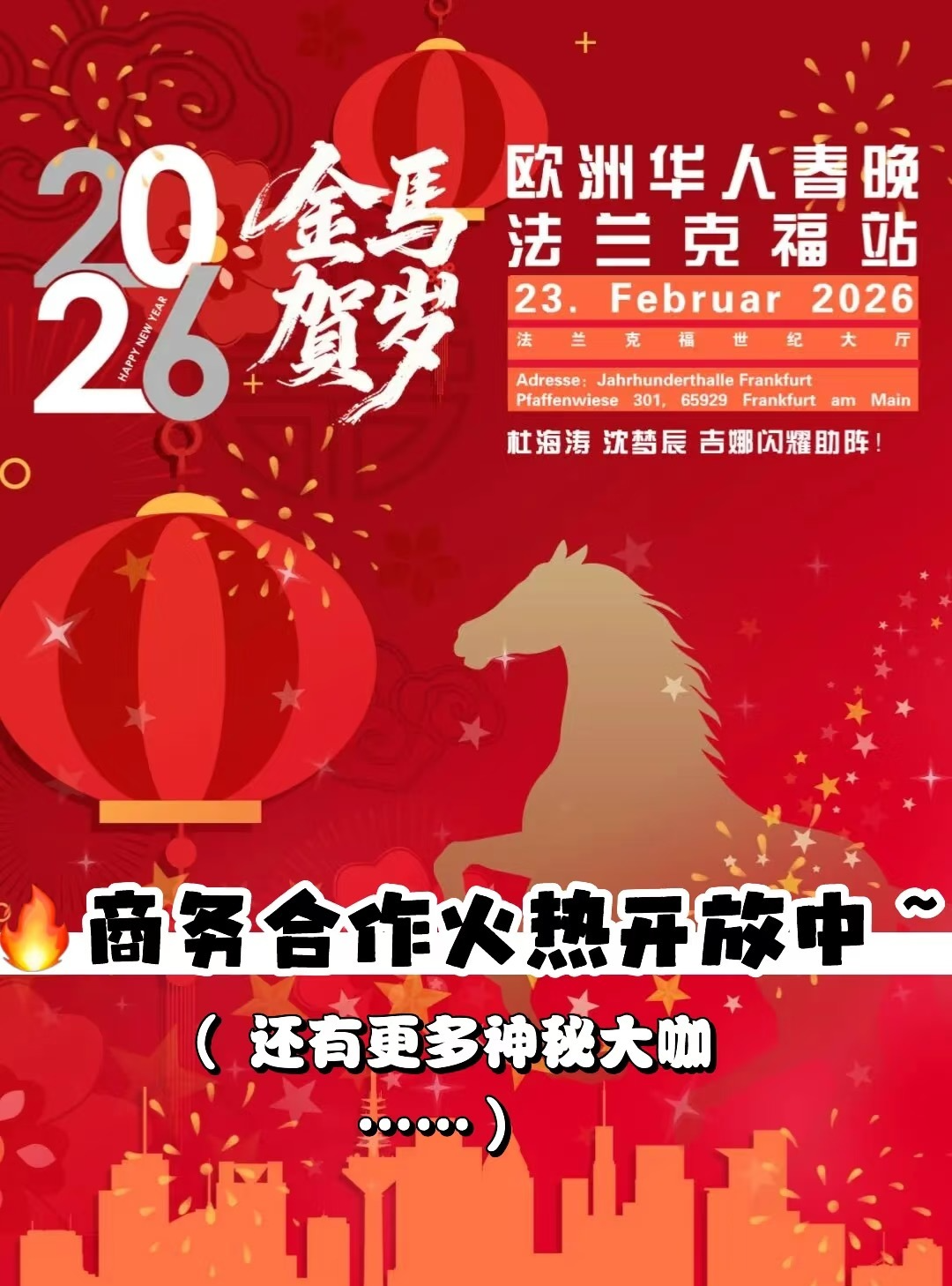 杜海涛×沈梦辰×吉娜要来德国过年了!?!? 2026欧洲华人春晚官宣!在欧洲也能看大型春晚现场! 2026年2月23日,欧洲华人春晚·法兰克福站将在世纪大厅Festhalle开演 明星阵容:杜海涛、沈梦辰、吉娜确认!还有神秘嘉宾等陆续官宣~ 节目超丰富:舞蹈、器乐、声乐,传统×现代,现场年味直接拉满! 顶级舞台:在承办世界级巡演的世纪大厅看春晚=沉浸式震撼! 在欧洲,也要过得有年味! 无论留学、工作还是定居欧洲,这一夜一起团圆、一起嗨!