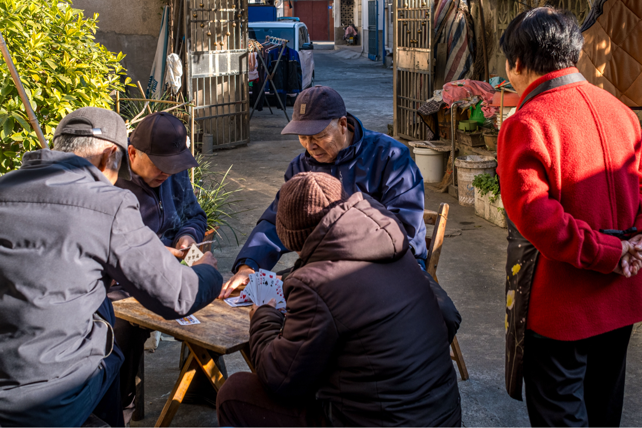《暖暖的阳光下》冬日巷口,老哥们围坐木桌,红外套裹着笑声,牌局正酣。阳光斜照,影子拉得老长,这牌桌上的江湖,比暖阳还热闹。