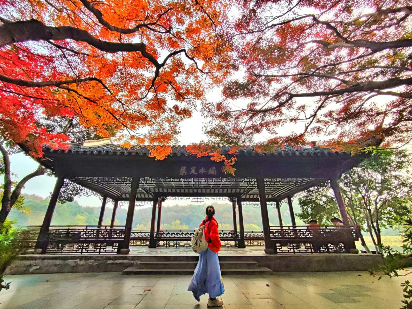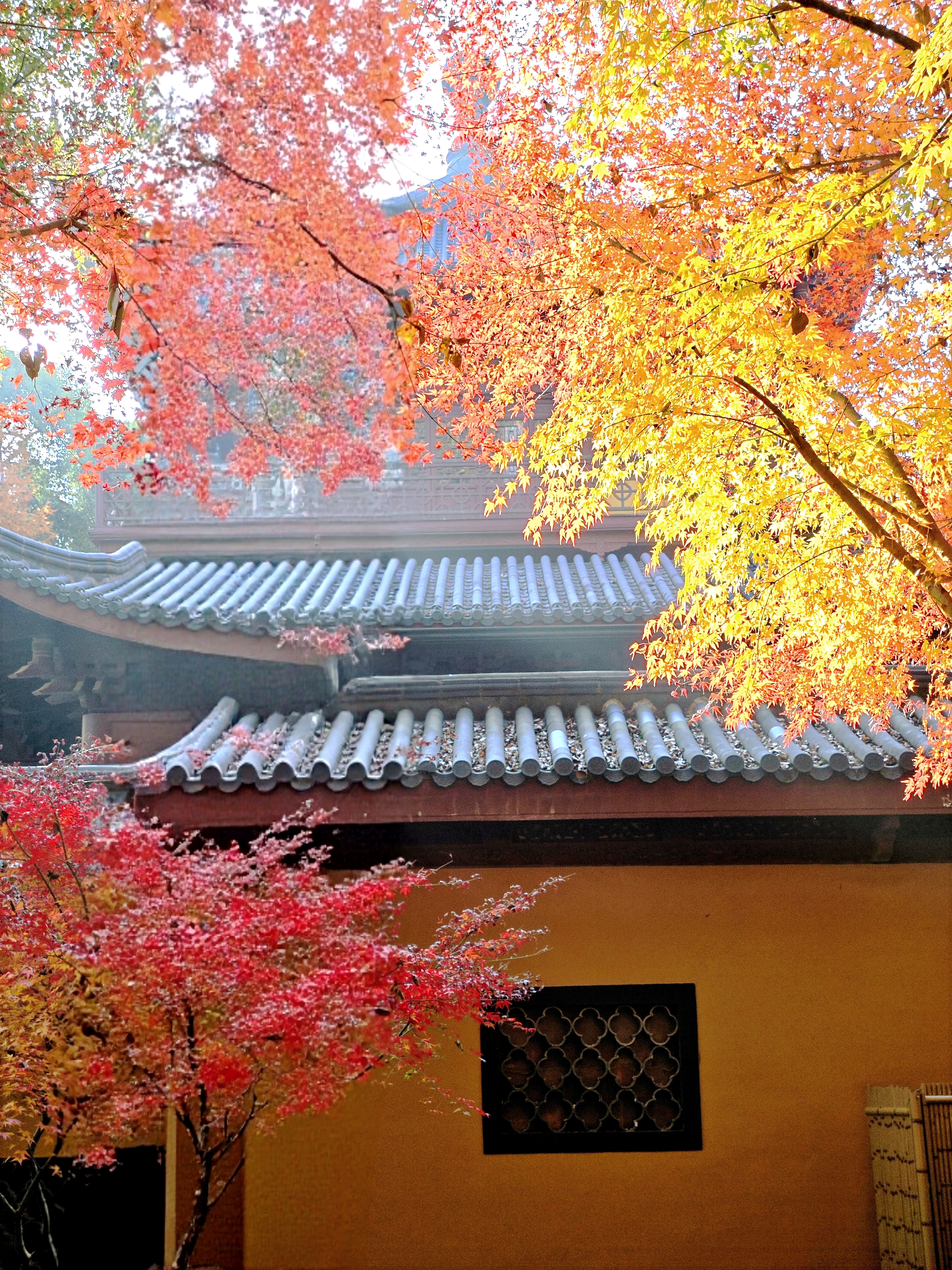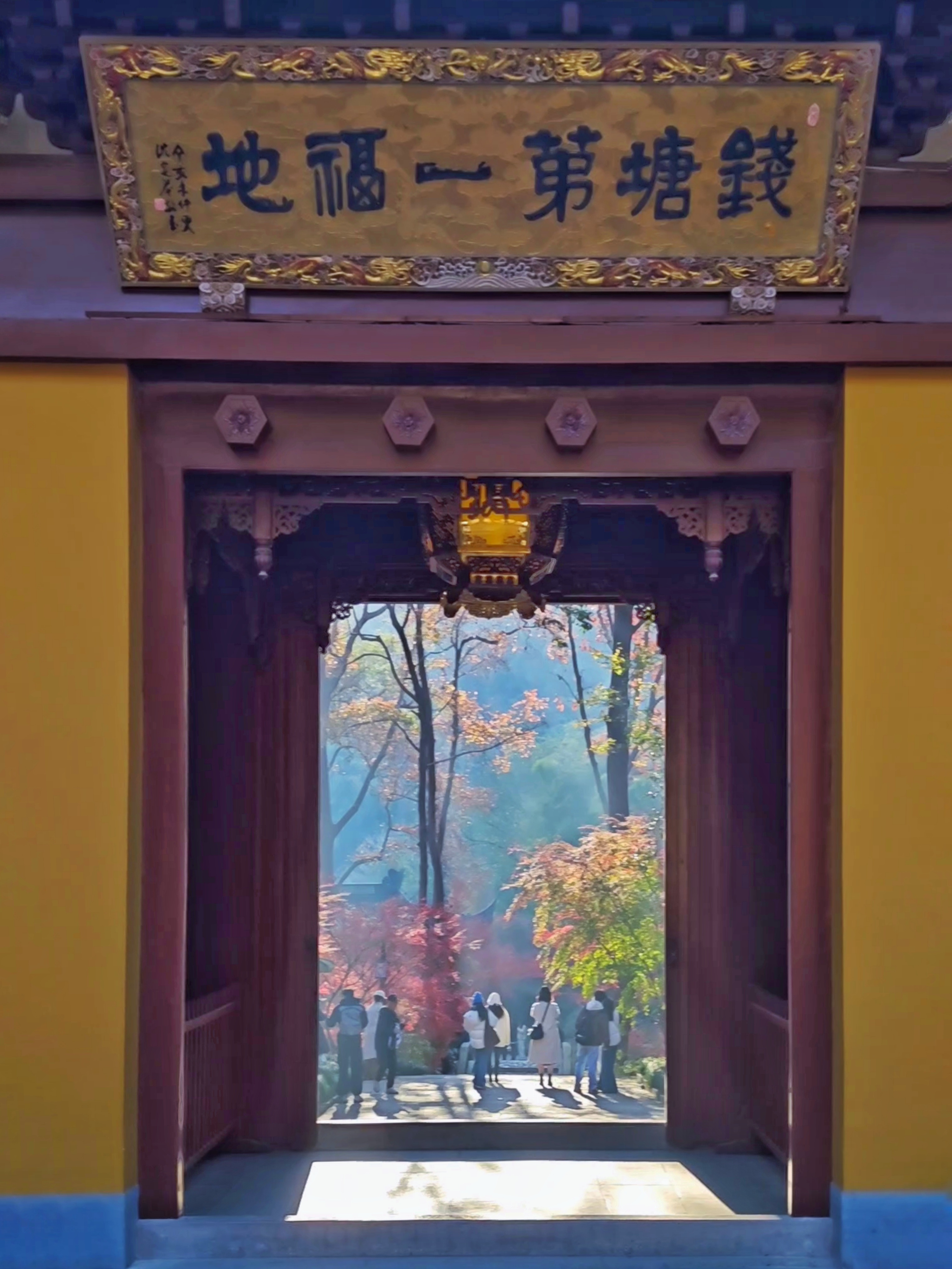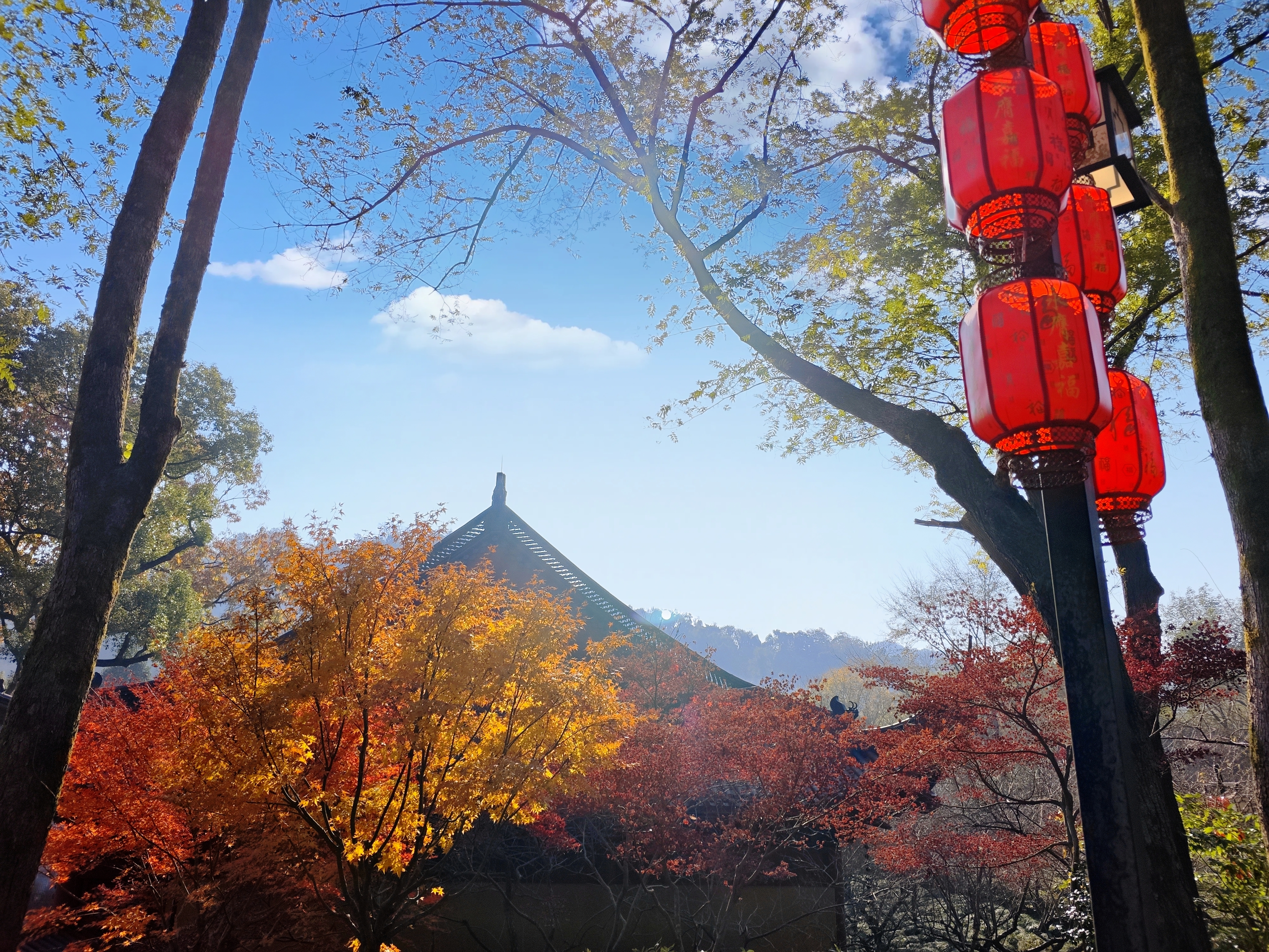 西湖秋深,灵隐禅寂。银杏拂金,枫叶染丹。飞檐映碧水,古塔立斜阳。石桥步影,竹径通幽,一猫卧于红叶间,尽得秋光与静谧。