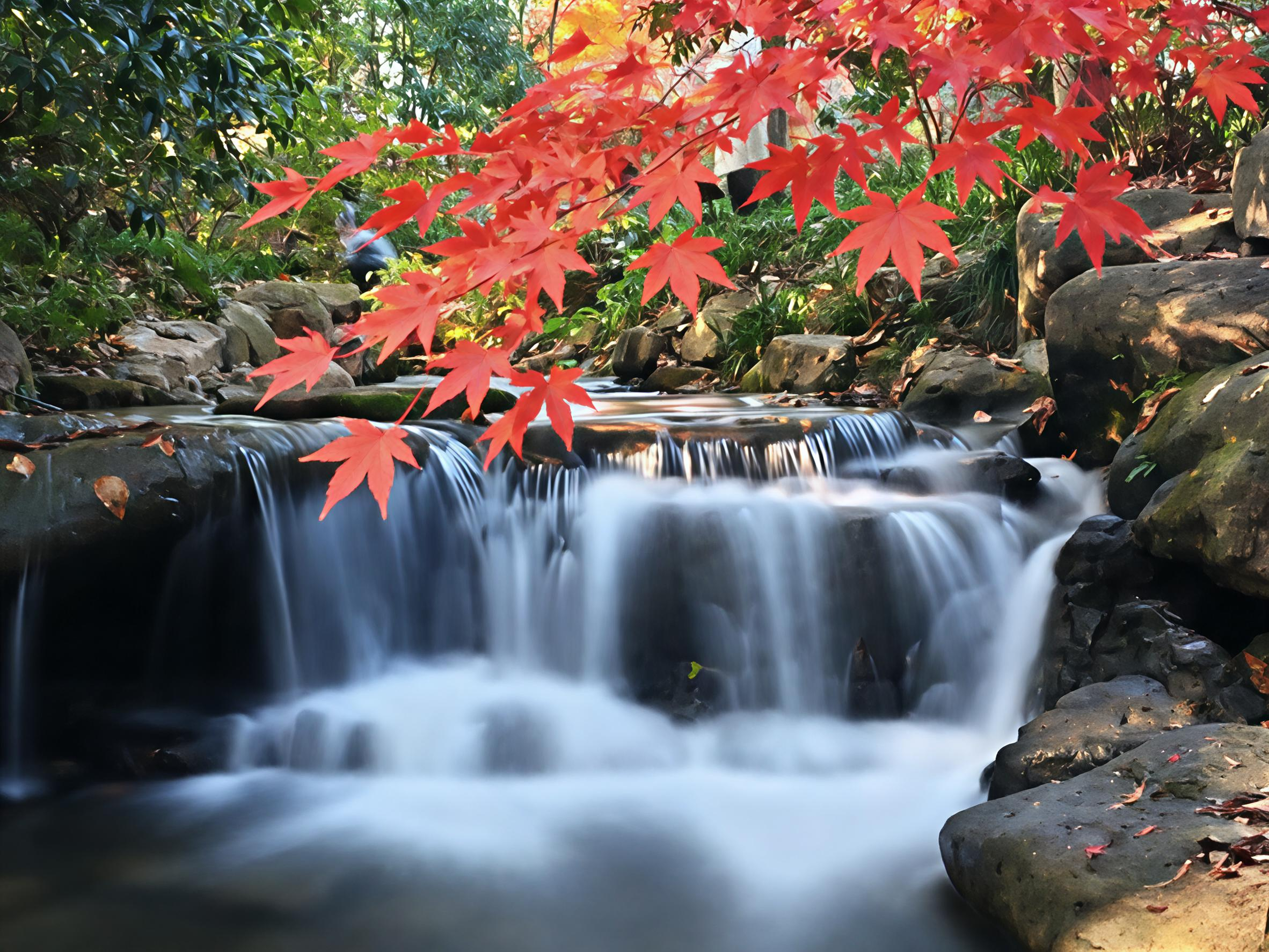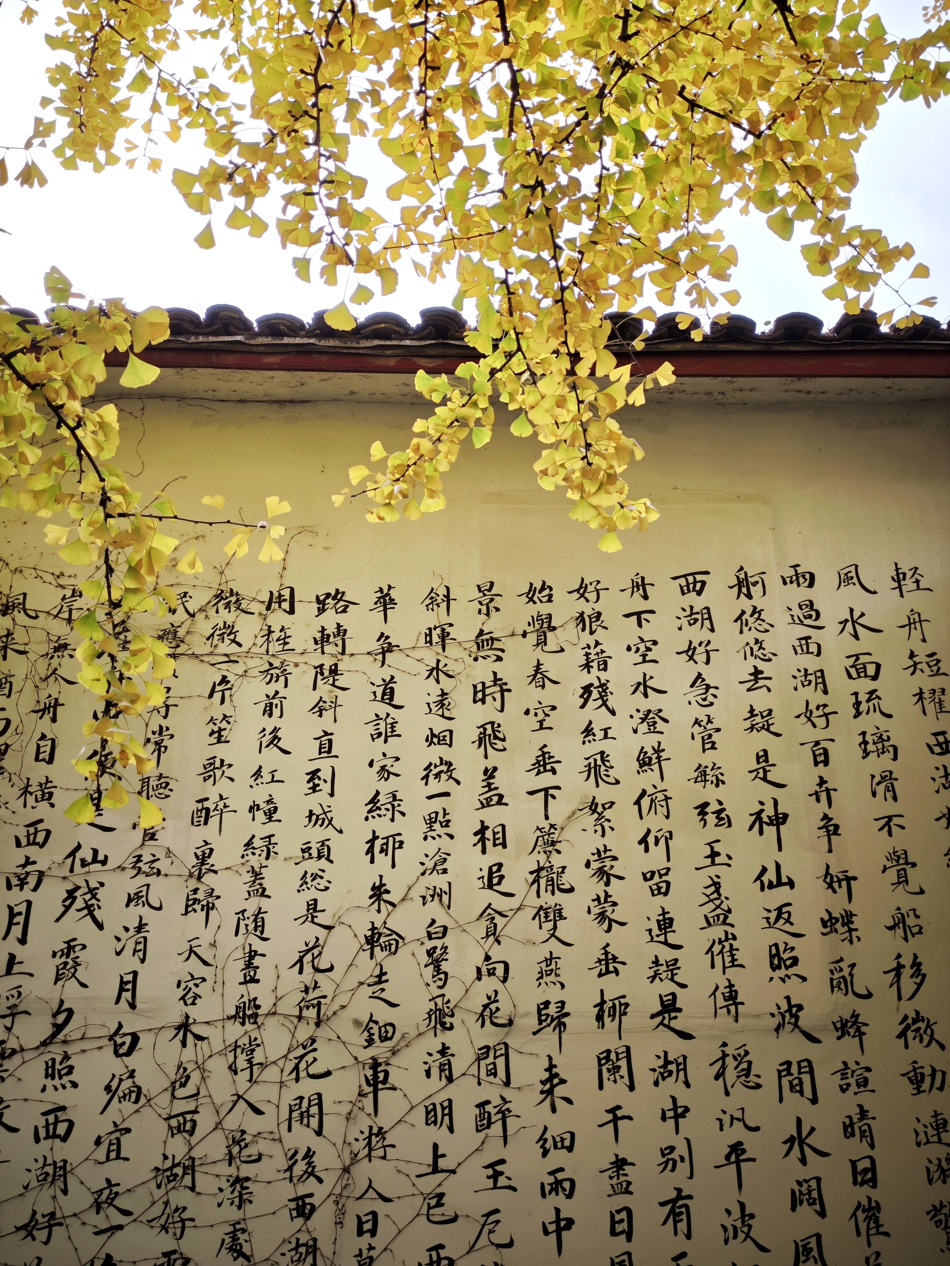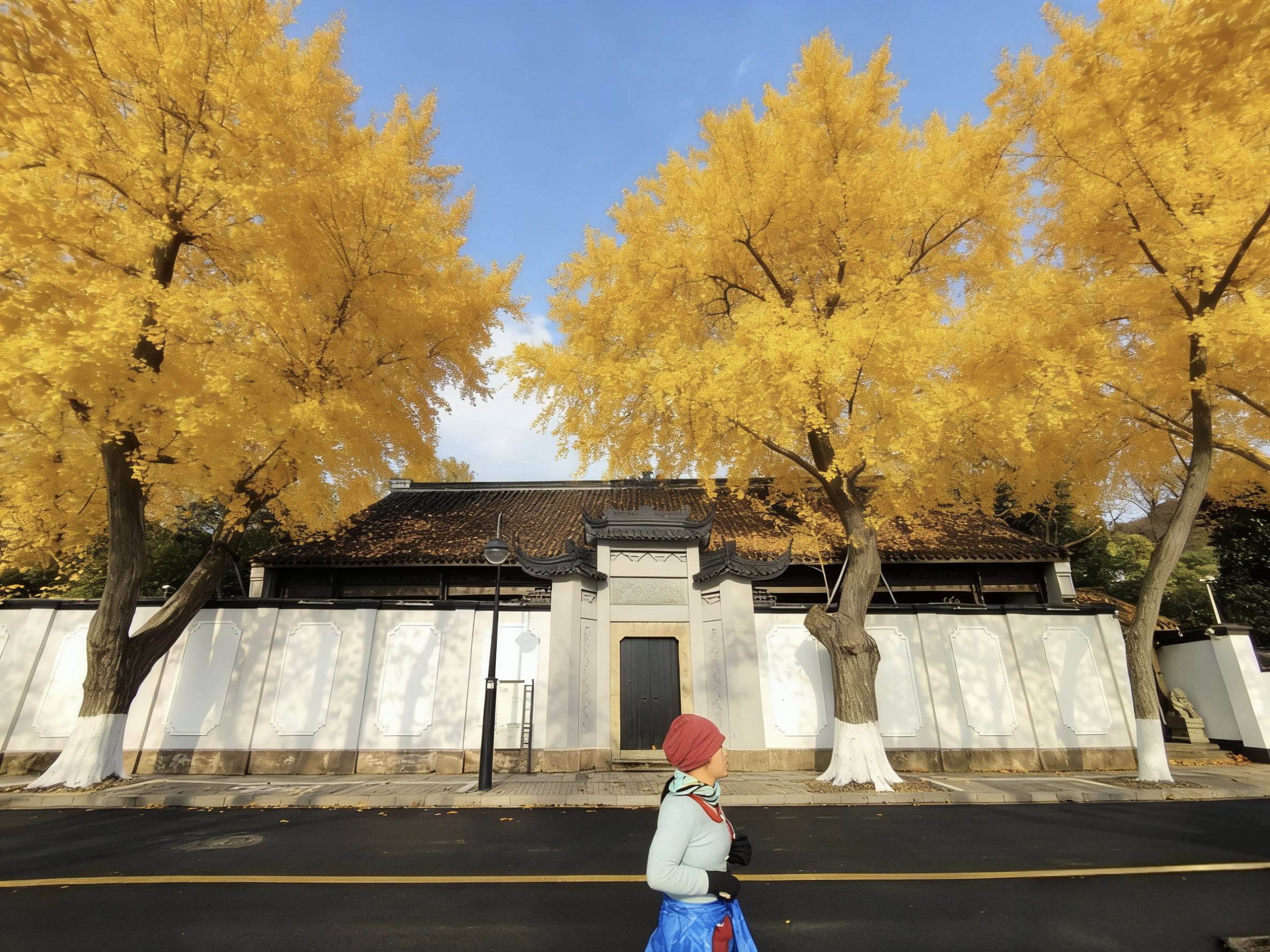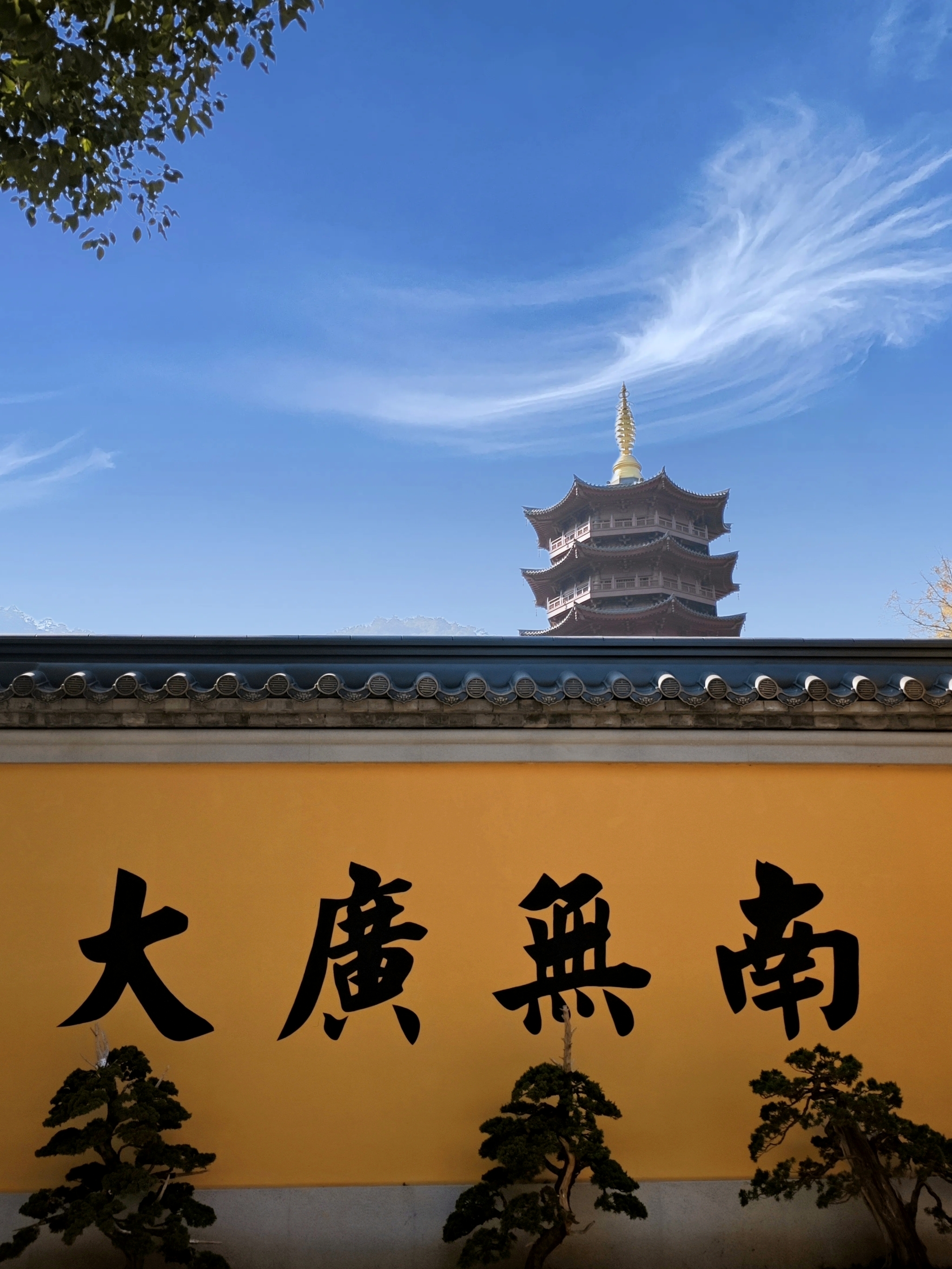西湖秋深,灵隐禅寂。银杏拂金,枫叶染丹。飞檐映碧水,古塔立斜阳。石桥步影,竹径通幽,一猫卧于红叶间,尽得秋光与静谧。