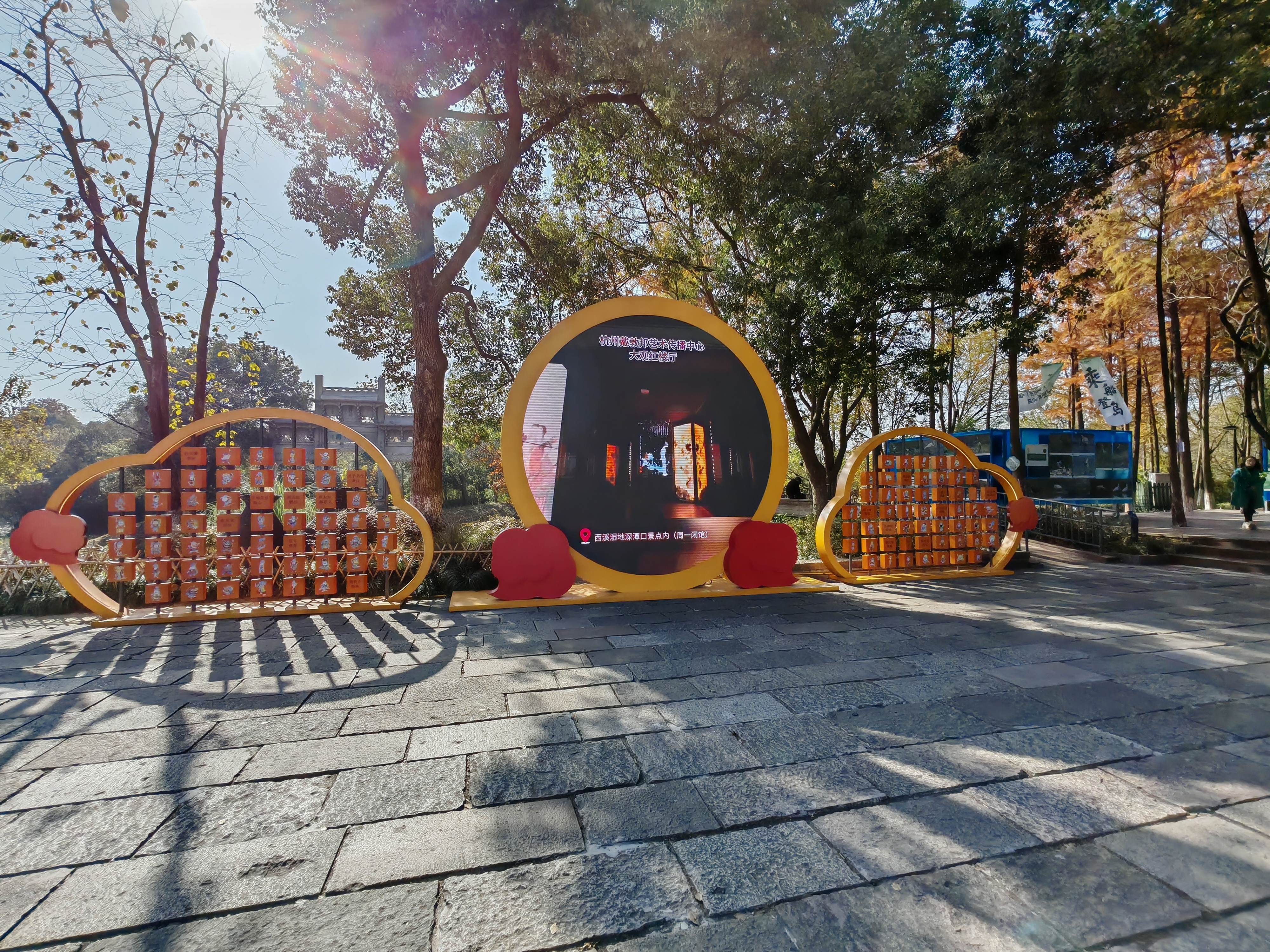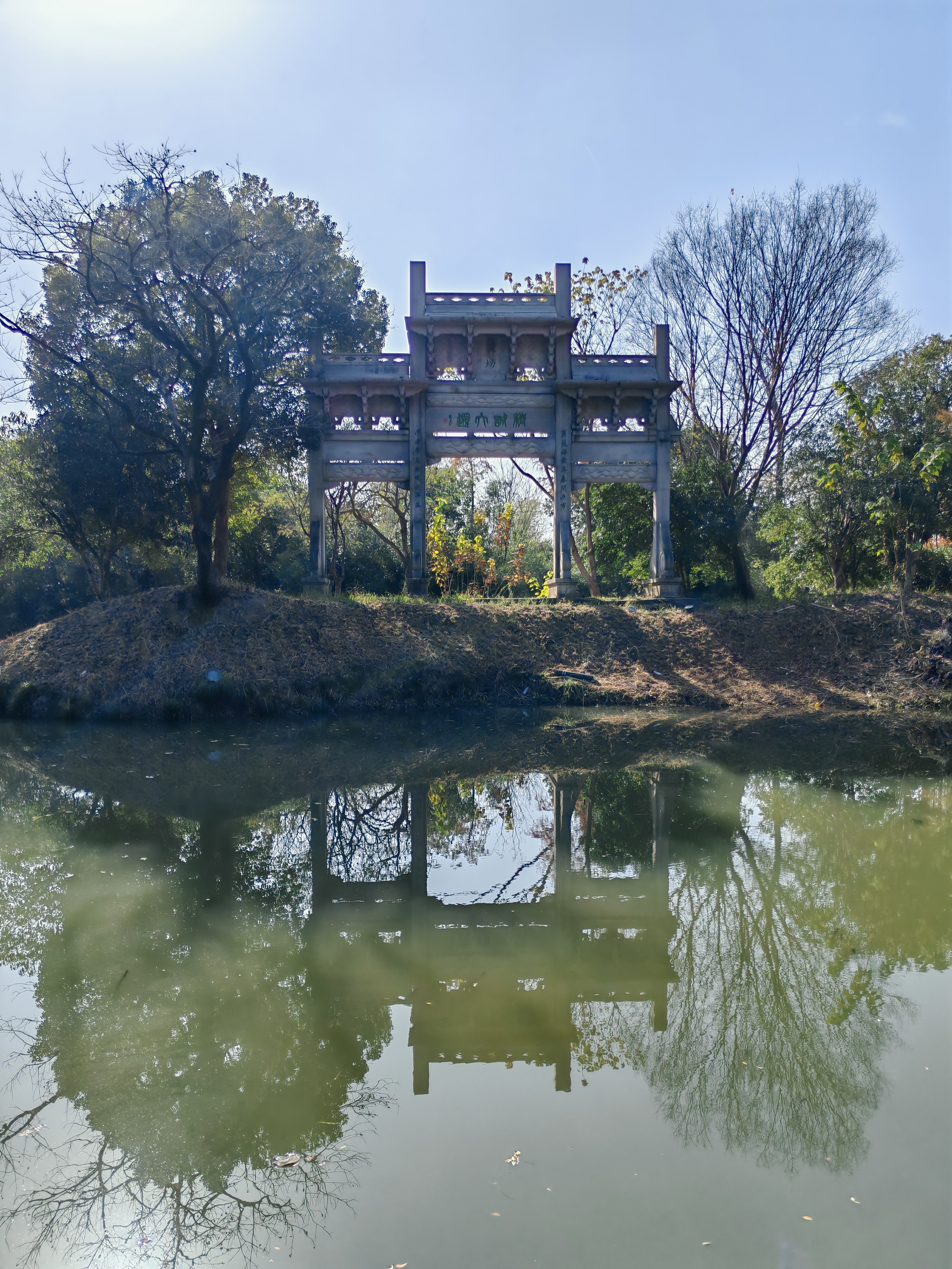 秋日的西溪湿地,阳光轻洒在古老的石牌坊上,倒影如画。芦苇摇曳,红叶与金枝共舞,果实缀满柚子树。深潭口畔,现代艺术装置与千年古韵低语,云形装饰下,自然与人文交织成诗。