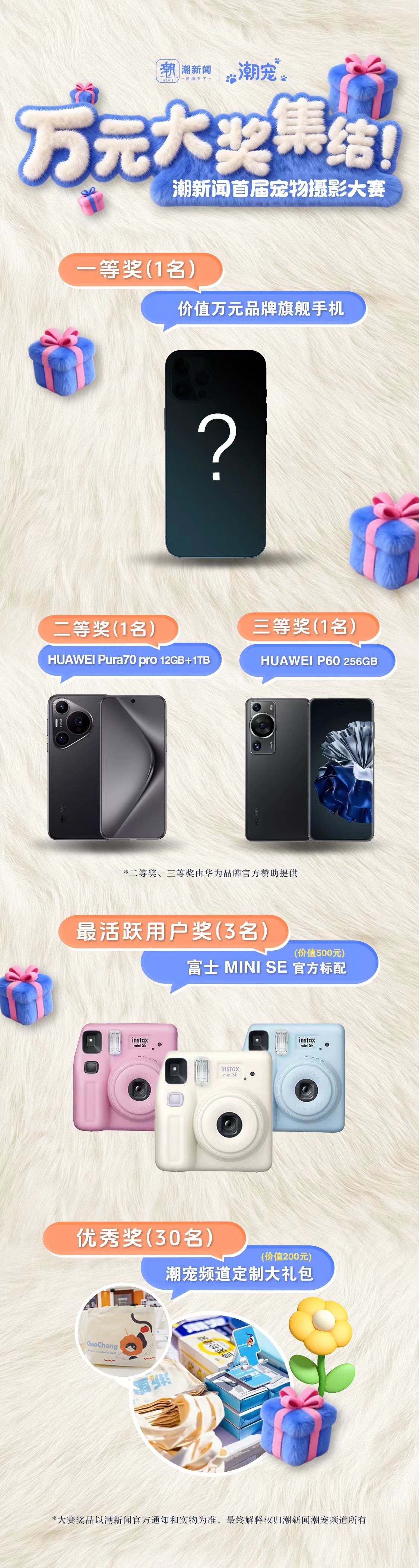 赢万元手机大奖!潮新闻首届宠物摄影大赛正式开启! 福利抢先看👀 万元大奖等你来! 参与拍照,让你家毛孩子的“靓照”C位出圈吧~ 比赛时间:2025年12月10日20:00——2026年1月9日12:00