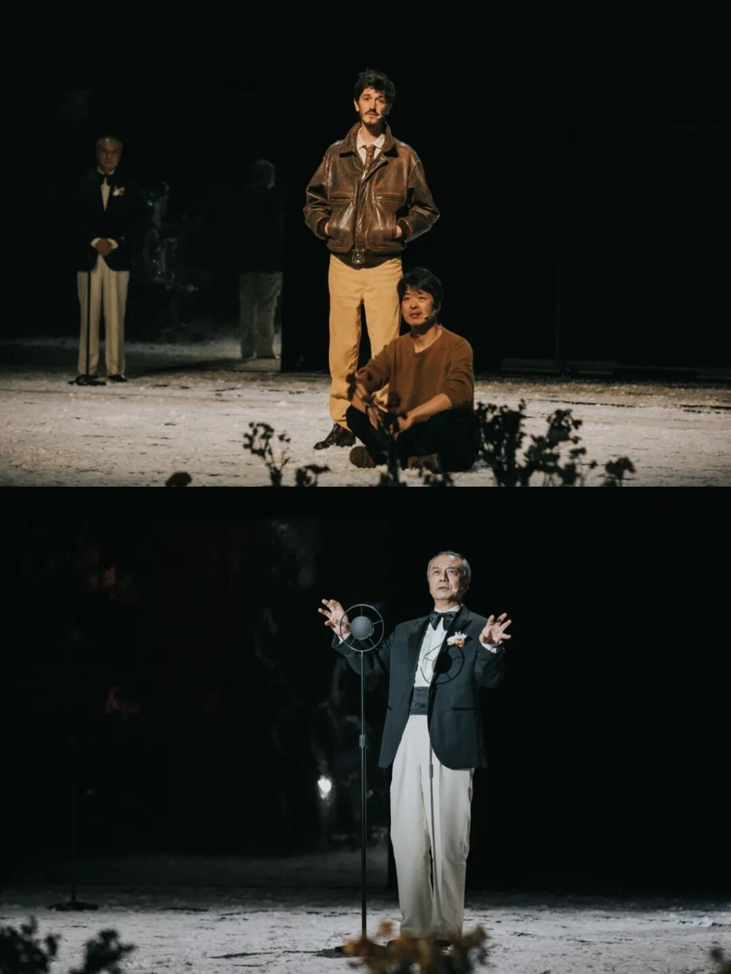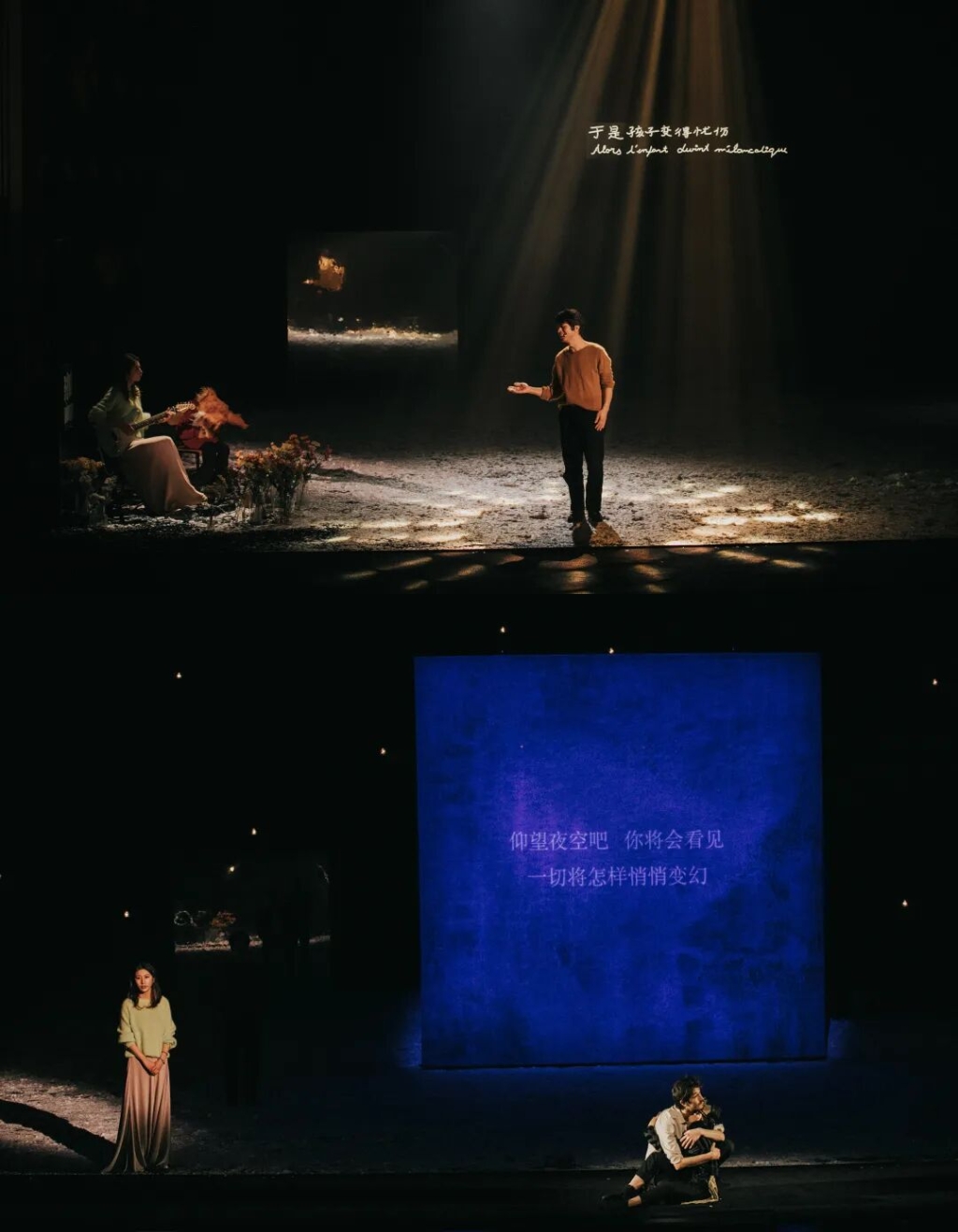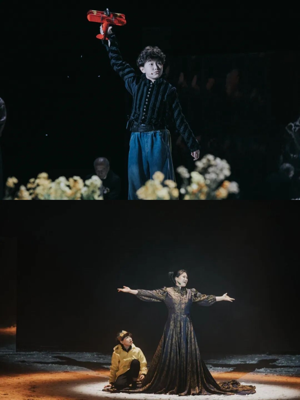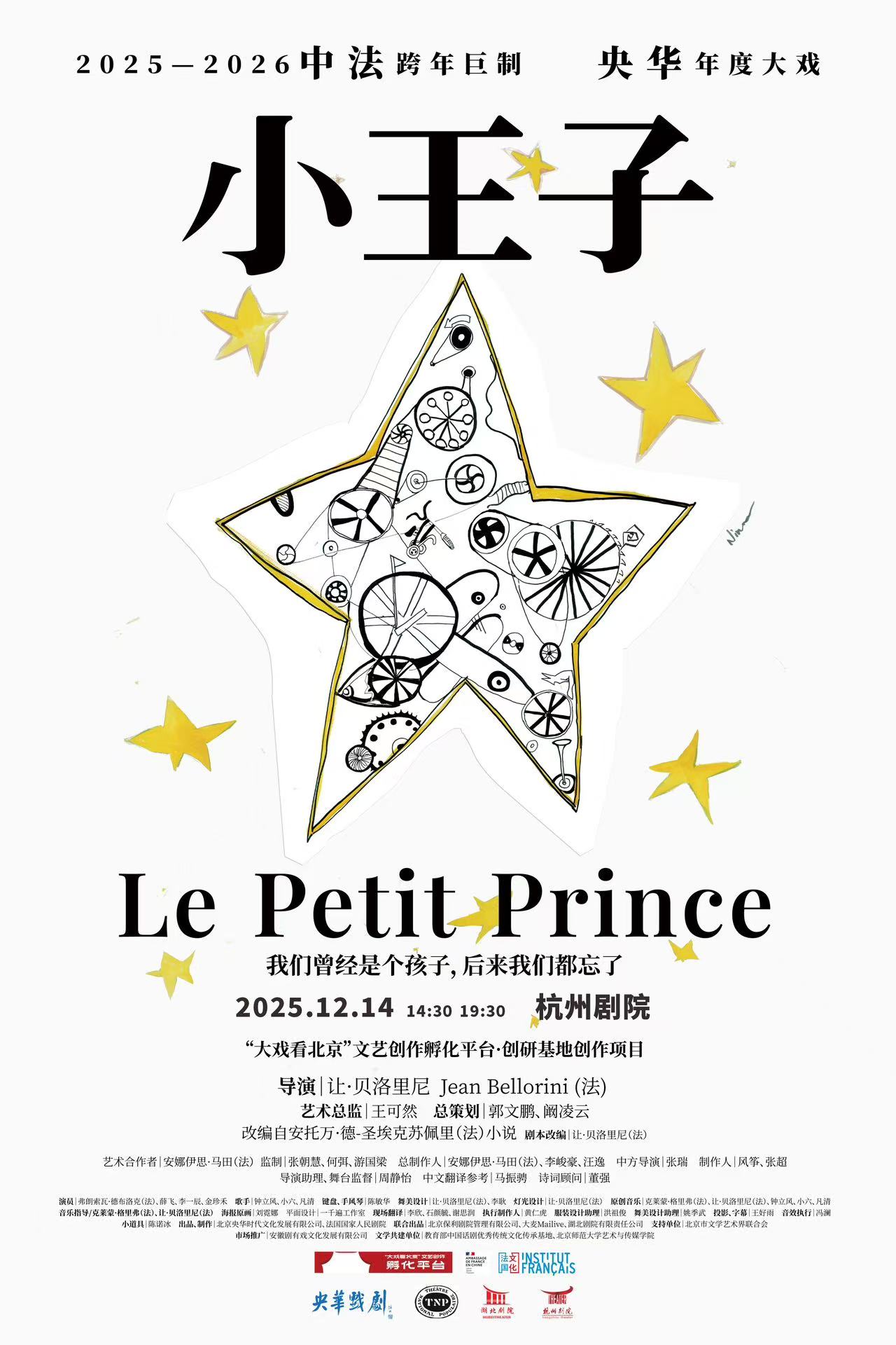 这一年,辛苦了,让我们用央华版音乐剧 《小王子》 ,告慰一年的慌张与疲乏。 这是一部深刻的成人寓言,是一种重新看待生命的方式,是一个审视时间与爱的生命剧场。 让我们一起把迷失的星星,放回心里。 同名小说《小王子》是享誉全球的文学瑰宝, 诞生于 1942 年。圣 · 埃克苏佩流亡美国, 在战火、 流亡、 孤独的现实中创作了这个穿越时空的隐喻。 自《悲惨世界》后,这是央华戏剧与法国国人民剧院再次携手,深度共创。 法国国家人民剧院院长让 · 贝洛里尼亲自执导,刘烨的女儿霓娜与安娜伊思创作主题海报。来自B612星球的小王子,由 13 岁的李一辰扮演,弗朗索瓦 · 德布洛克饰演飞行员。 音乐戏剧《小王子》不是讲故事 ,而是用音乐和身体共同呼吸出故事。创作团队还邀请了三位中国音乐人共同参与,“民谣诗人”钟立风、长于即兴创作的小六、凡清。 本剧新增一个5岁的小小王子,一个游历四方的诗人。诗人象征着成年人的视角, 同时承担着文化、 时间和情感上的第三条叙述线。导演强调: “ 我的 《小王子》 绝非天真, 他的洞察力会修补你, 也会撕裂你。 ” 剧中引用多首中法诗歌,以及作者圣埃克苏佩里写给爱人的信。 比如《春江花月夜》的诗句用在了小王子看四十四次日落 中; “ 十年生死两茫茫 ”用在了小王子的思念中。 匠心独具的舞美+诗歌的介入,使作品摆脱叙事剧的结构, 进入“哲学性舞台诗”的建构体系。这使得观众既看到小王子的奇遇,也看到诗人的深层解读。 《小王子》是一部写给成年人的哲学童话,献给每一个曾经是孩子的大人。 所有童话都流淌着鲜血。 《小王子》 的温柔不是缺少痛感, 而是以儿童的语言讲述成年人最深的伤口:被遗忘的自我、 失去的好奇、 不再相信的关系、 需要修补的人性裂缝。 央华版《小王子》没有回避原著中的沉重命题。它正面呈现生命的有限性、爱的责任、离别的必然、孤独的不可避免、欲望世界的荒诞、 关系中的痛与温柔。 例如小王子给飞行员的告别礼物是星光,是继续陪伴的念想,“ 当你仰望星空, 你会看到所有星星都在微笑。 ” 这段温柔的呈现,消解了死亡的感伤。 央华版拒绝技术奇观, 强调在场。回到剧场的本质, 用人来构建戏剧,穿透成年人的疲惫、 失望与麻木。 小王子提醒我们曾经拥有的一切,并未真正消失。只有人的眼睛,能看见真正重要的东西。 央华版既是对经典的重新解读, 也是对剧场艺术的追问:我们在舞台上追寻的是什么?是故事?还是我们曾经遗失又正在寻找的自己?