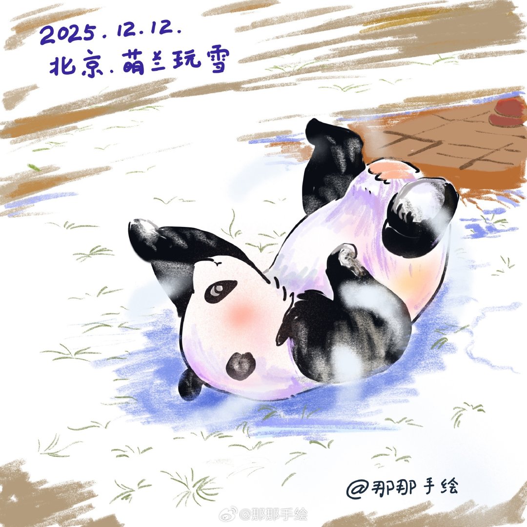 萌兰滚成了糖霜小熊。昨北京下雪啦,看到么么儿开心的在雪地里打滚的样子我也开心,看得出它超爱雪的,画一幅它在雪地里打滚的样子[太开心]大熊猫雪来疯