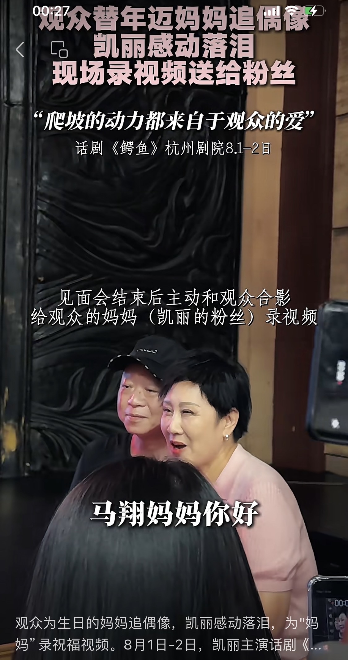 2025独家记忆故事太多了,这张照片是为参加话剧《鳄鱼》杭州观众见面会上,恰巧那天我妈妈生日,在见面会上我和凯丽老师说:“我80岁的母亲是你电视剧《渴望》塑造“慧芳”这一角色记忆犹新”。凯丽老师感动了,结束见面会为我妈妈录了生日祝福的视频。我当时特别感动,也是我2025年独家记忆中最难忘的记忆故事。