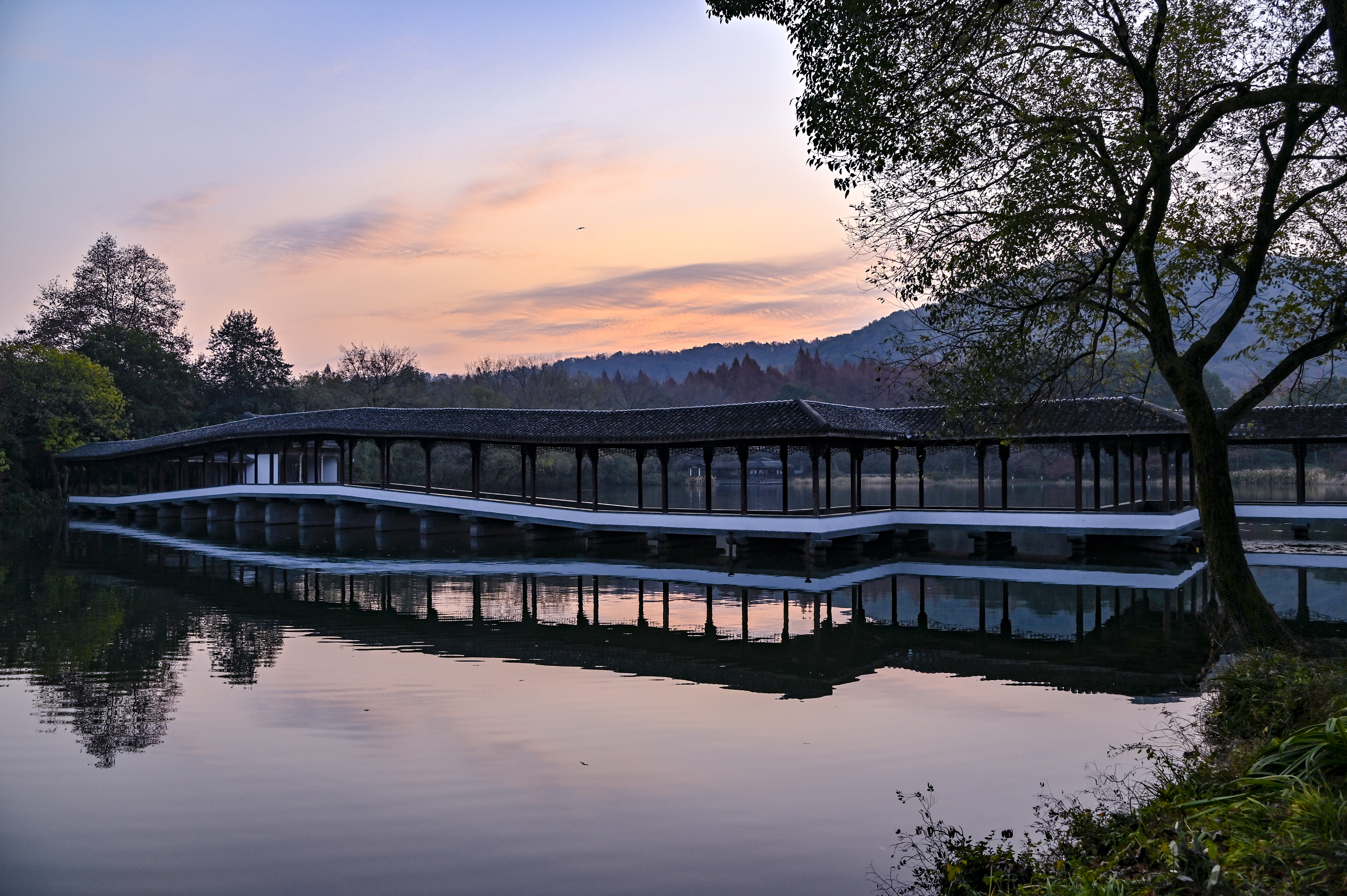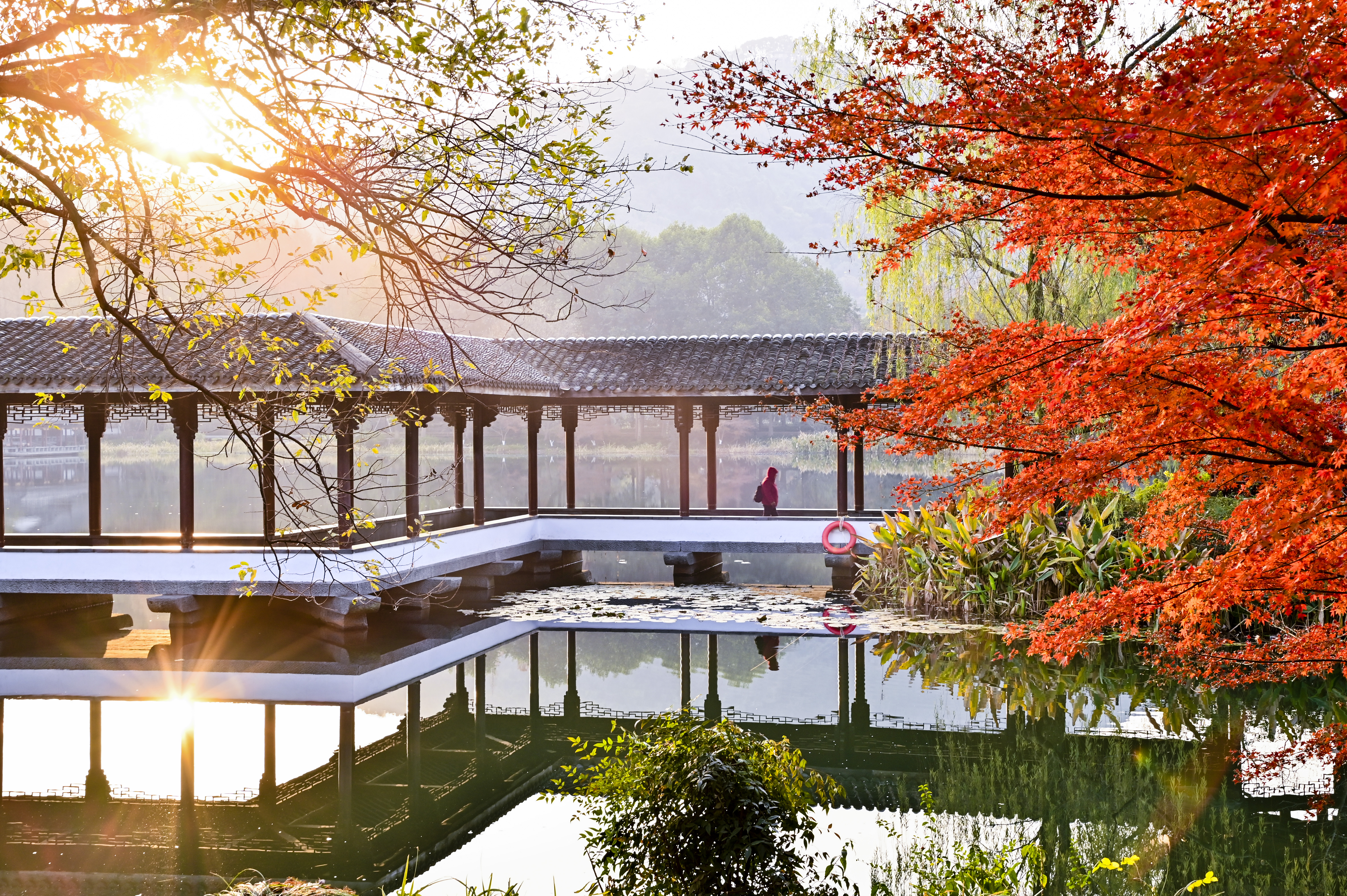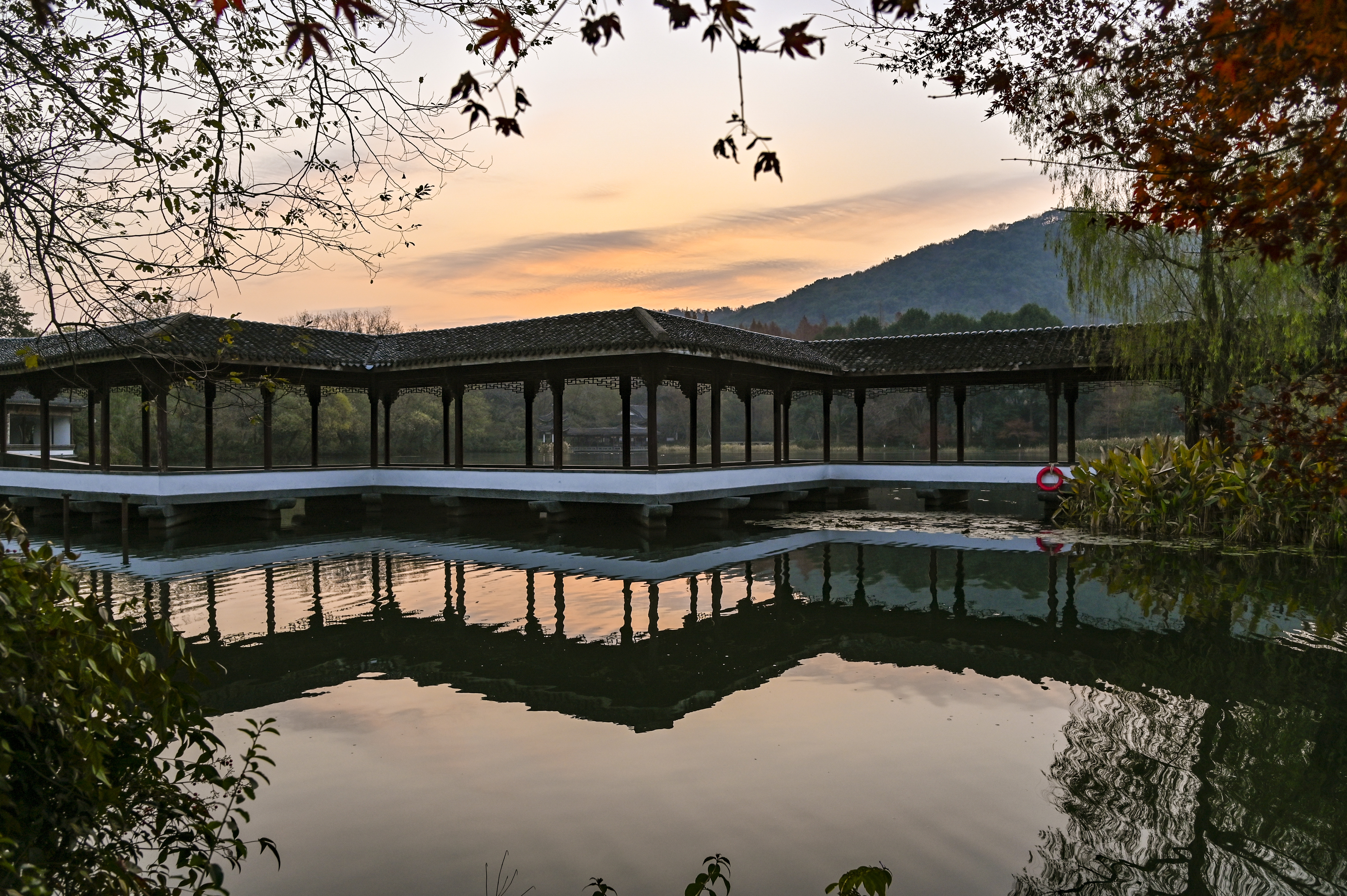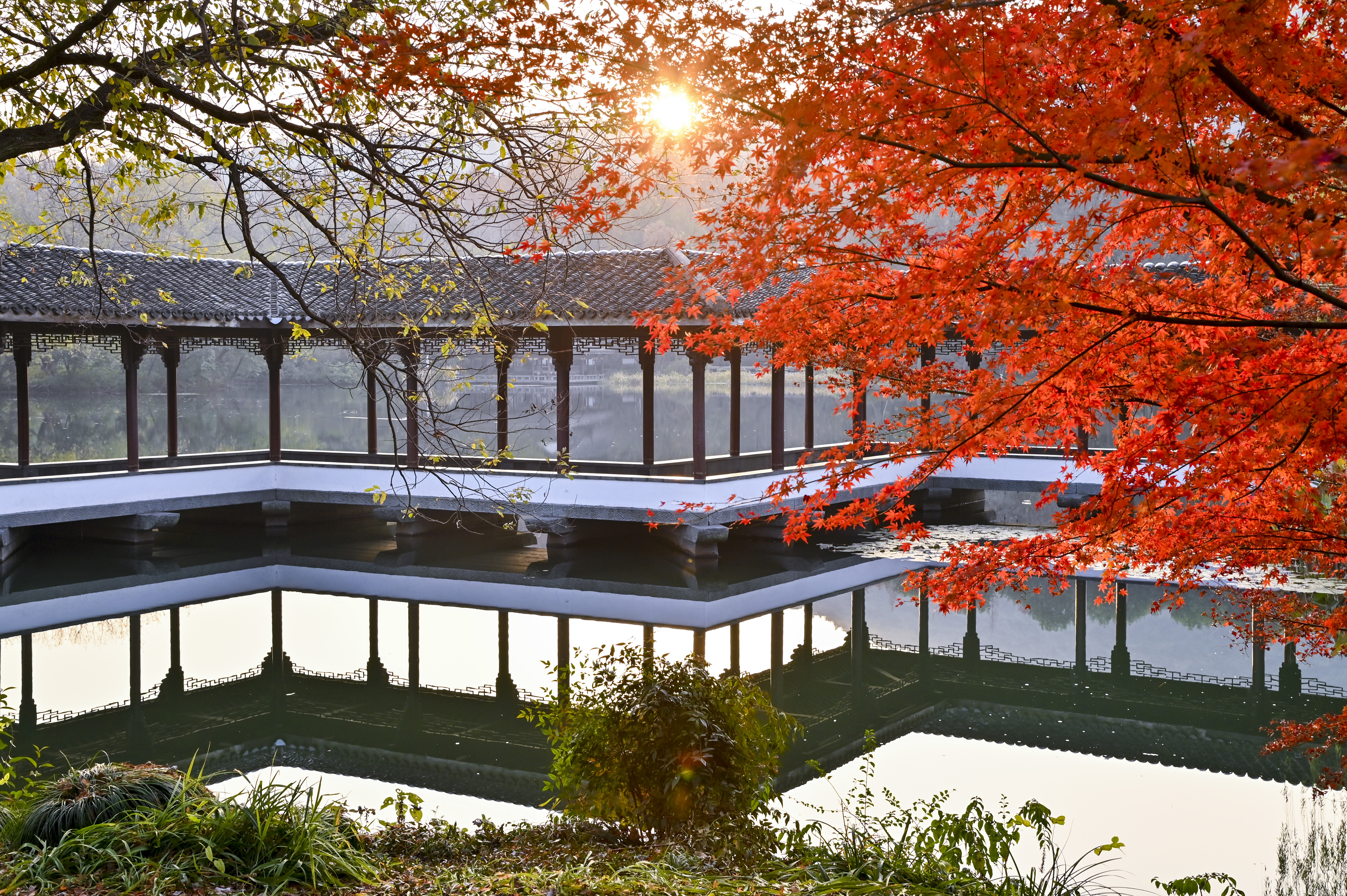 浴鹄湾是西湖的后花园,霁虹桥长廊的尽头是朝霞与红枫。踩着落叶,看倒影在水面铺开一幅画,随手一拍都是中式浪漫。在这寒冷的冬天能看到如此绚丽的朝霞