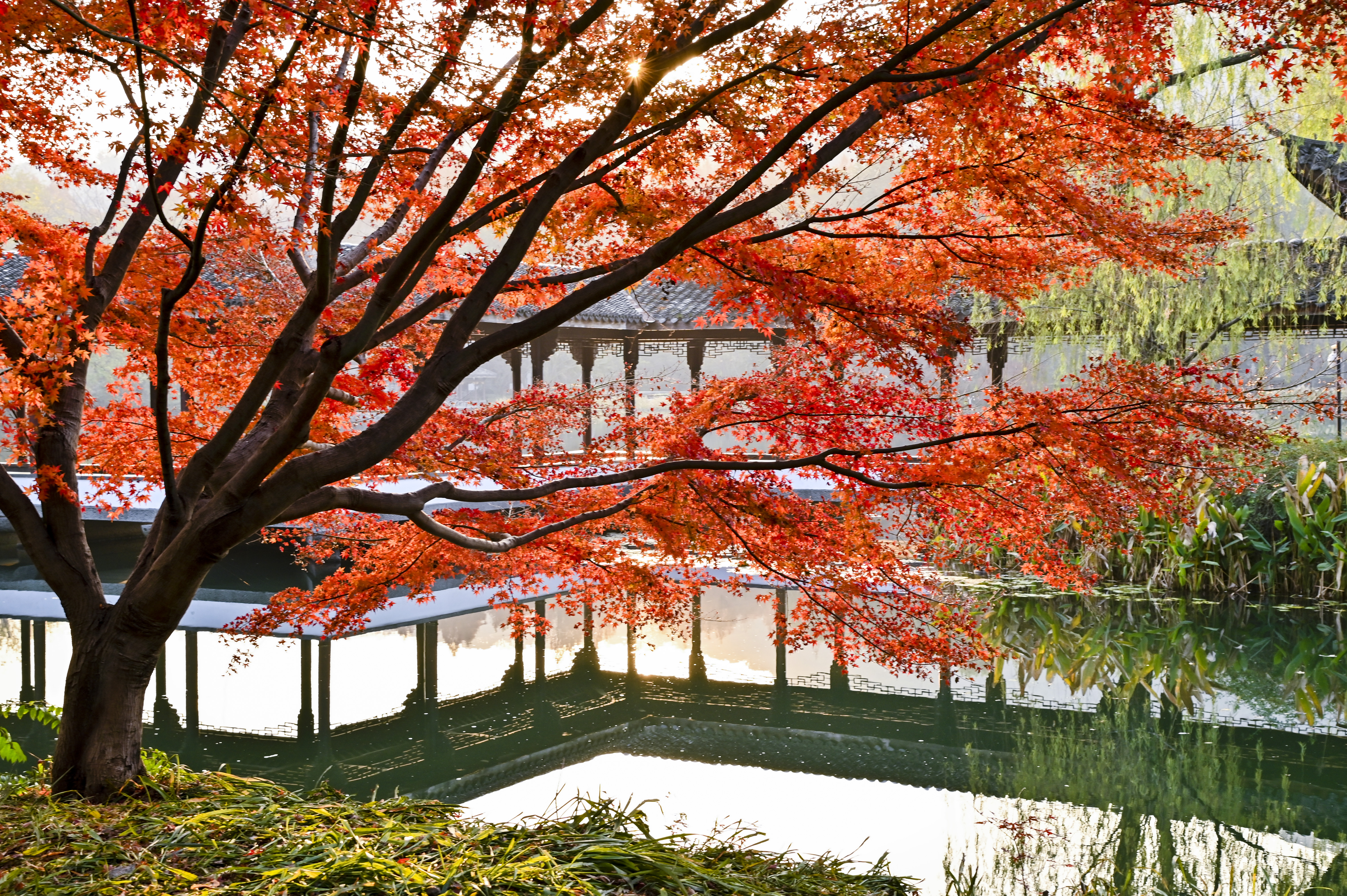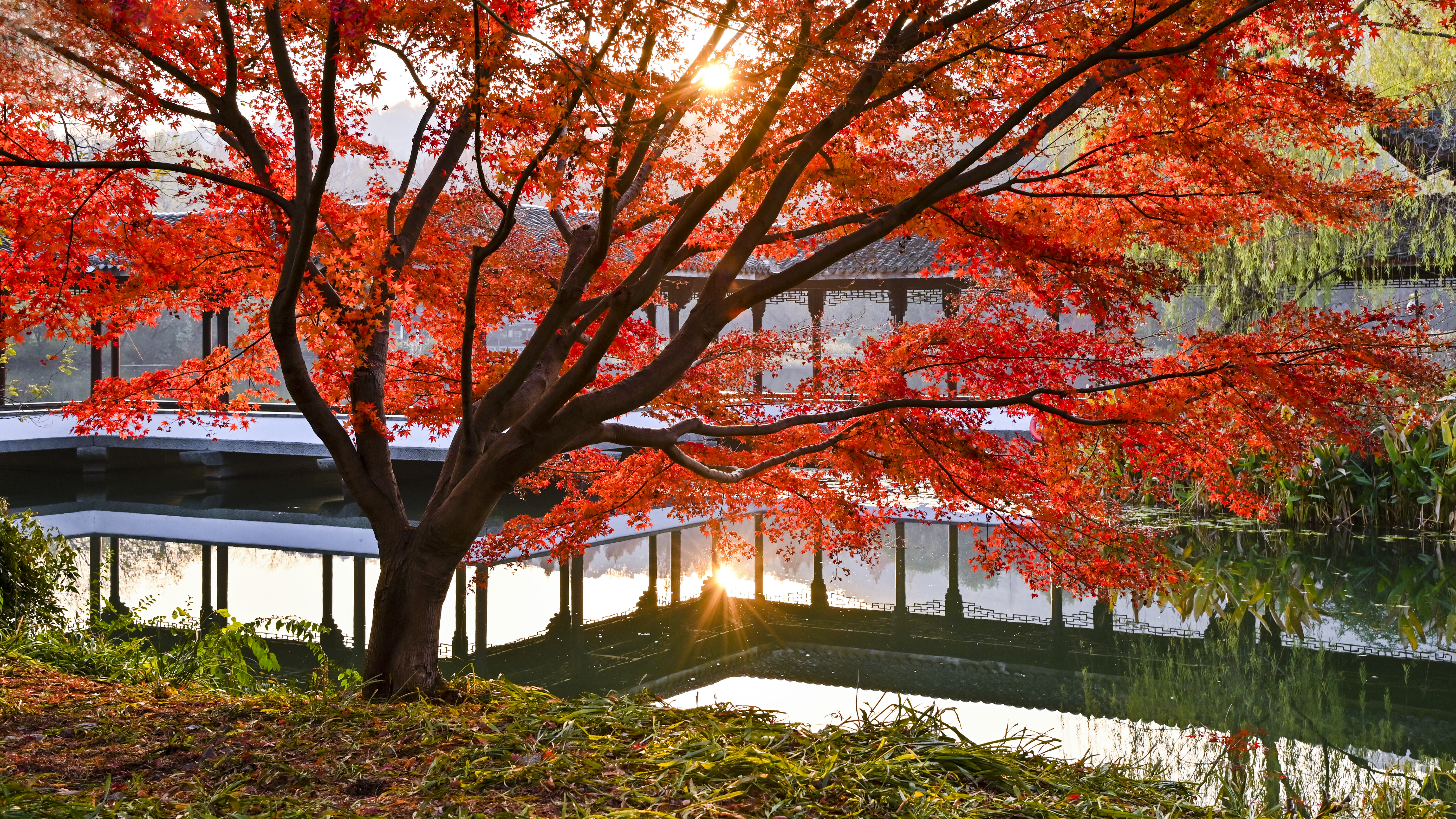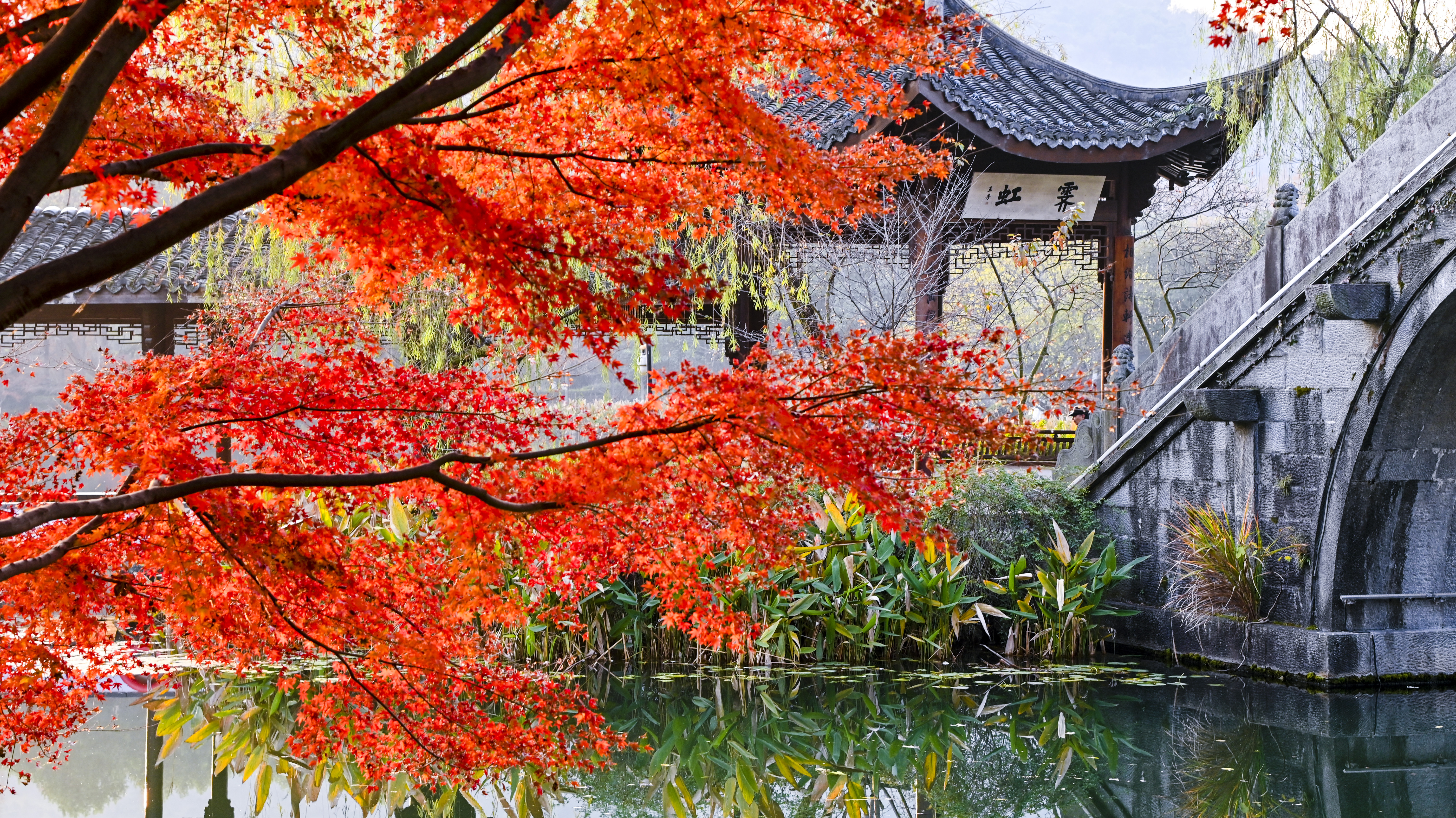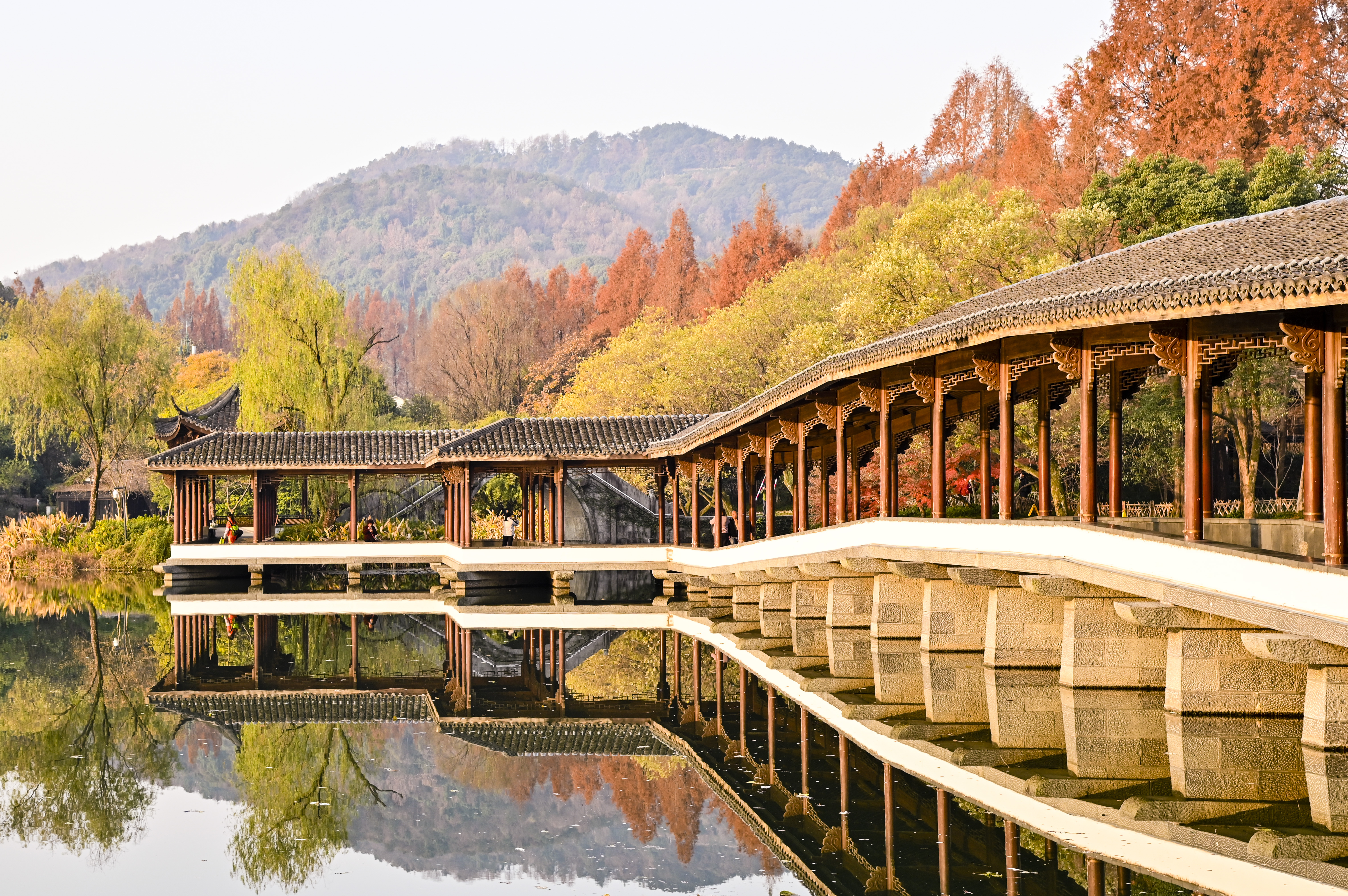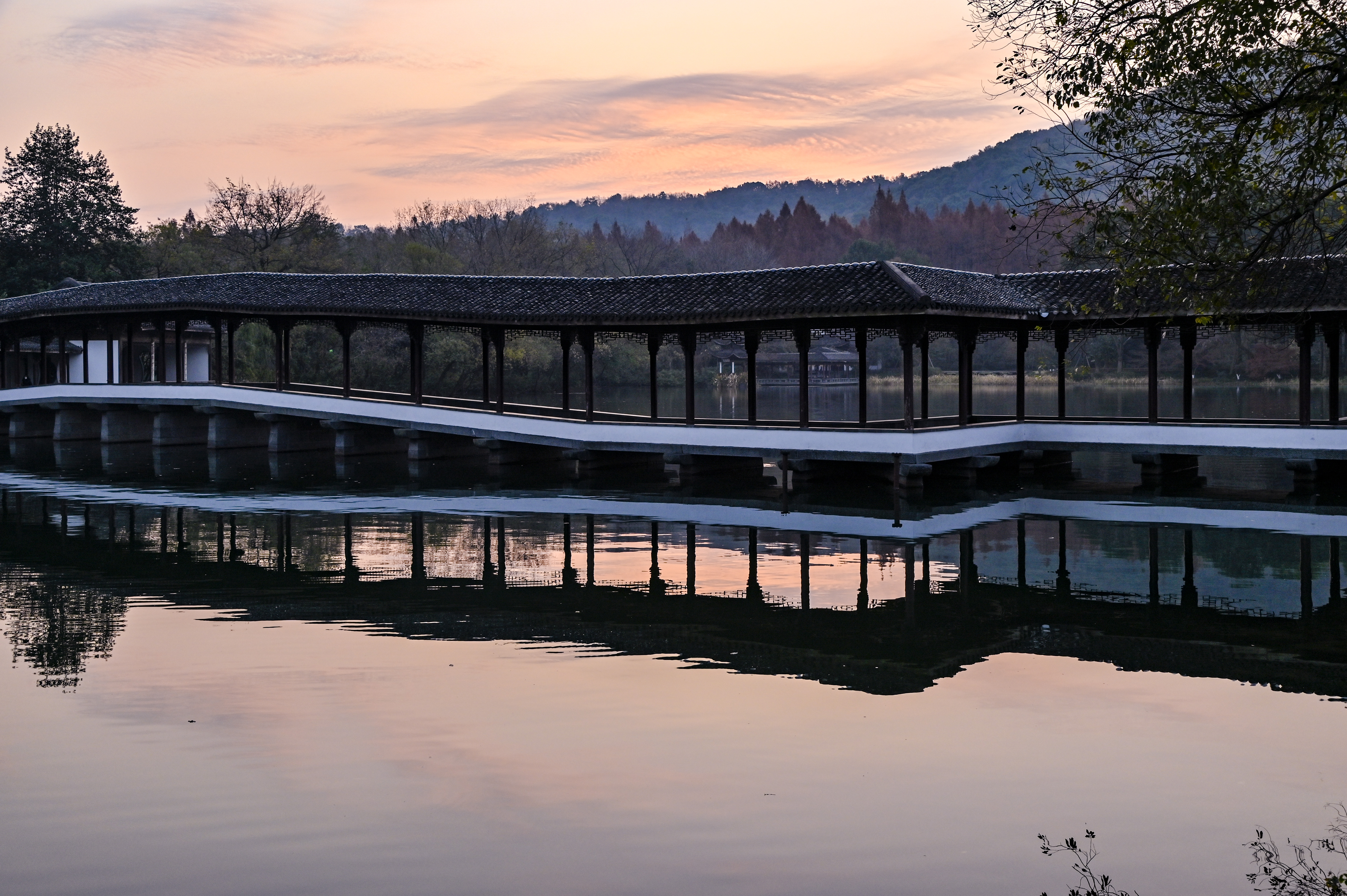 浴鹄湾是西湖的后花园,霁虹桥长廊的尽头是朝霞与红枫。踩着落叶,看倒影在水面铺开一幅画,随手一拍都是中式浪漫。在这寒冷的冬天能看到如此绚丽的朝霞